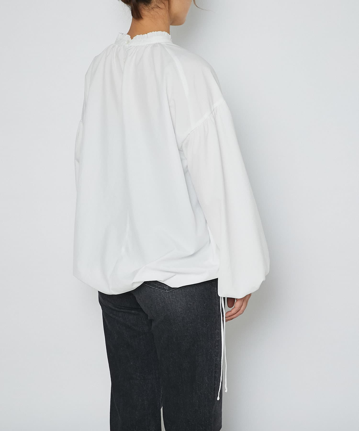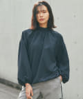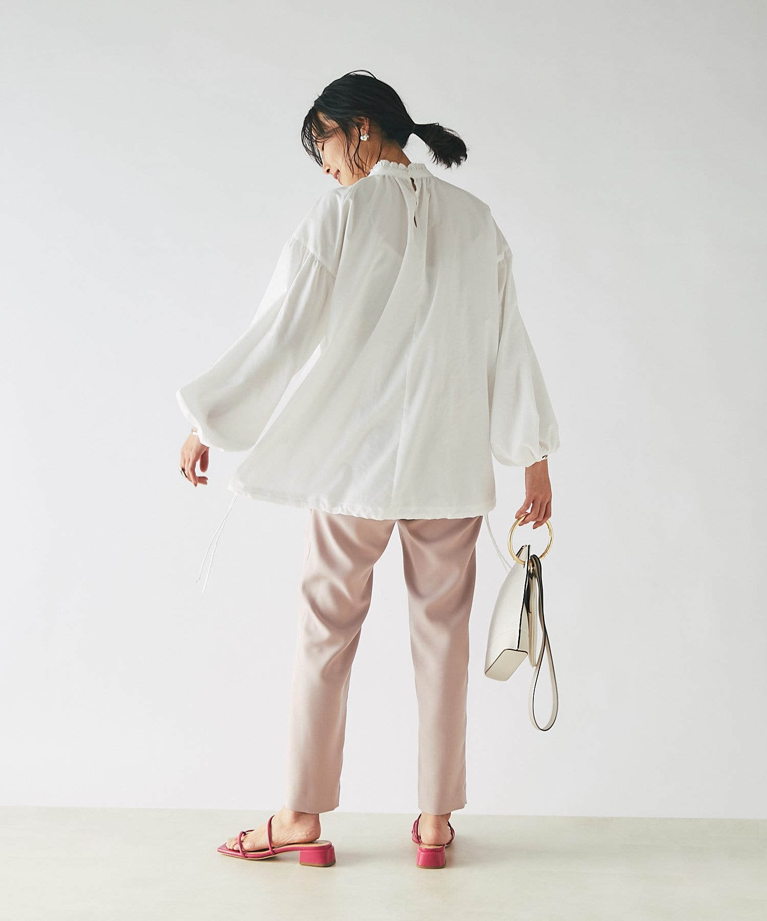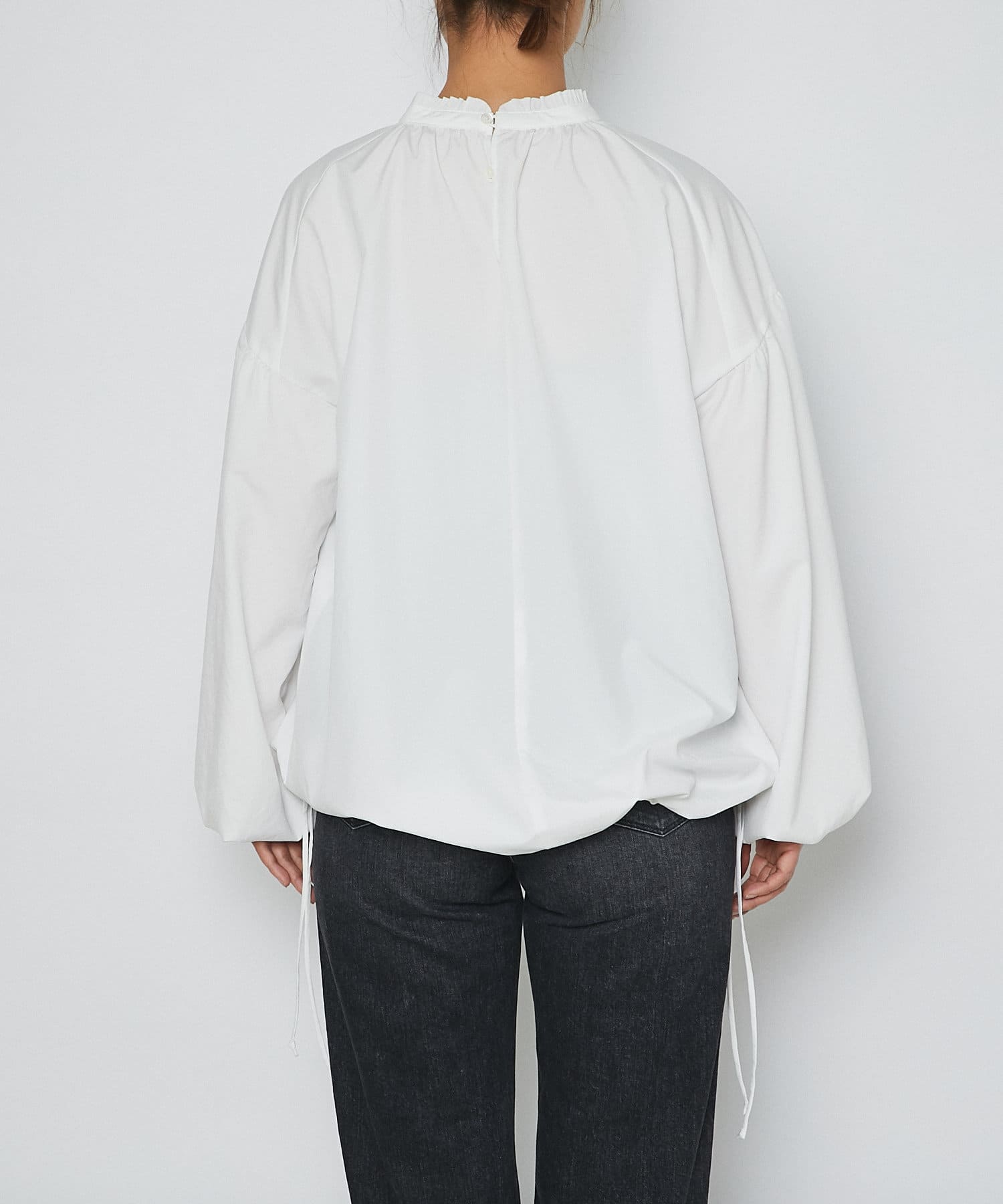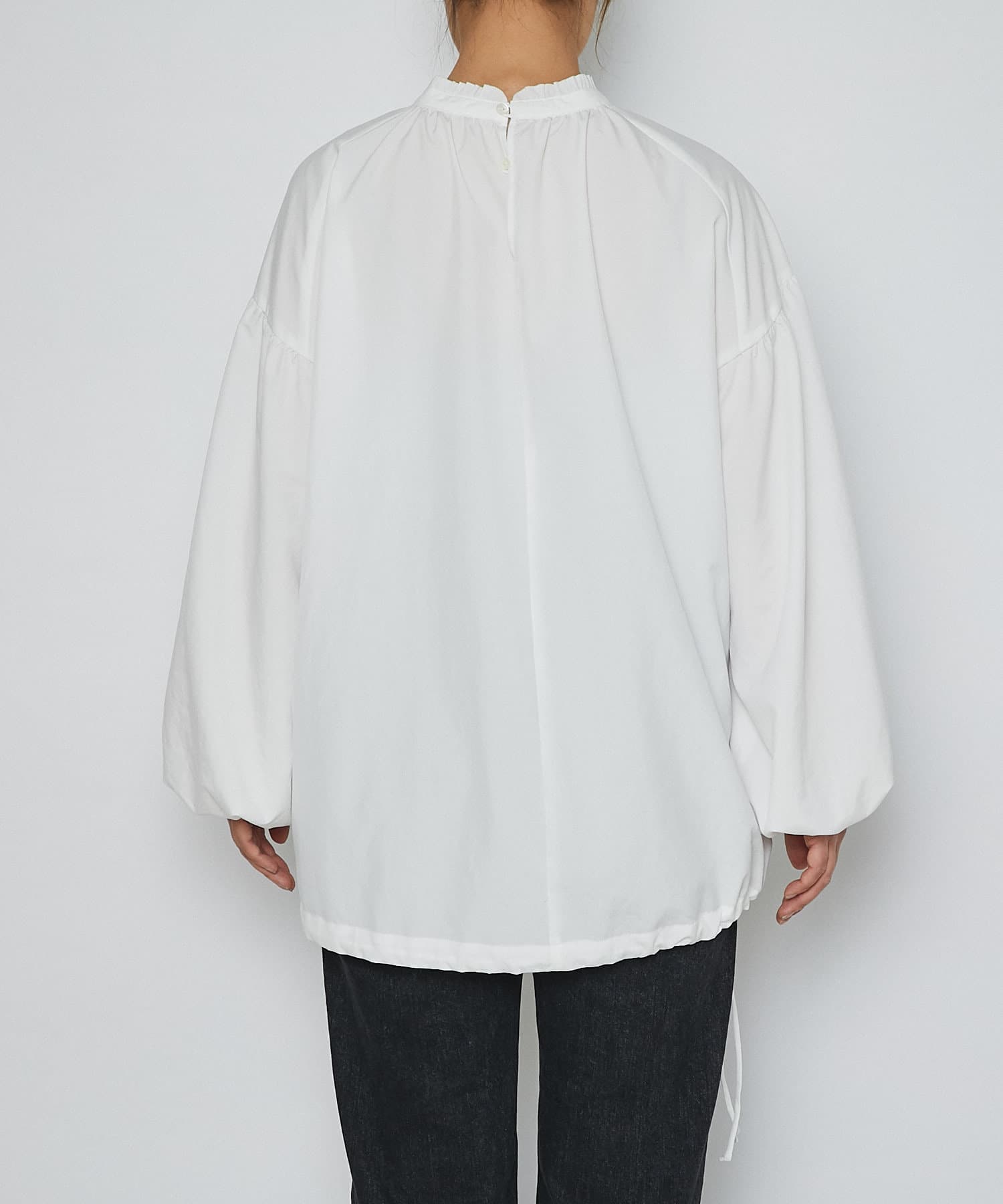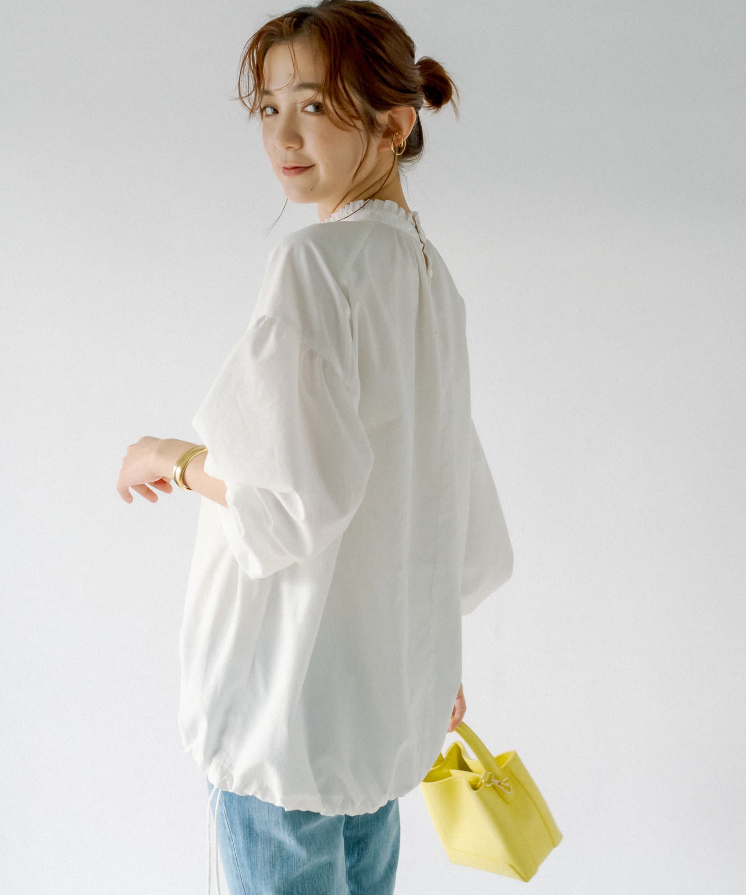 ボリュームシルエットとギャザーディティールの2パターンで楽しめるブラウス。ドロストをギュッと絞ってウエストまでたくし上げると、バルーンフォルムのブラウスに変化します。ポイントのドロストは同じ生地感と繊細な紐に仕立てあげ、スポーティなムードを払拭したこだわりの一着。一見コットンに見えるエアリーな素材は、ポリエステル100%のため裾をギュッと絞ってもシワにならず、着丈を調節した後もノーアイロンでフォルムチェンジできるのも嬉しいポイント。