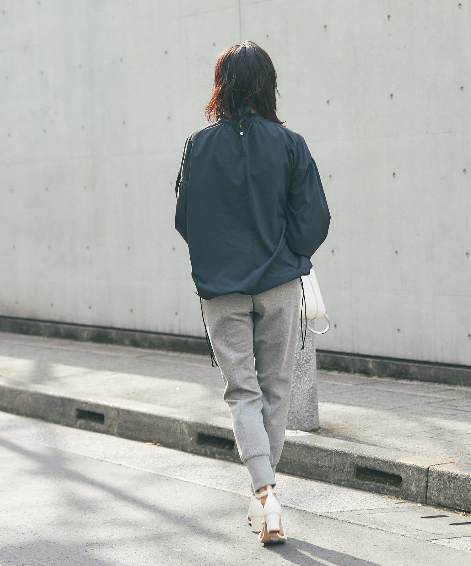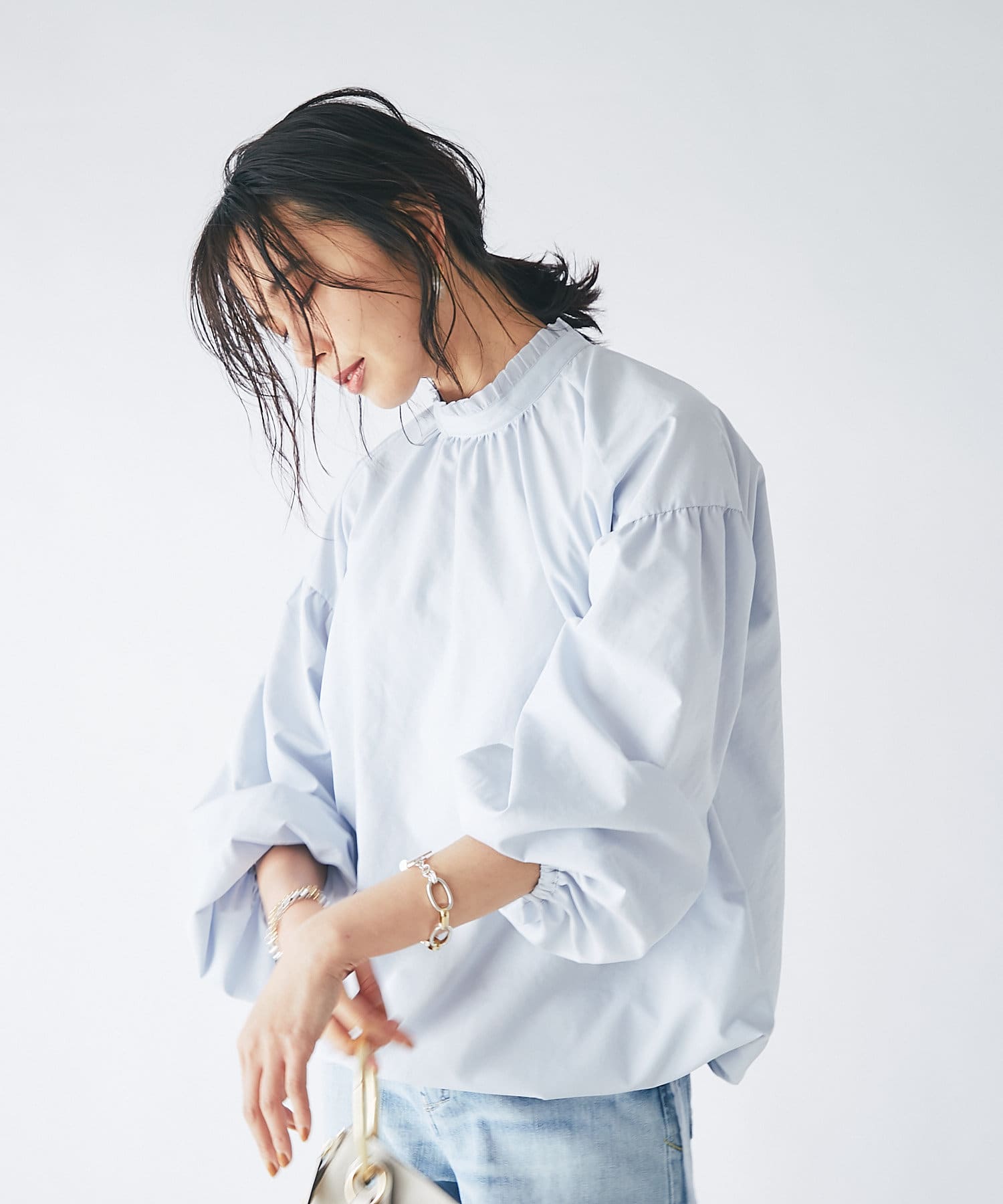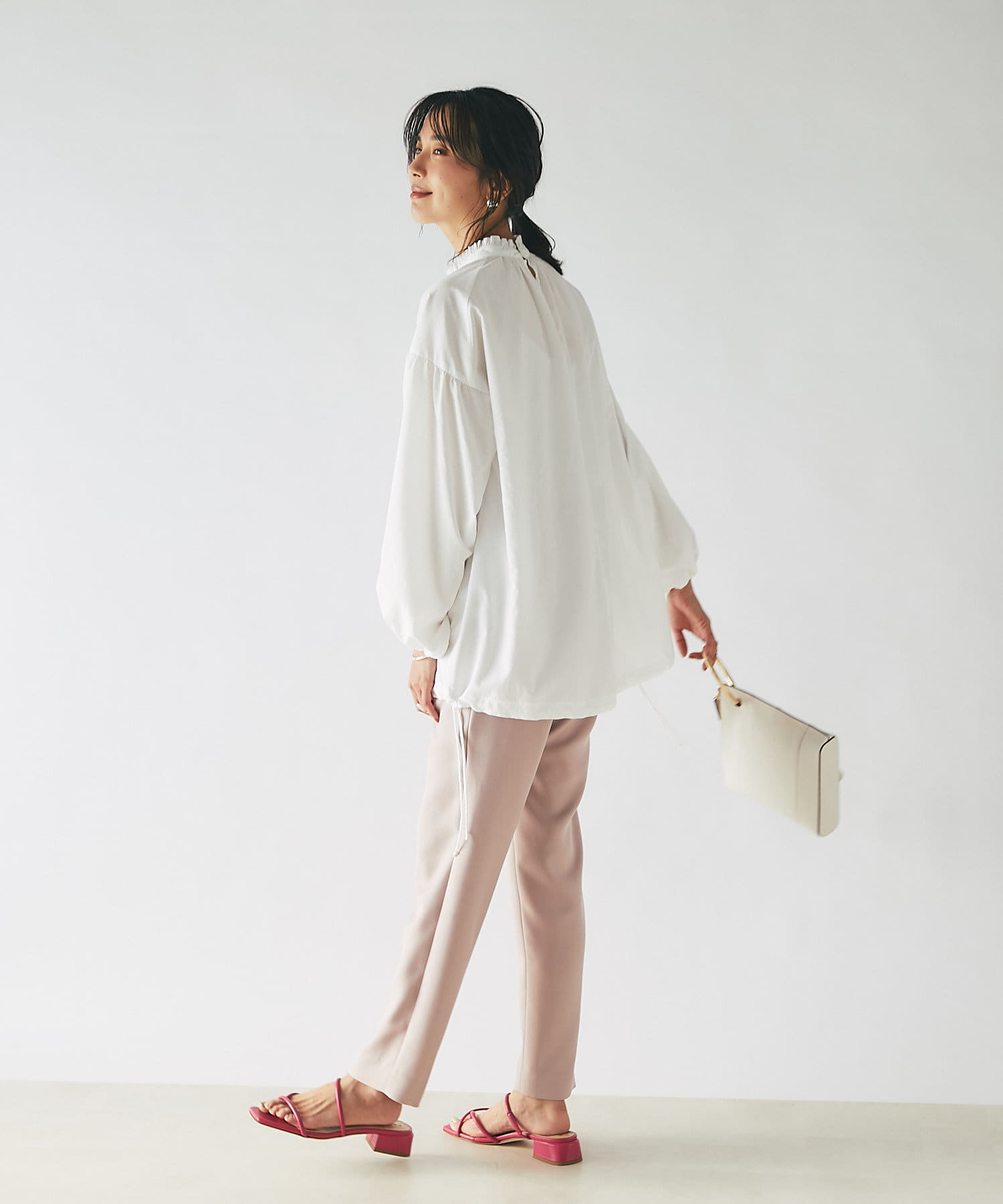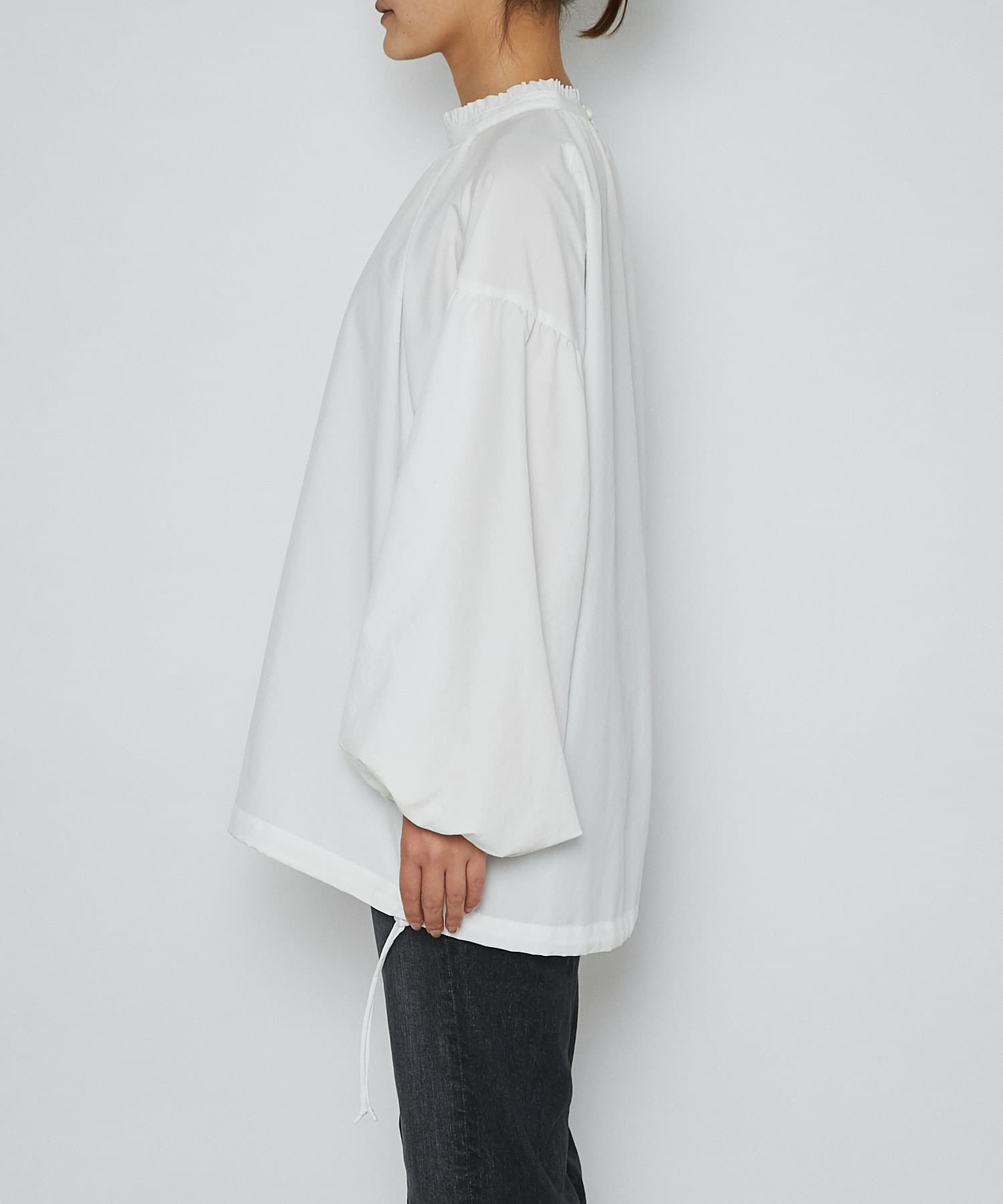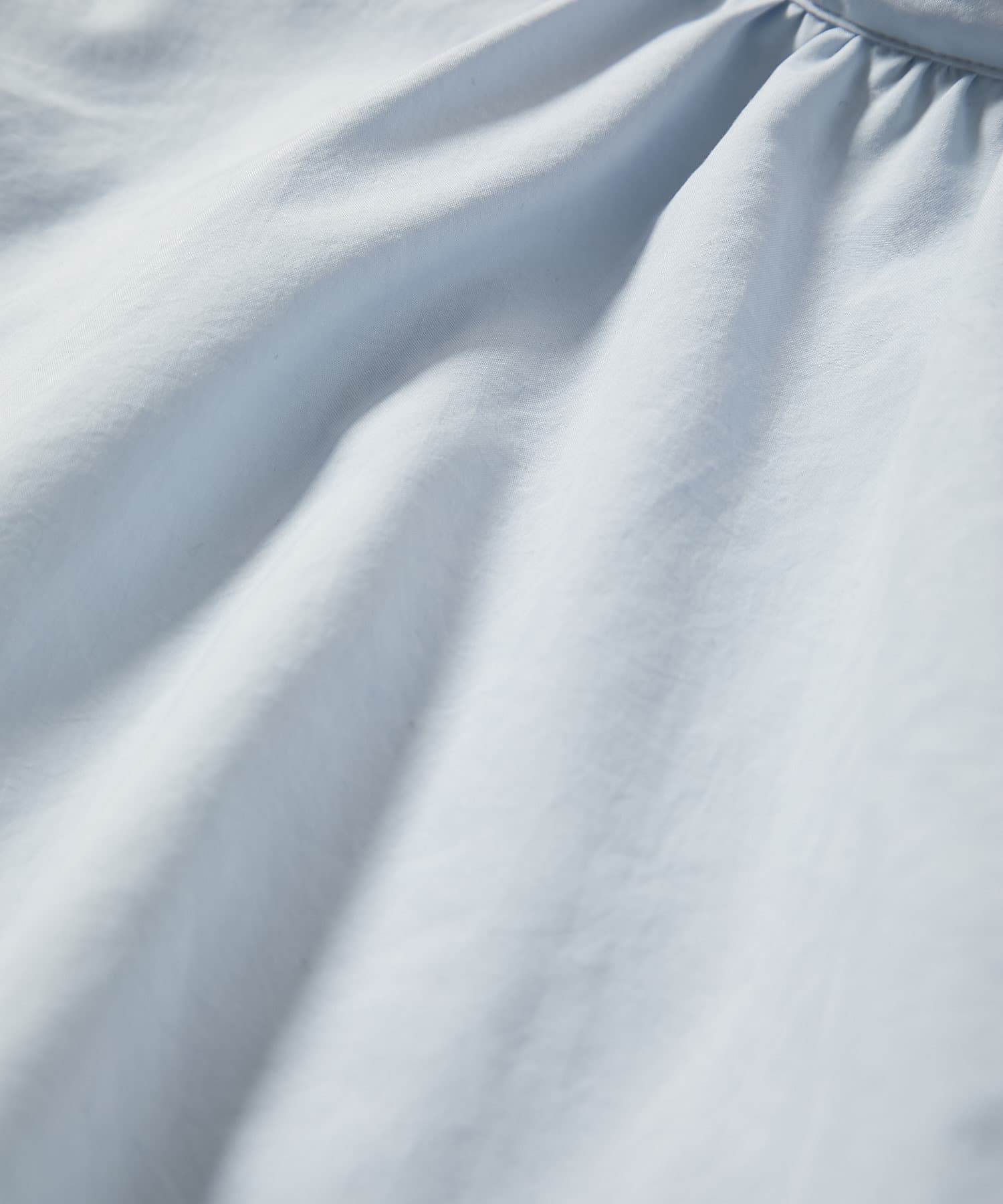 ボリュームシルエットとギャザーディティールの2パターンで楽しめるブラウス。ドロストをギュッと絞ってウエストまでたくし上げると、バルーンフォルムのブラウスに変化します。ポイントのドロストは同じ生地感と繊細な紐に仕立てあげ、スポーティなムードを払拭したこだわりの一着。一見コットンに見えるエアリーな素材は、ポリエステル100%のため裾をギュッと絞ってもシワにならず、着丈を調節した後もノーアイロンでフォルムチェンジできるのも嬉しいポイント。