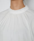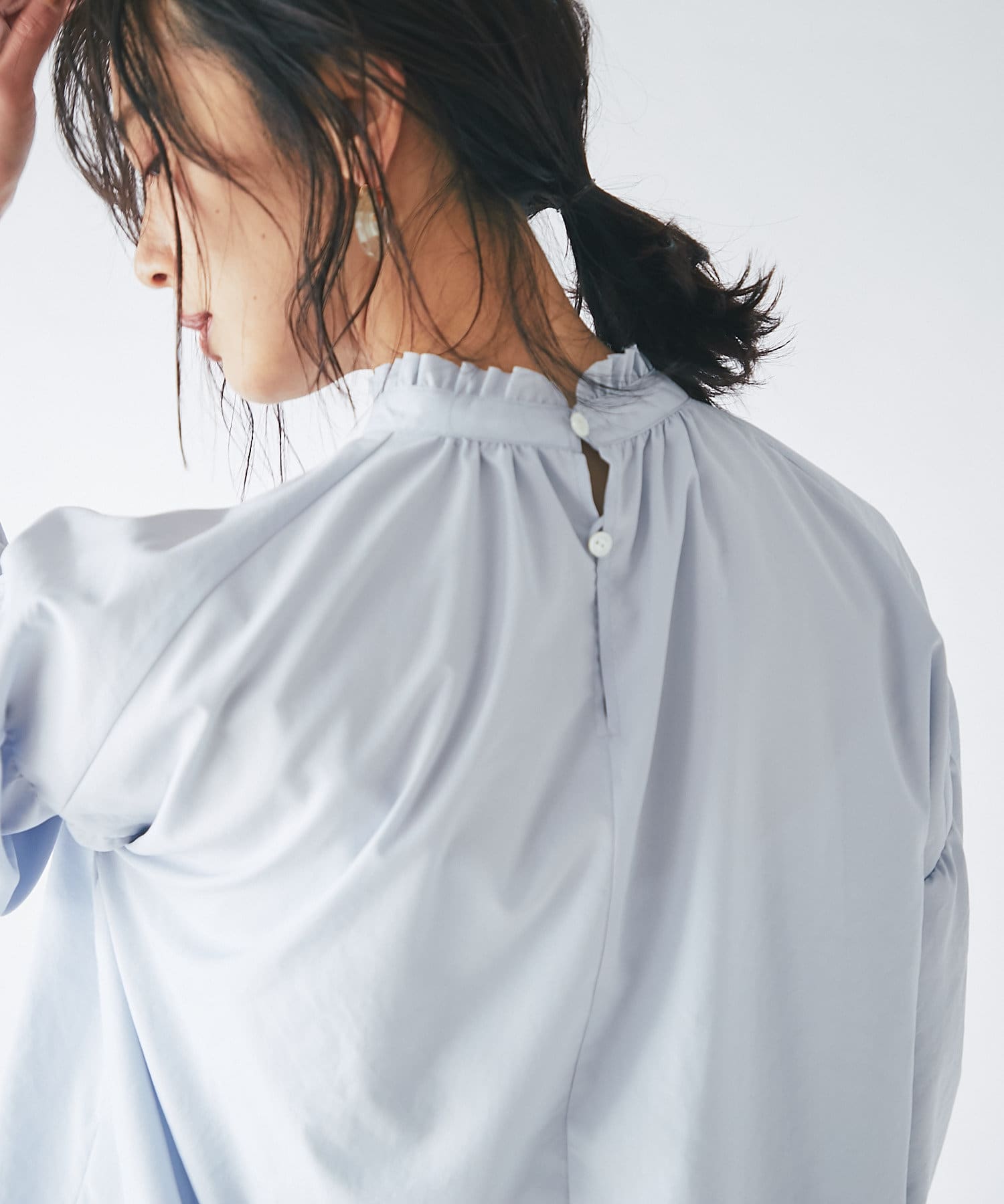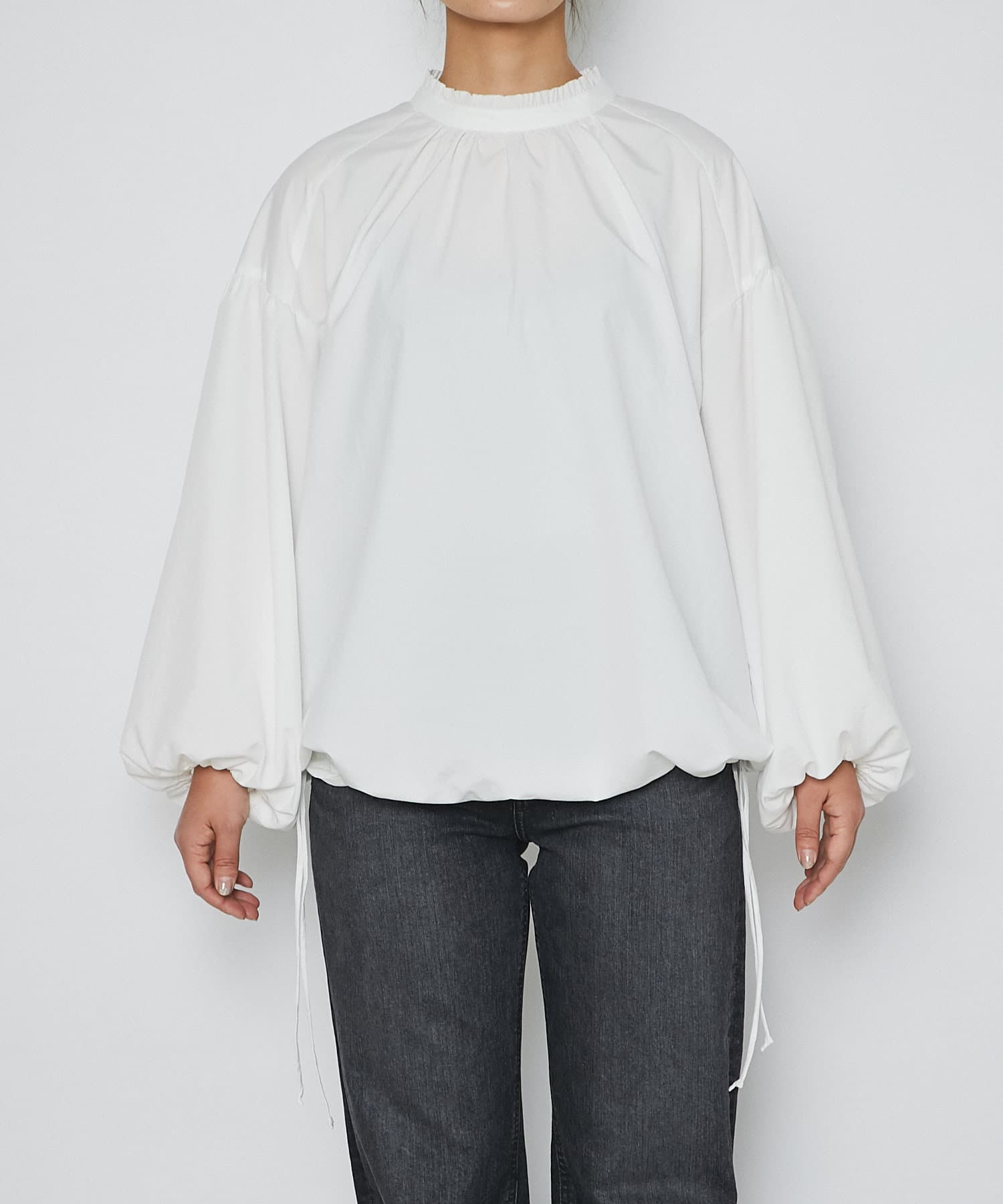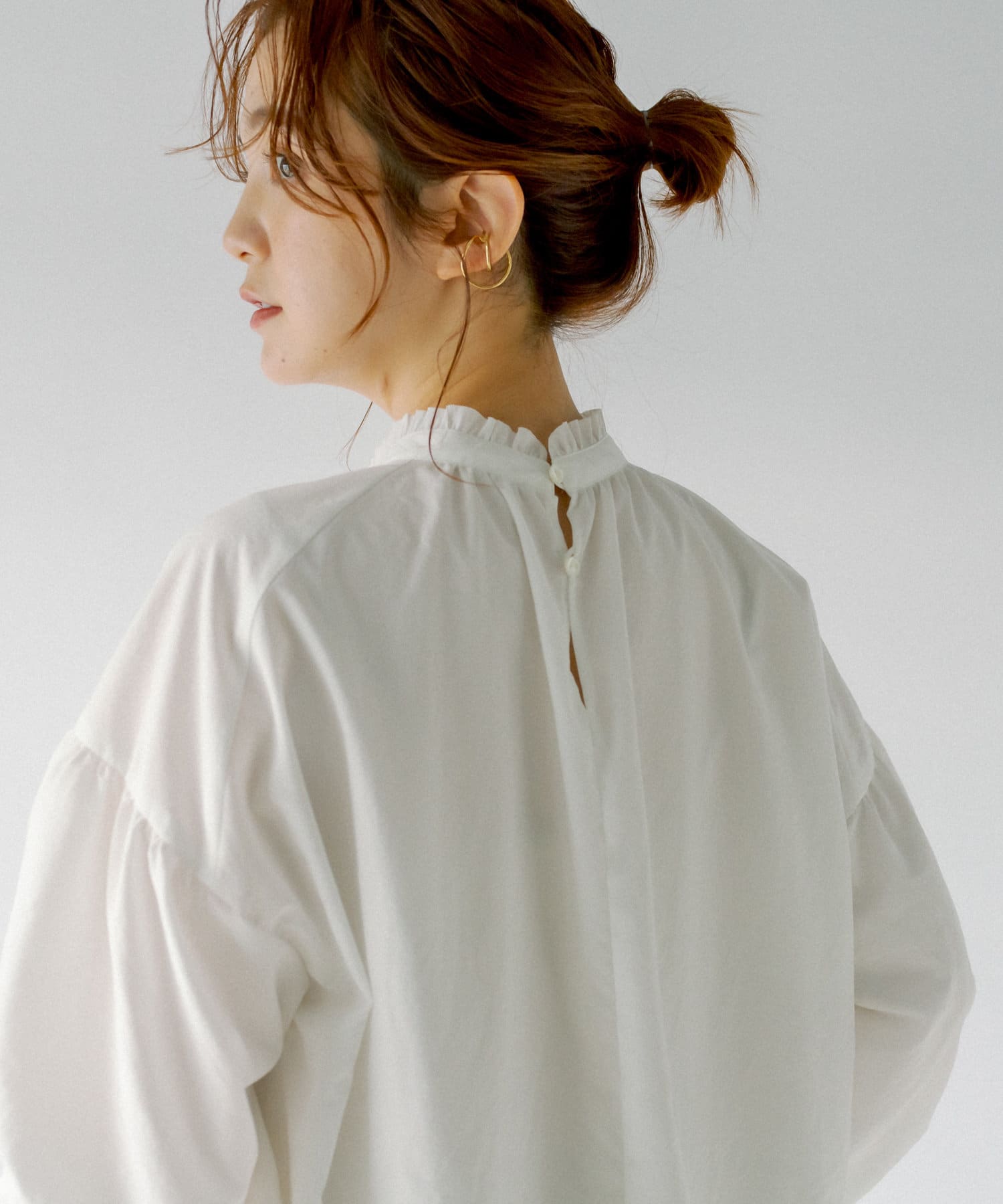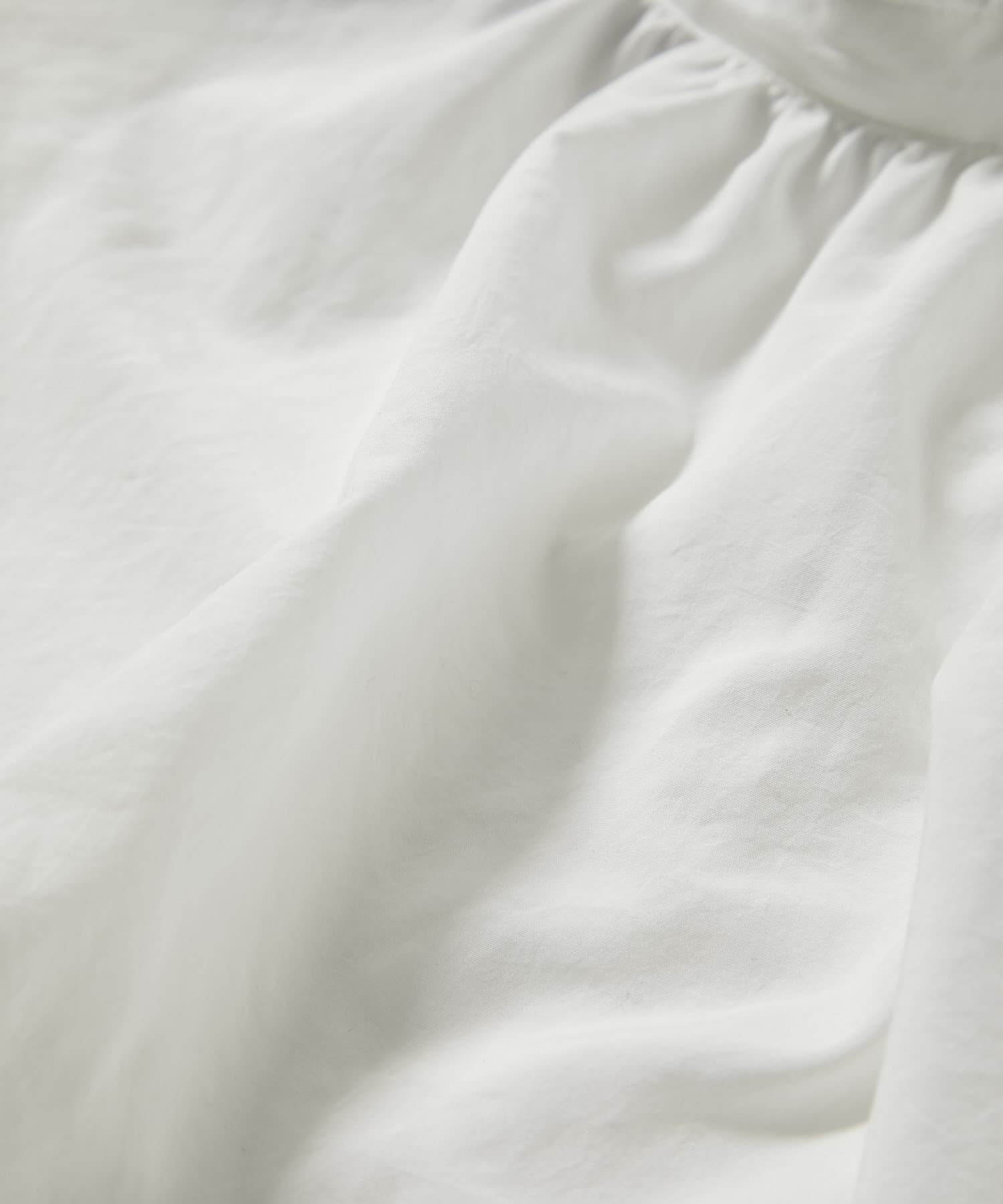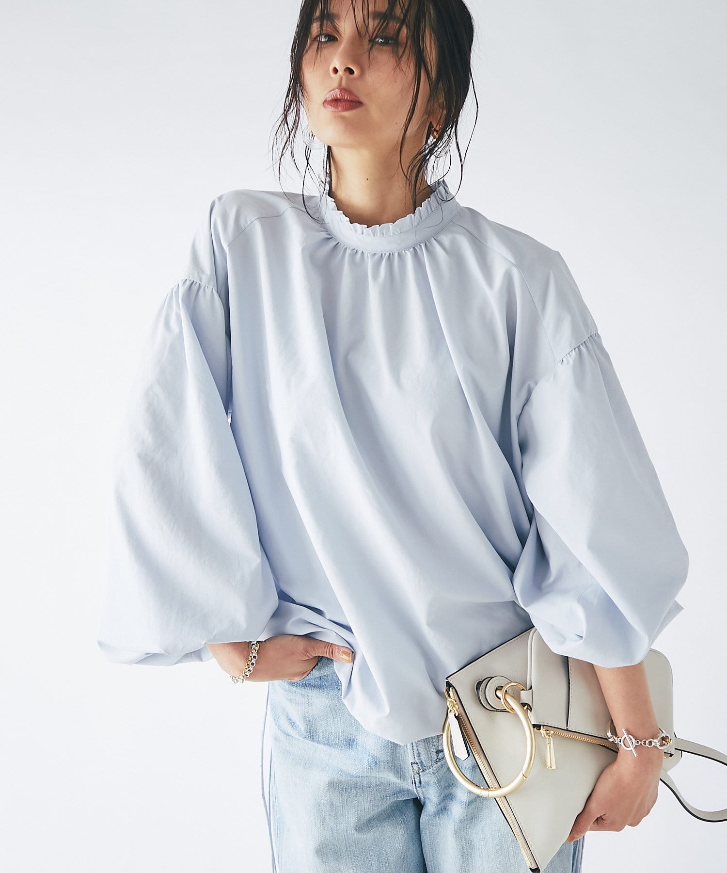 ボリュームシルエットとギャザーディティールの2パターンで楽しめるブラウス。ドロストをギュッと絞ってウエストまでたくし上げると、バルーンフォルムのブラウスに変化します。ポイントのドロストは同じ生地感と繊細な紐に仕立てあげ、スポーティなムードを払拭したこだわりの一着。一見コットンに見えるエアリーな素材は、ポリエステル100%のため裾をギュッと絞ってもシワにならず、着丈を調節した後もノーアイロンでフォルムチェンジできるのも嬉しいポイント。