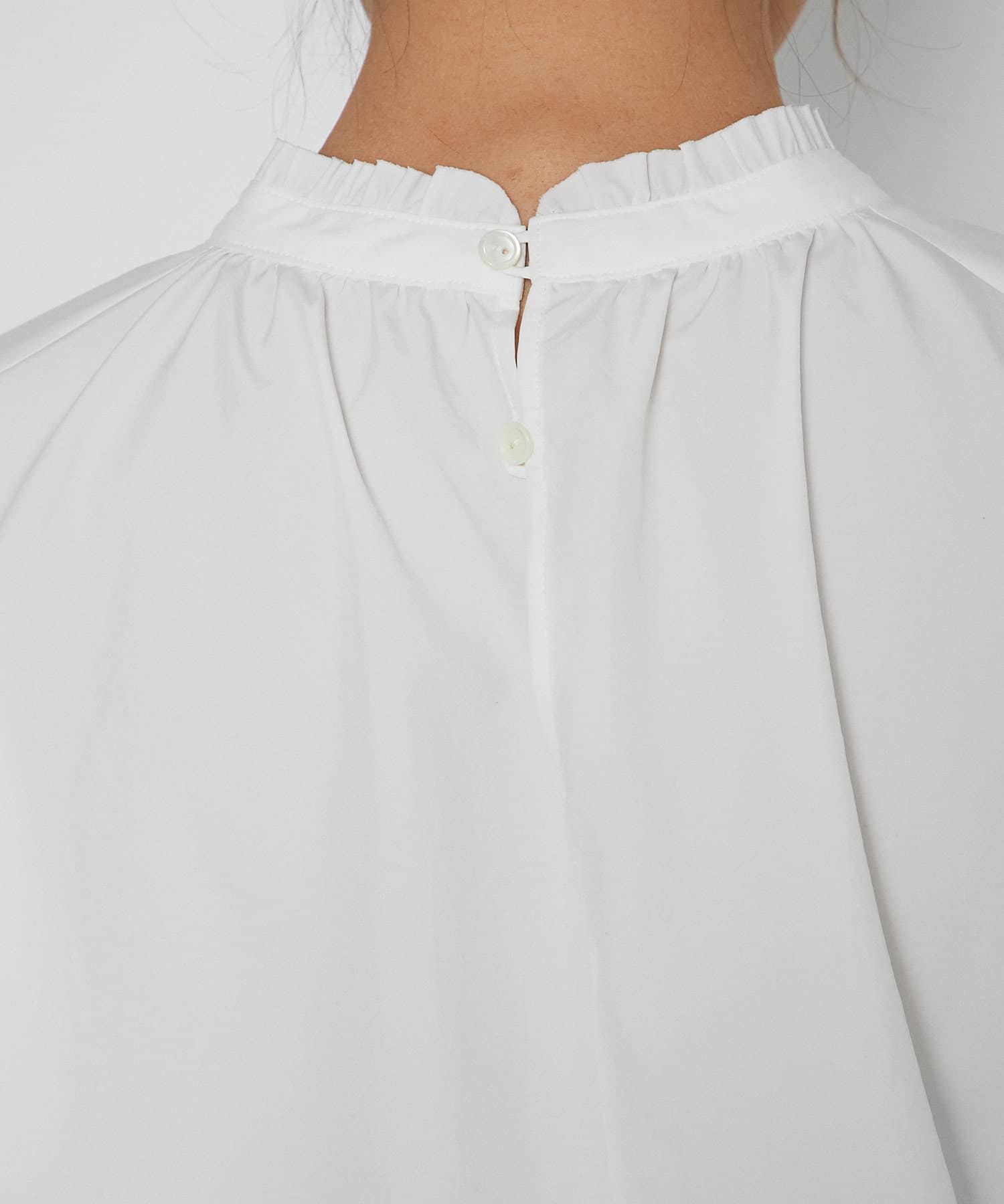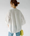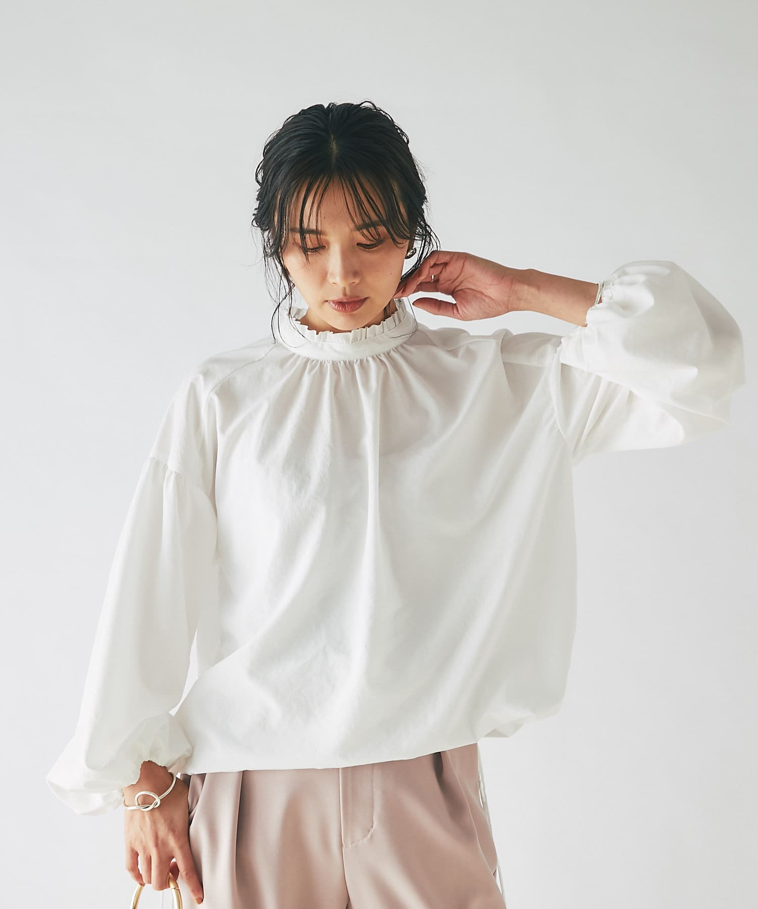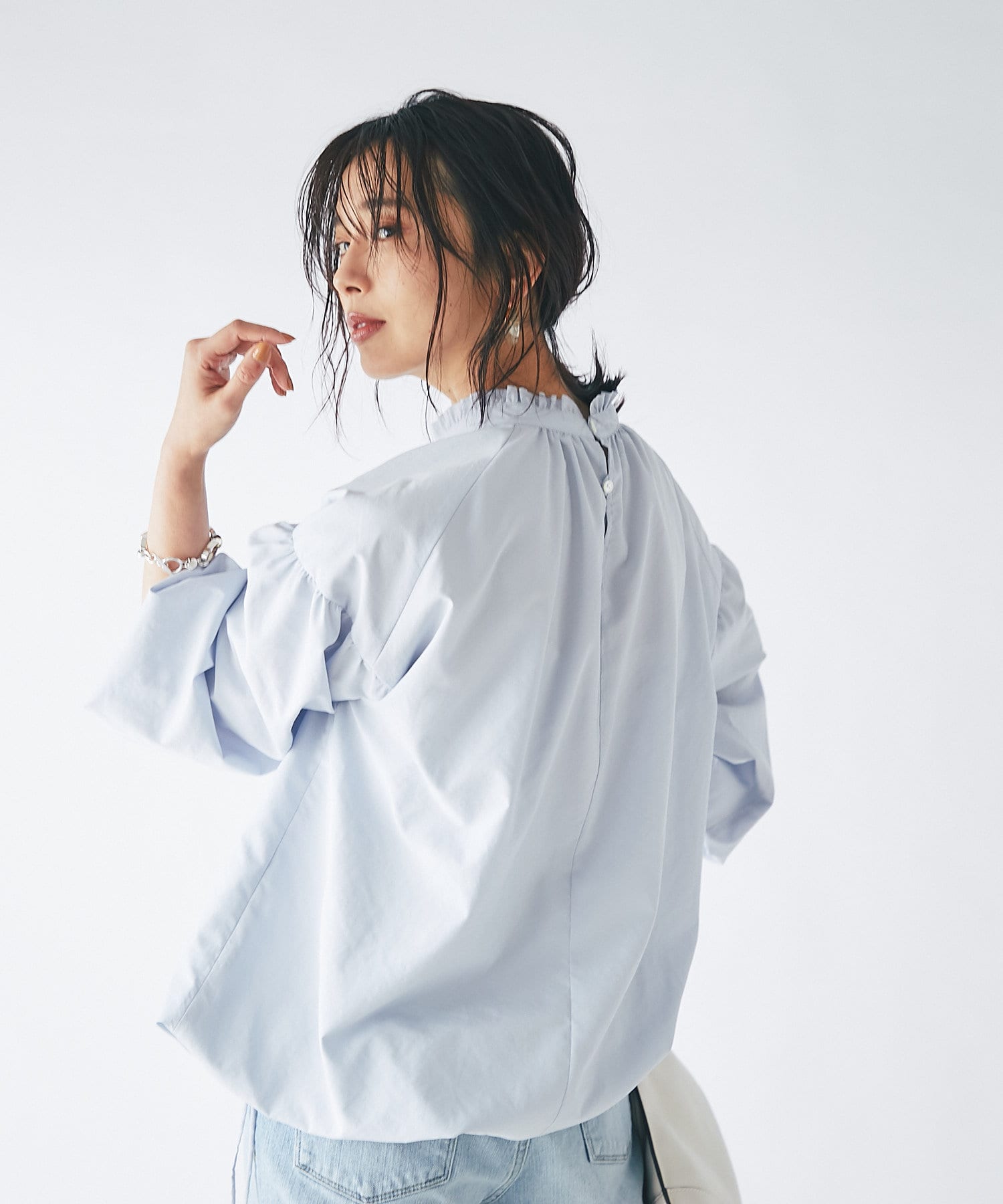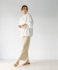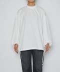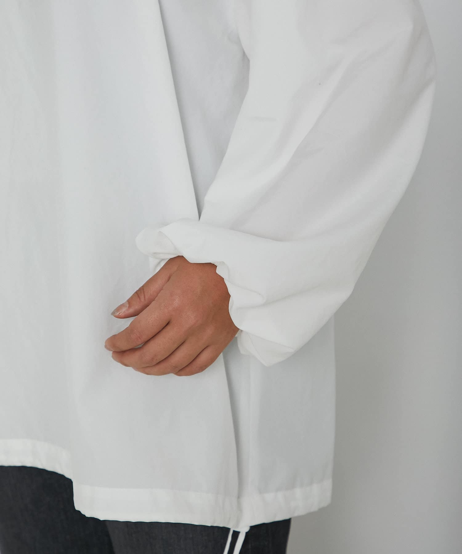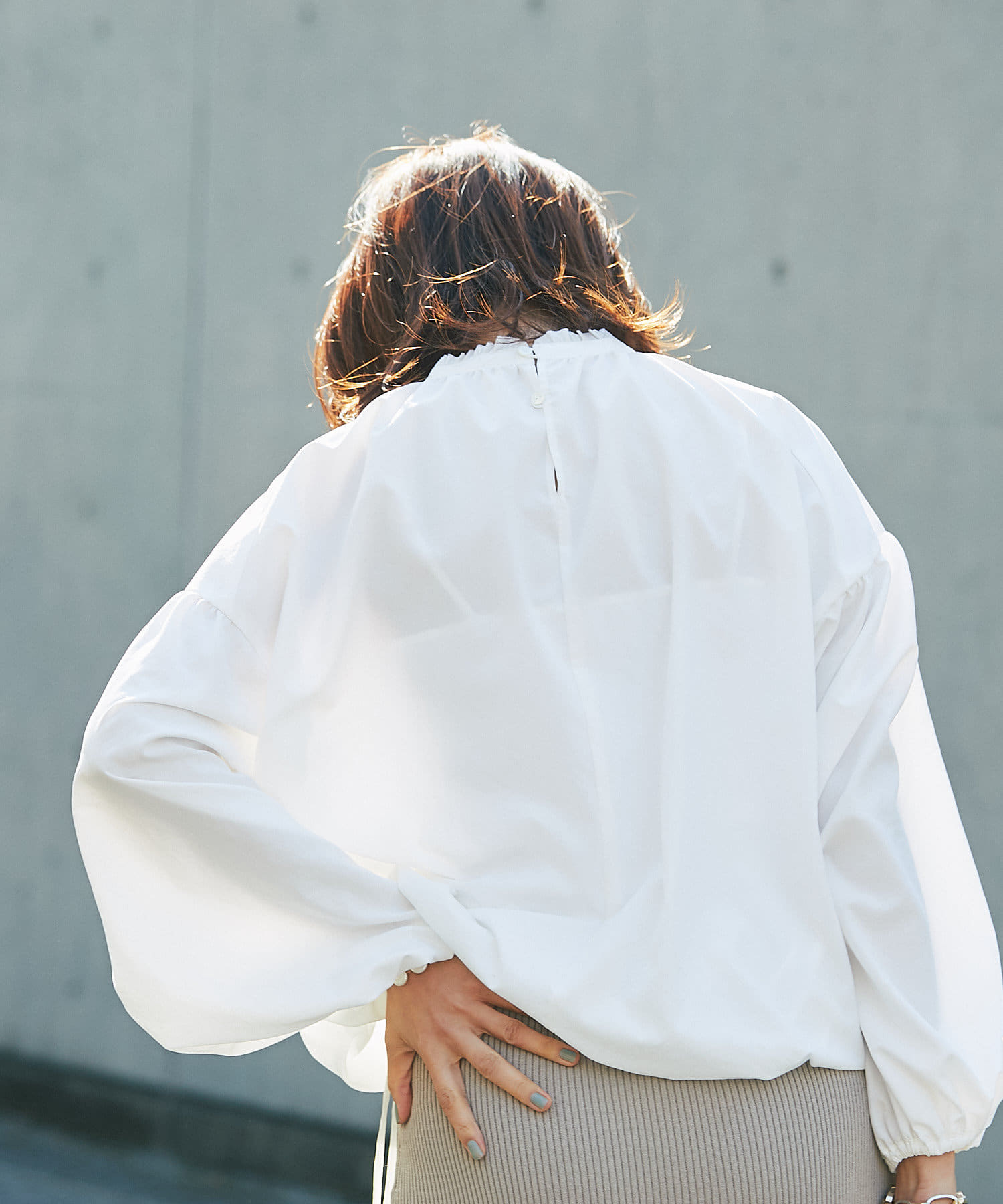 ボリュームシルエットとギャザーディティールの2パターンで楽しめるブラウス。ドロストをギュッと絞ってウエストまでたくし上げると、バルーンフォルムのブラウスに変化します。ポイントのドロストは同じ生地感と繊細な紐に仕立てあげ、スポーティなムードを払拭したこだわりの一着。一見コットンに見えるエアリーな素材は、ポリエステル100%のため裾をギュッと絞ってもシワにならず、着丈を調節した後もノーアイロンでフォルムチェンジできるのも嬉しいポイント。