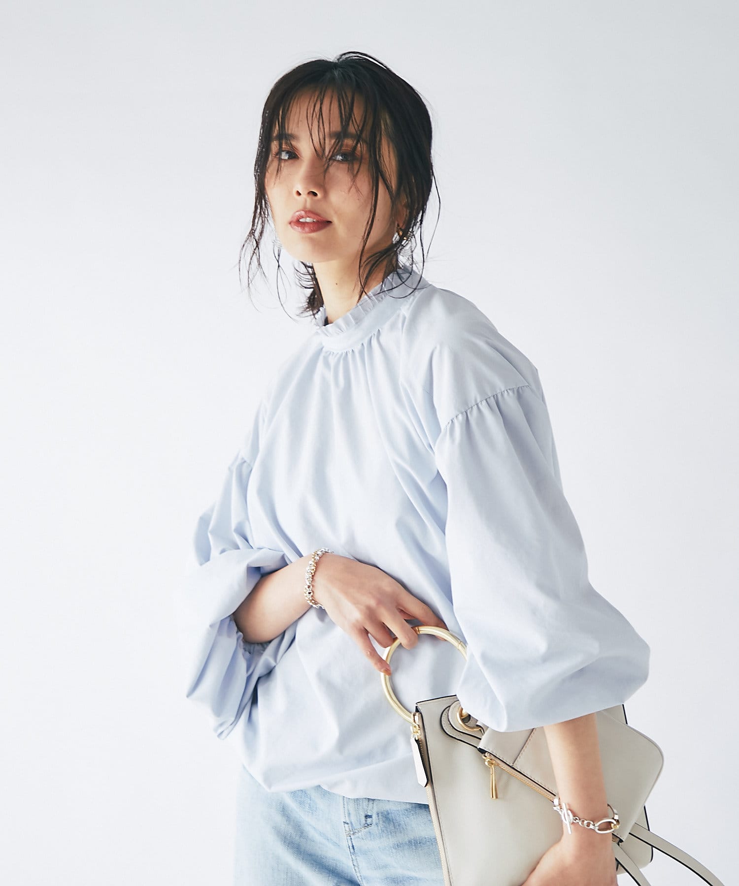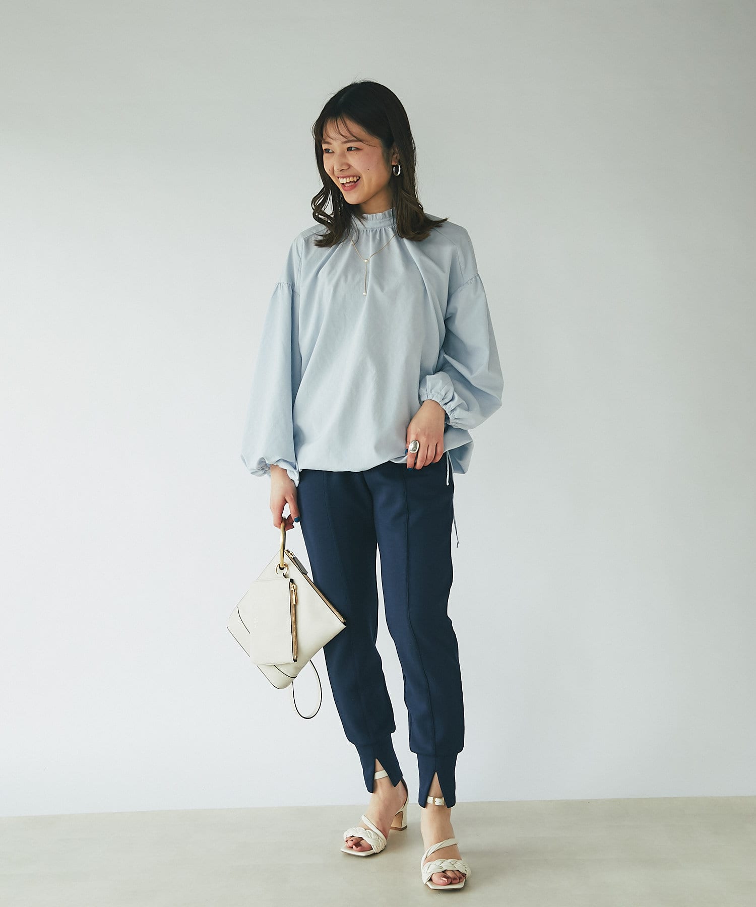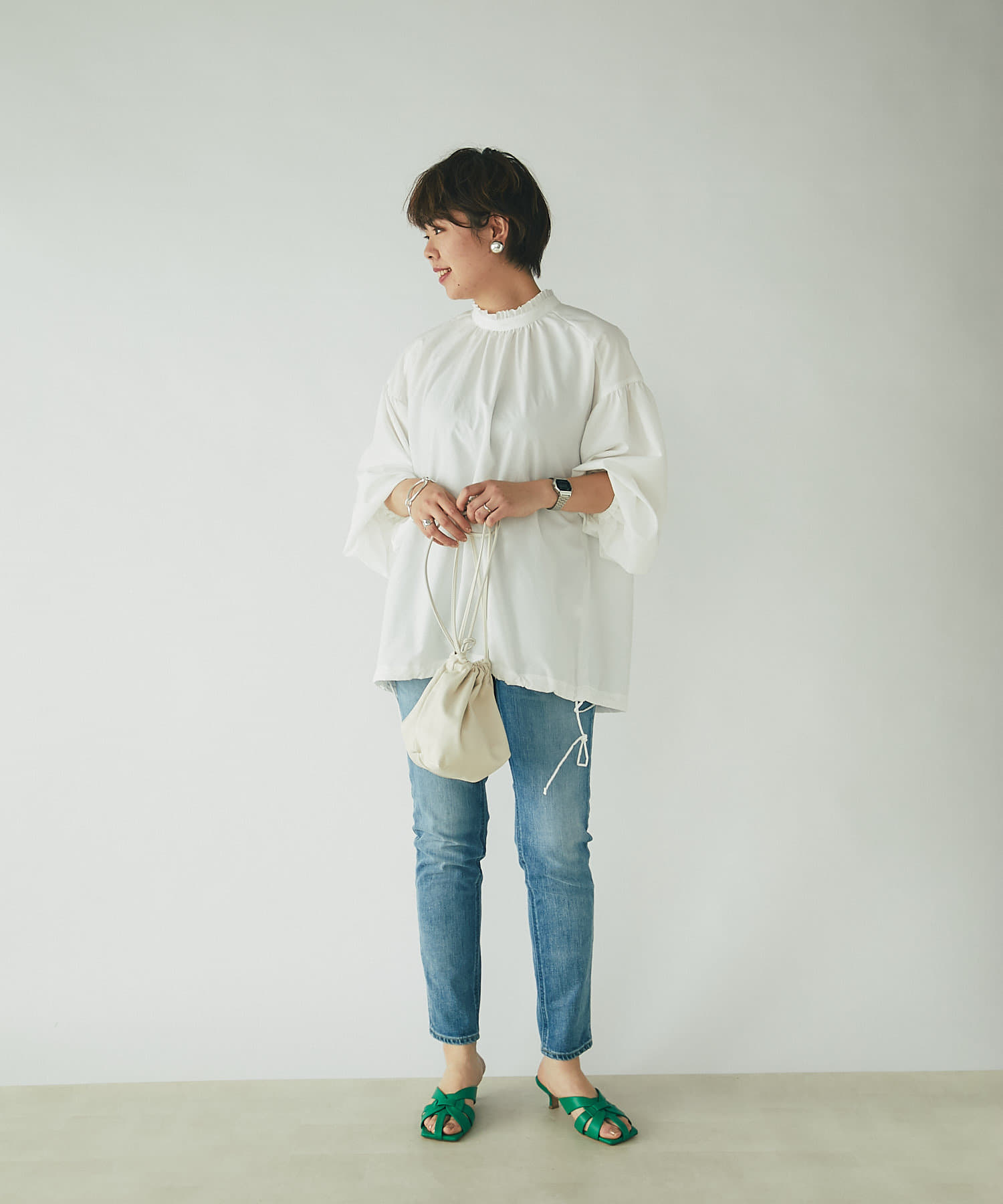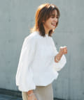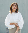 春コーデに欠かせないデザインブラウス。品のあるネックが大人顔な一枚。