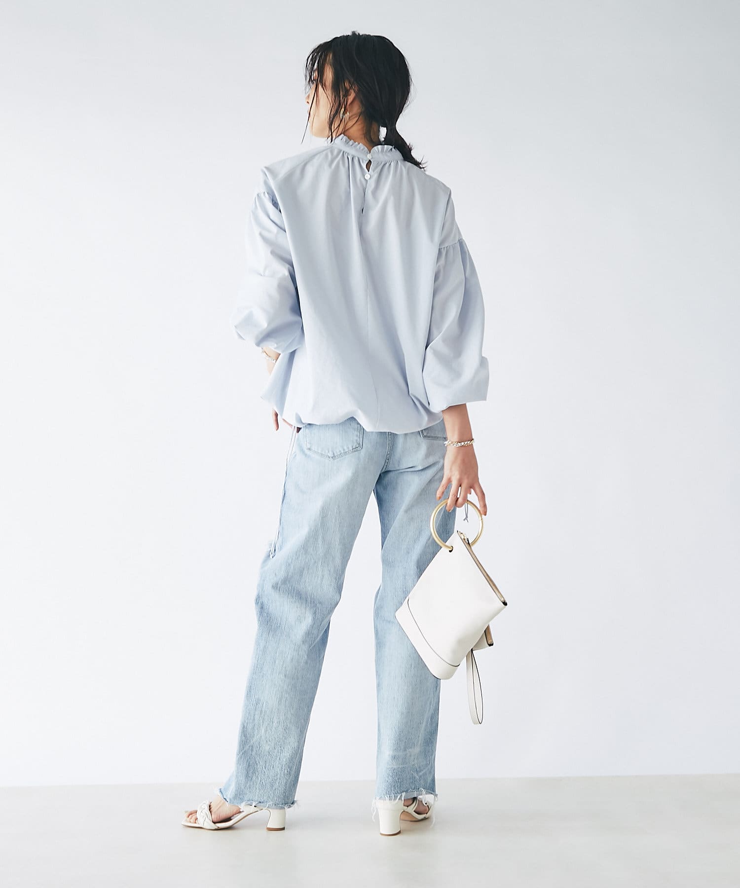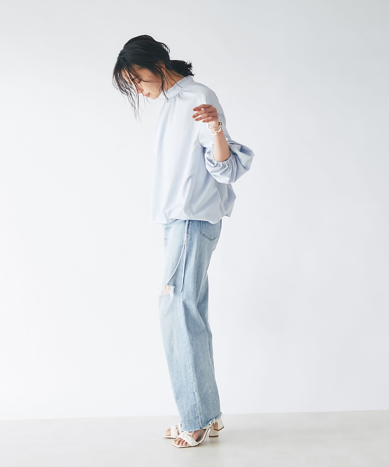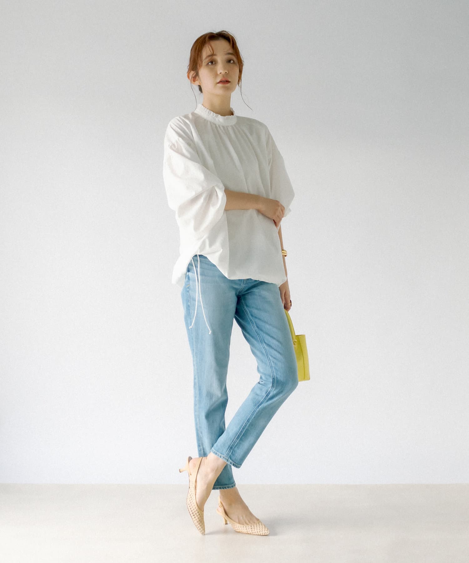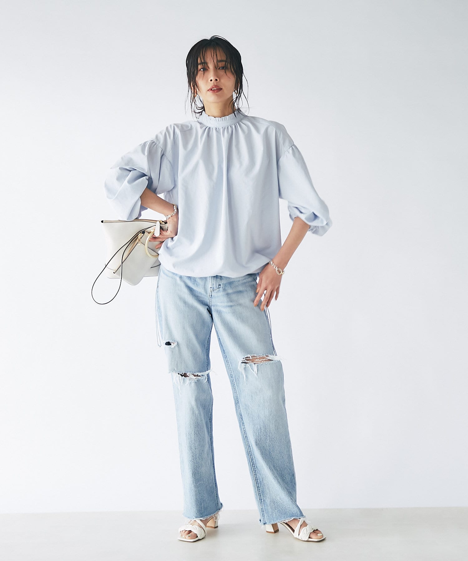 春コーデに欠かせないデザインブラウス。品のあるネックが大人顔な一枚。