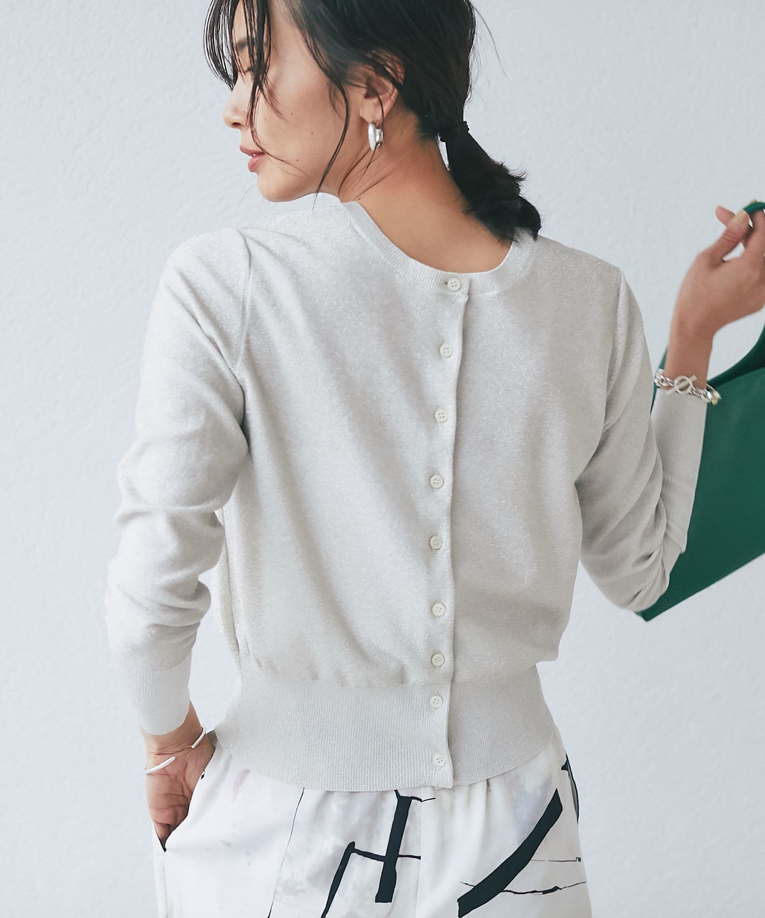 上品な光沢感のラメを使用したコンパクトニット。前後2WAY仕様で、プルオーバーとしてもカーディガンとしても着用いただける着回しの効く1着です。今季注目の素材のラメをプレーティングした編地は、裏面に肌への刺激を少ないドライタッチな綿ポリエステル糸を使用。ラメ特有のチクチクが苦手な方にも快適に着用いただけます。袖のリブが長めのデザインもお洒落で華奢見えするのも嬉しいポイント。