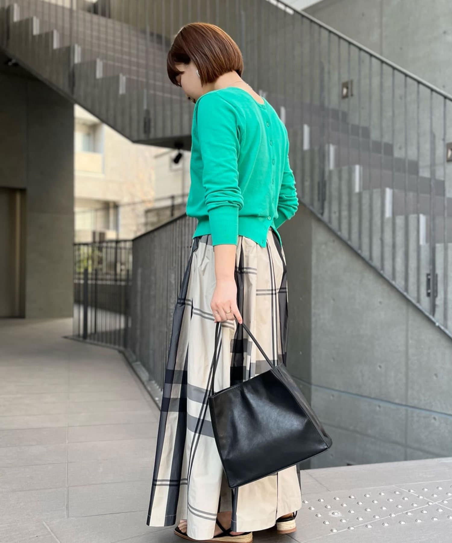 今季のボトムスとも着回ししやすいアイテムになっています。ワイドパンツやフレアスカートでボリュームのバランスを整えると◎脚長効果も期待できる一枚です。