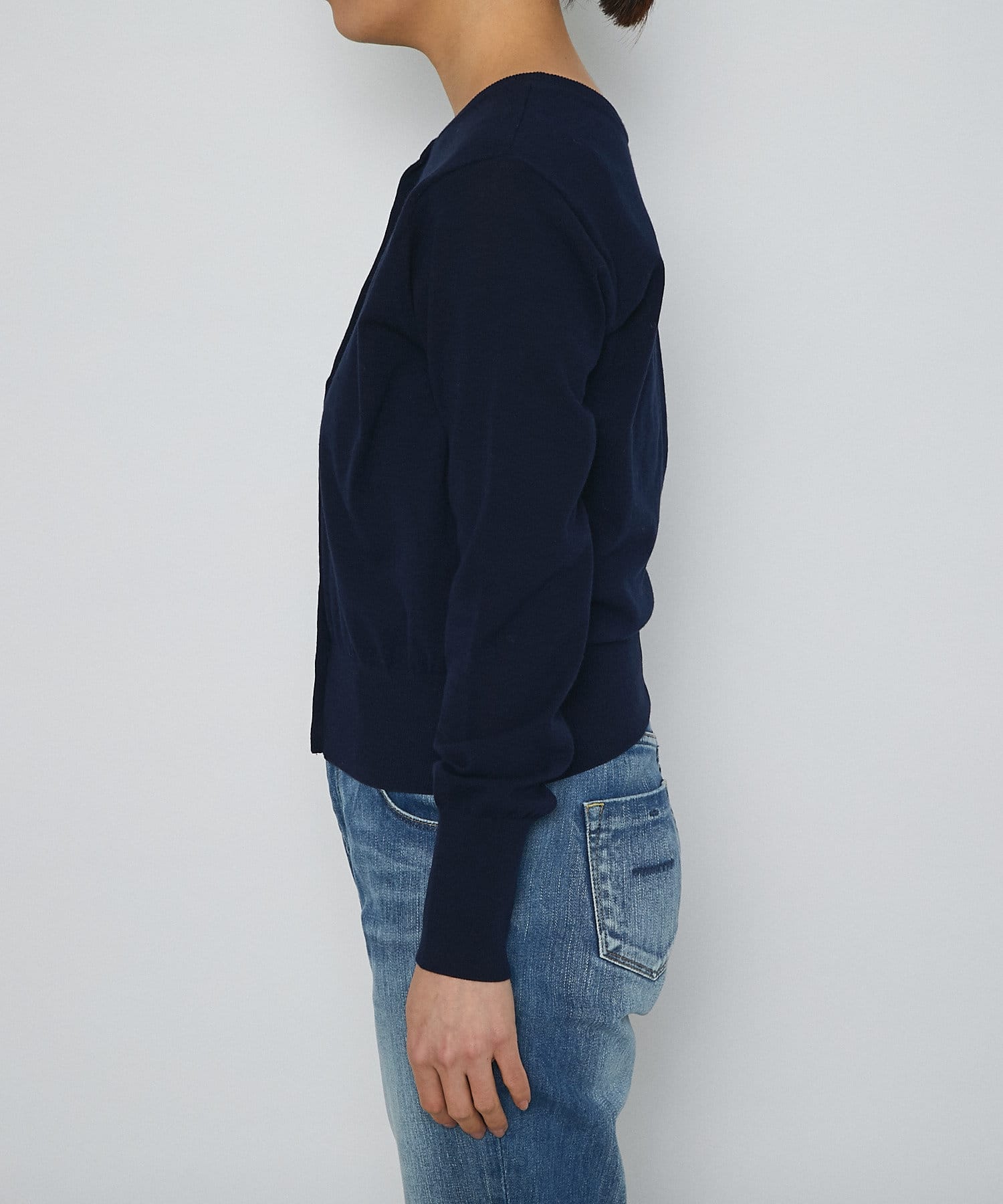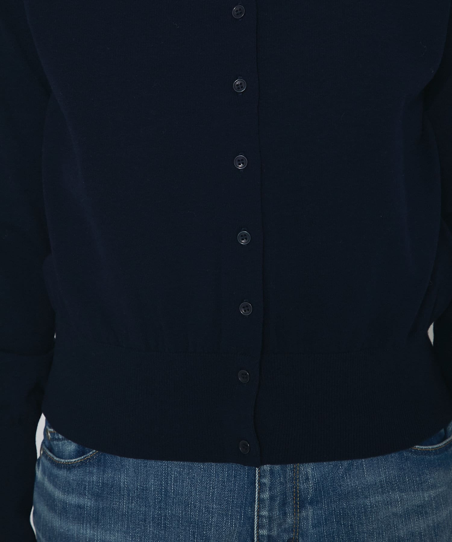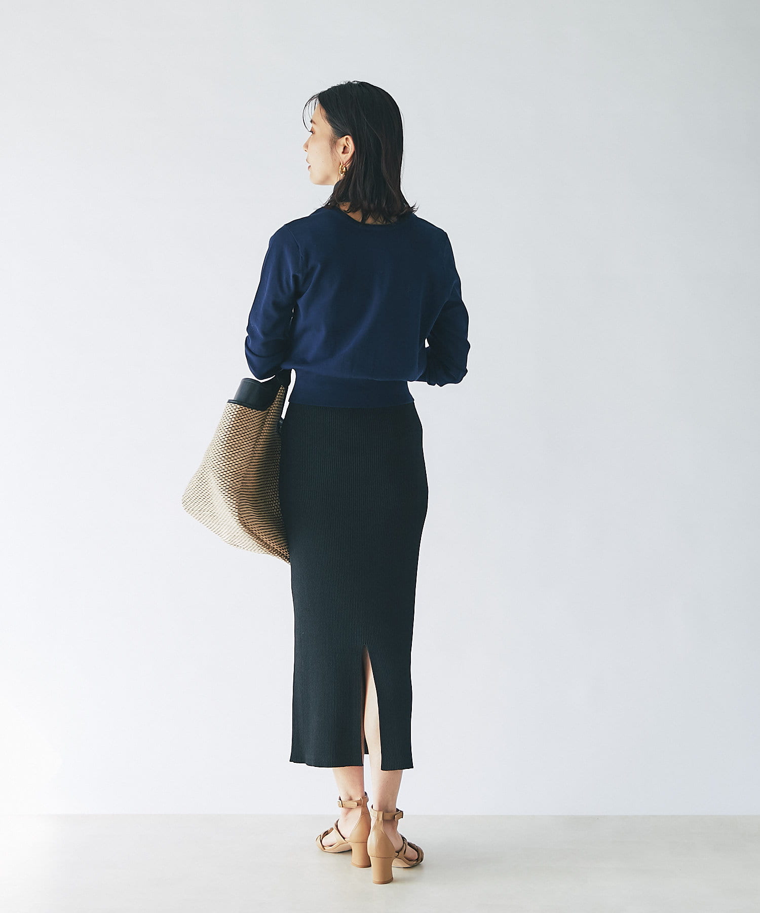 クロップド風ニットは、鮮度のある短めの丈感で仕上げています。またプルオーバーとカーディガンの前後2WAY仕様でCOOLCOTTONという綿の強撚糸でお作りしており、綿ならではの優しい冷感を出しています。袖口や裾に細めのリブを長めにデザインしており、コンパクトで華奢な印象に。