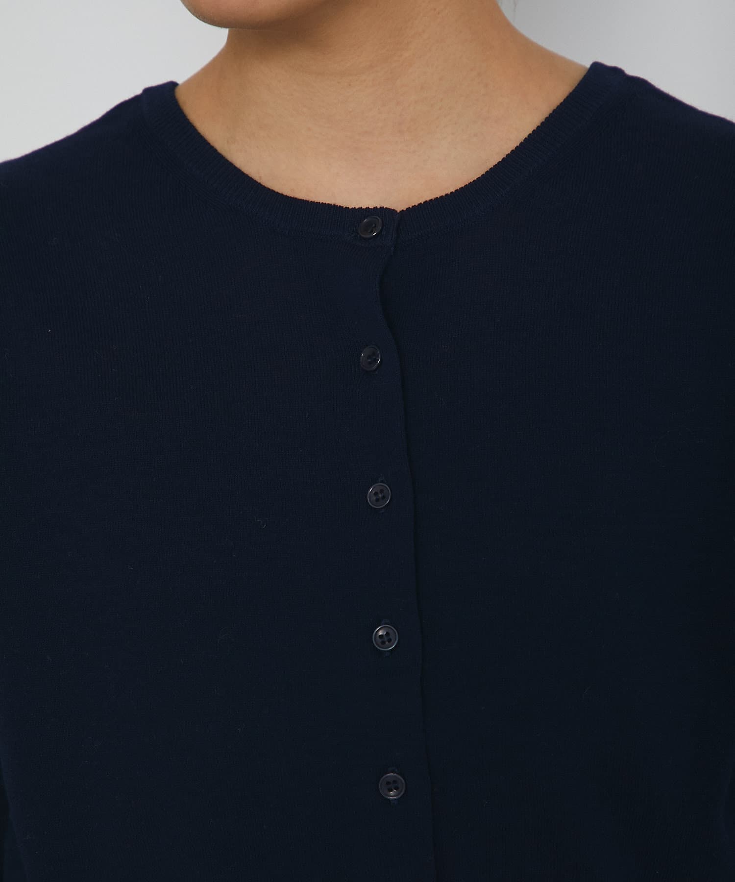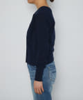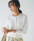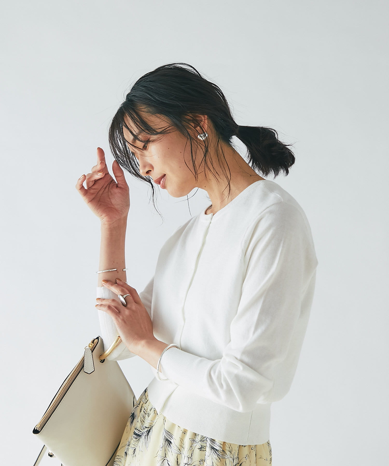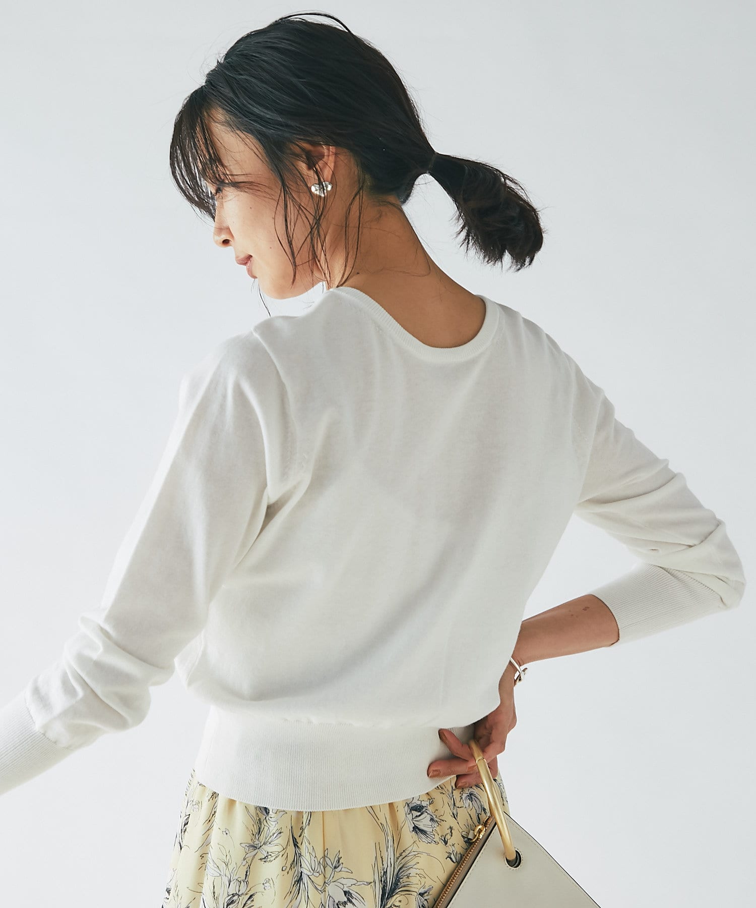 クロップド風ニットは、鮮度のある短めの丈感で仕上げています。またプルオーバーとカーディガンの前後2WAY仕様でCOOLCOTTONという綿の強撚糸でお作りしており、綿ならではの優しい冷感を出しています。袖口や裾に細めのリブを長めにデザインしており、コンパクトで華奢な印象に。