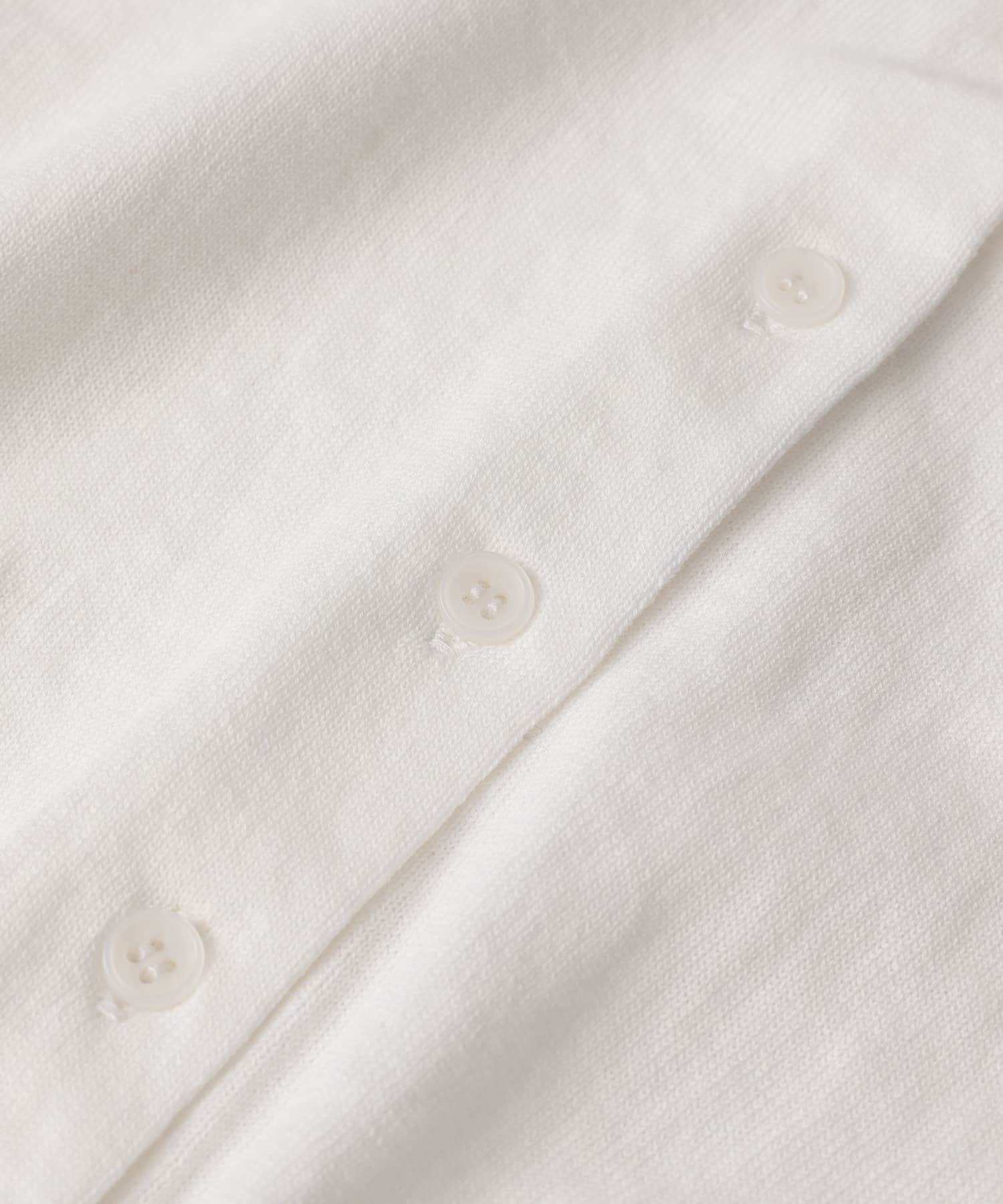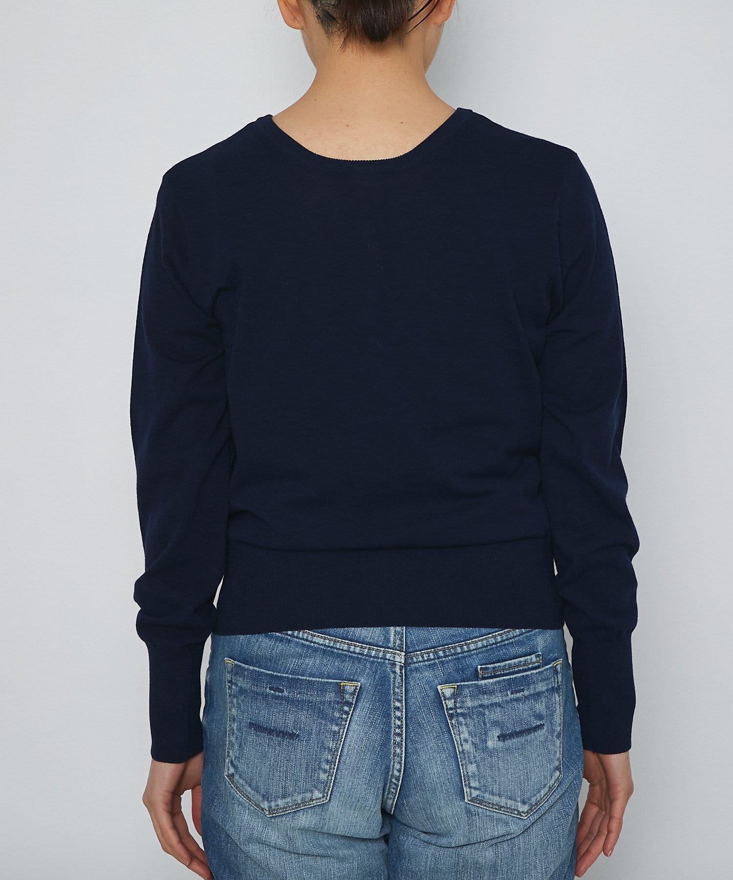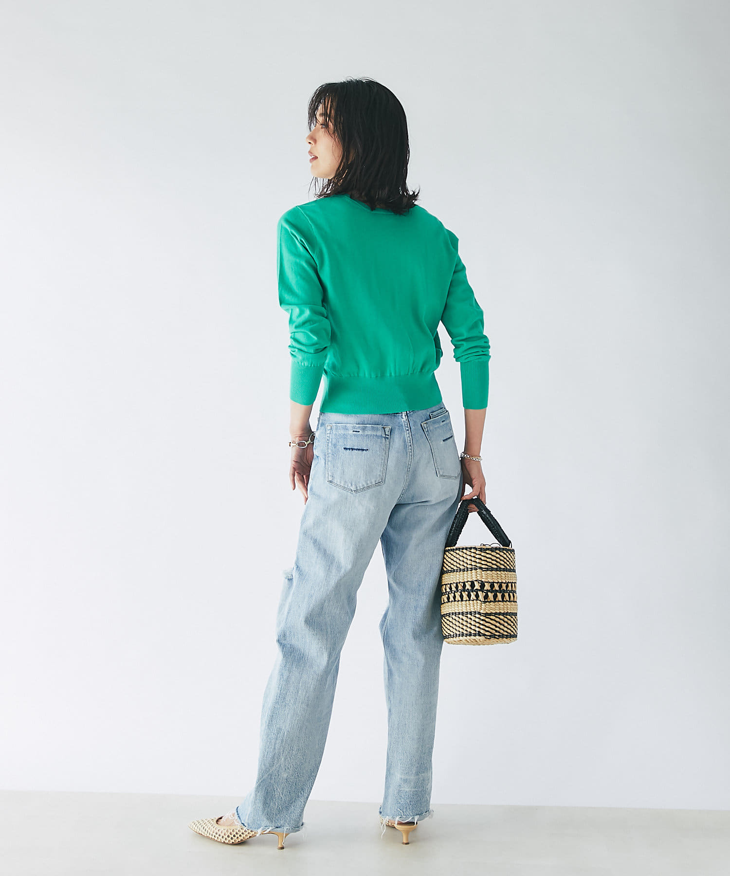クロップド風ニットは、鮮度のある短めの丈感で仕上げています。またプルオーバーとカーディガンの前後2WAY仕様でCOOLCOTTONという綿の強撚糸でお作りしており、綿ならではの優しい冷感を出しています。袖口や裾に細めのリブを長めにデザインしており、コンパクトで華奢な印象に。