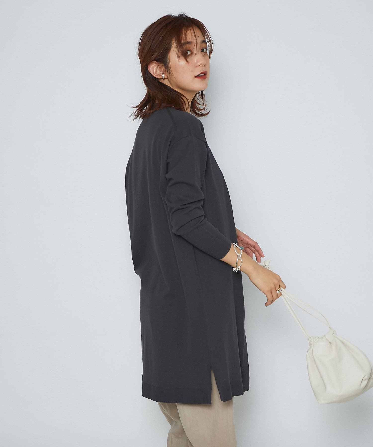 サイドにスリットが入っているので、重たい印象にならずに着用できます。