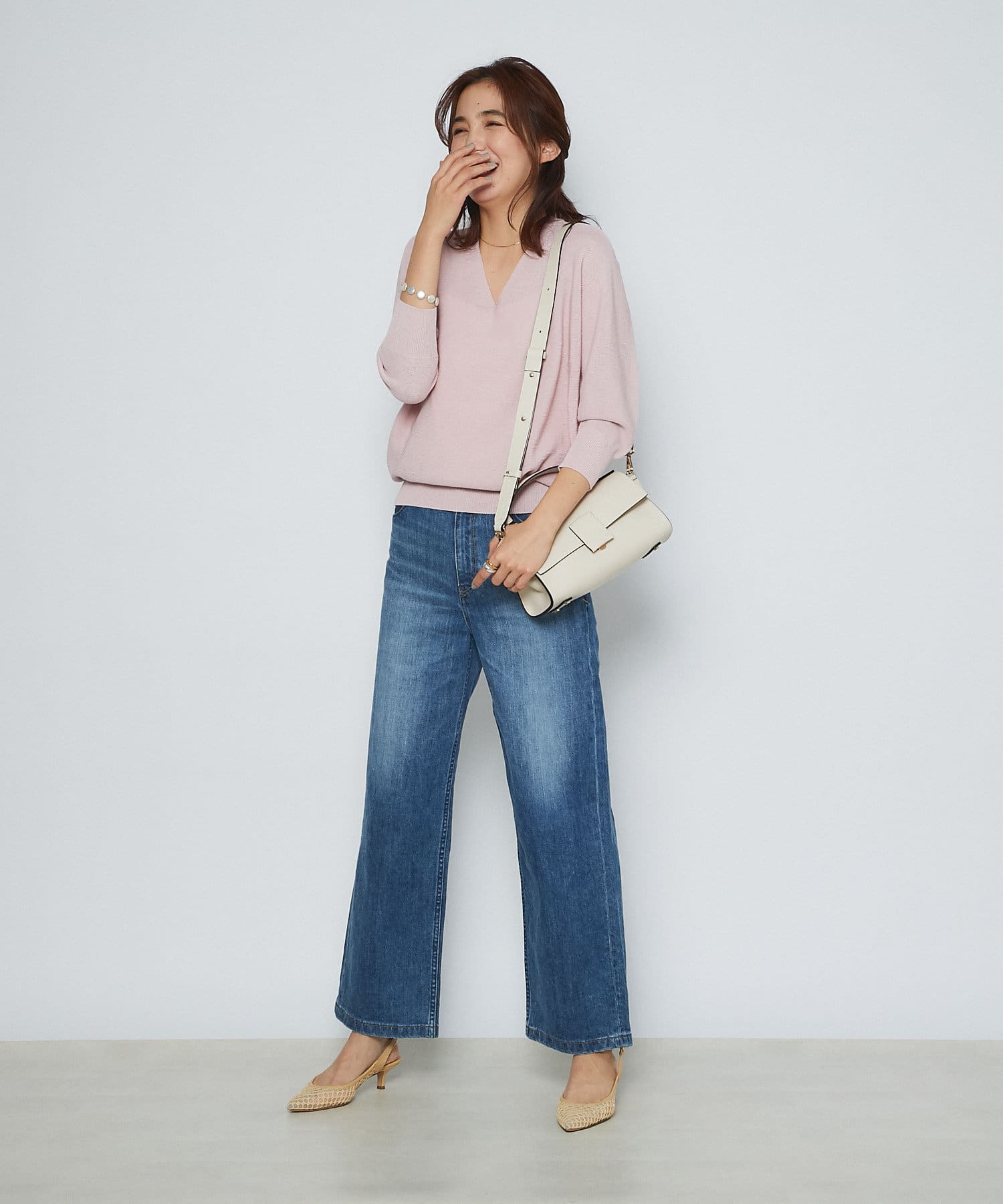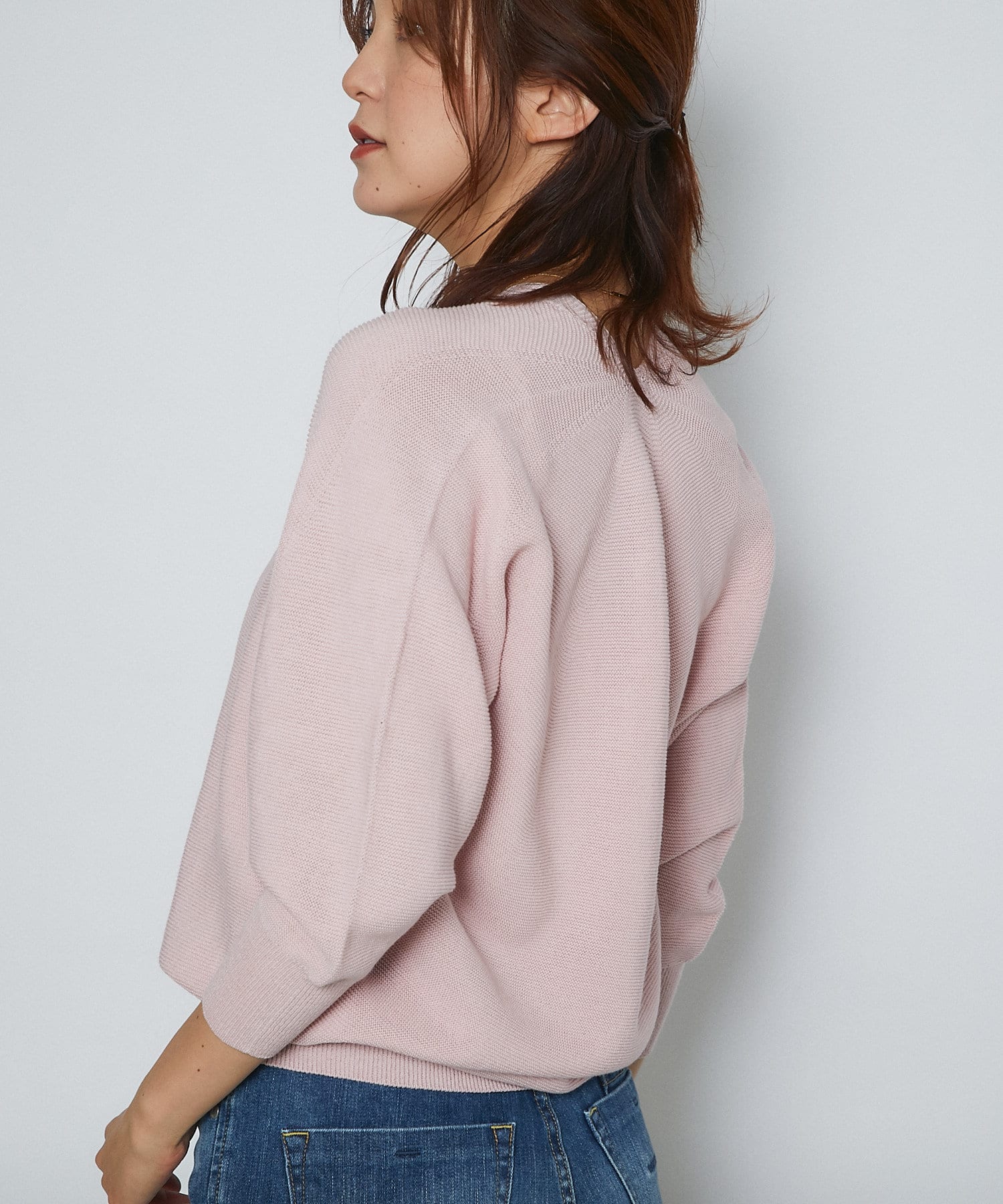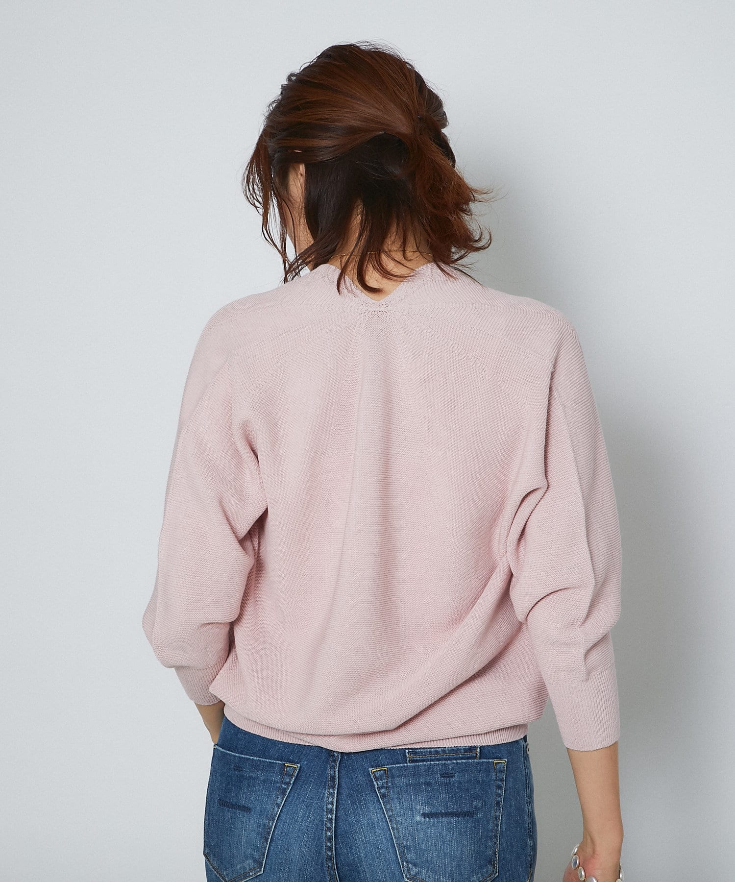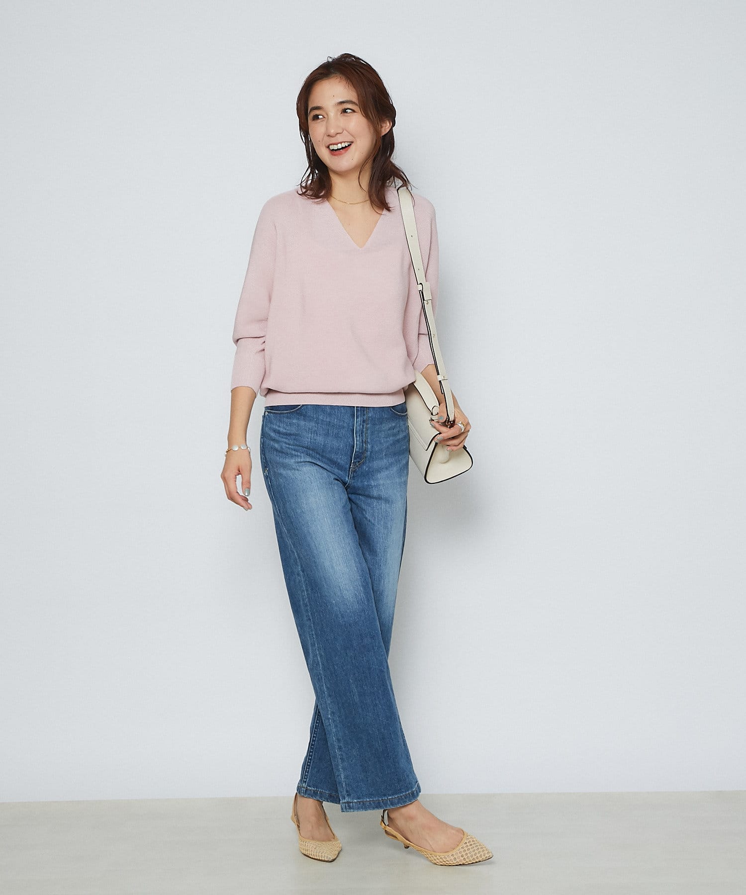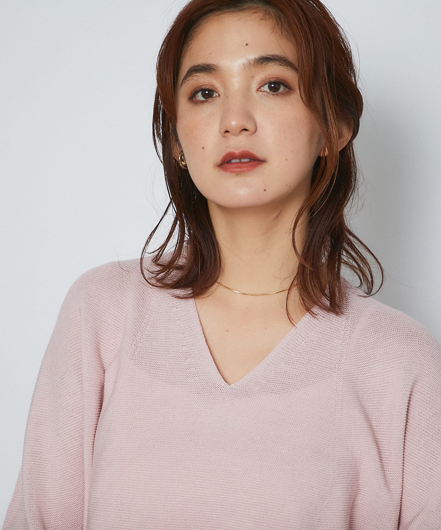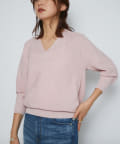 定番のバックボリュームニットは、シャープなVネックで顔周りをすっきりと見せてくれます。淡いピンクが春らしくてイチ押しのカラーです。
