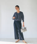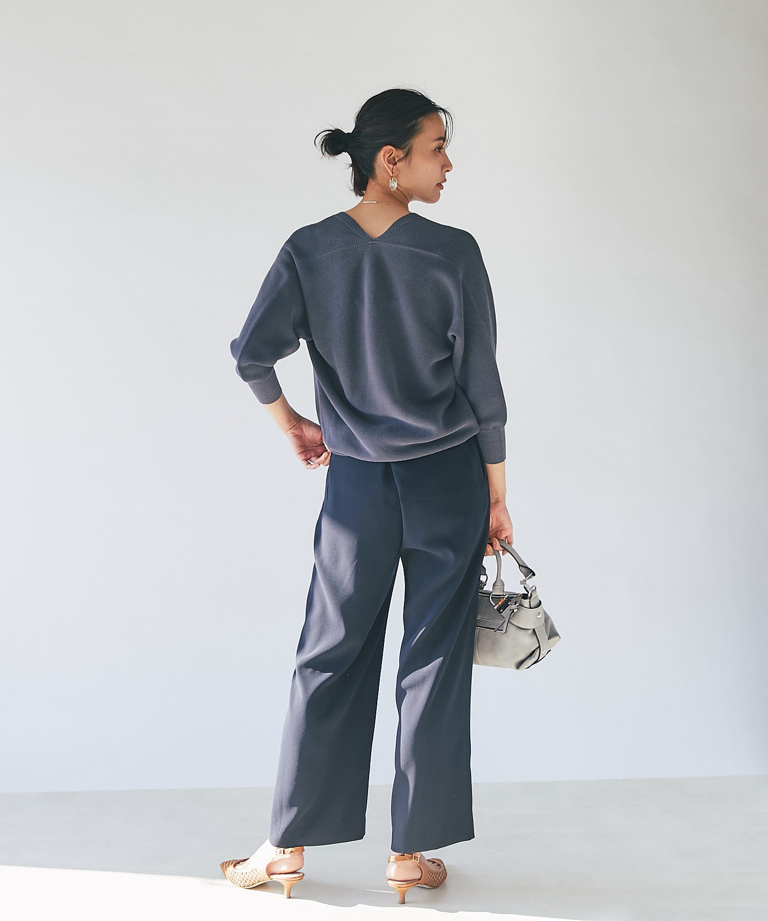 縦長のVネックラインなので、首元がスッキリとしたフォルムで着用できます。