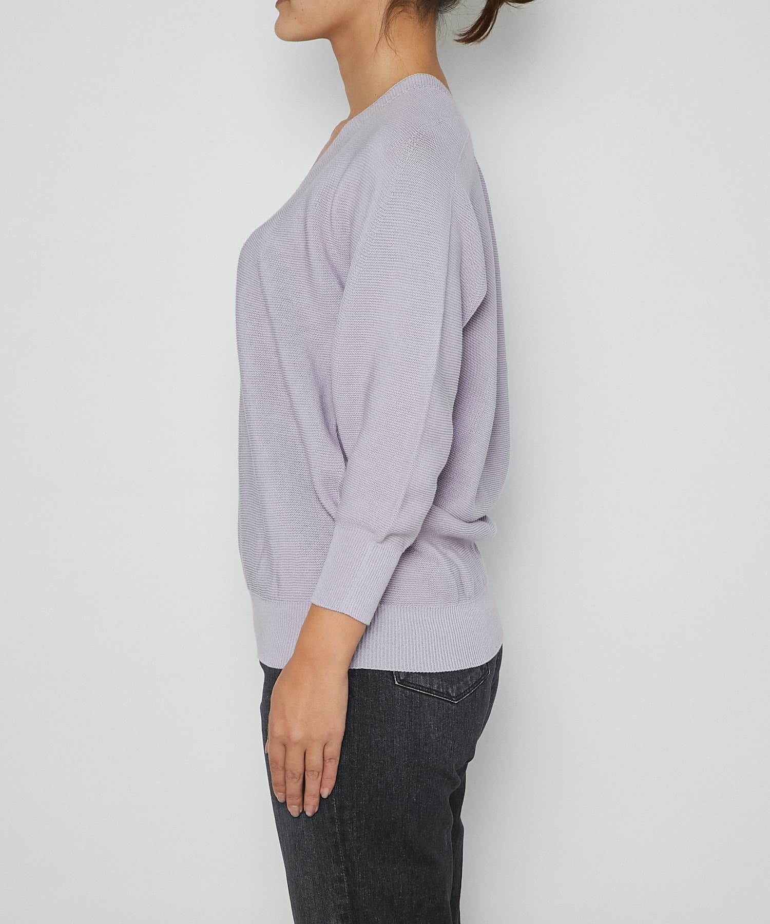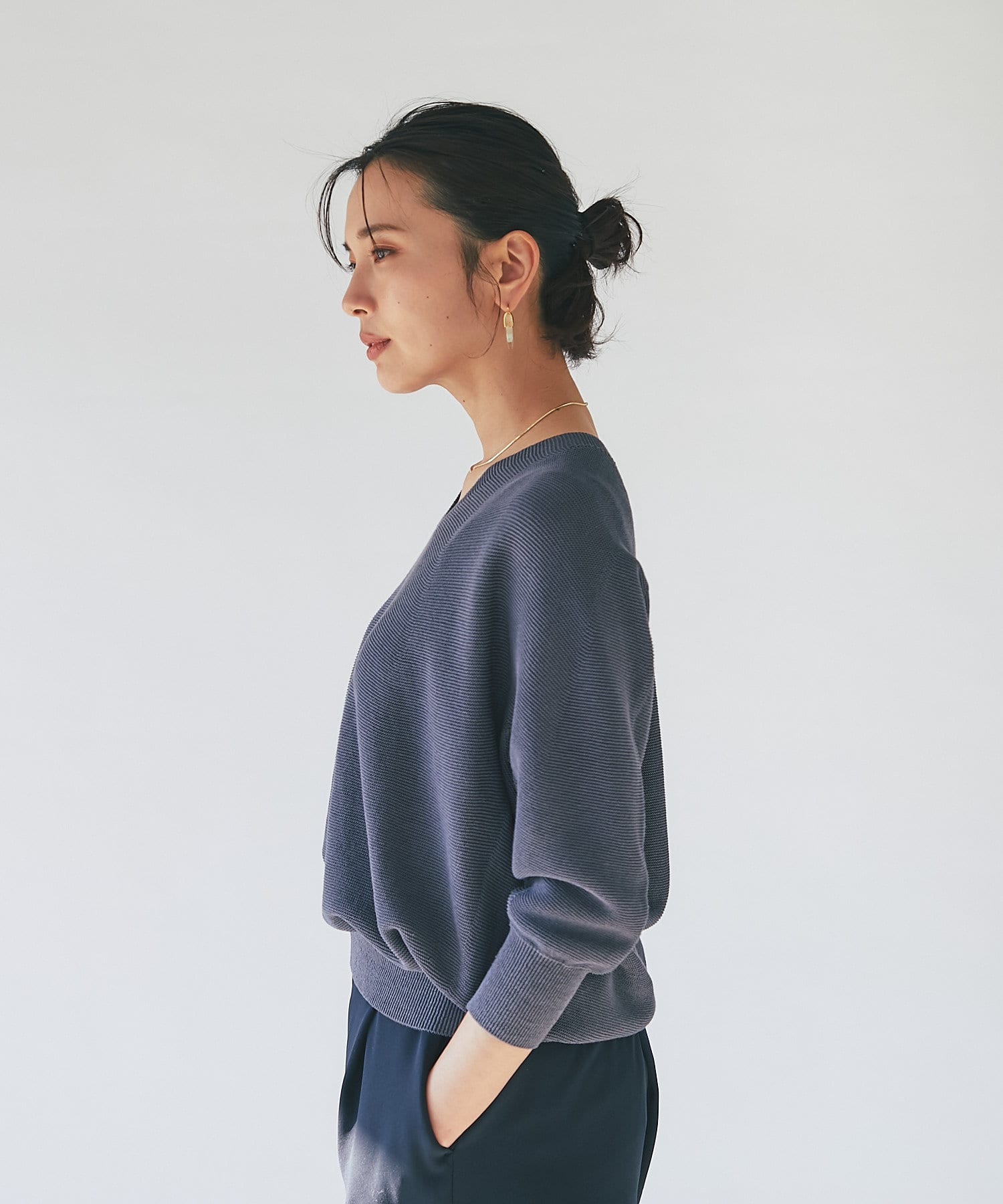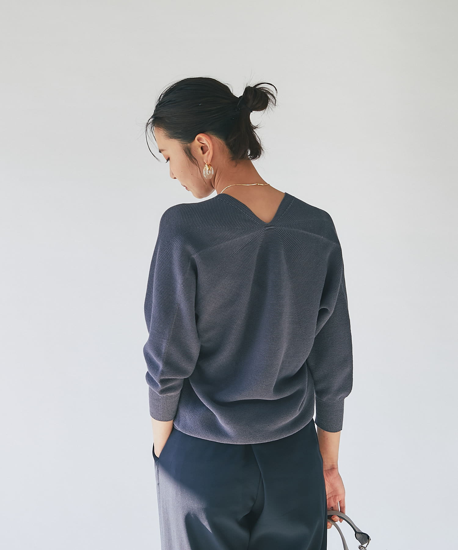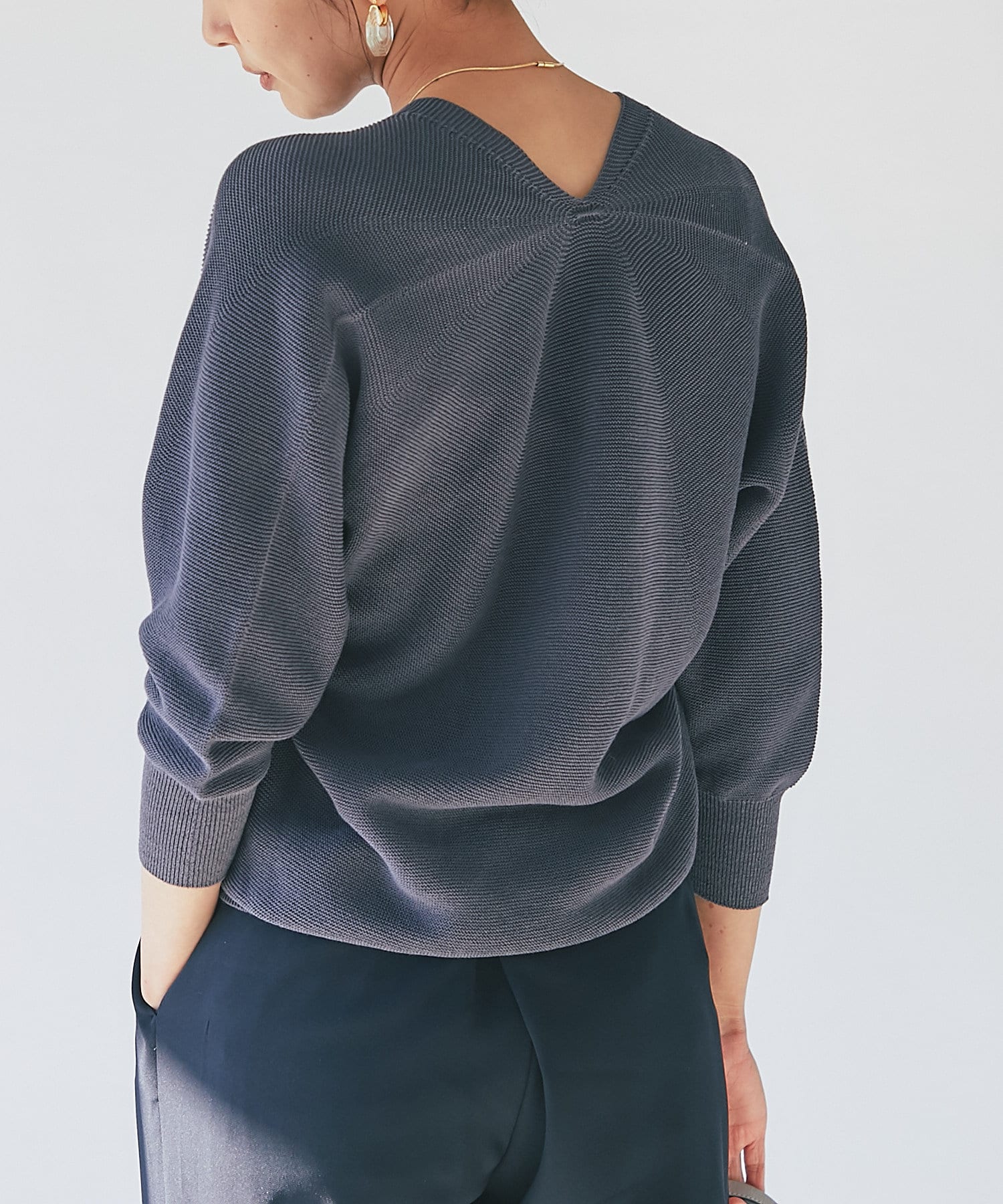 リヴドロワ定番人気のバックボリュームニットに新色登場!デコルテがキレイにみえるVネックで女性らしさを演出。