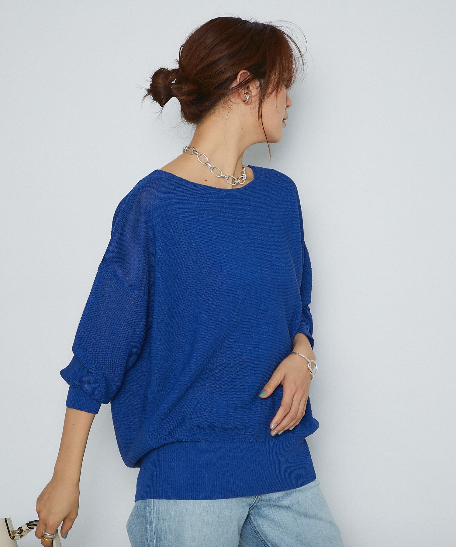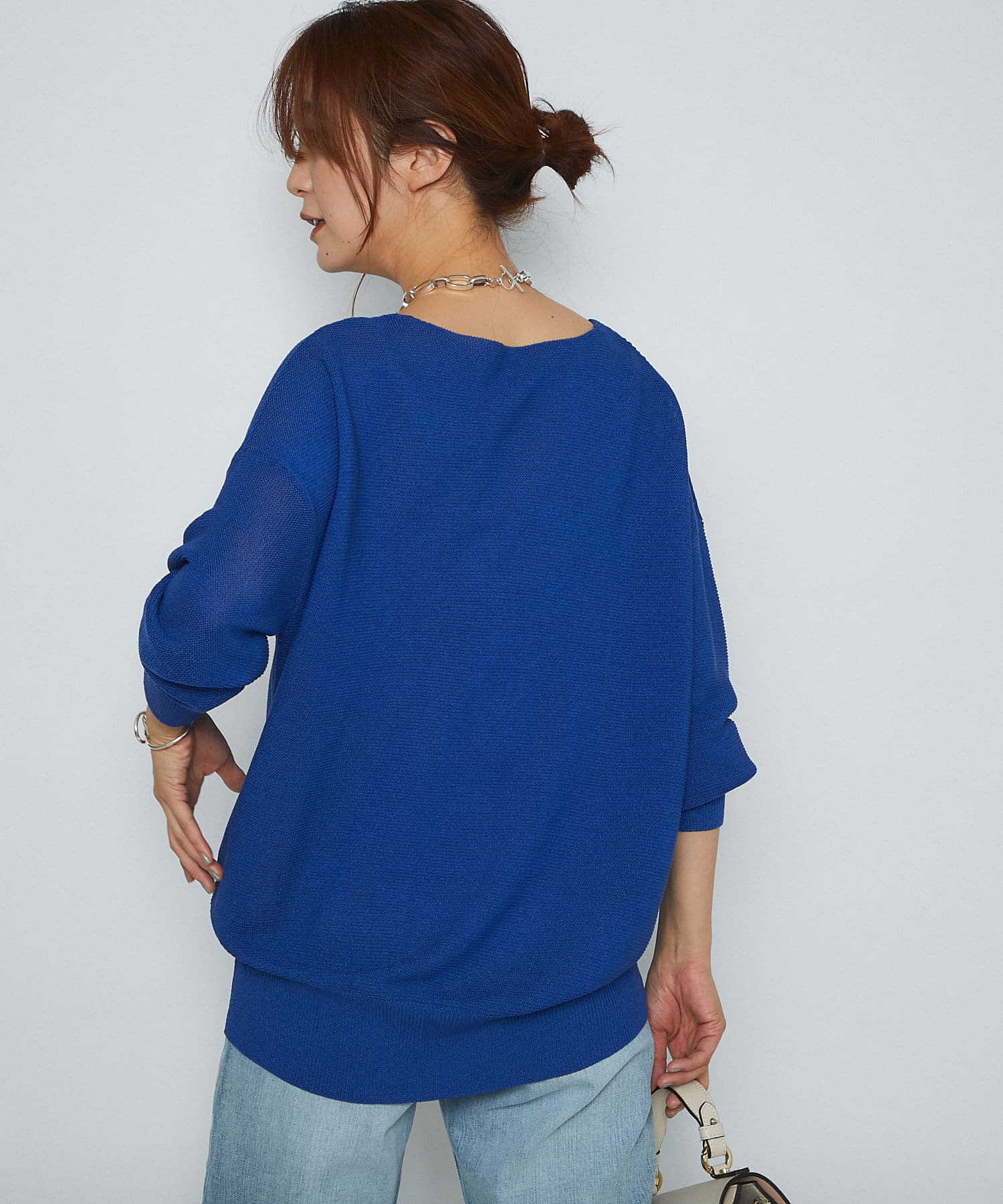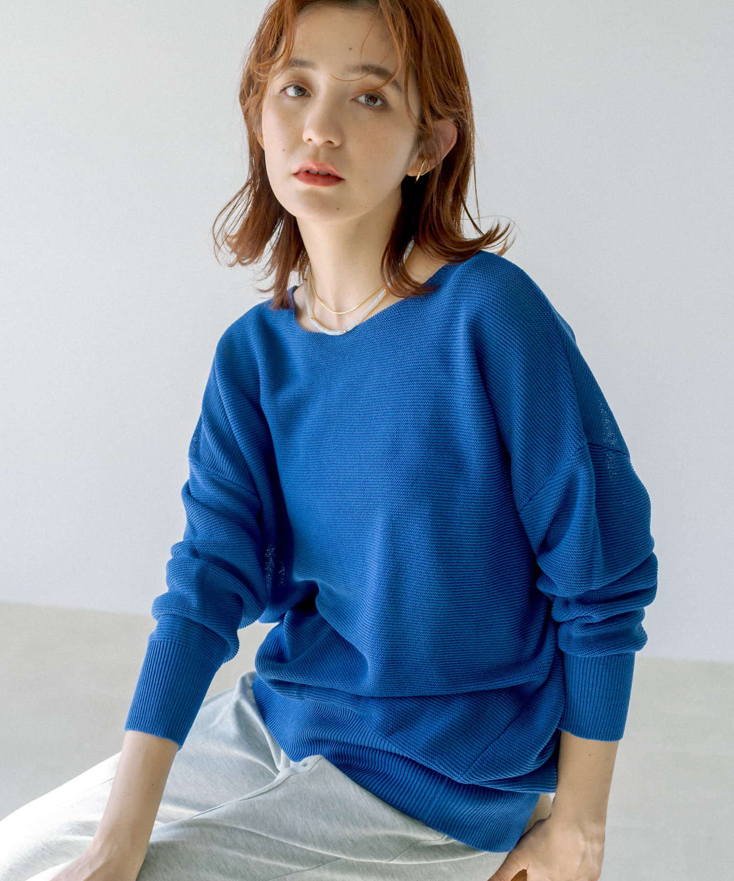 大人女子の好感度を上げてくれるブルーニット。ワイドシルエットなので体型カバーが叶う一枚!ネックラインも綺麗に見えるので一枚で着映えるアイテム♪