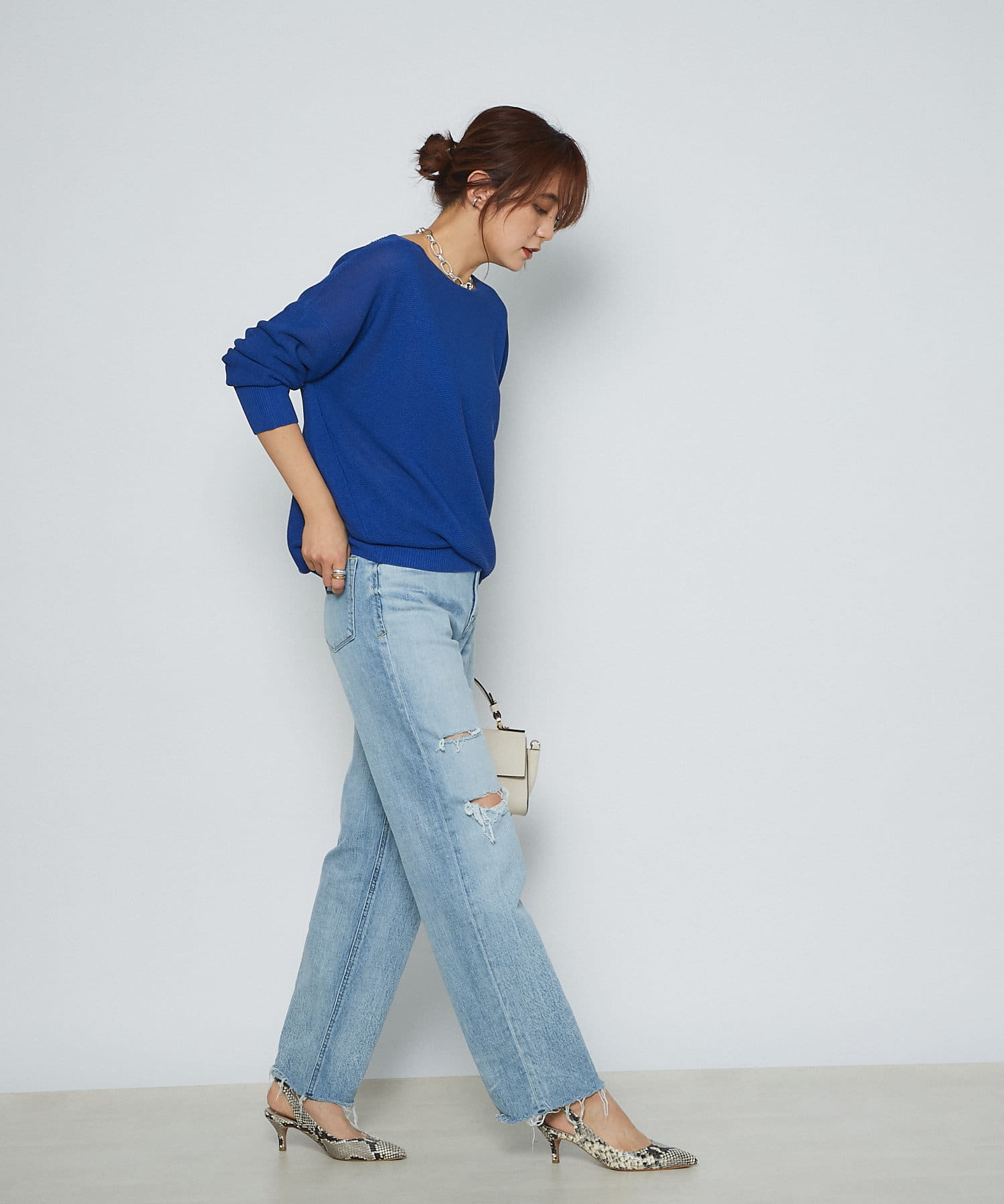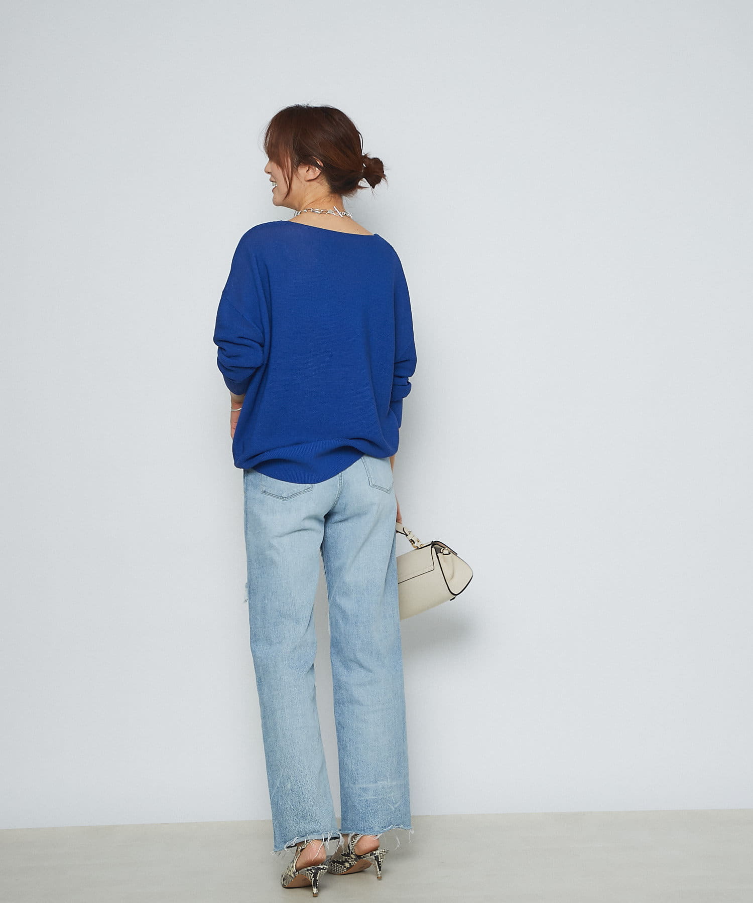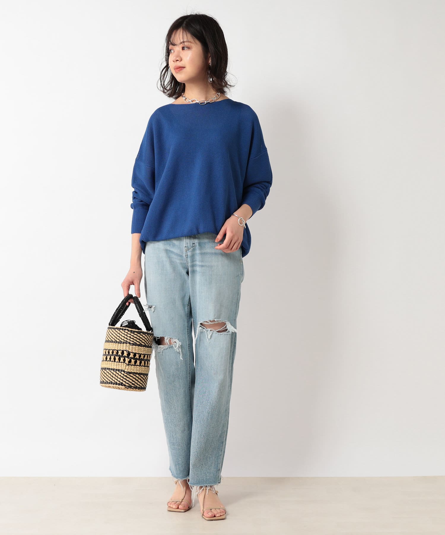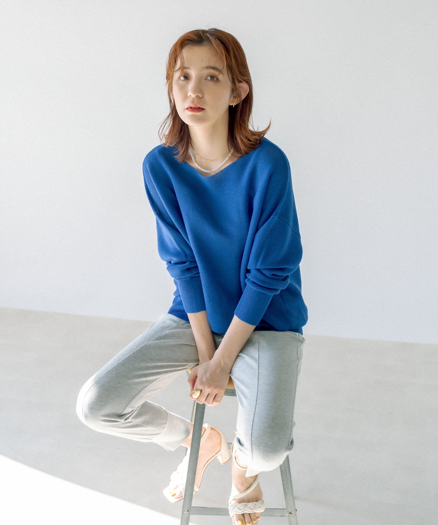 大人女子の好感度を上げてくれるブルーニット。ワイドシルエットなので体型カバーが叶う一枚!ネックラインも綺麗に見えるので一枚で着映えるアイテム♪