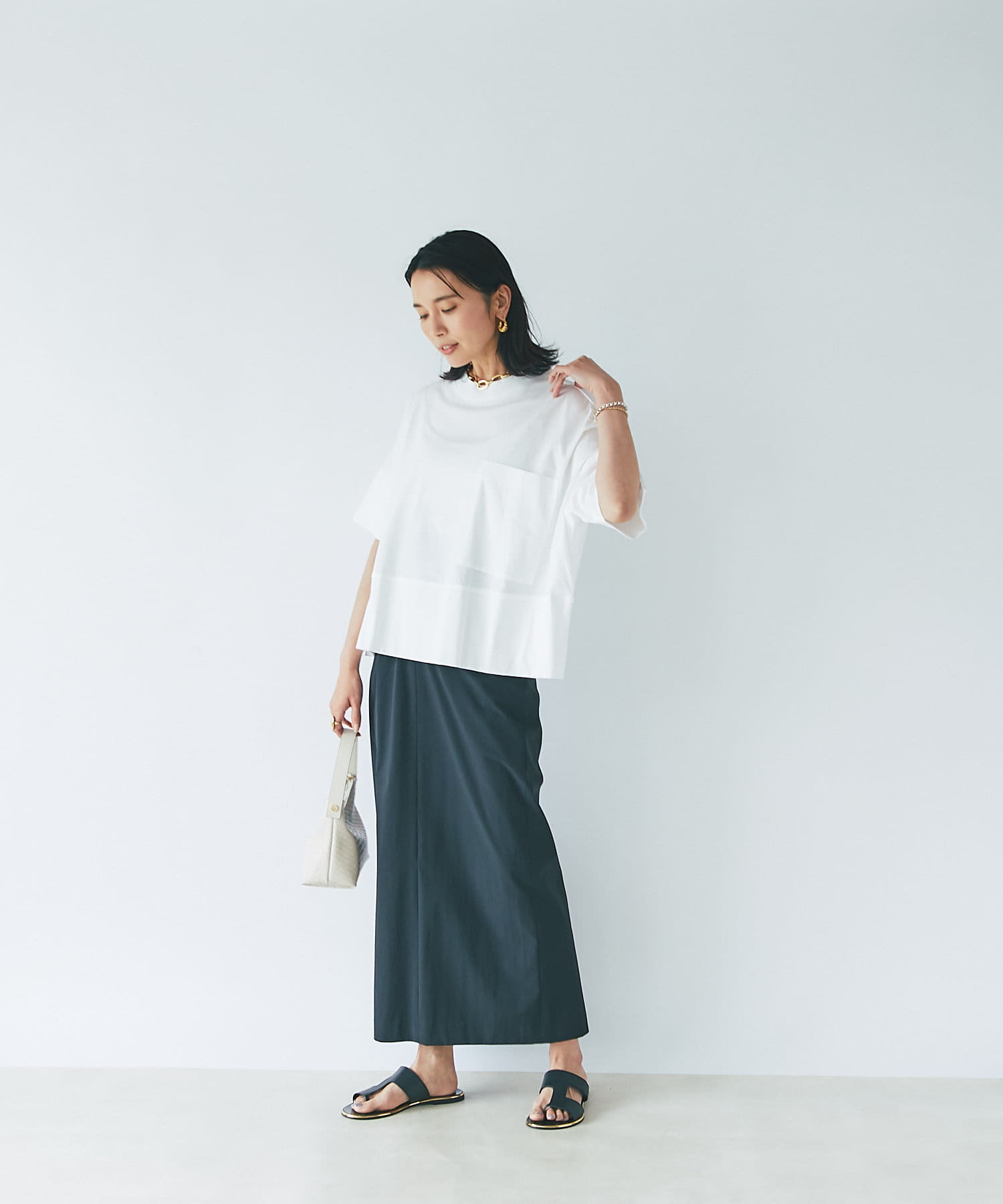 ベーシックなカラーリングなので、カラーボトムを合わせるとトレンドライクな着こなしに♪