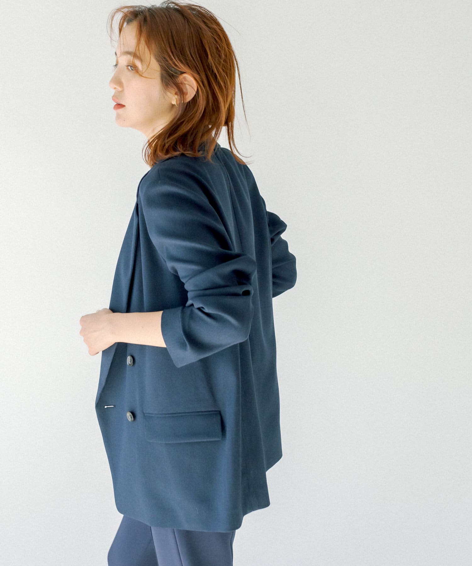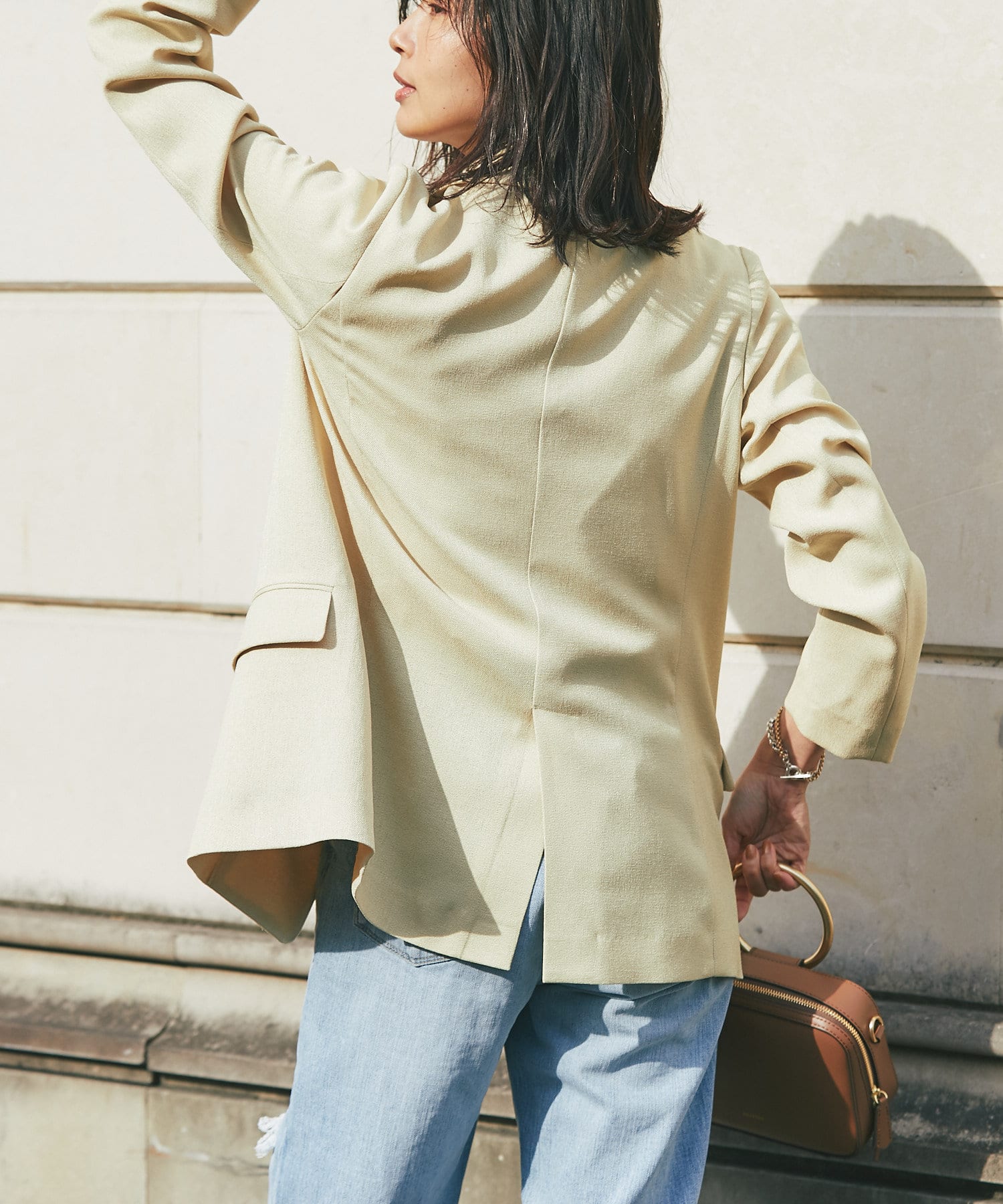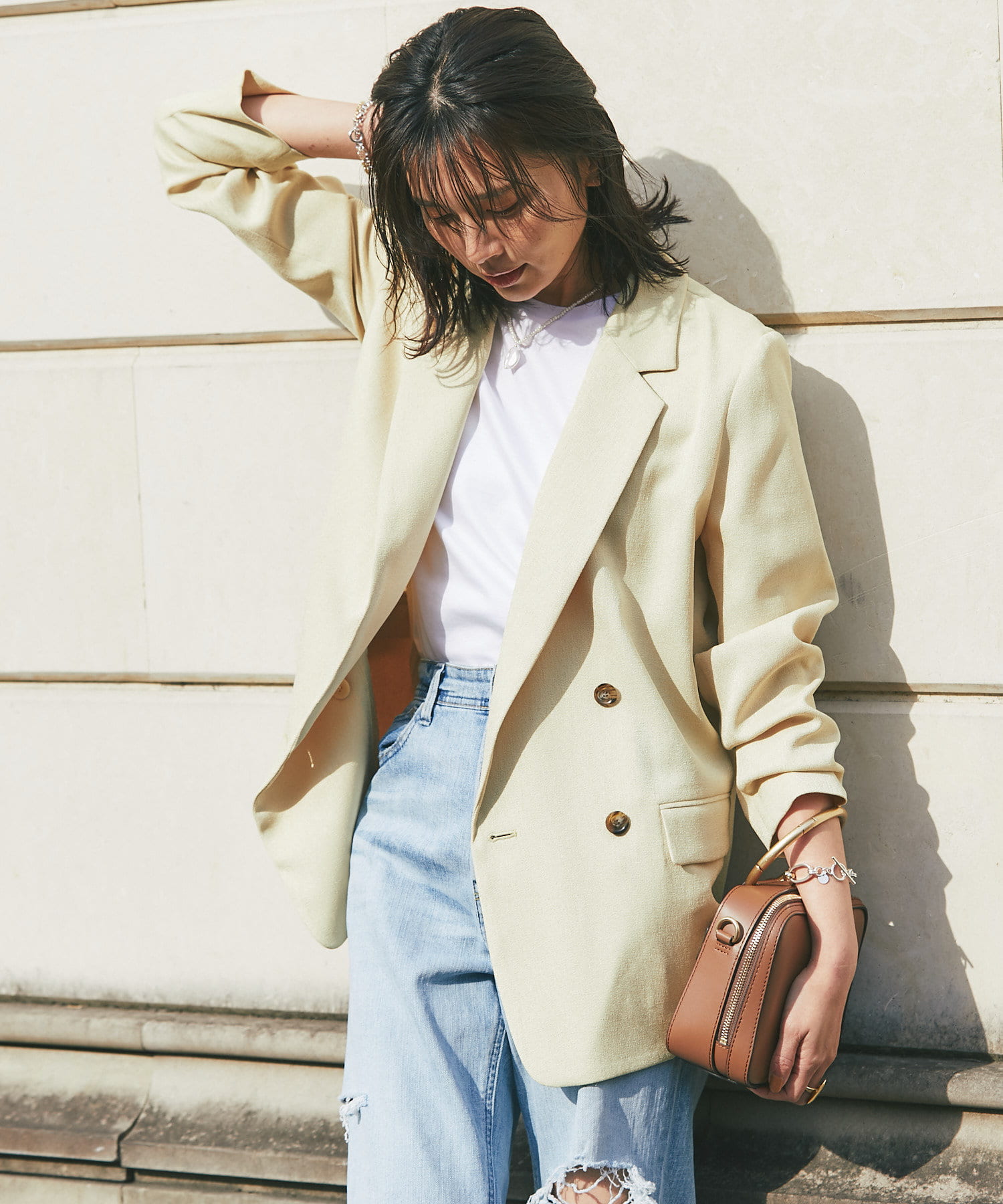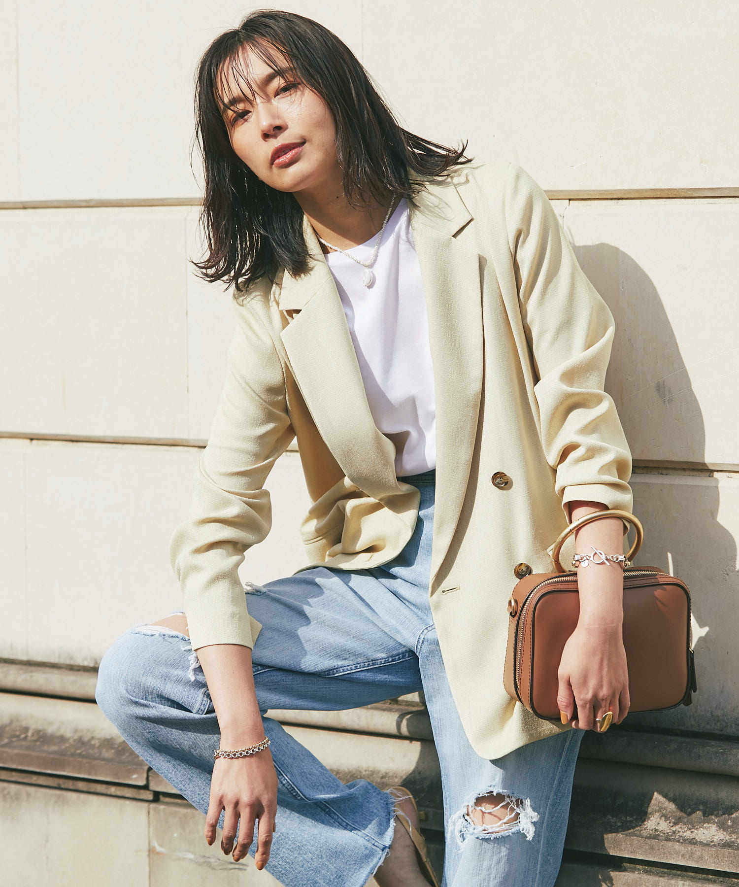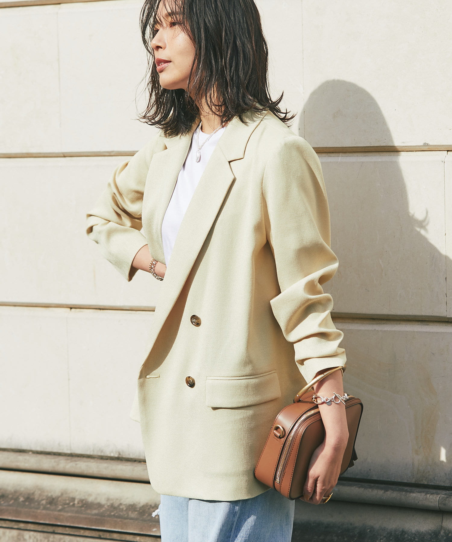 ジャケットを外しのアイテムとして着用するのが今季のトレンド。Tシャツにデニムとカジュアルなスタイリングに羽織るだけで、洗練されたコーディネートに。またオーバーサイズのジャケットは、ブラウスをトップスインしてタイトスカートやパンツとあわせると品よく着こなせます。オフィスからカジュアルまで着用シーンを選ばない万能ジャケットです。