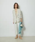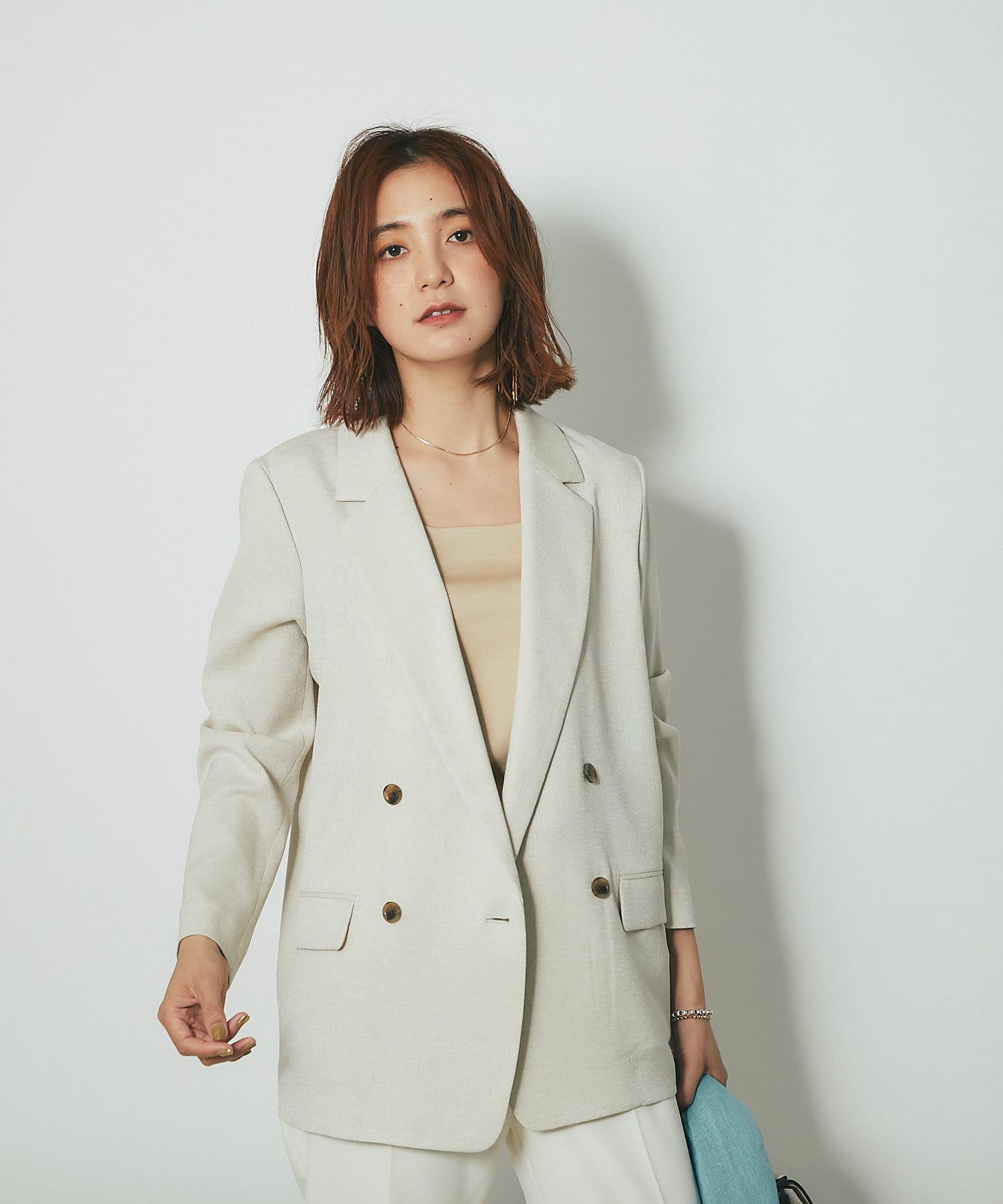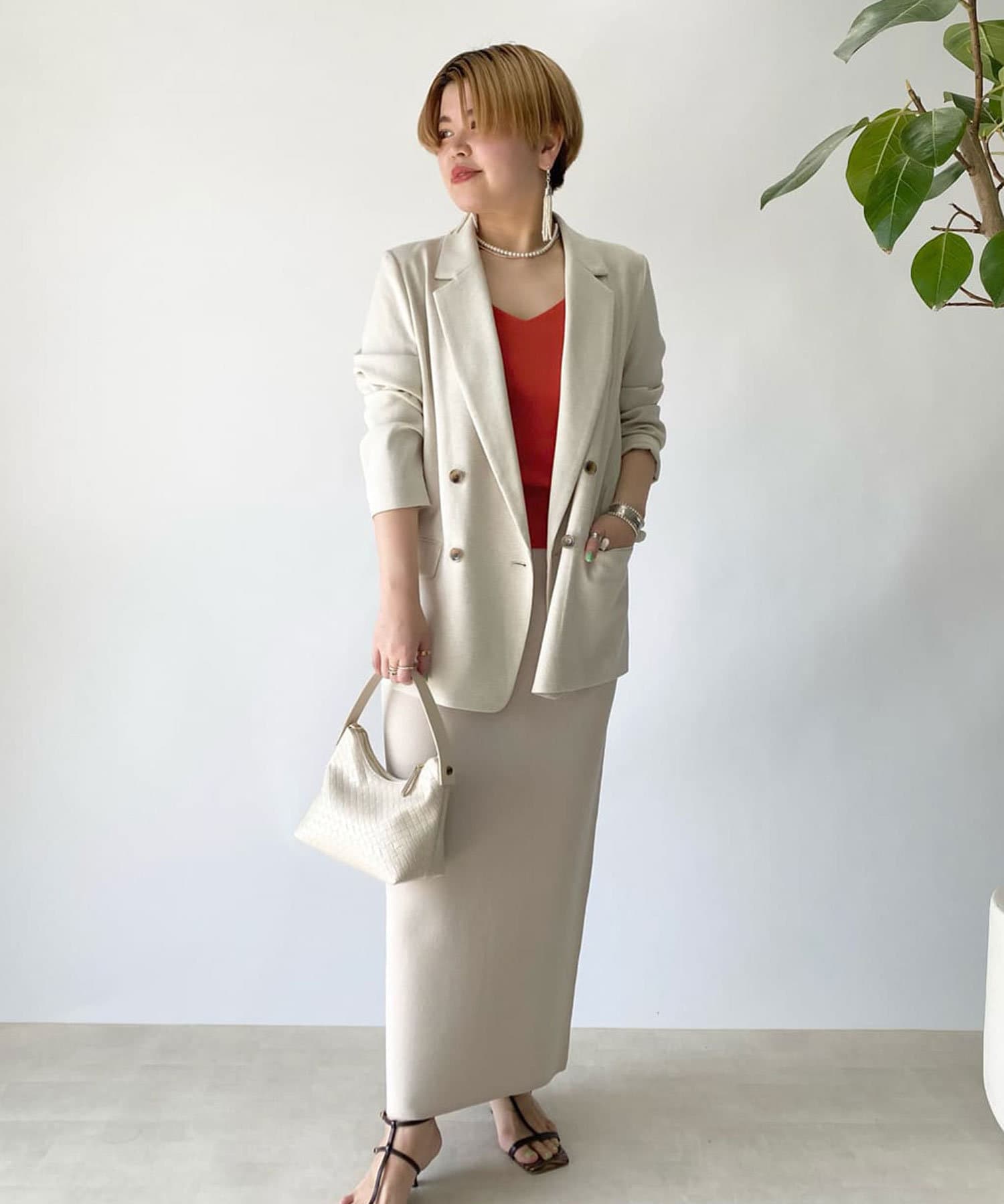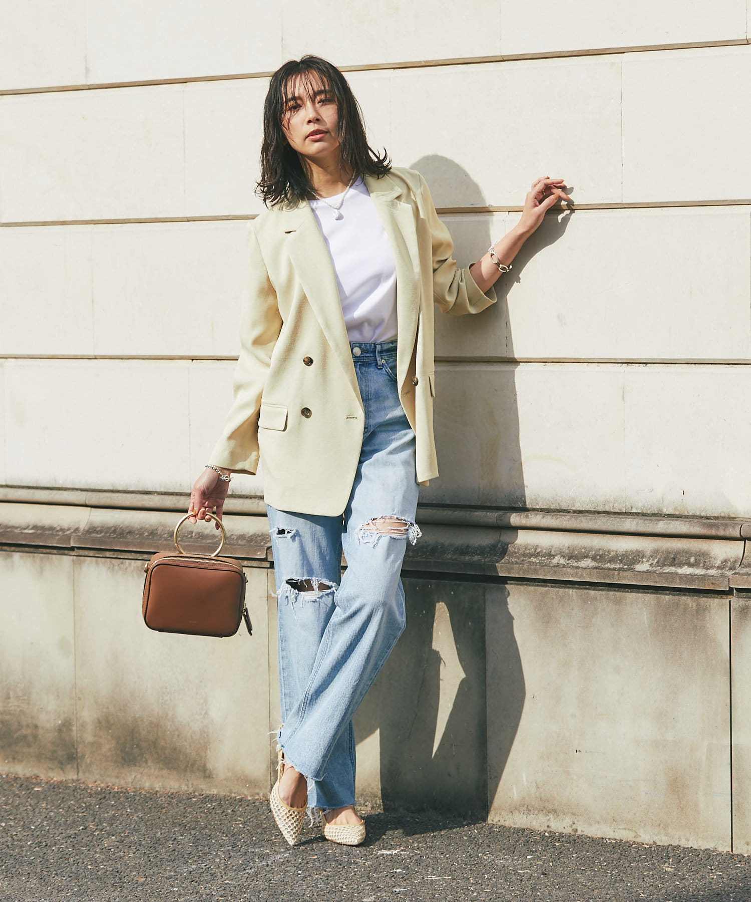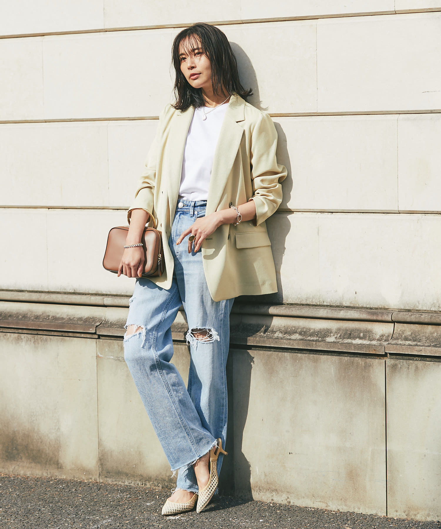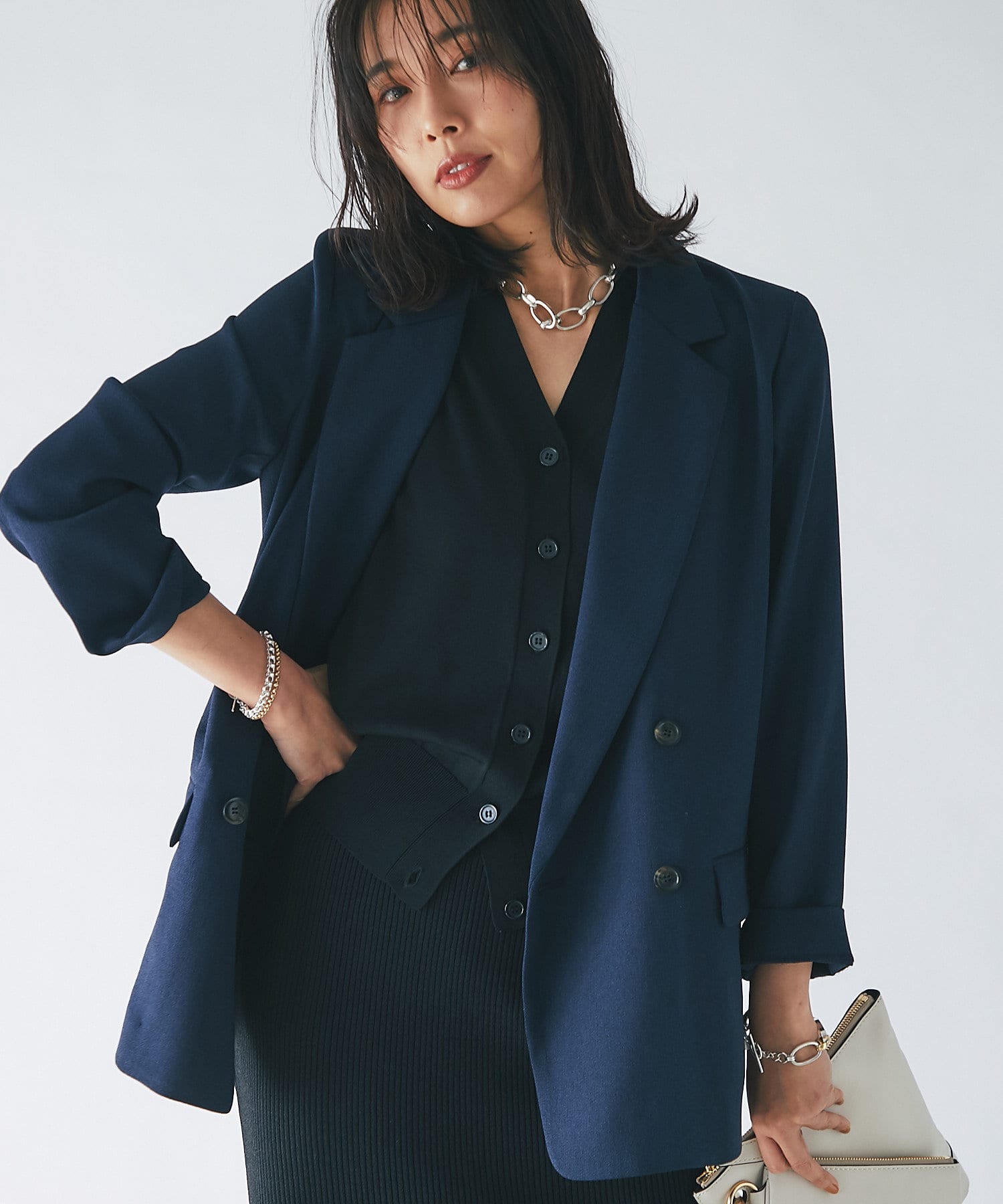 ジャケットを外しのアイテムとして着用するのが今季のトレンド。Tシャツにデニムとカジュアルなスタイリングに羽織るだけで、洗練されたコーディネートに。またオーバーサイズのジャケットは、ブラウスをトップスインしてタイトスカートやパンツとあわせると品よく着こなせます。オフィスからカジュアルまで着用シーンを選ばない万能ジャケットです。