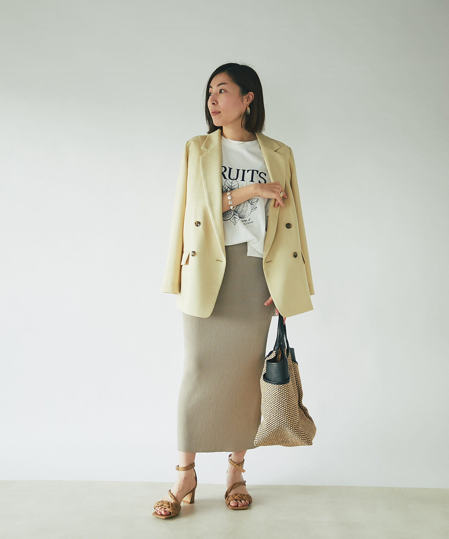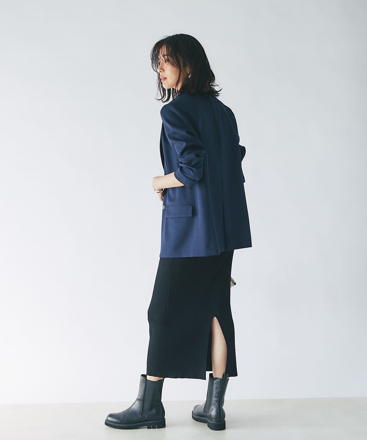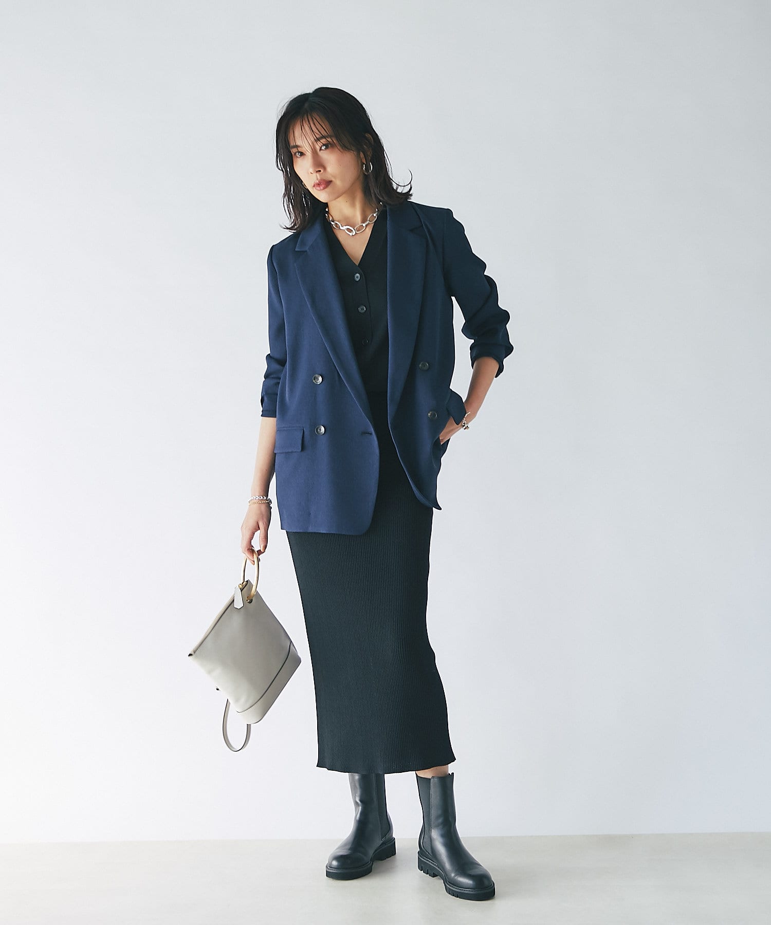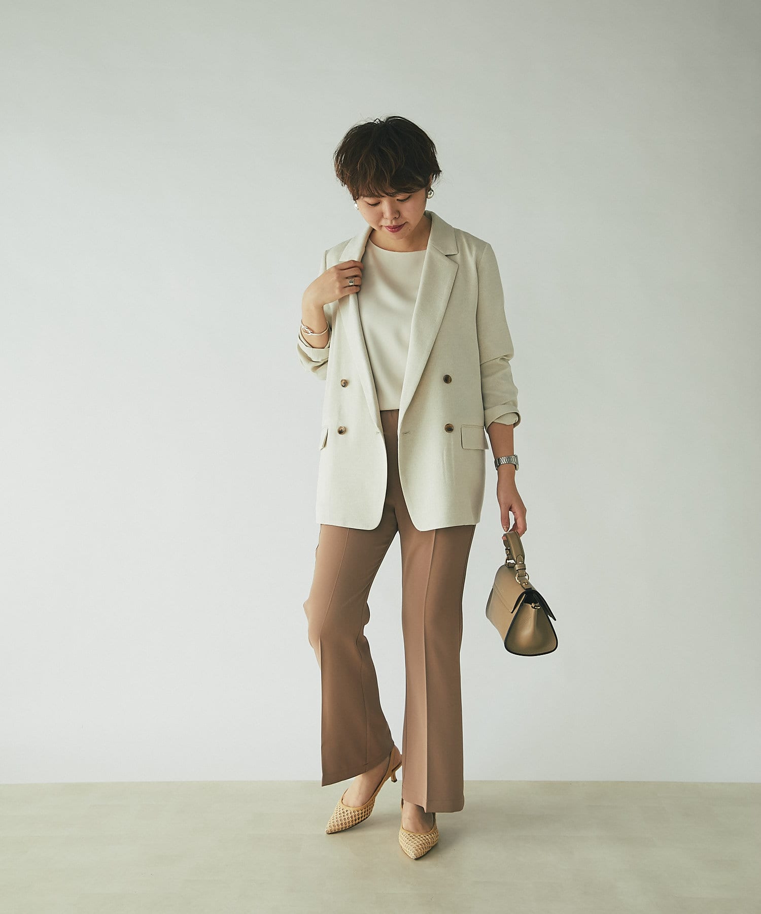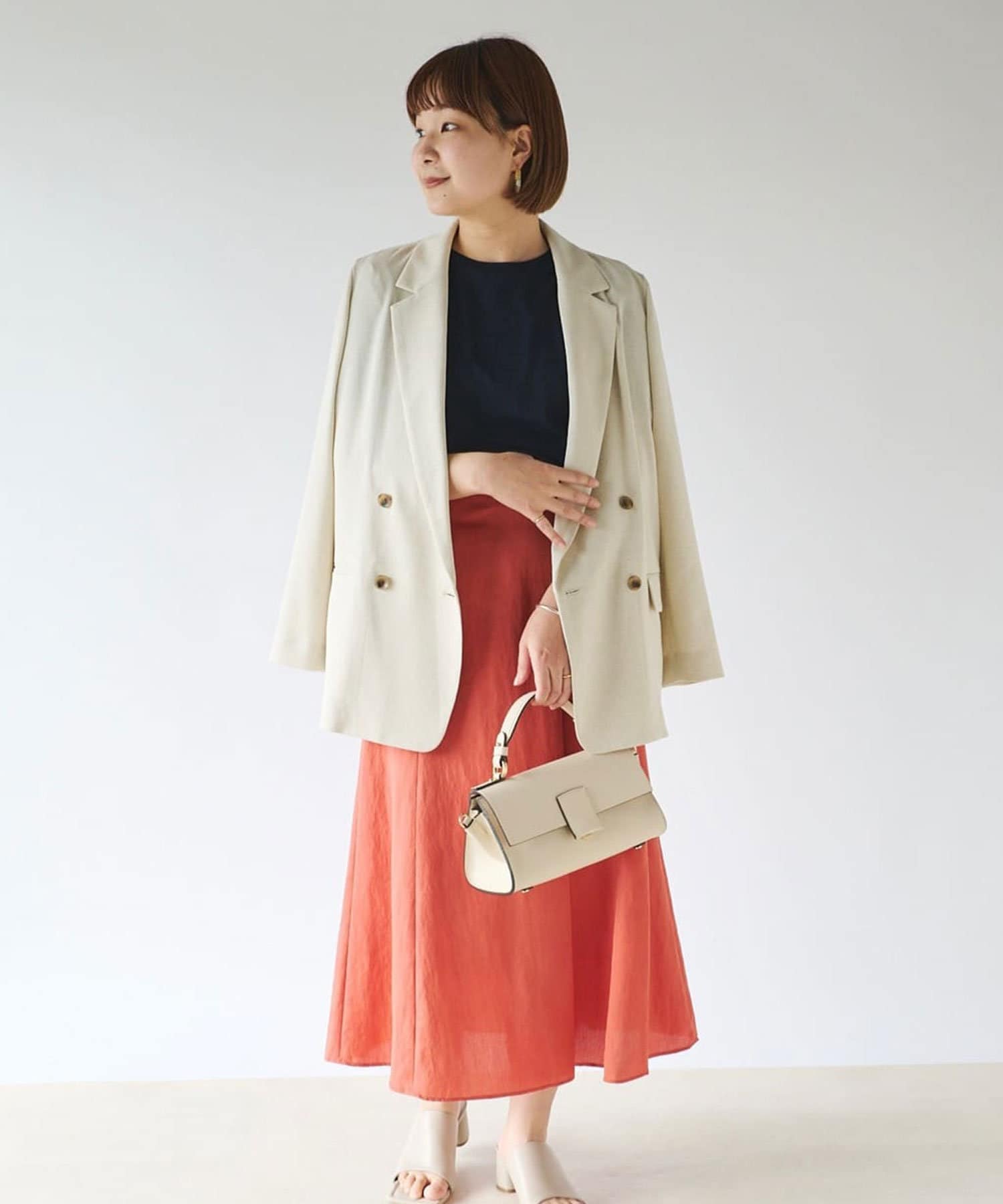 ジャケットを外しのアイテムとして着用するのが今季のトレンド。Tシャツにデニムとカジュアルなスタイリングに羽織るだけで、洗練されたコーディネートに。またオーバーサイズのジャケットは、ブラウスをトップスインしてタイトスカートやパンツとあわせると品よく着こなせます。オフィスからカジュアルまで着用シーンを選ばない万能ジャケットです。