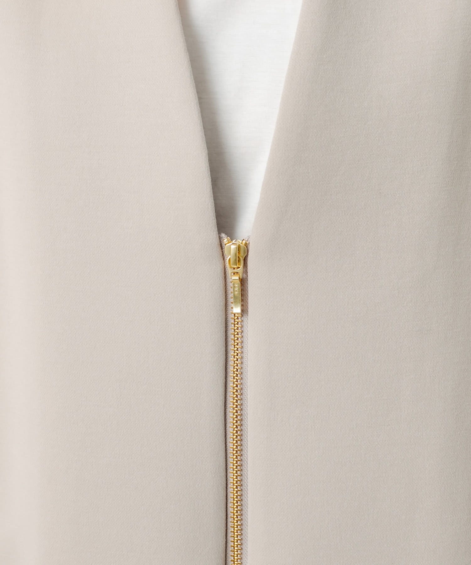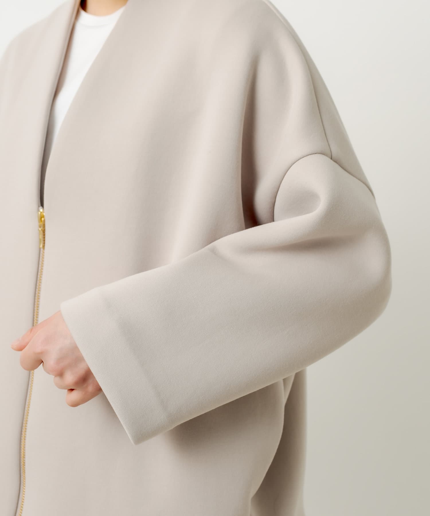 薄手で軽いポリエステル素材です。ノーカラーでスッキリ見えるデザイン。