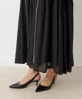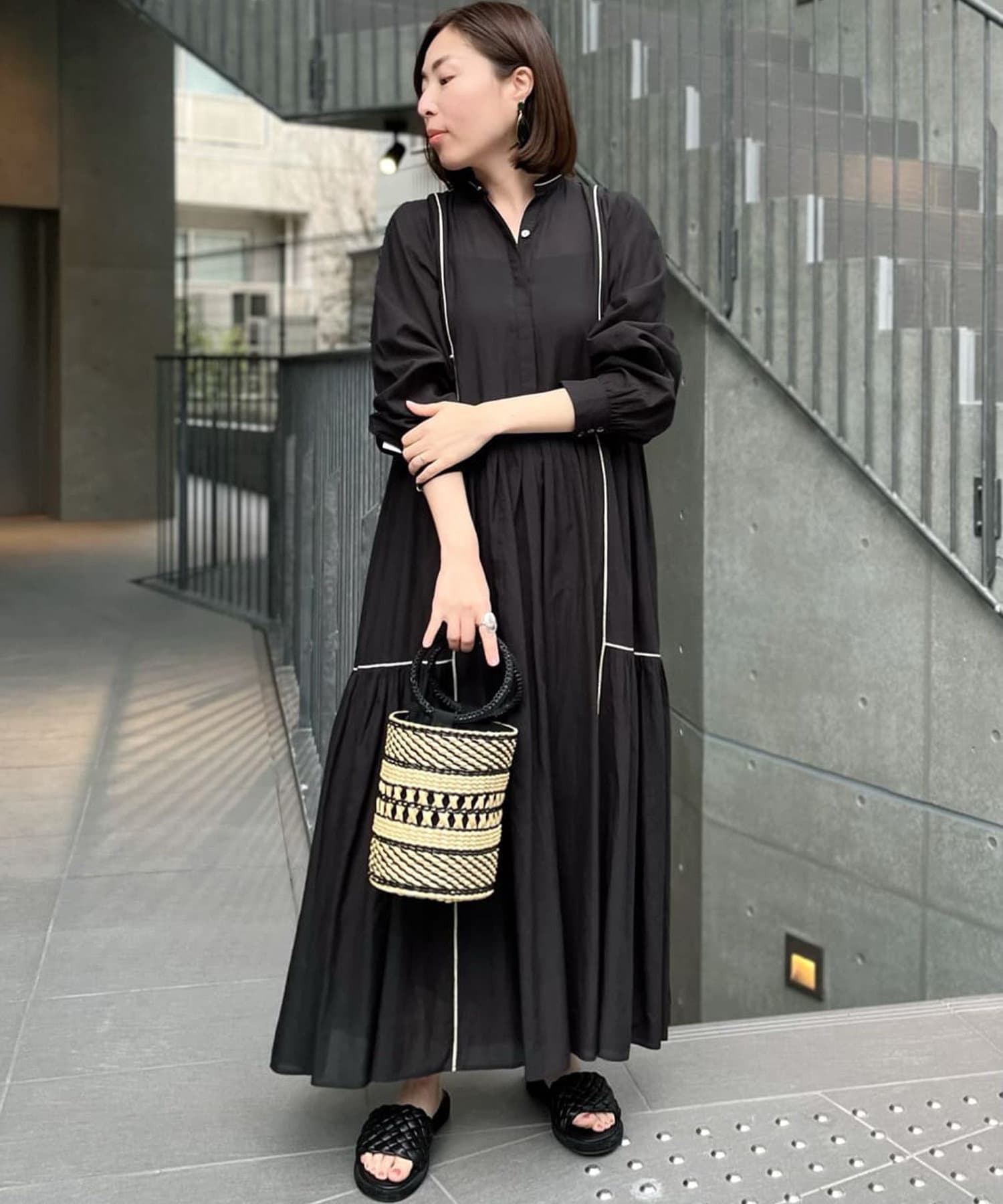 ブラックの着こなしには、柔らかさと明るさをもたらしてくれるピンクのサンダルなど明るいトーンがポイント!ふわっとした柔らかなコットン素材が上品さをプラス。