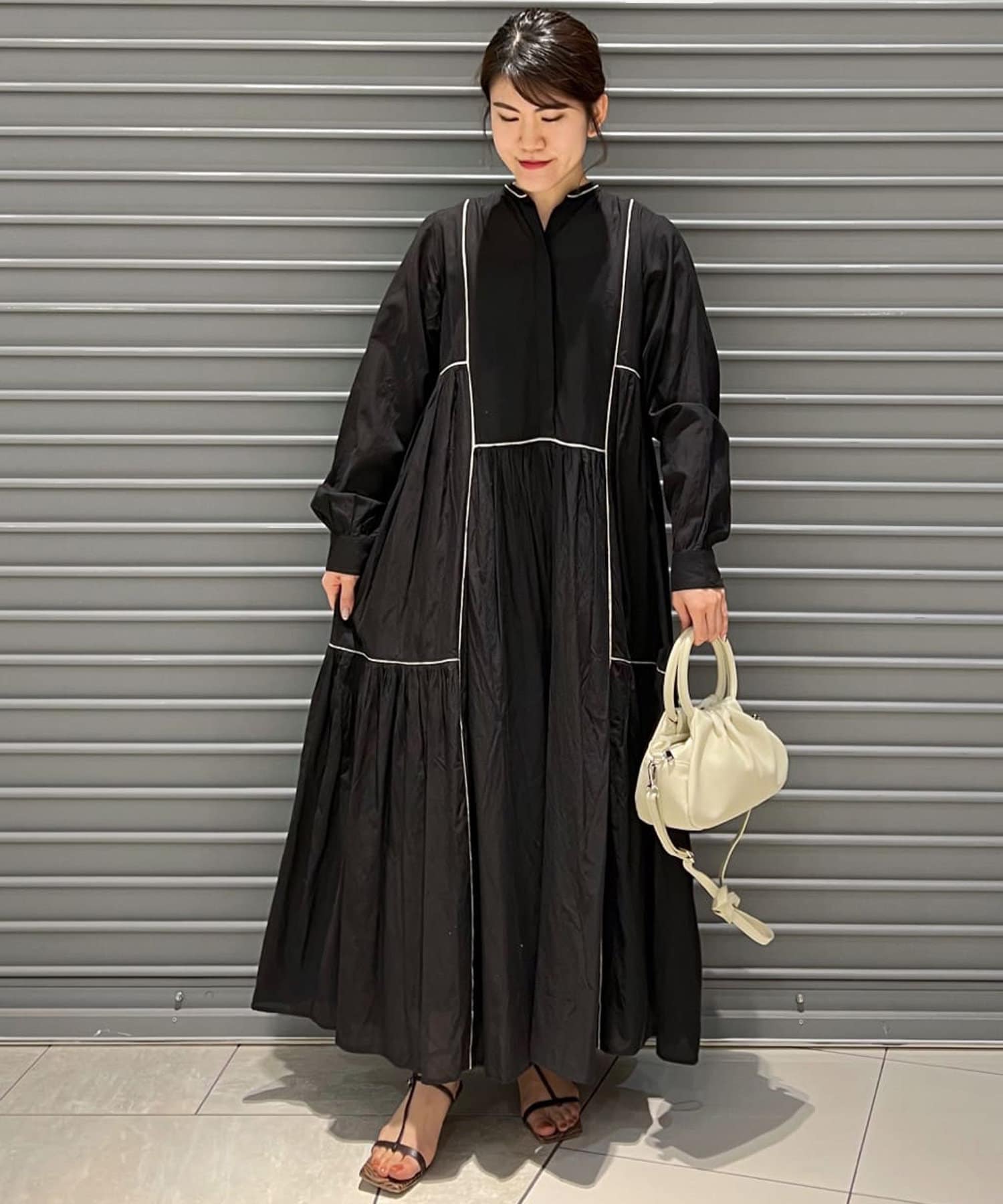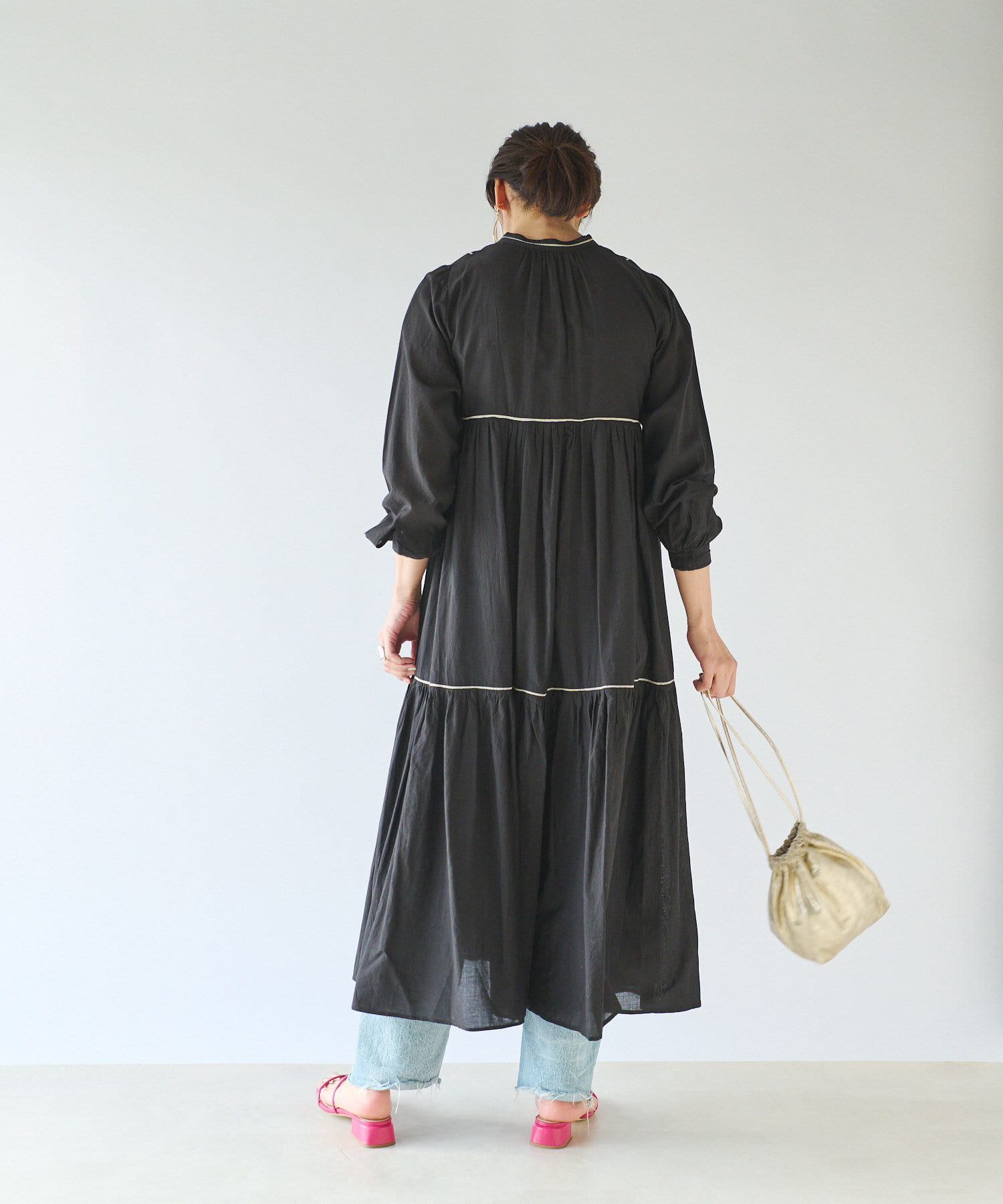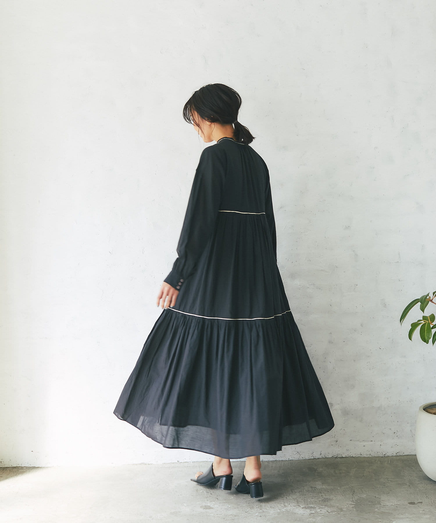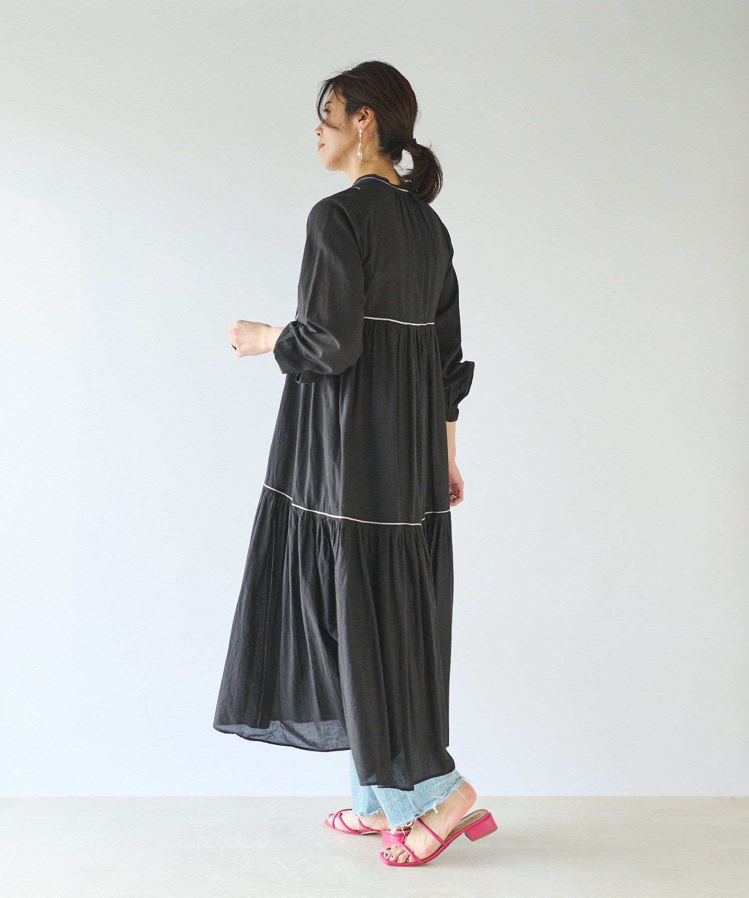らかく、とても着やすいワンピースです。 細かく入ったギャザーがポイントで、ティアードデザインがかわいいです。 ネックラインを綺麗に見せてくれる前開きデザインが大人女性らしくまとまります。