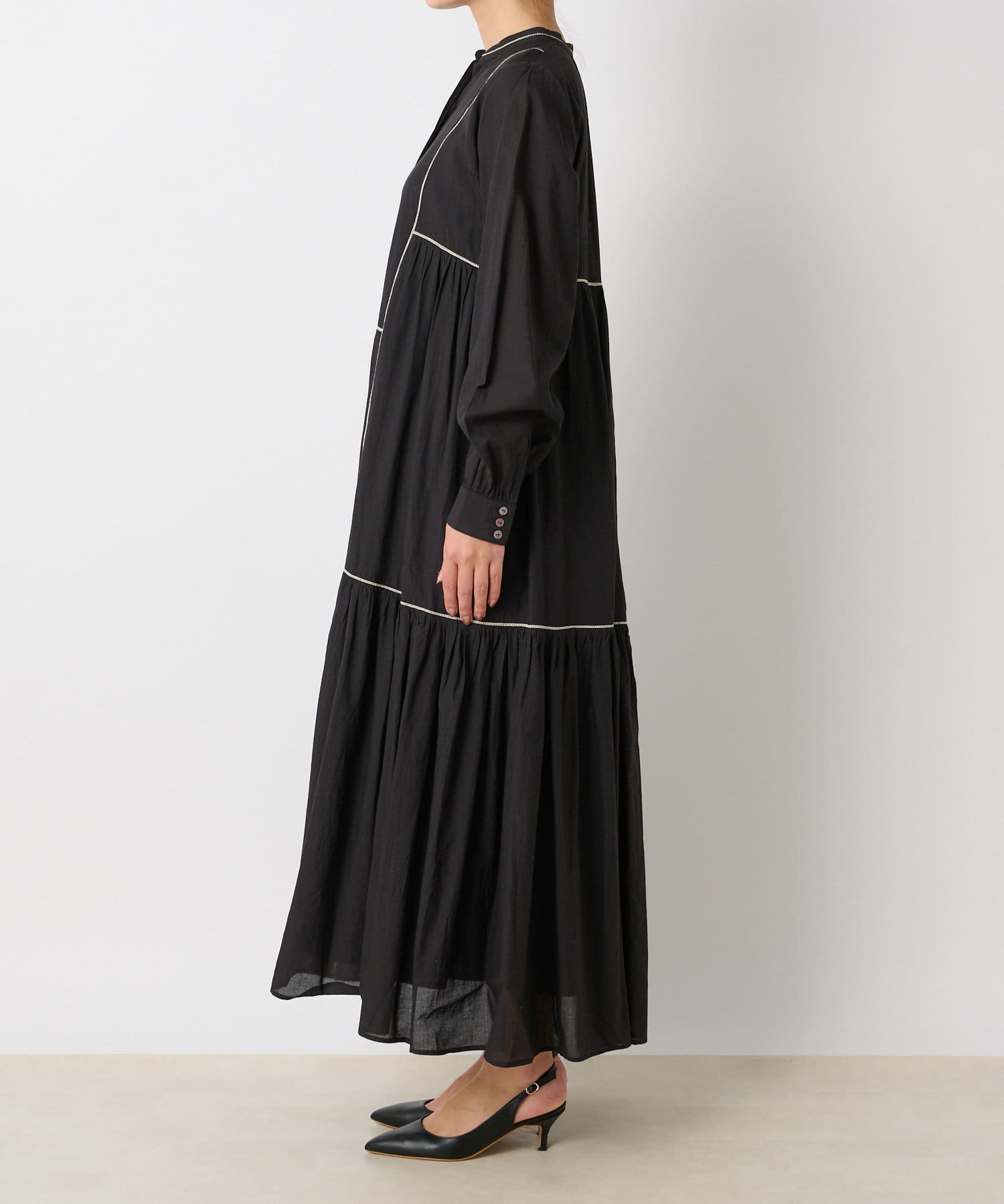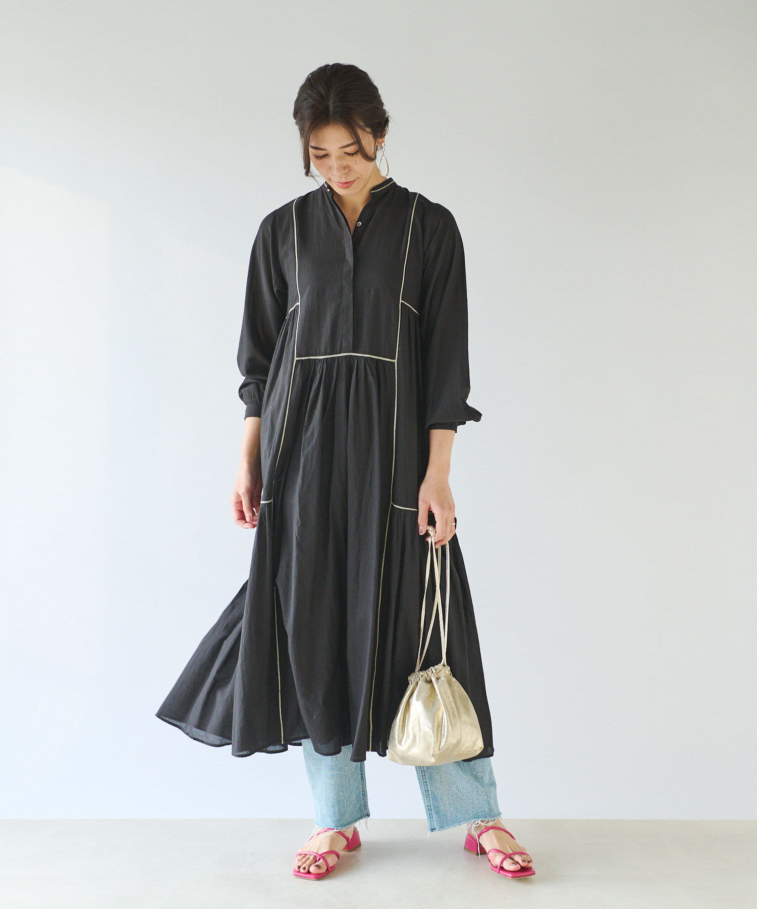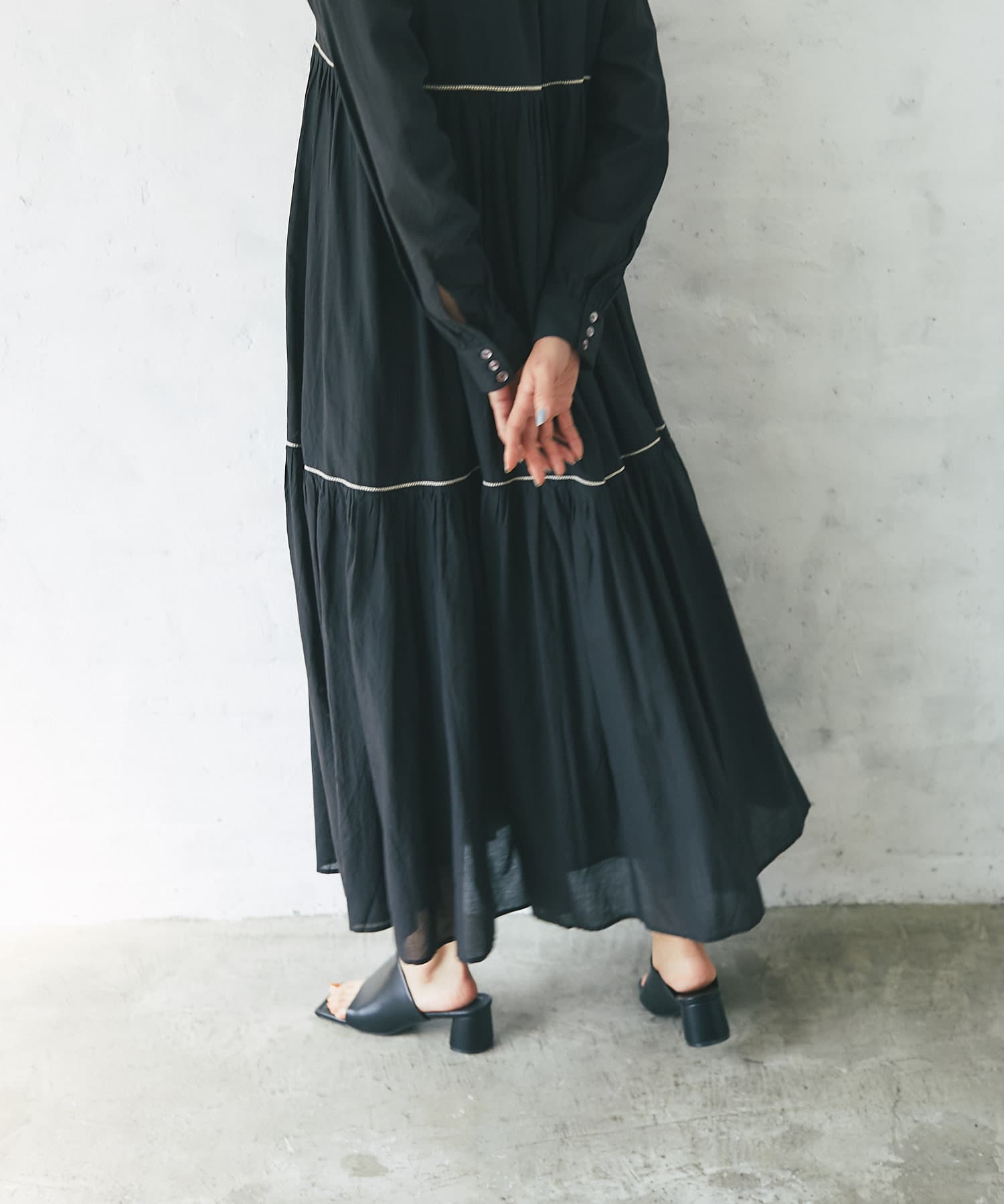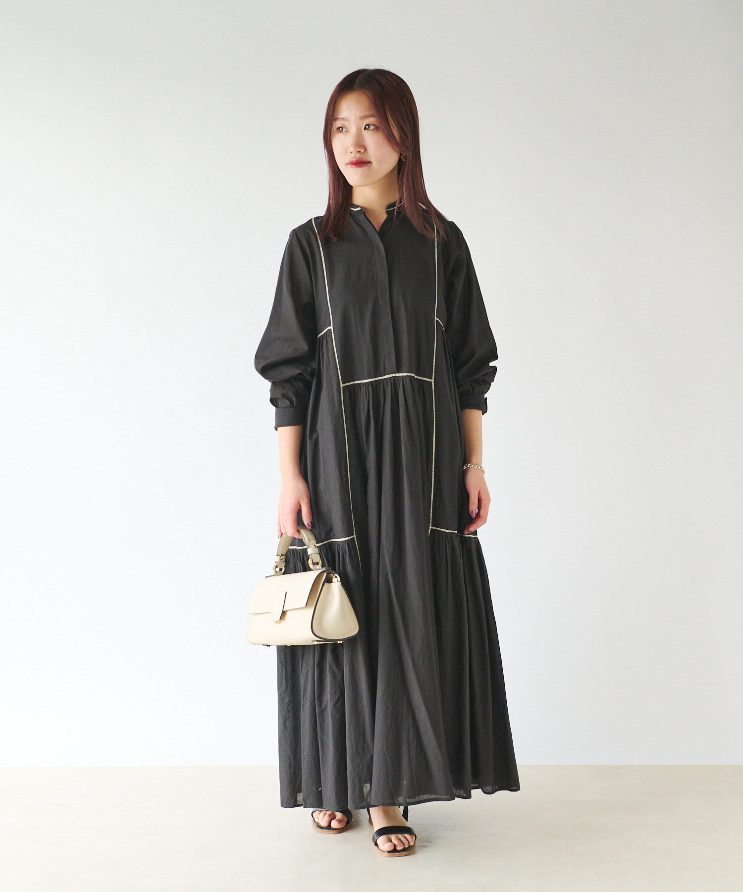 らかく、とても着やすいワンピースです。 細かく入ったギャザーがポイントで、ティアードデザインがかわいいです。 ネックラインを綺麗に見せてくれる前開きデザインが大人女性らしくまとまります。