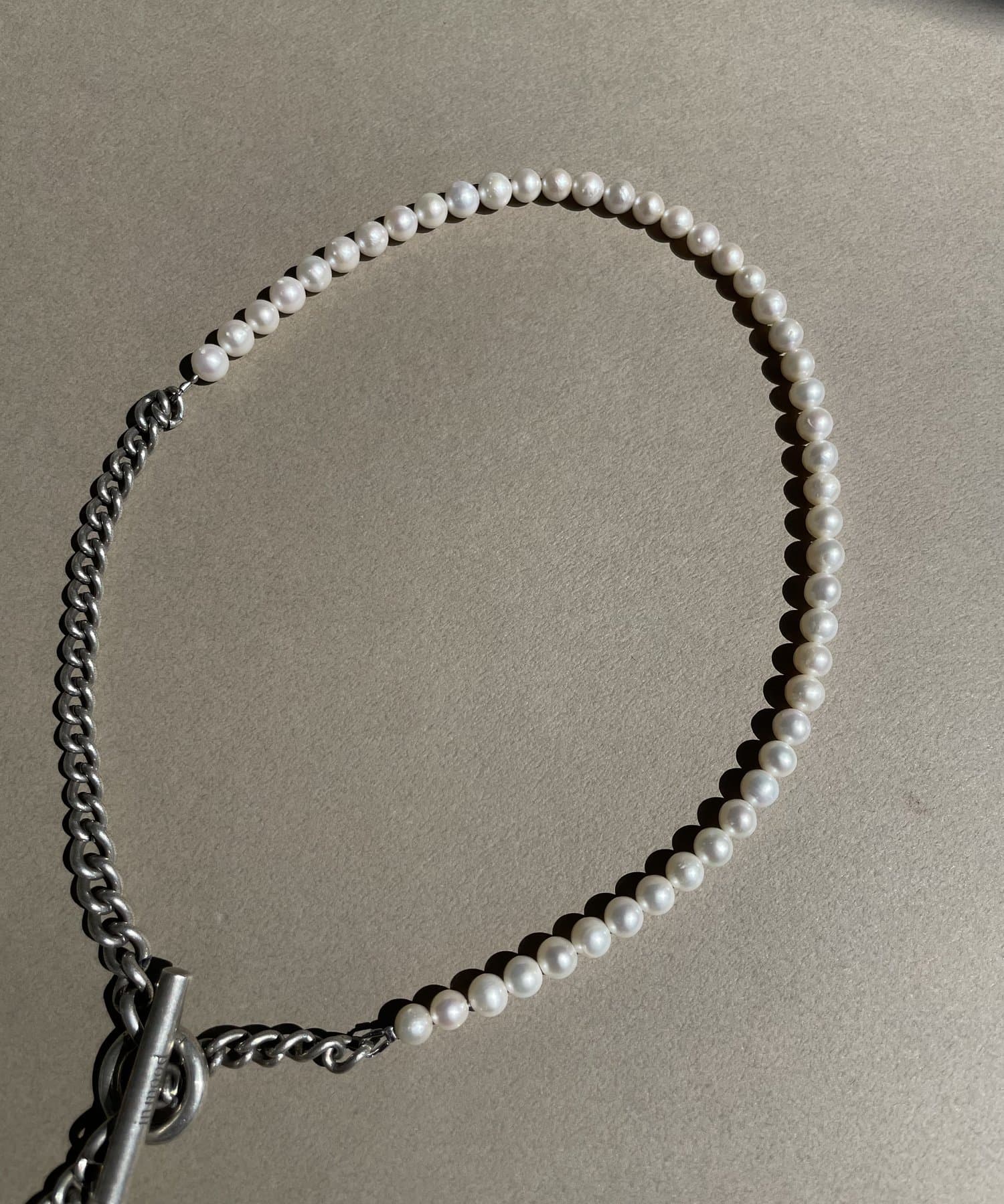 6ミリサイズの淡水パールとCURBチェーンをMIXしたネックレス。