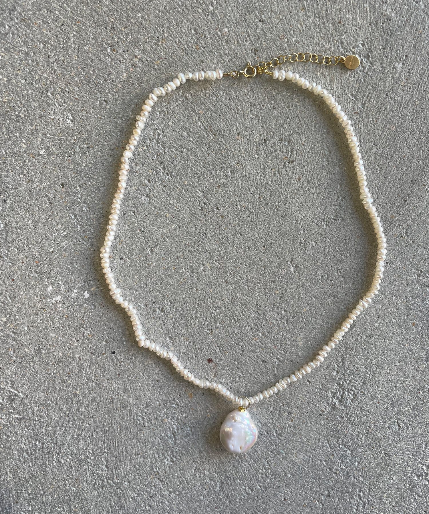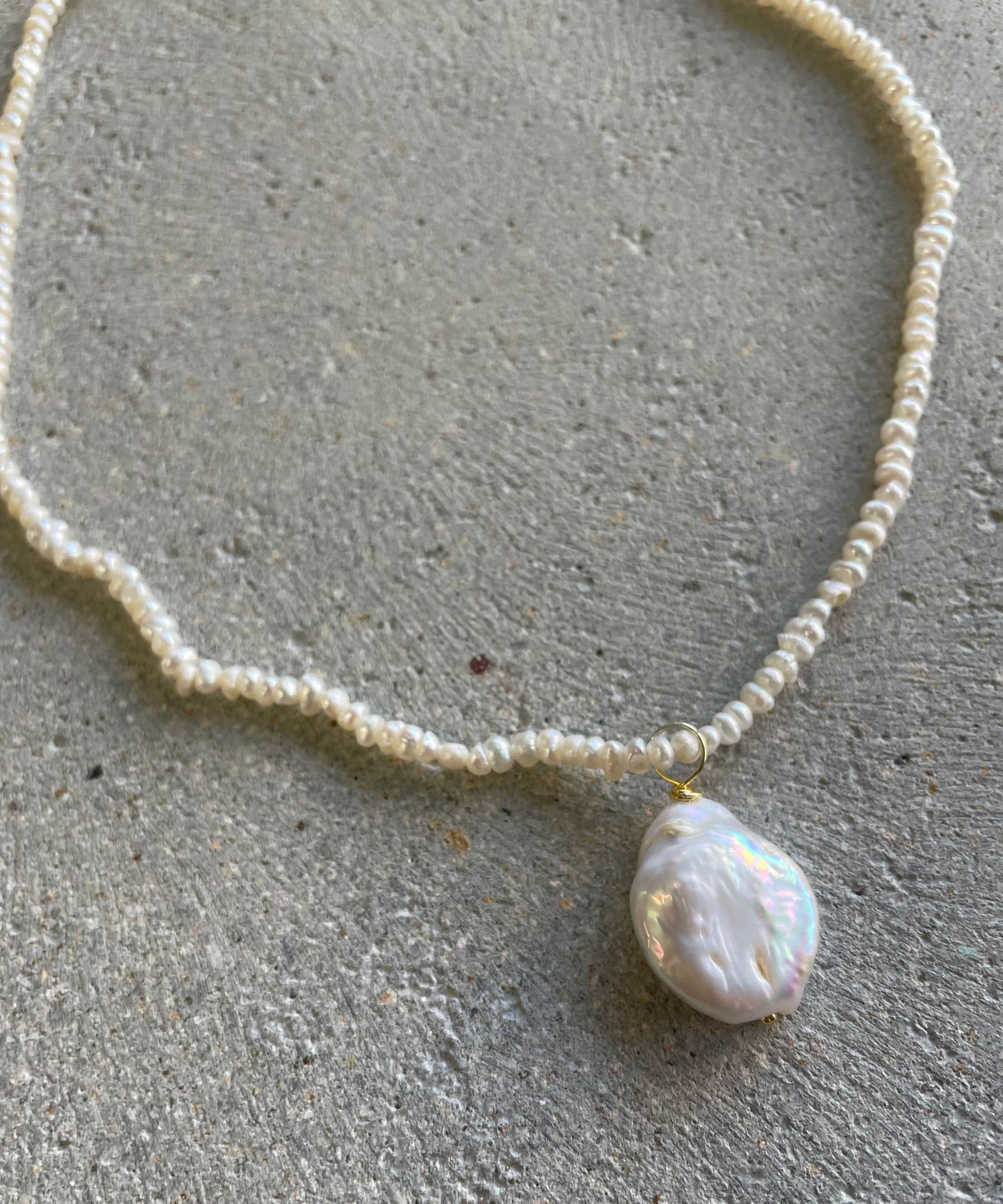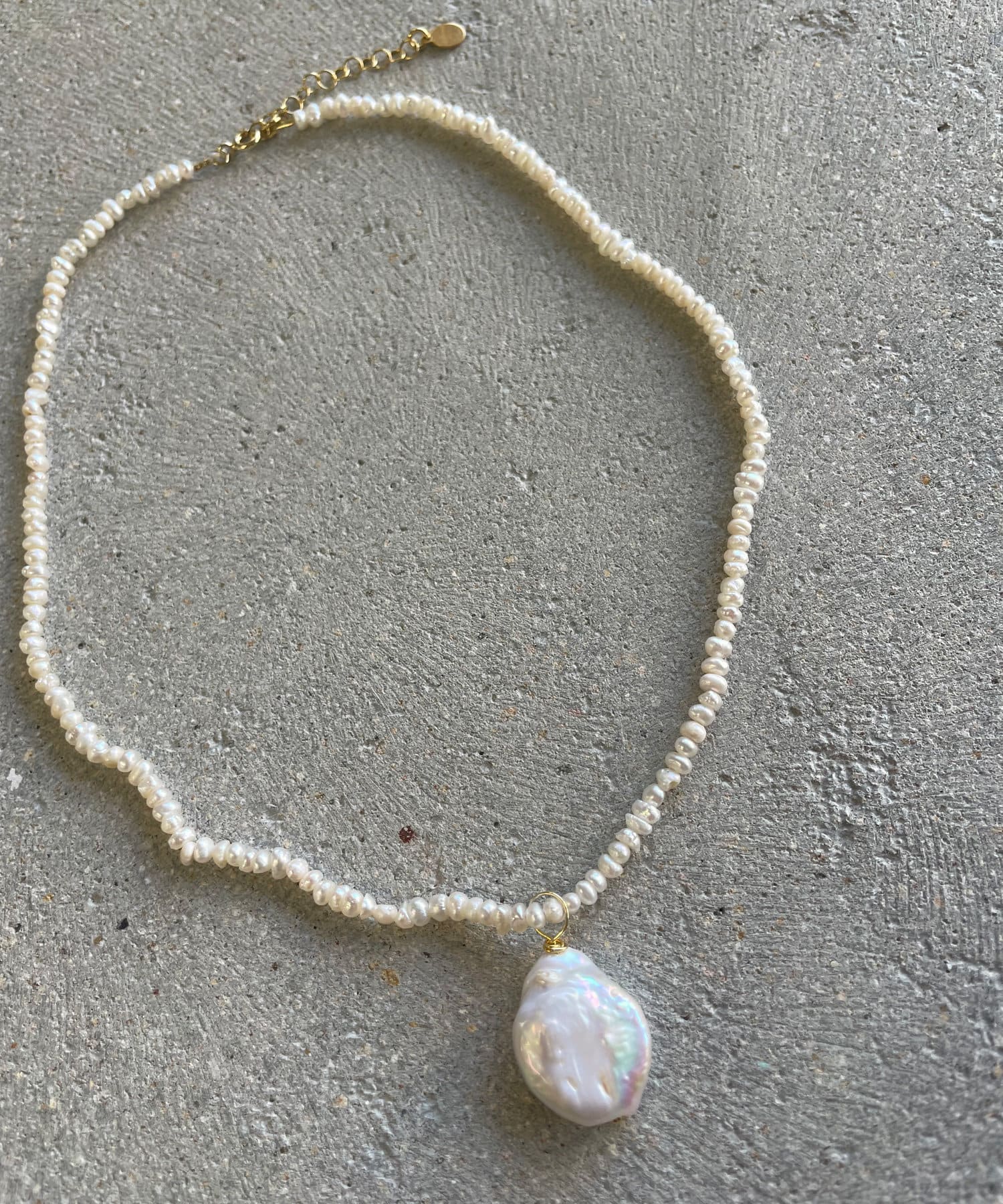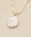 一つ一つ形の異なる個性的な淡水パールのペンダントが程よいビンテージ感を演出。
