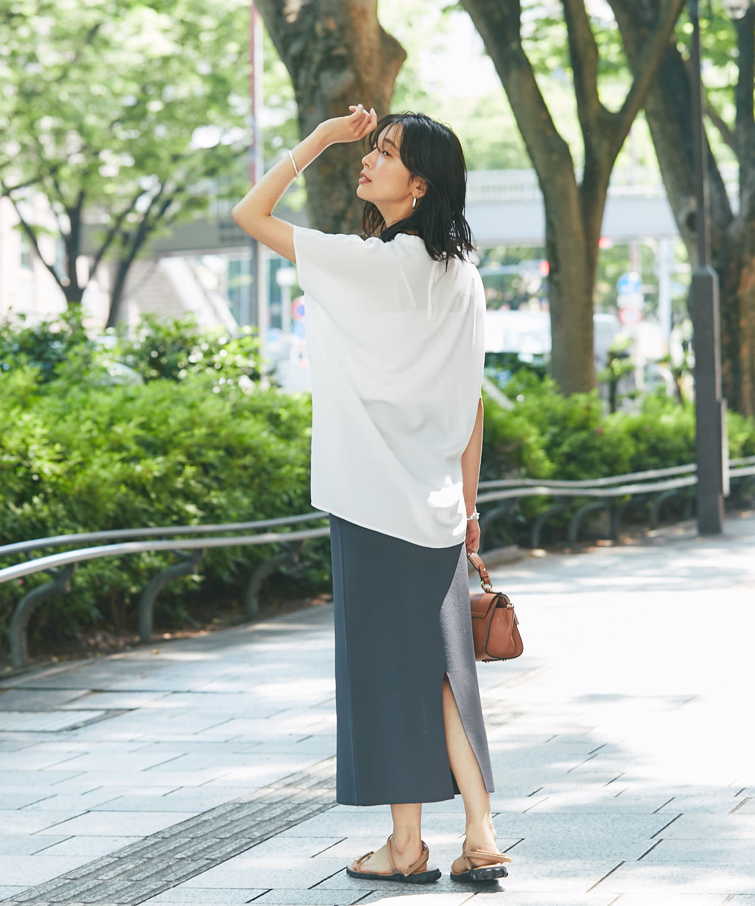トップスを選ばないシンプルなデザインは、オーバーサイズシャツで