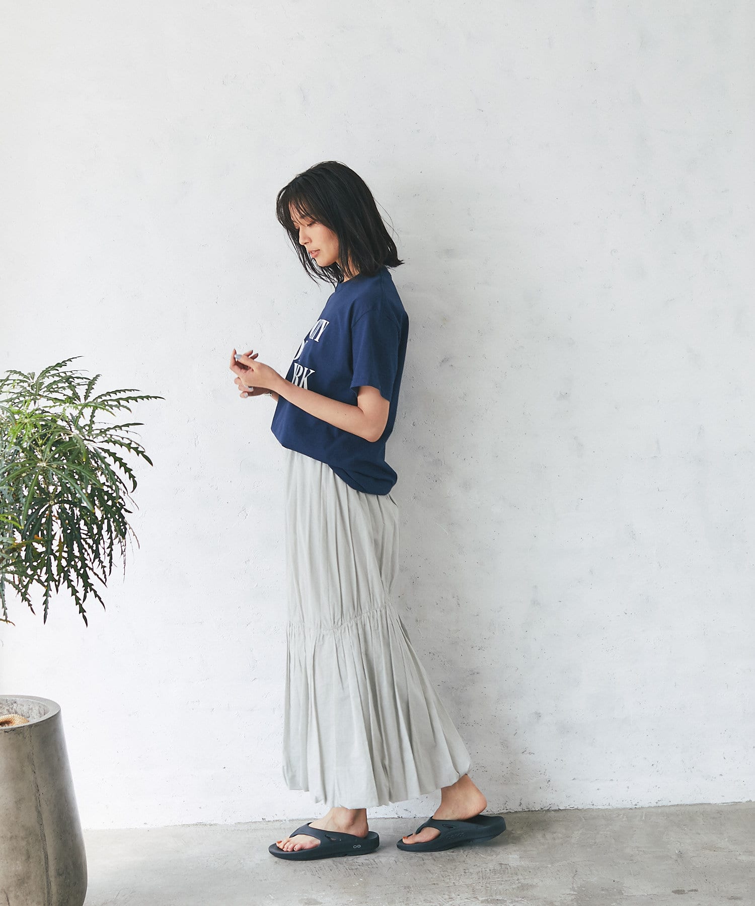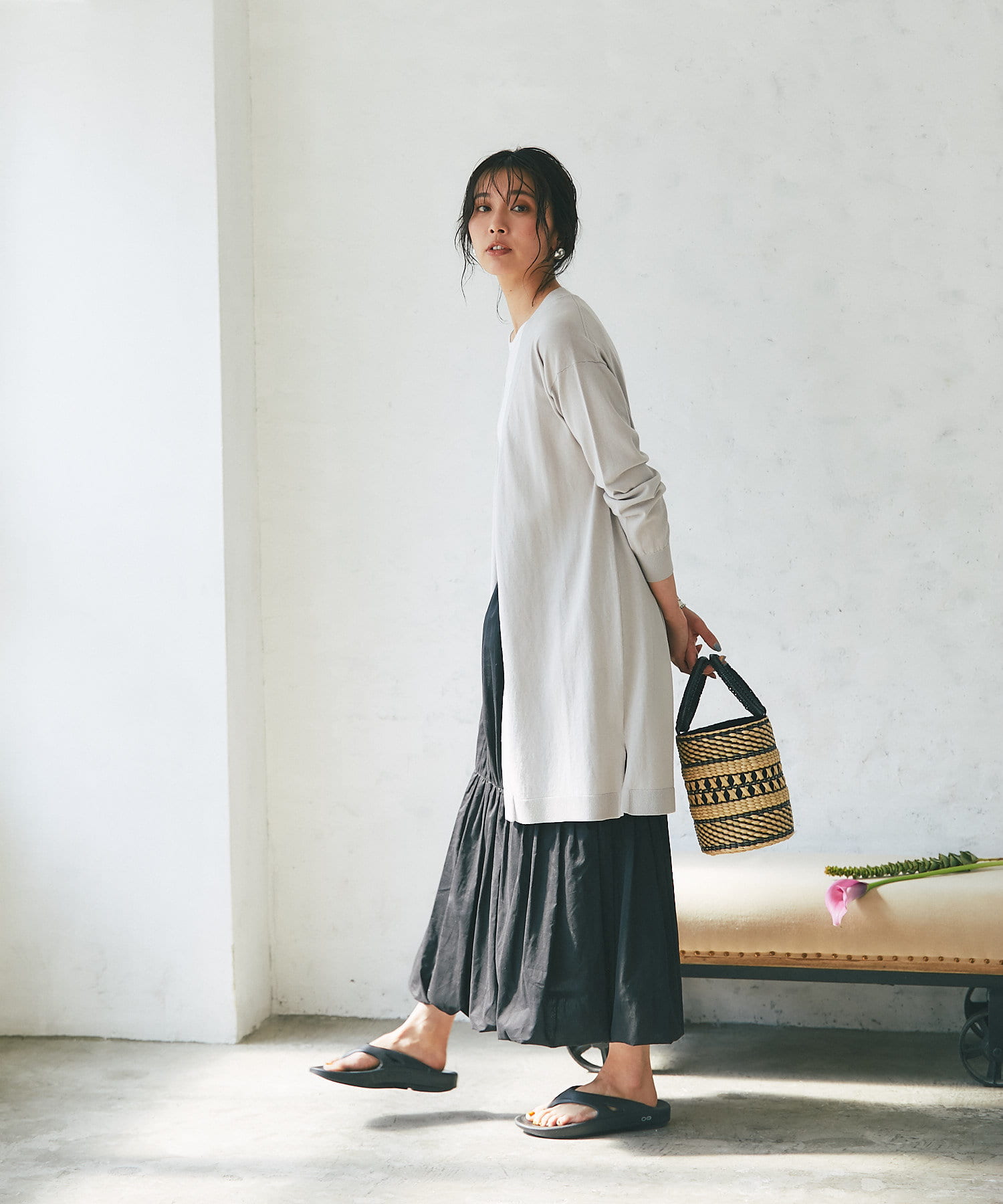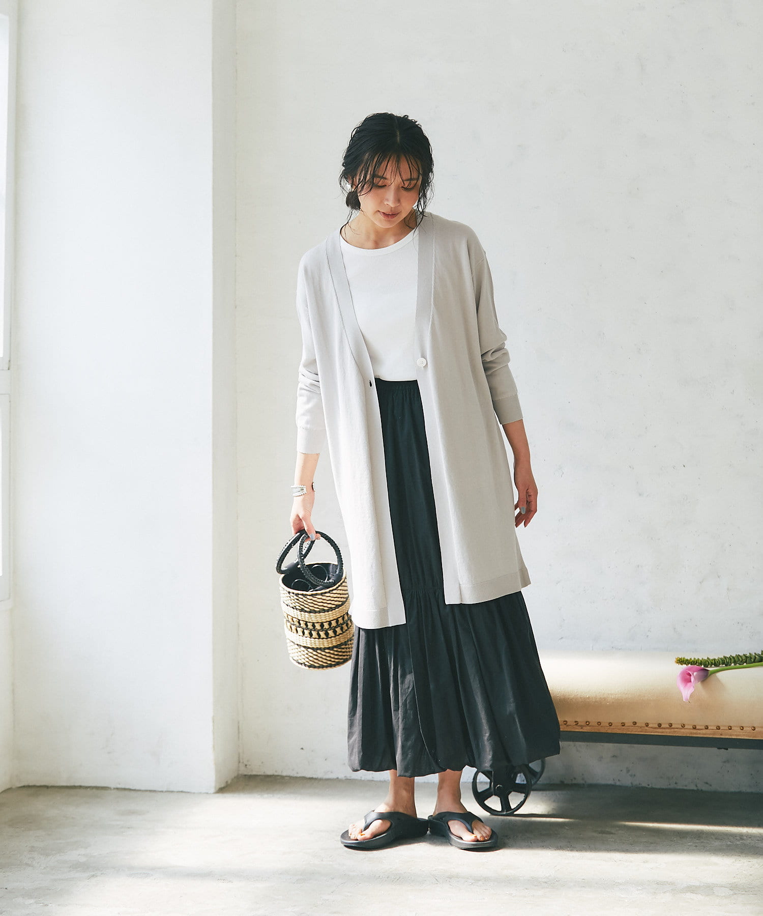• 腰回りはすっきりしているので、長めのカーディガンなどもごわつかず羽織っていただけます
