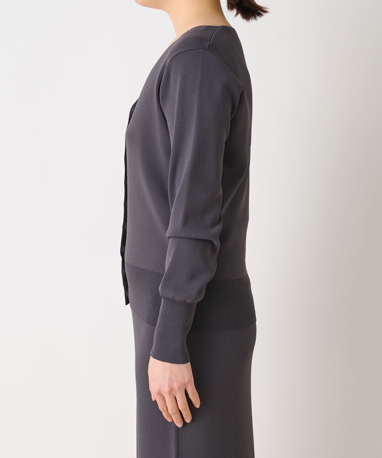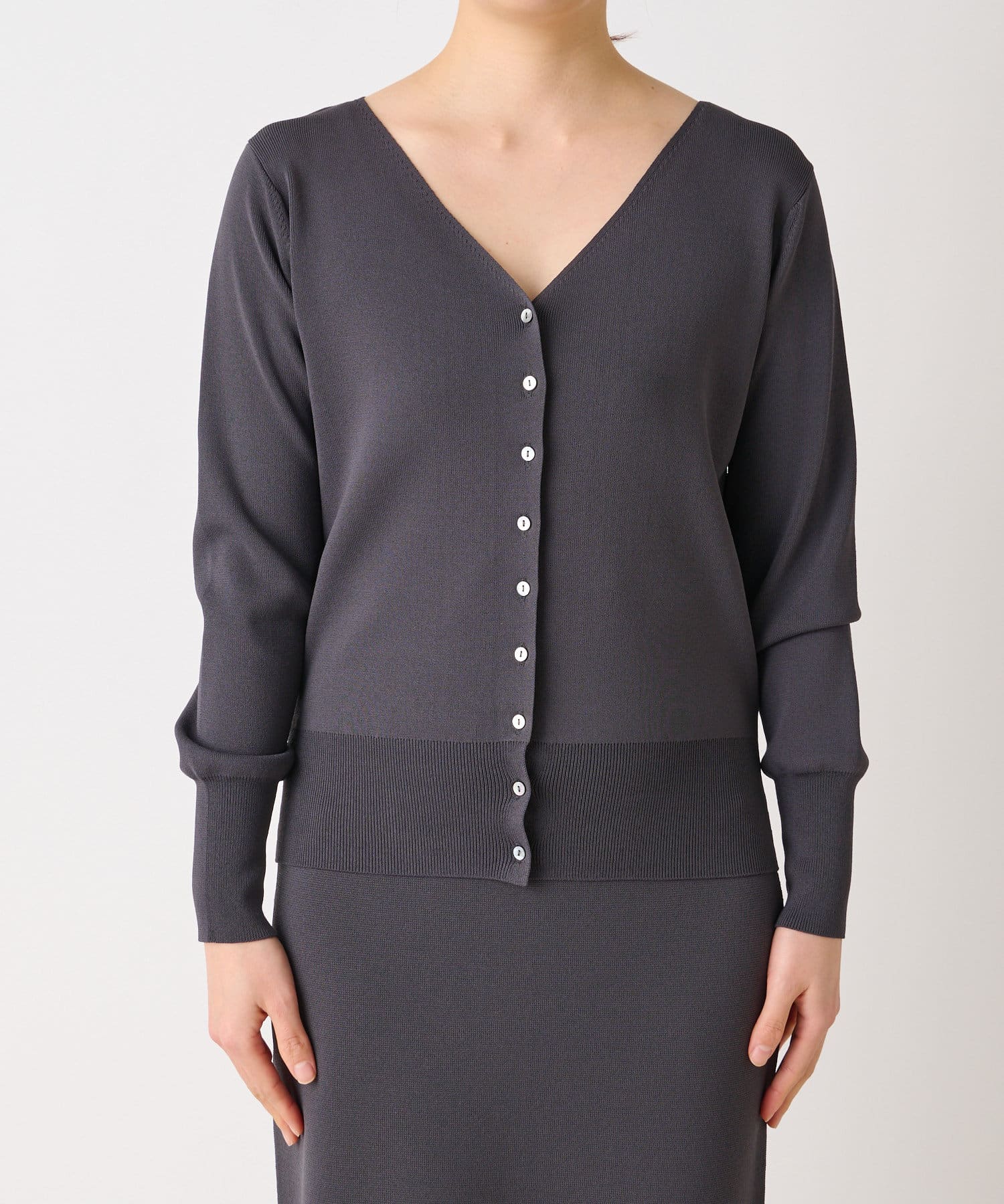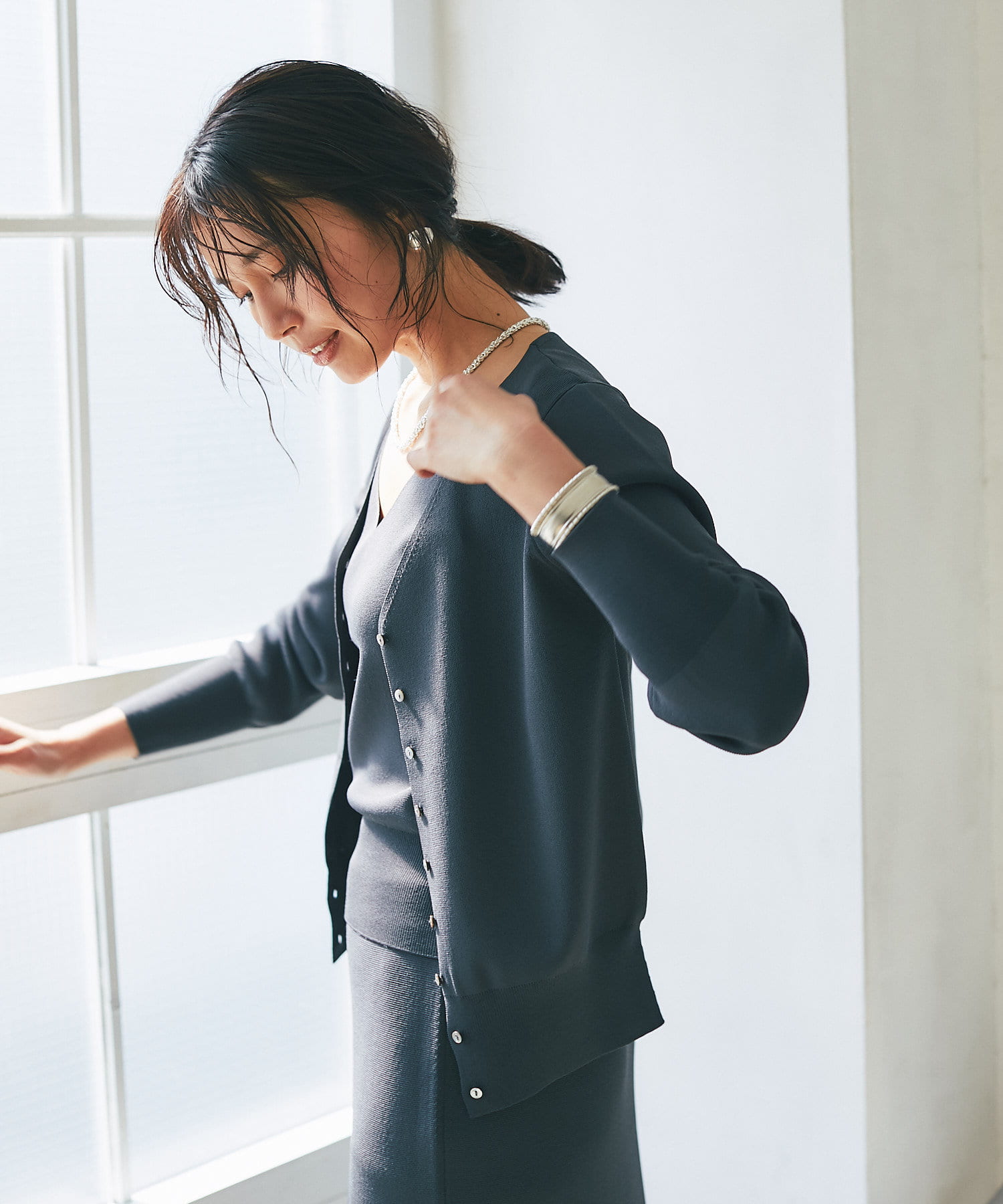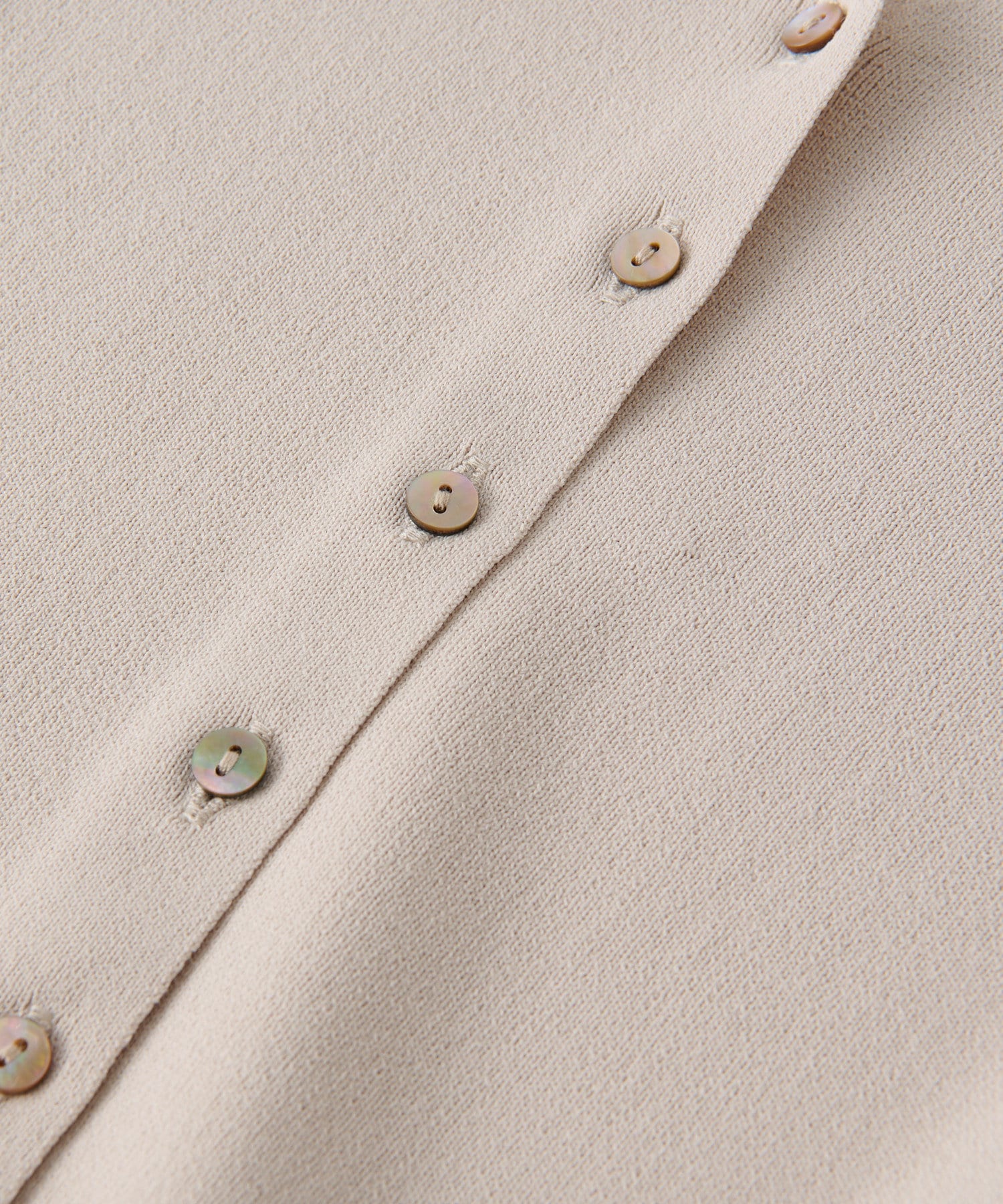 クールタッチUV素材を使用した総針編みのクリーンなカーディガン。