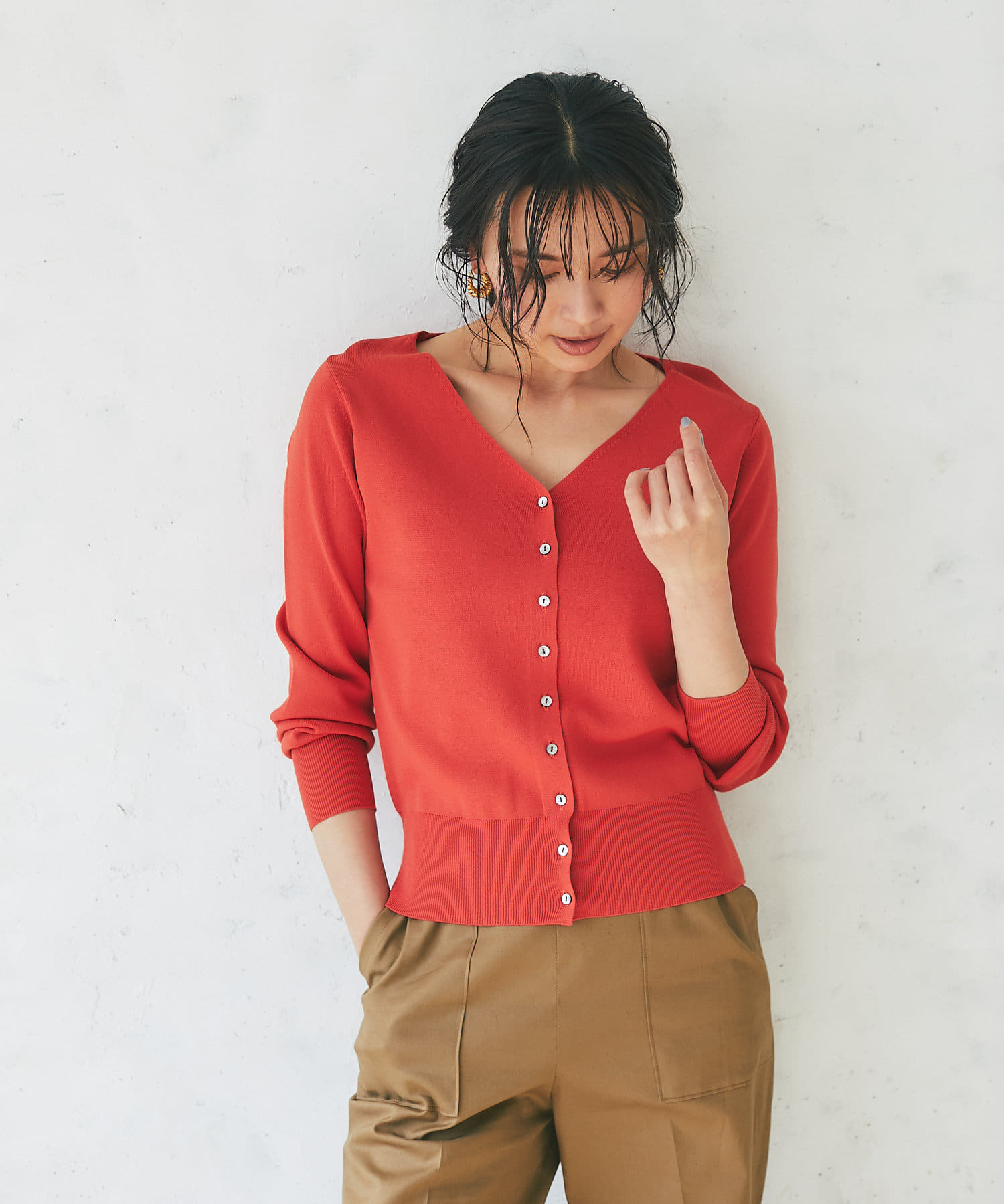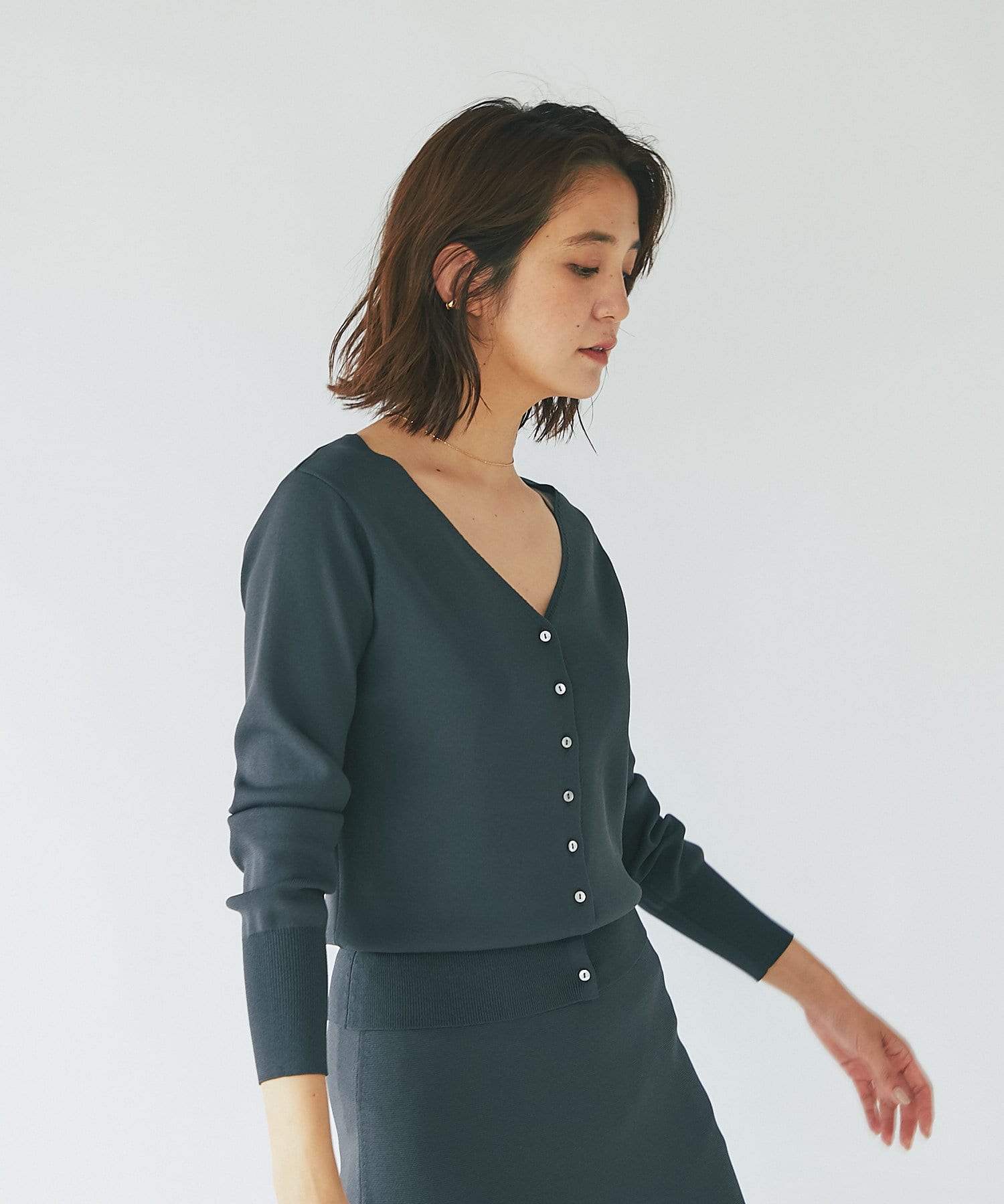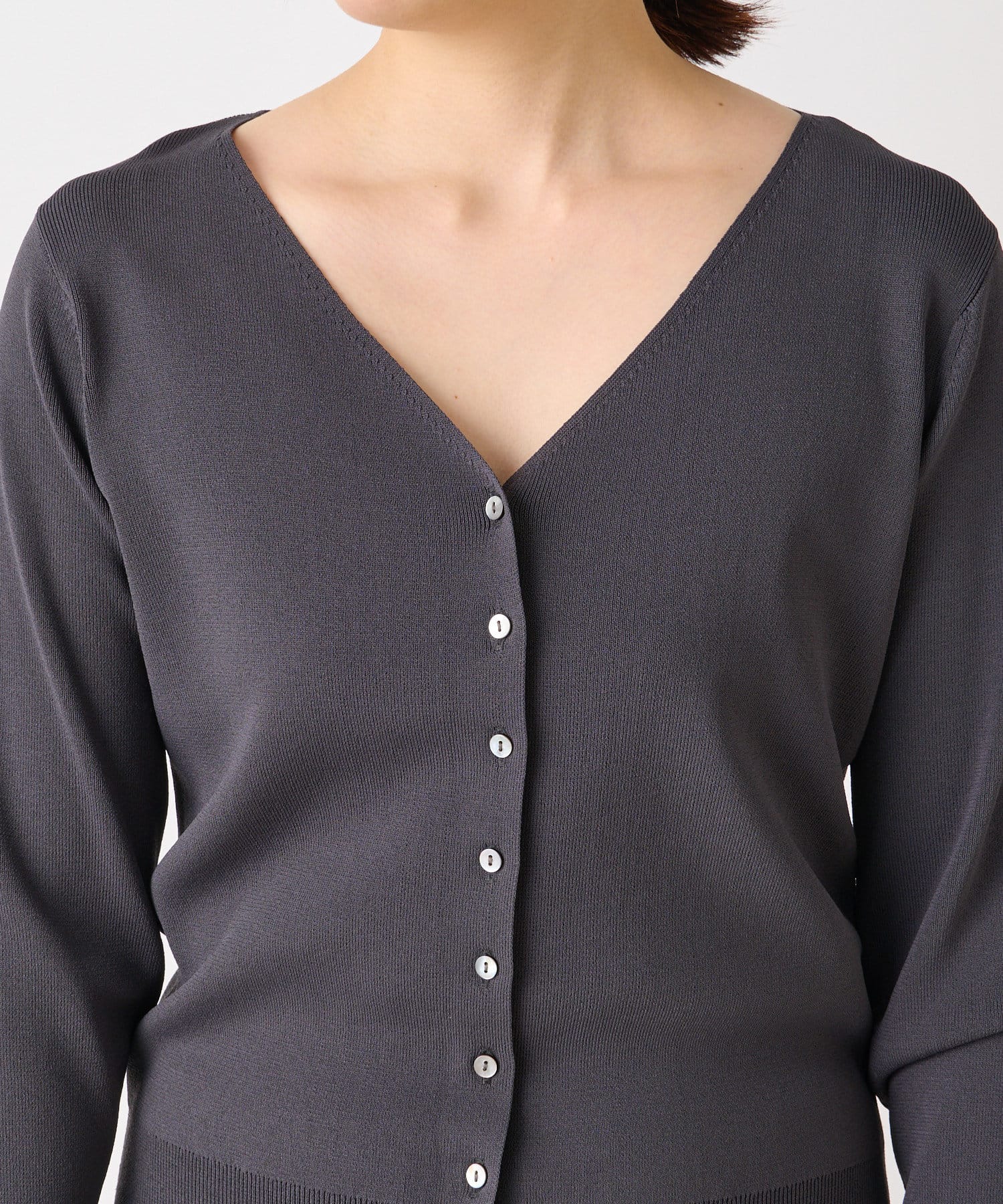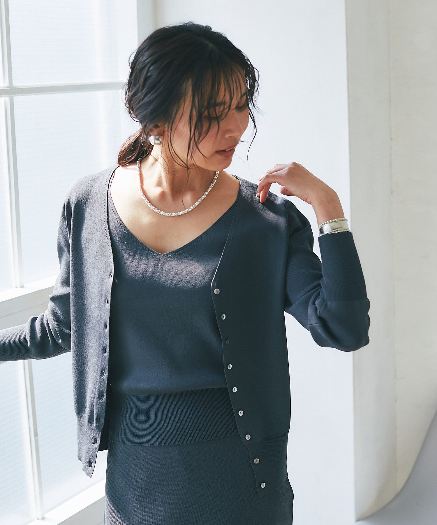クールタッチUV素材を使用した総針編みのクリーンなカーディガン。