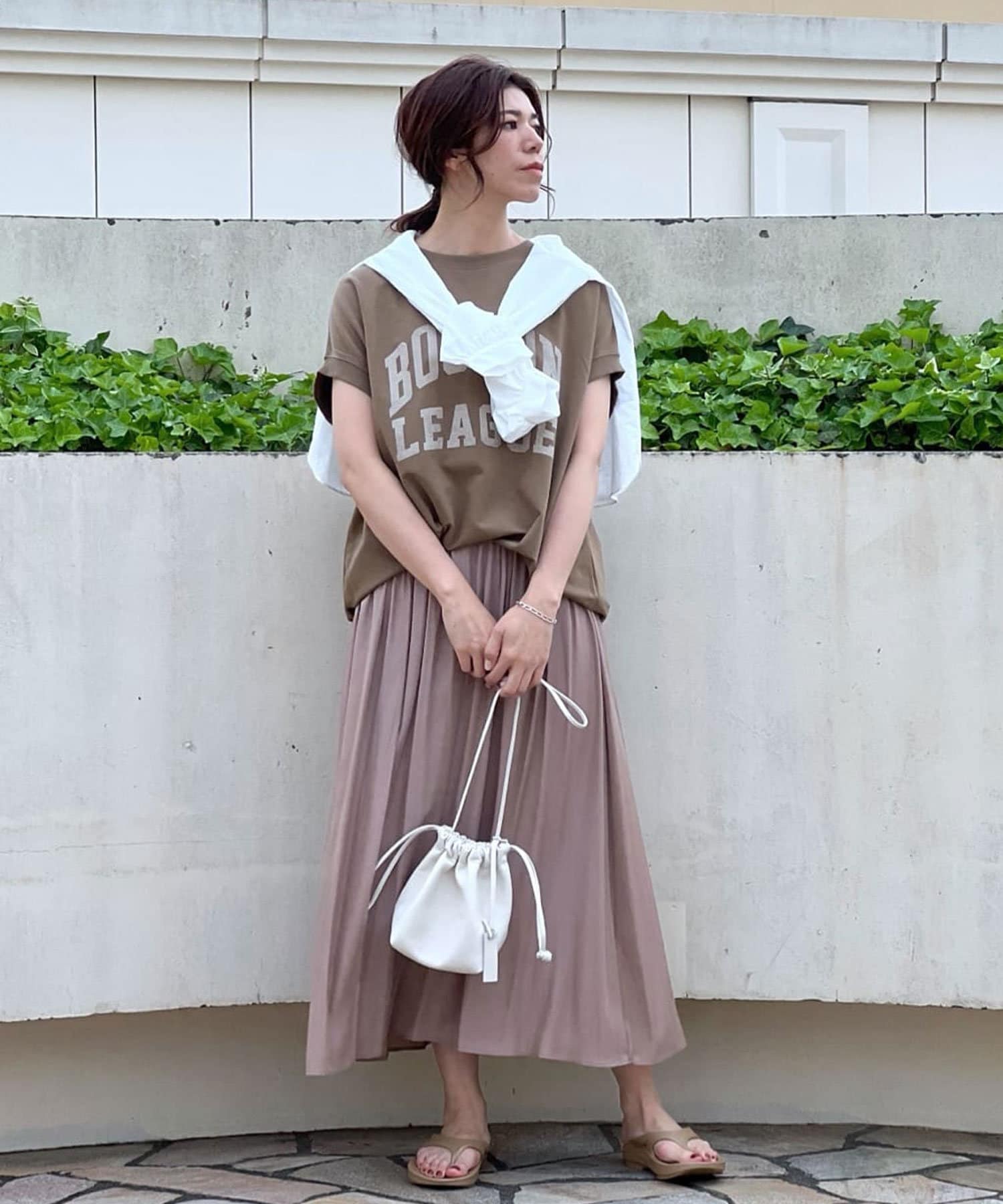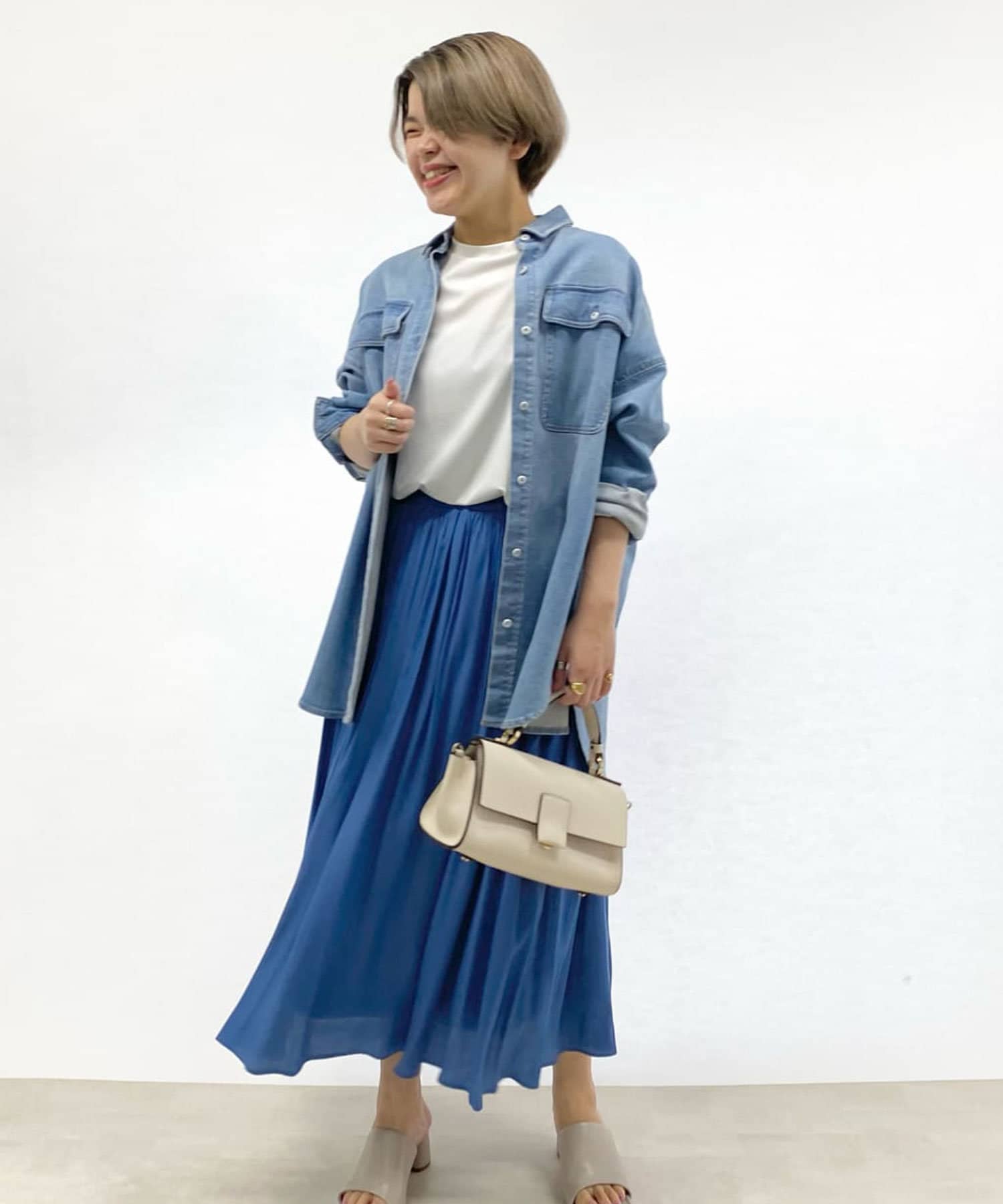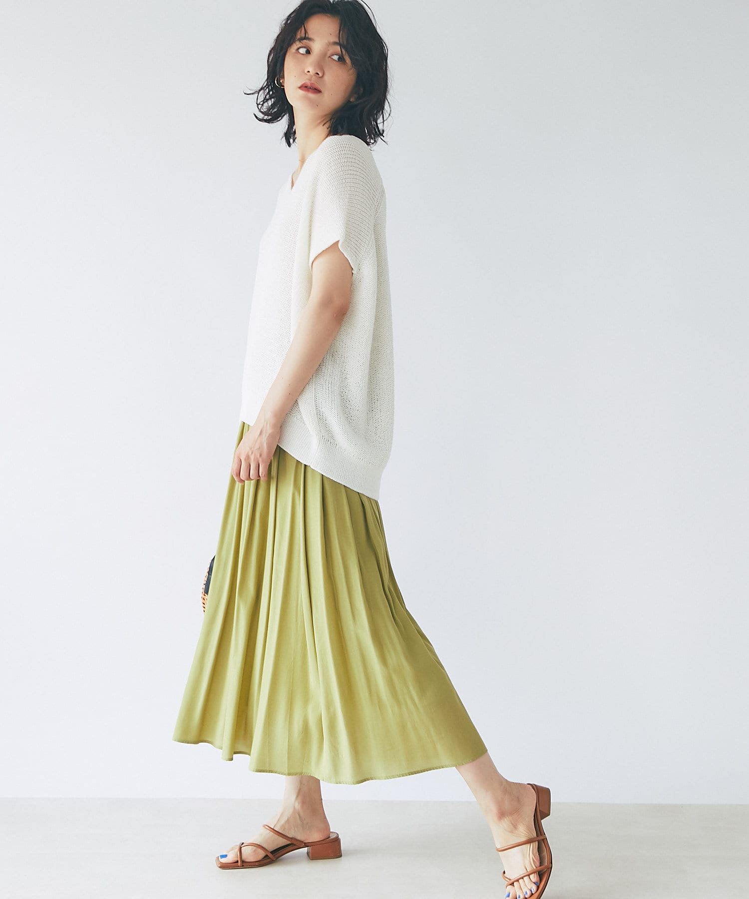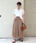 シンプルなトップスを合わせるだけでも女性らしいスタイリングに仕上がります。