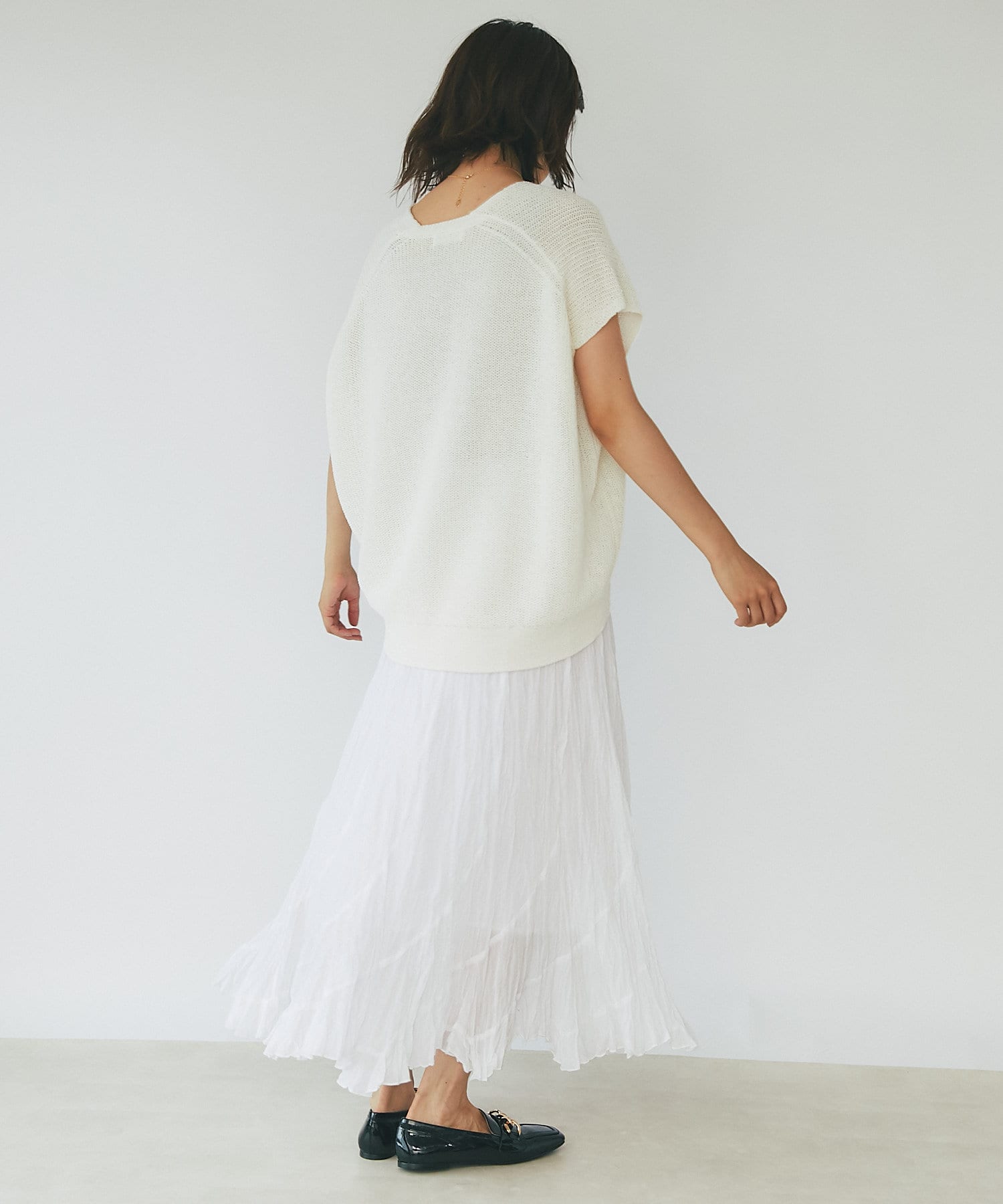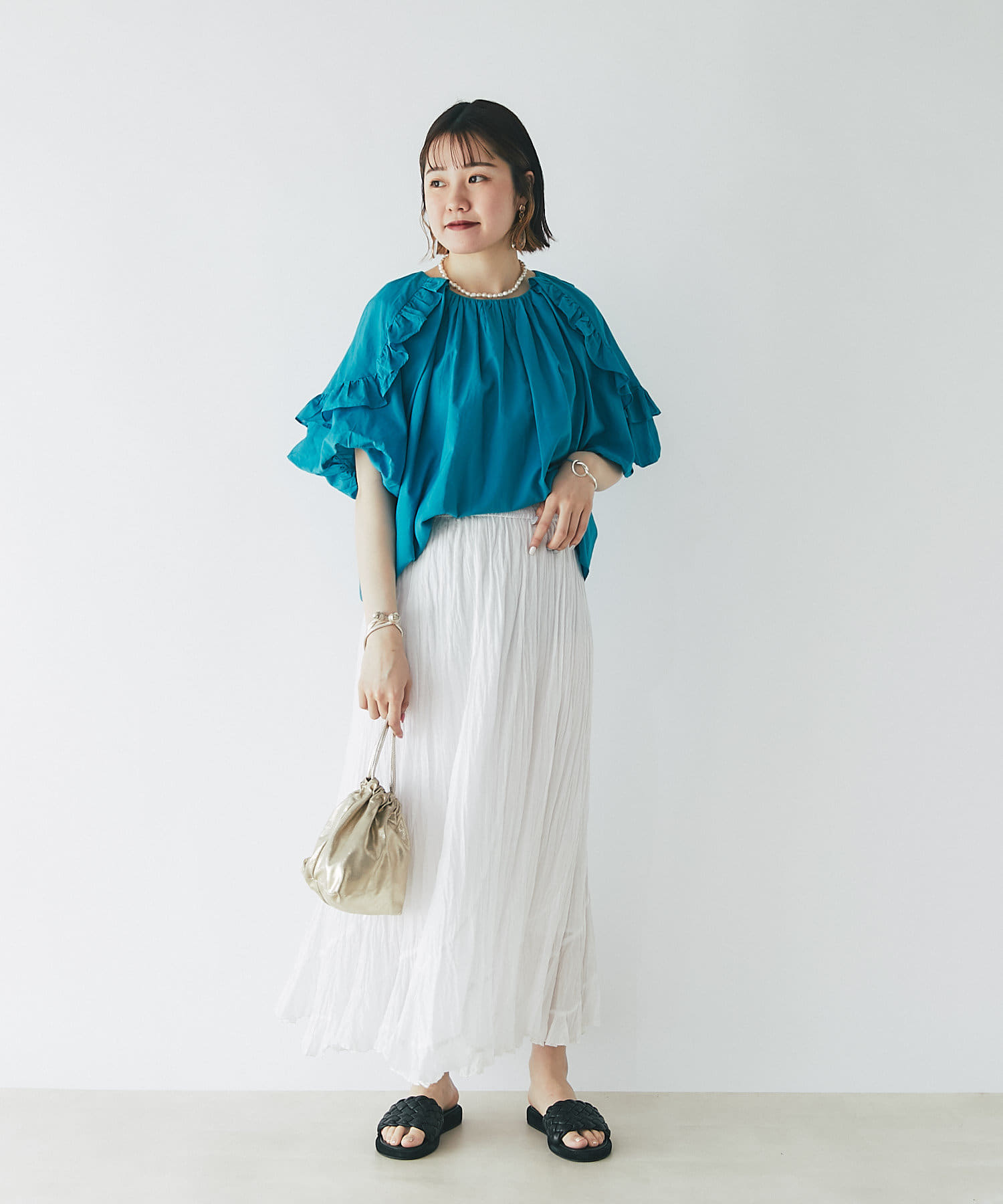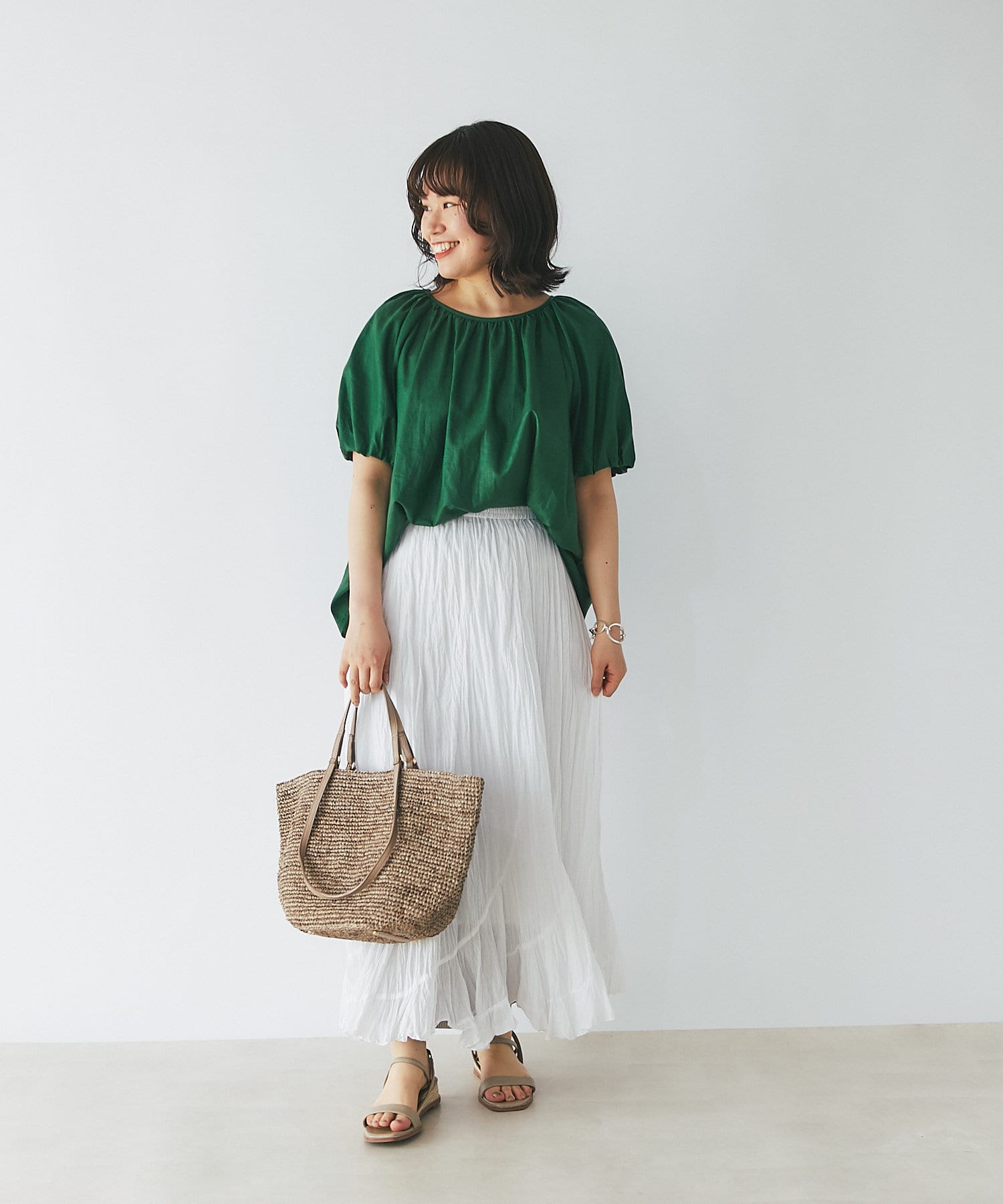 斜めに切替えたフェミニンな雰囲気のエスカルゴデザインは軽やかな生地感と相性抜群◎