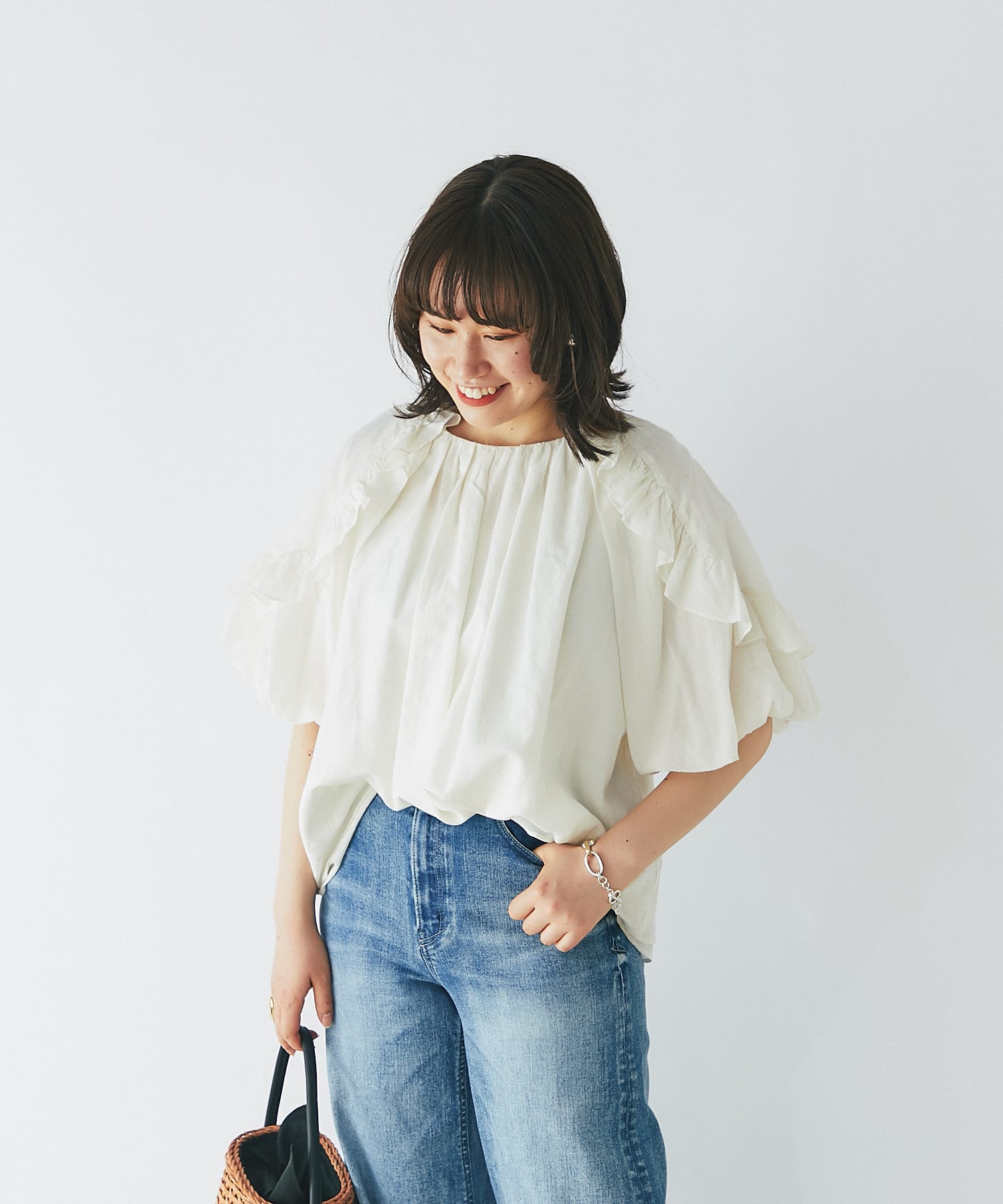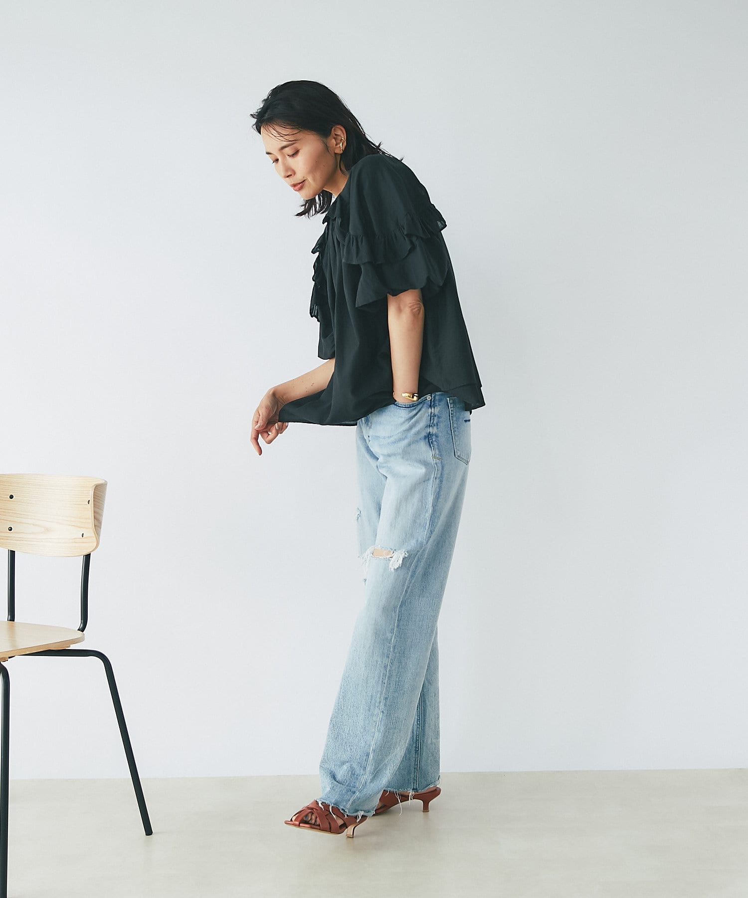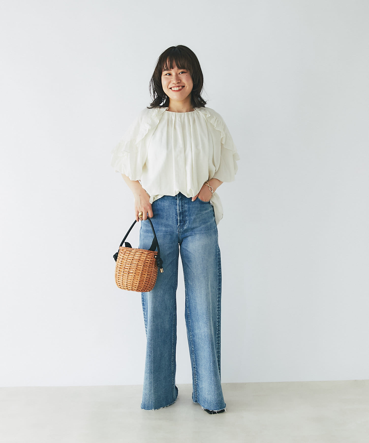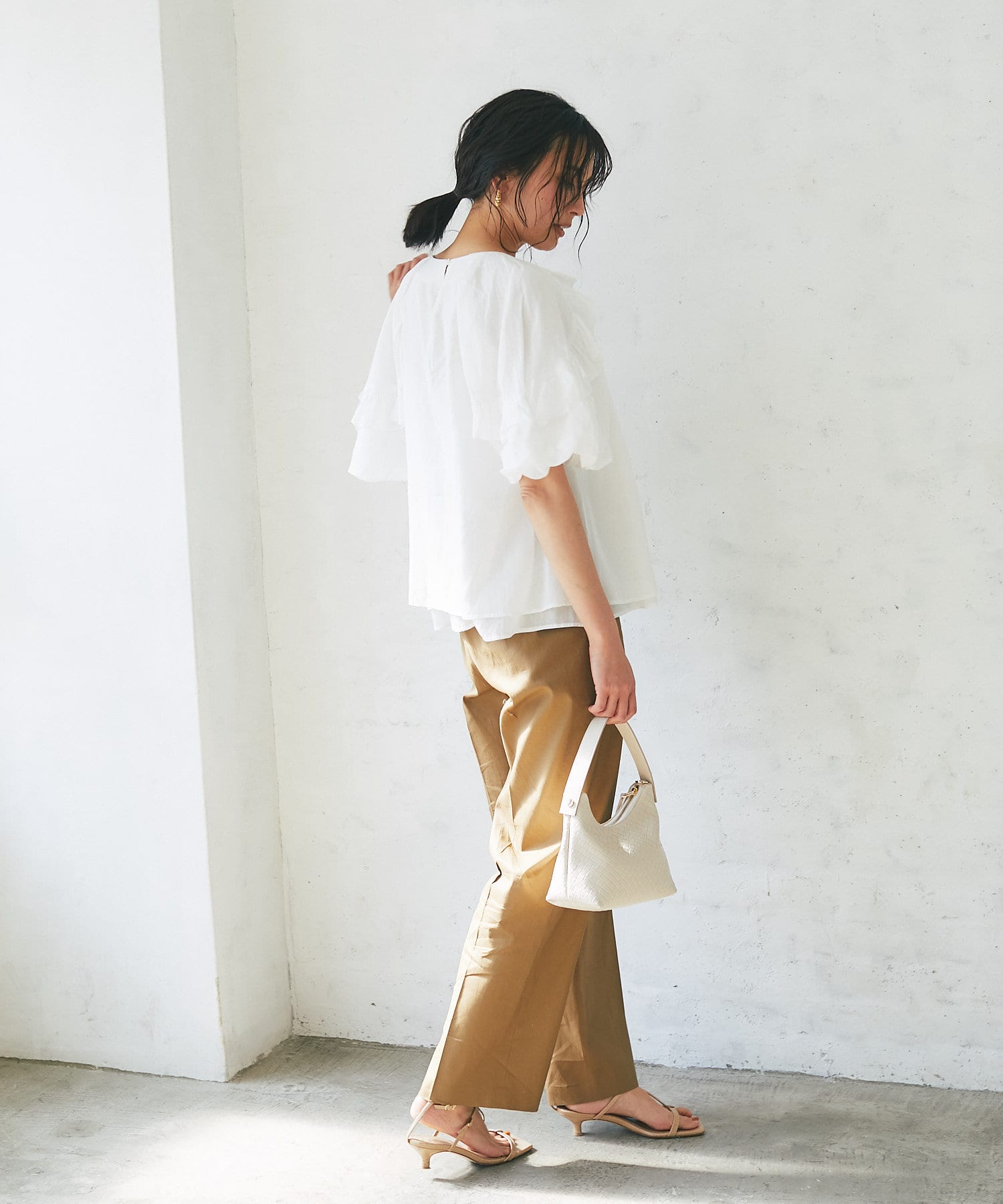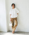 ブラウスの甘さを活かしたパンツコーデがおすすめです。
