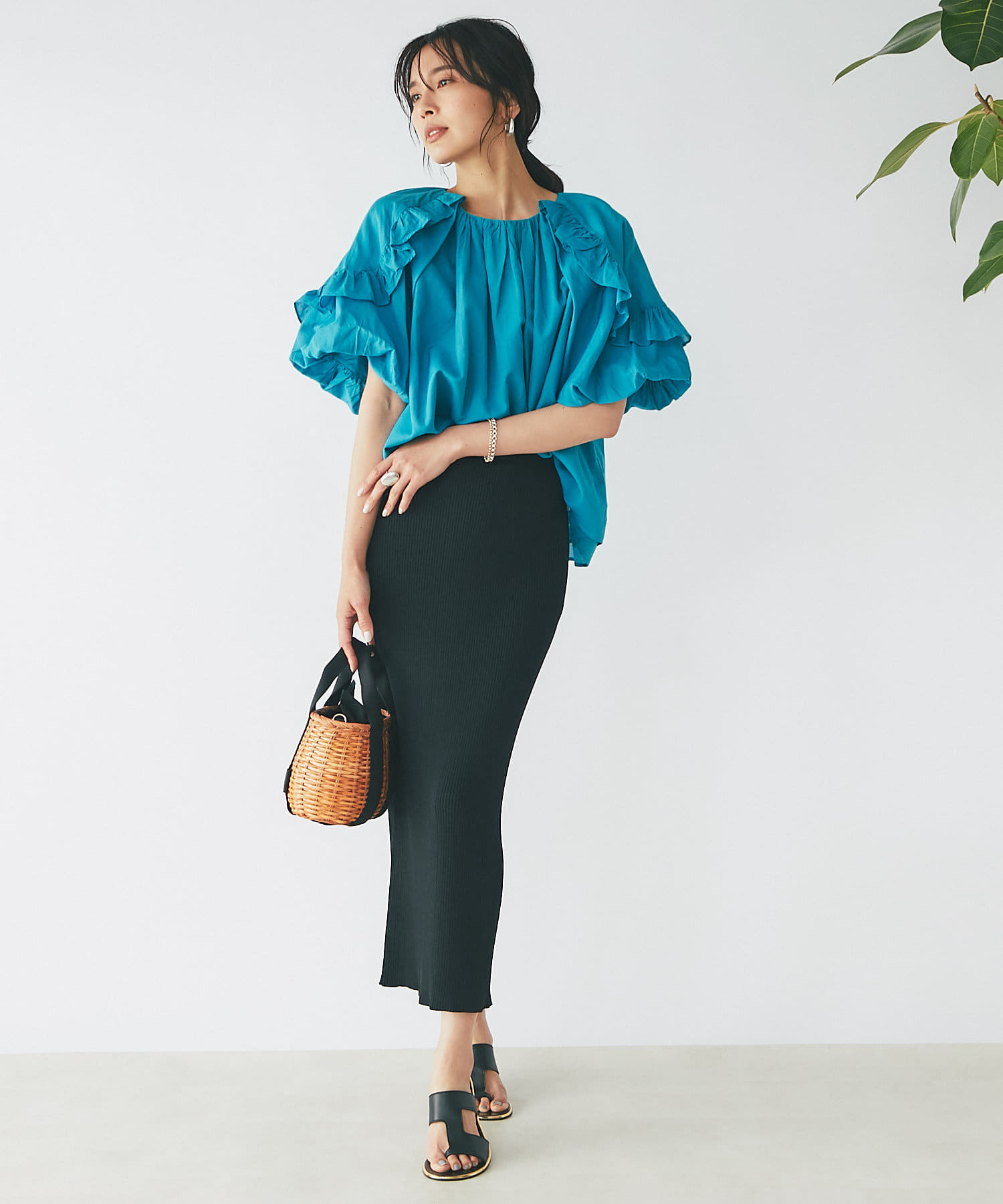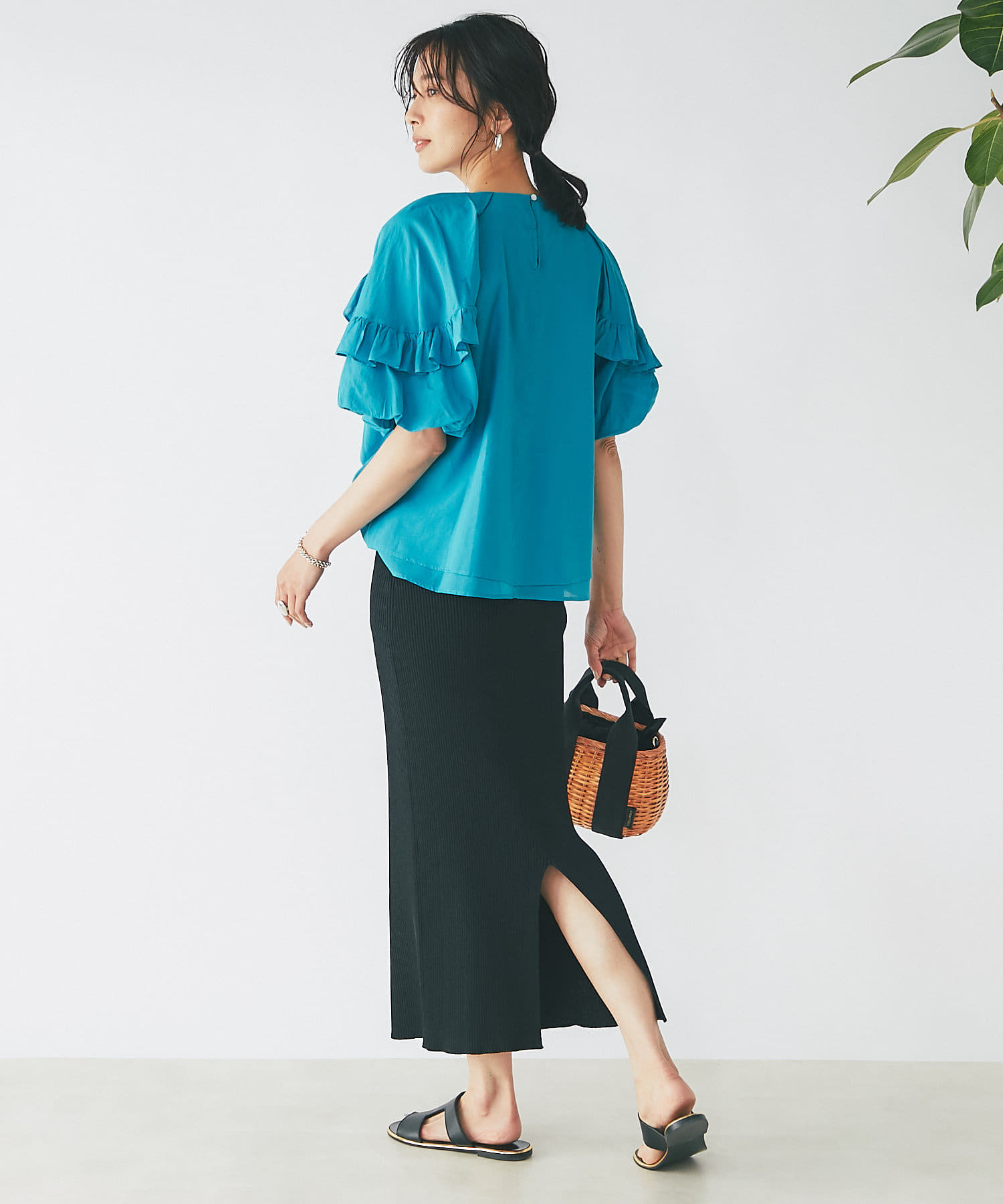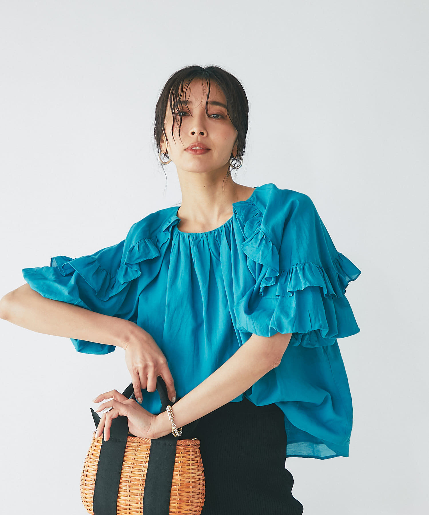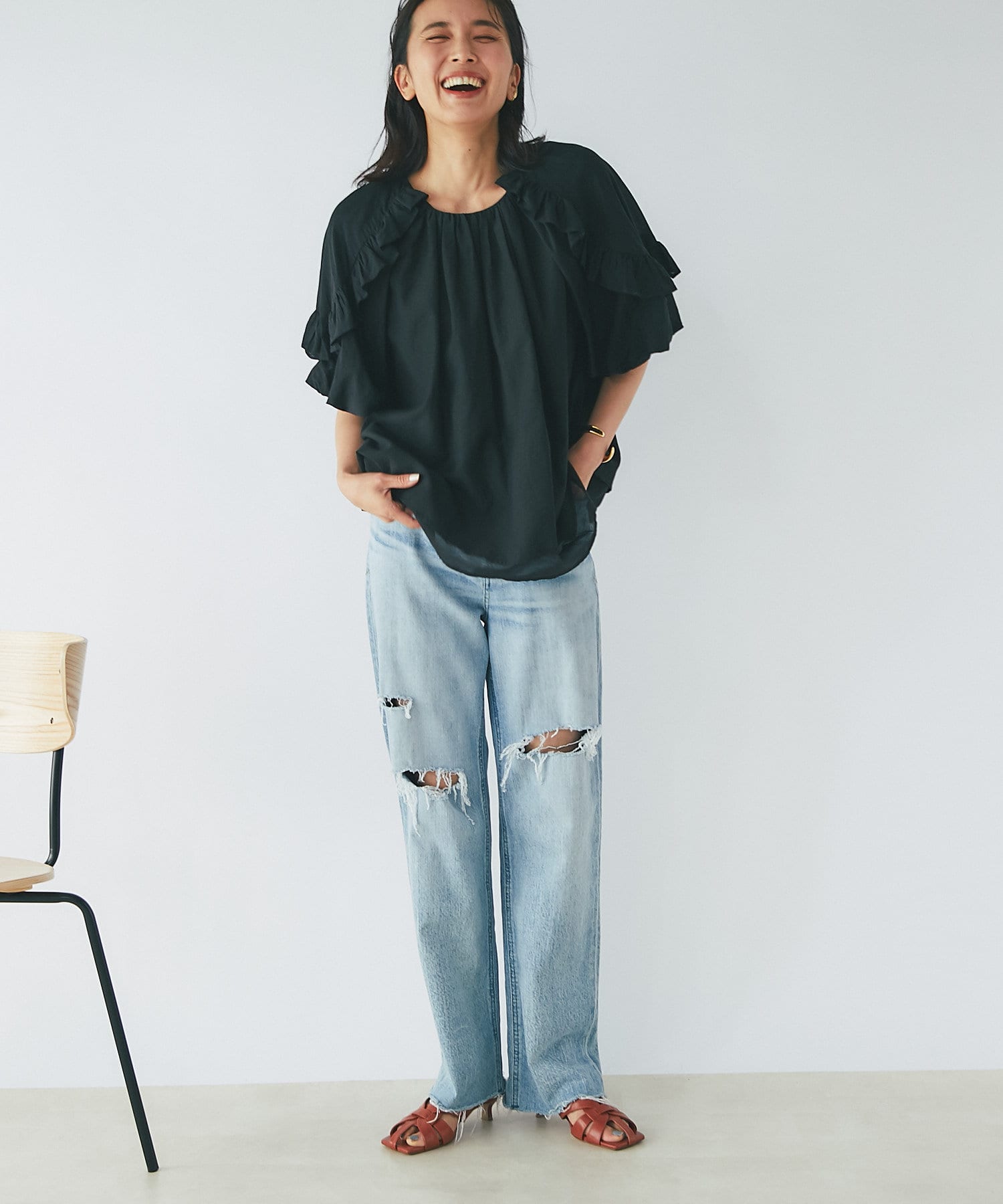 ブラウスの甘さを活かしたパンツコーデがおすすめです。