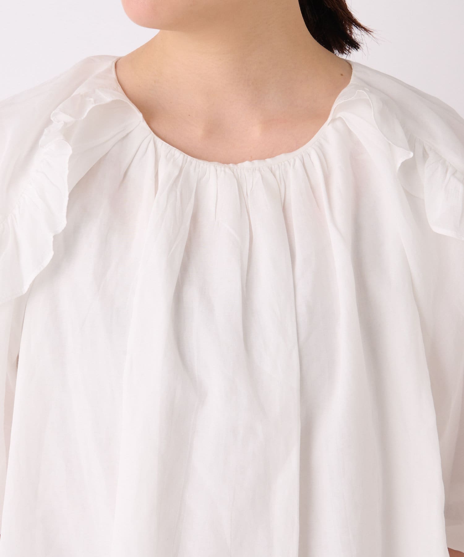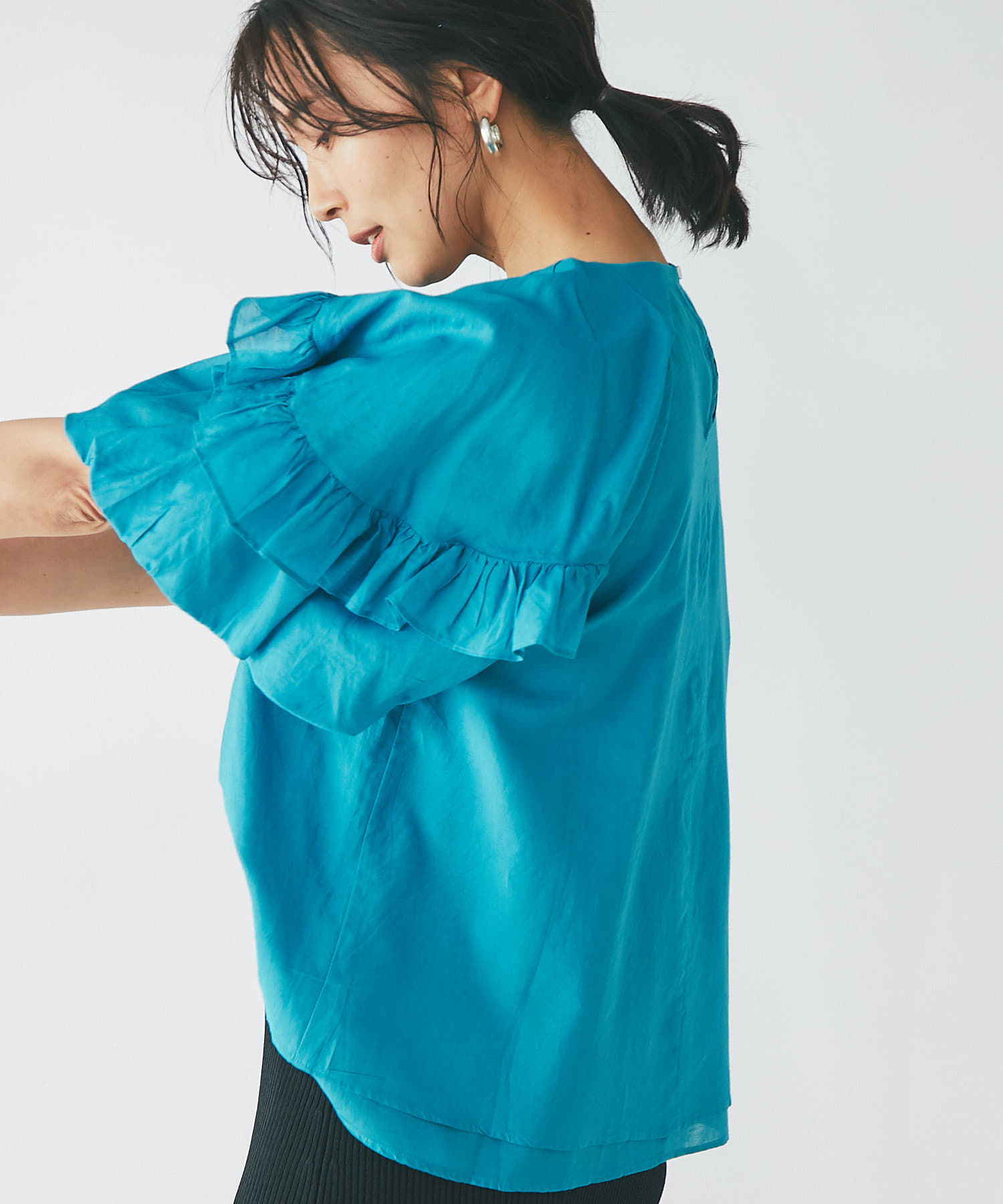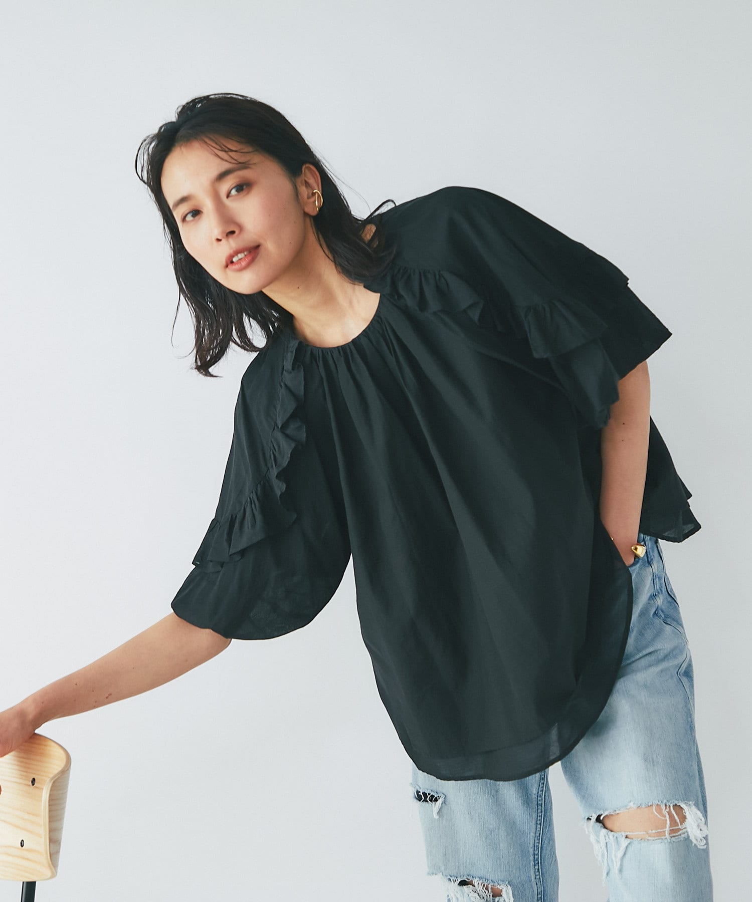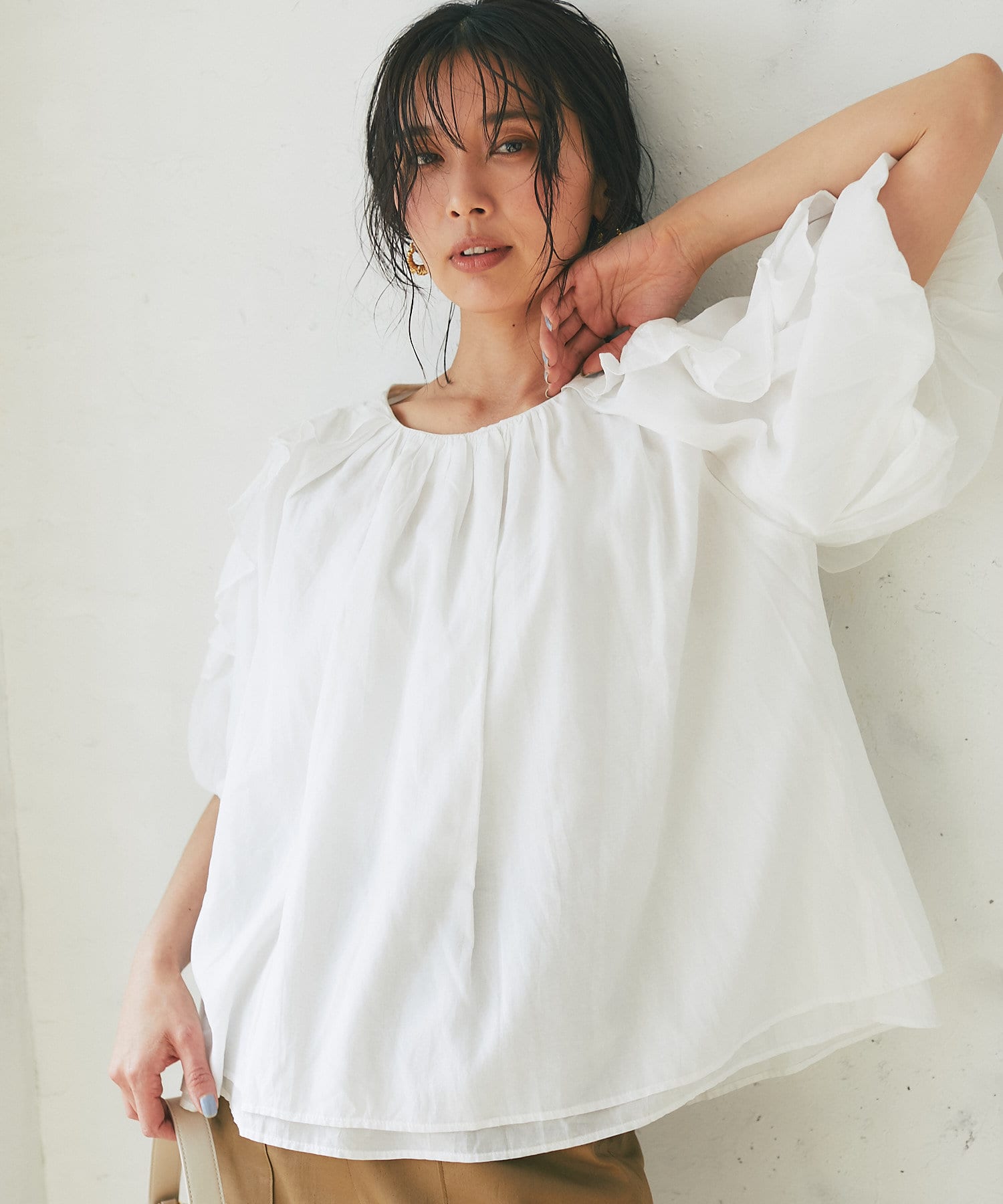 綿レーヨン混率で優しい透け感とハリ感が特徴で、春から夏まで着ていただけます。