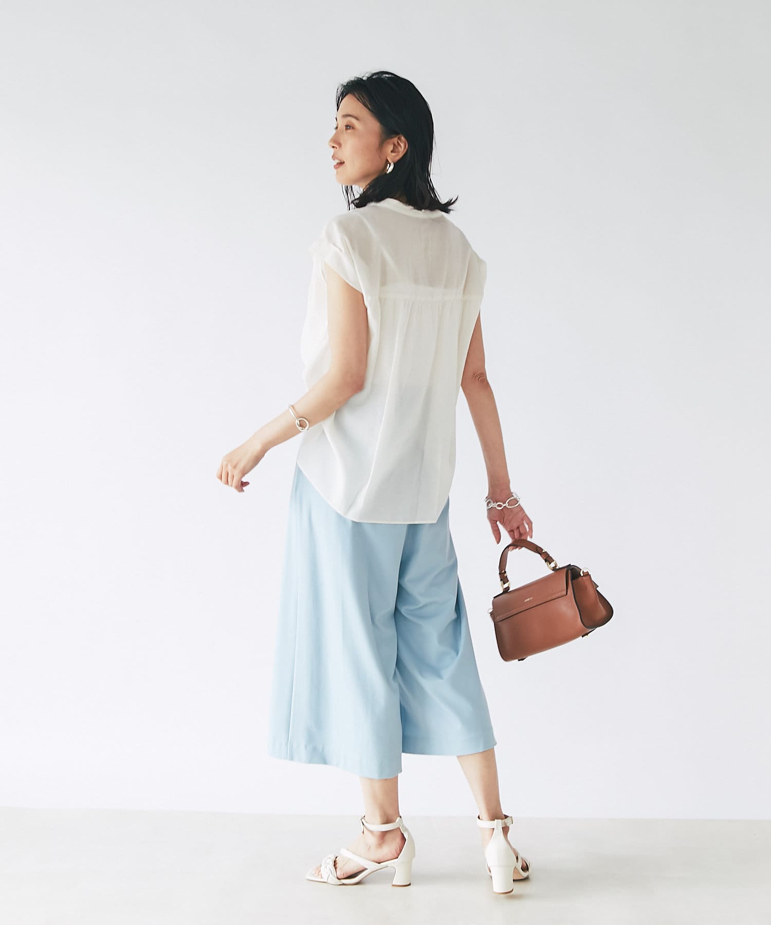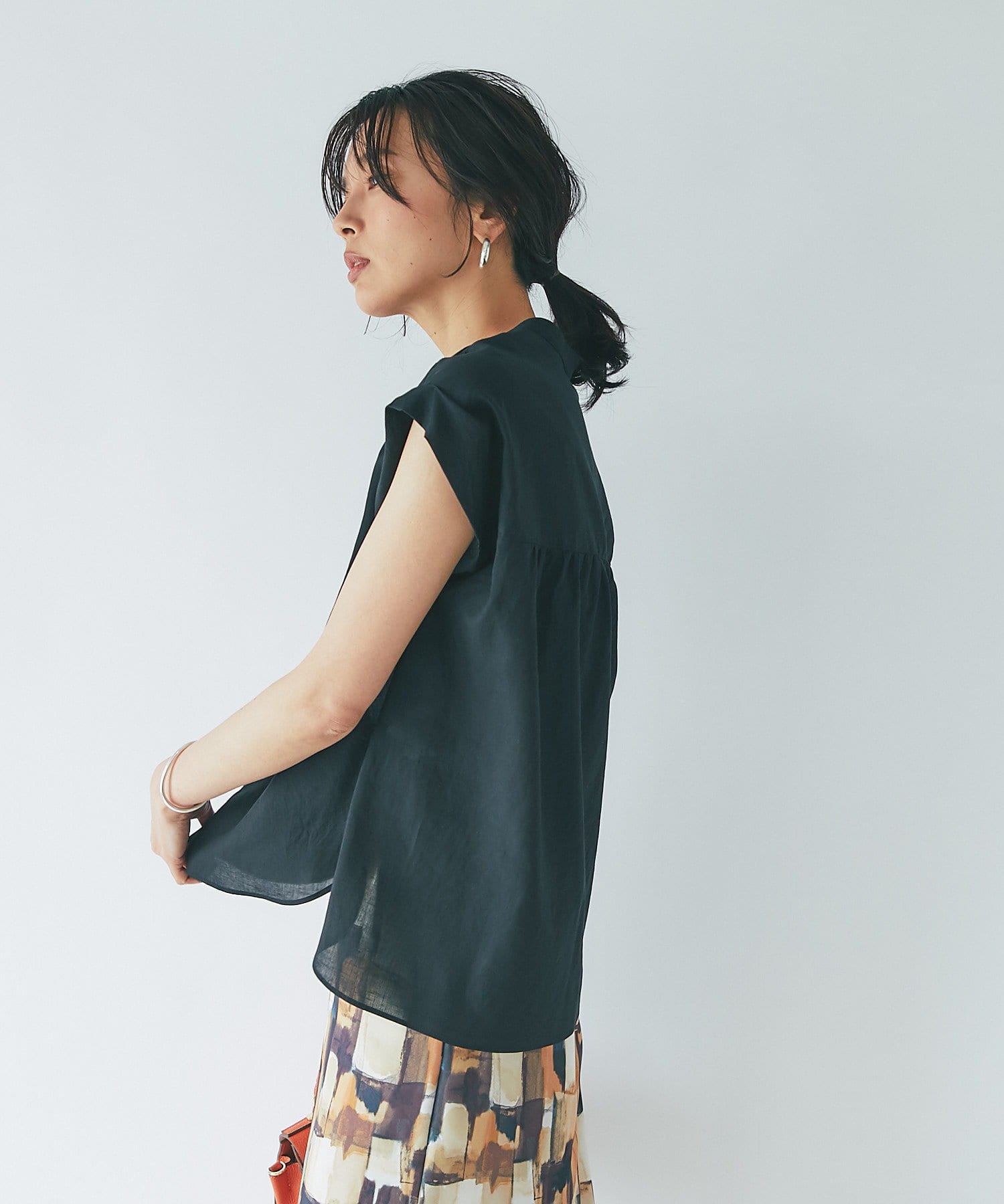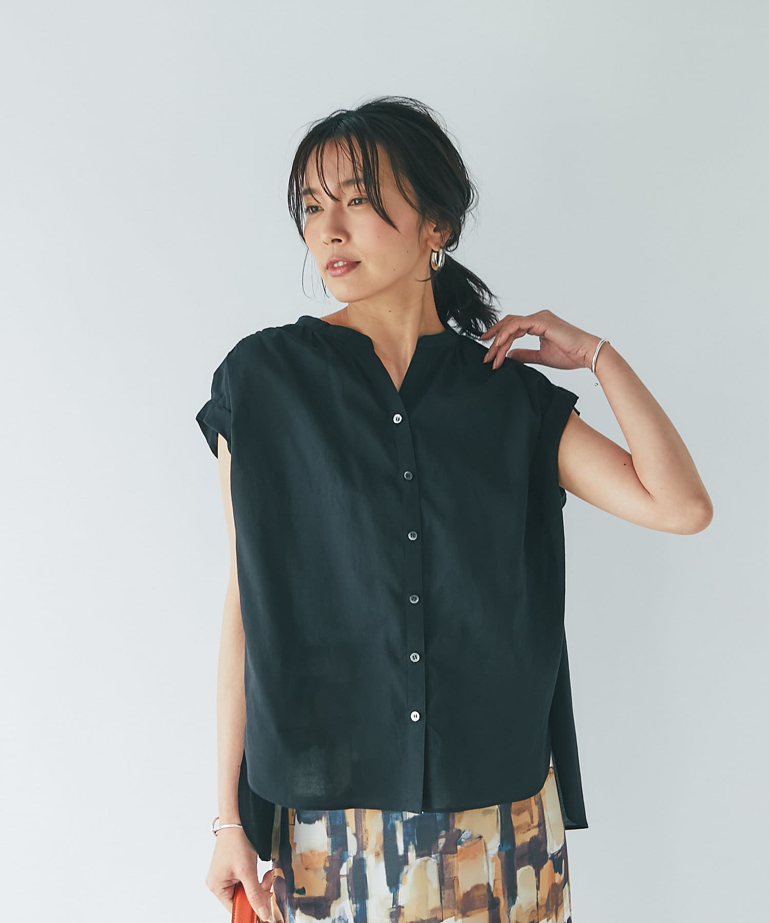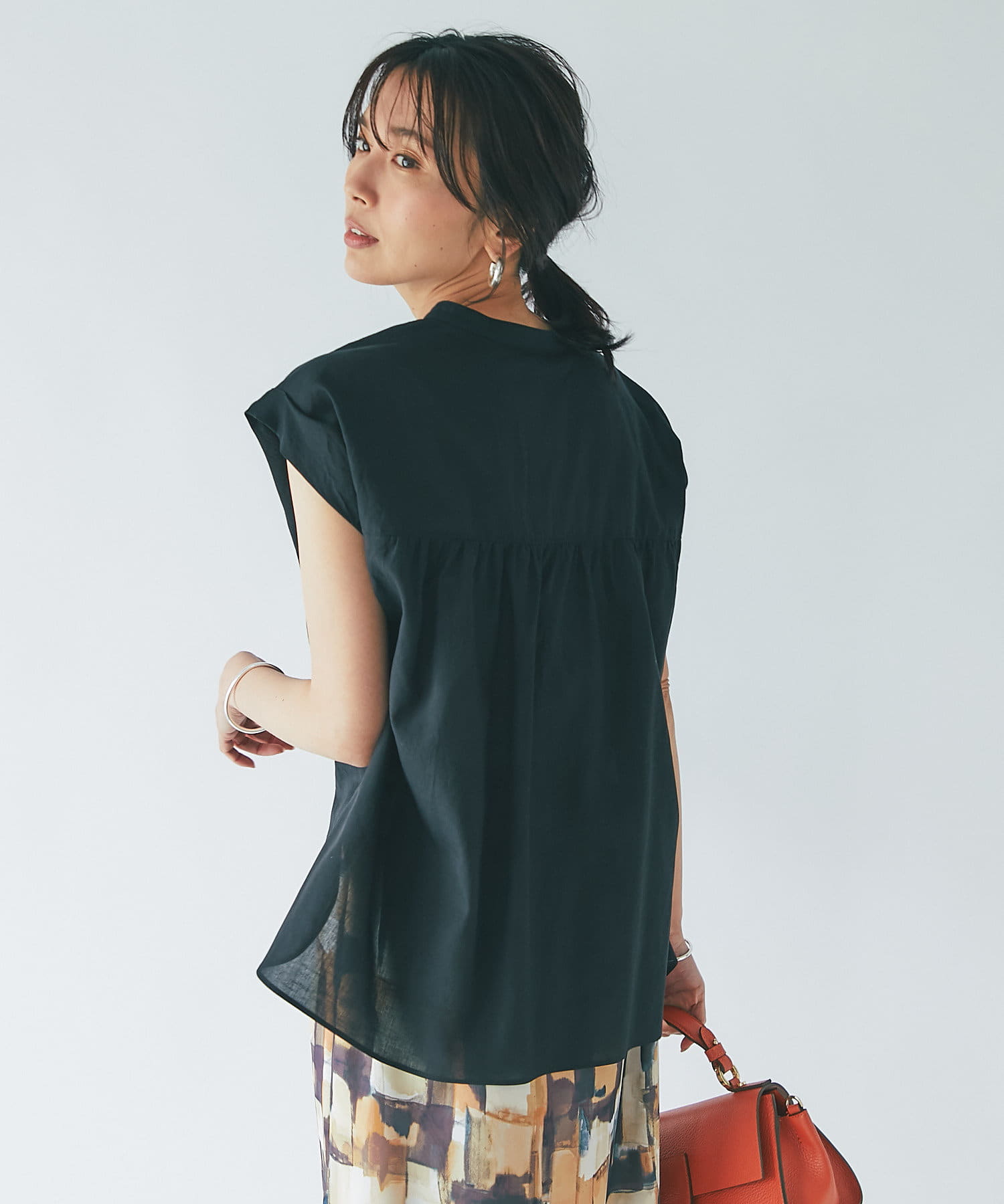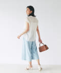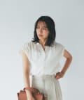 シンプルなデザインなので、カゴバックなど小物使いを楽しめるブラウスです。