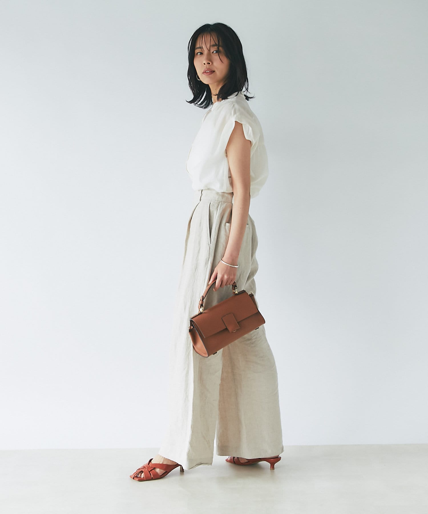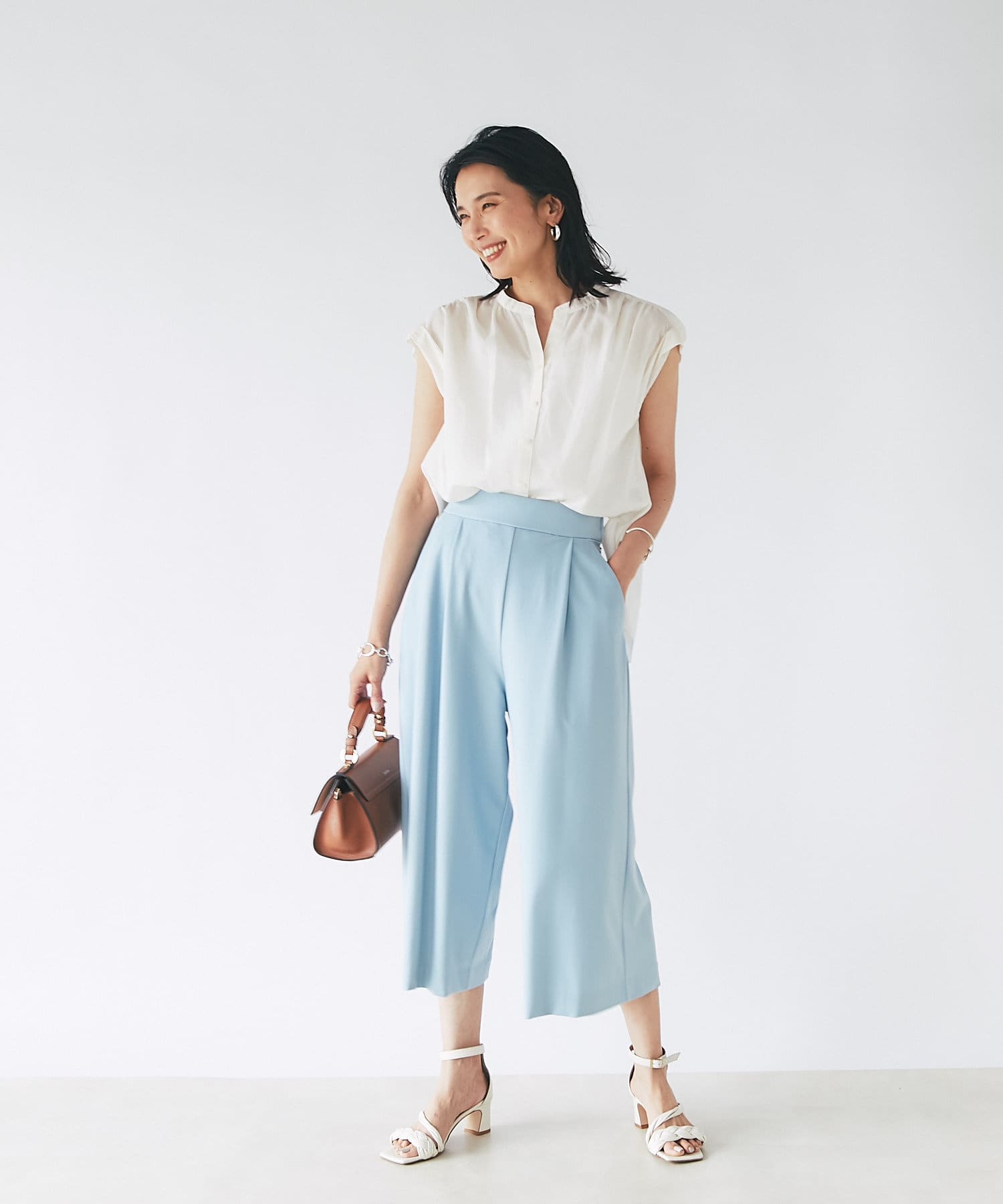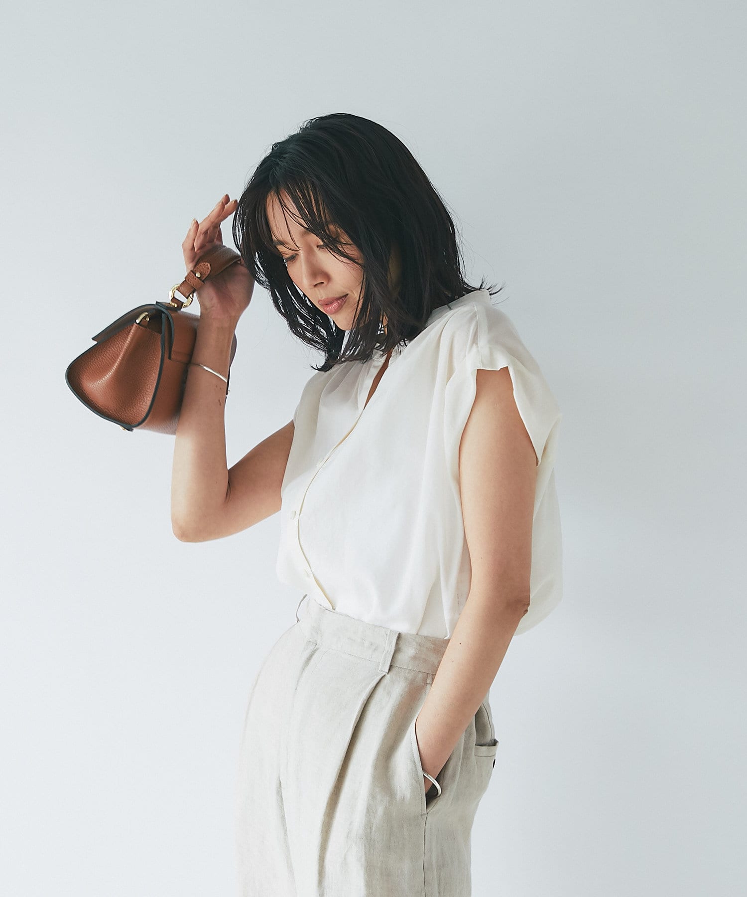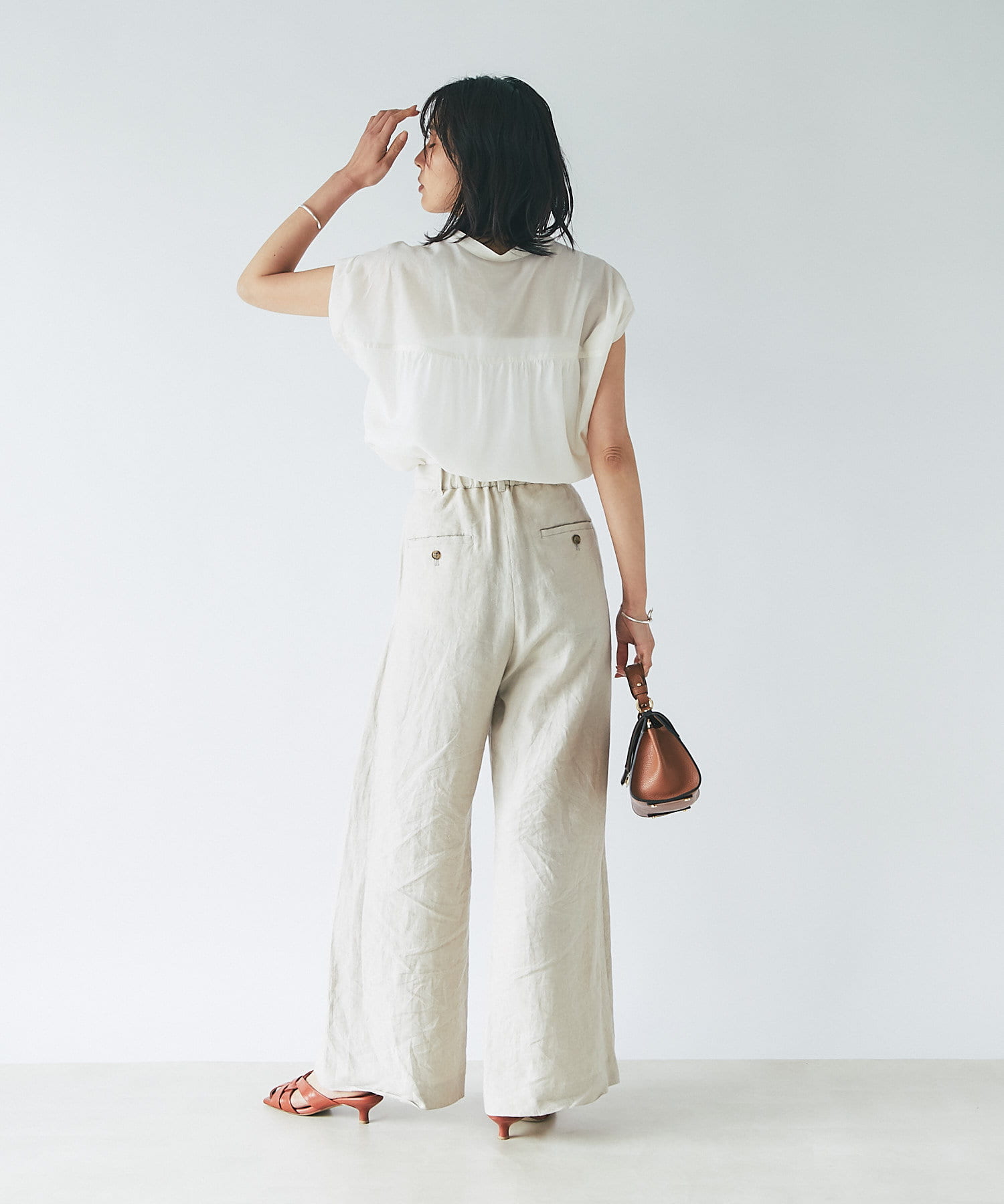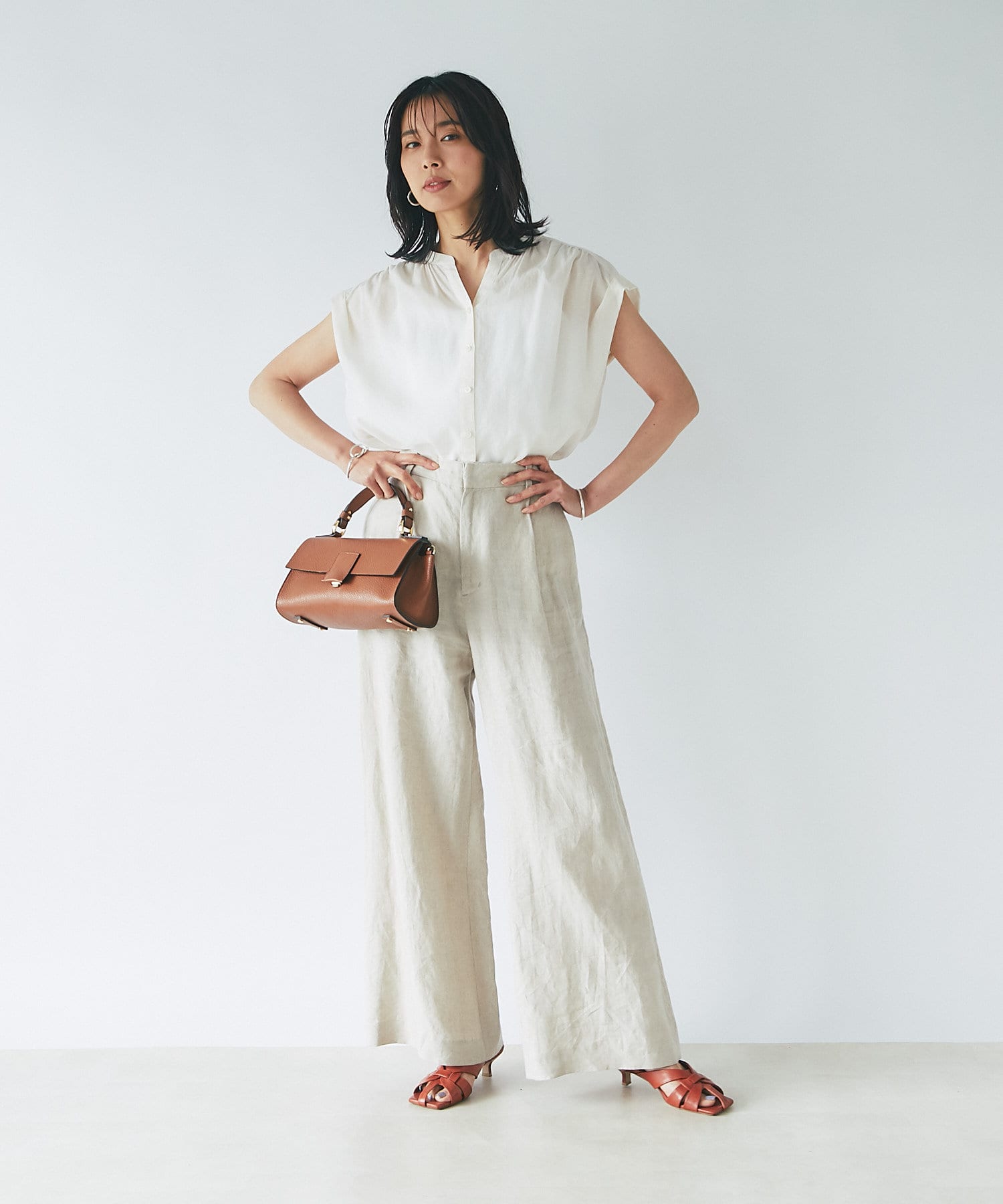 シンプルなデザインなので、カゴバックなど小物使いを楽しめるブラウスです。