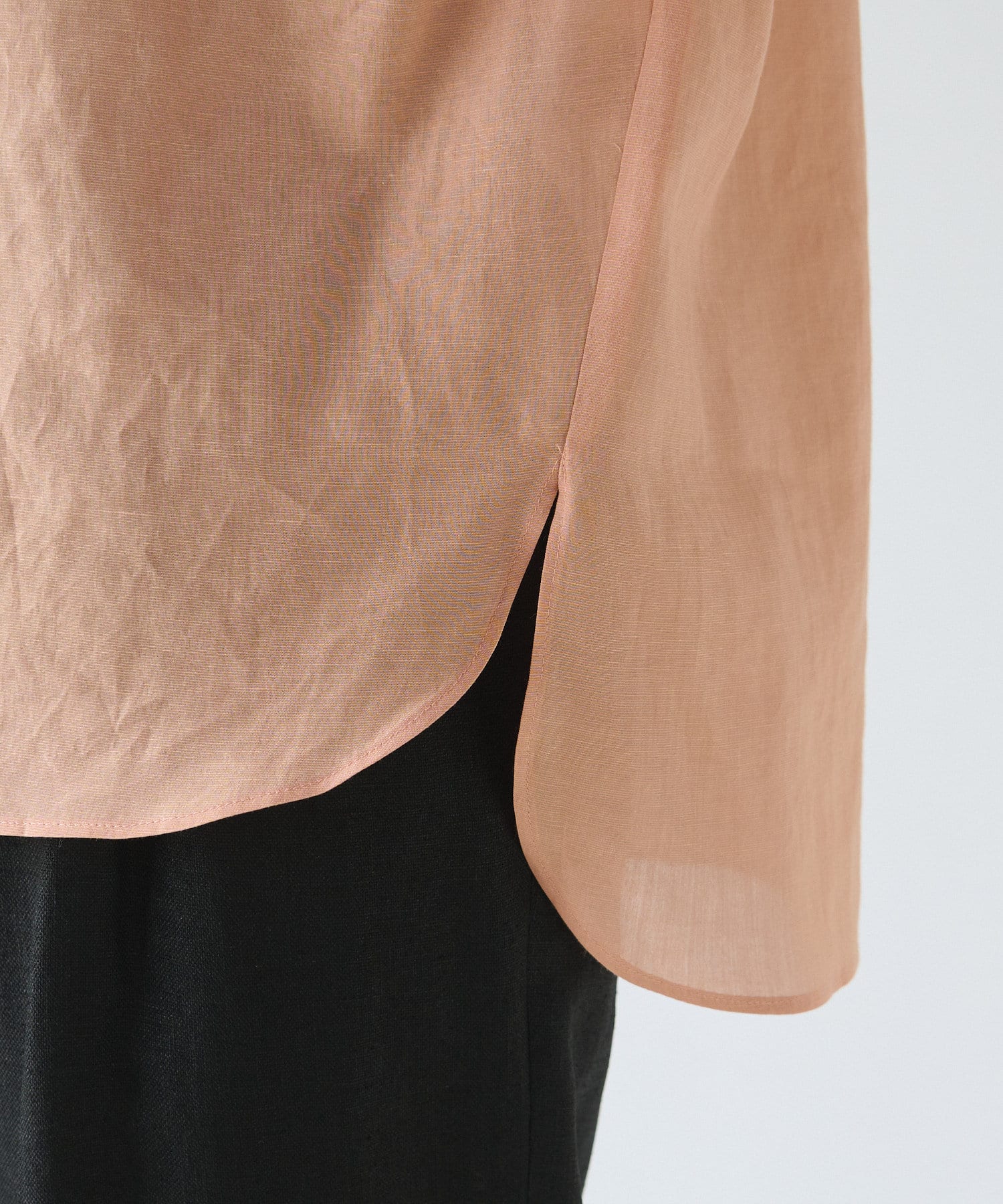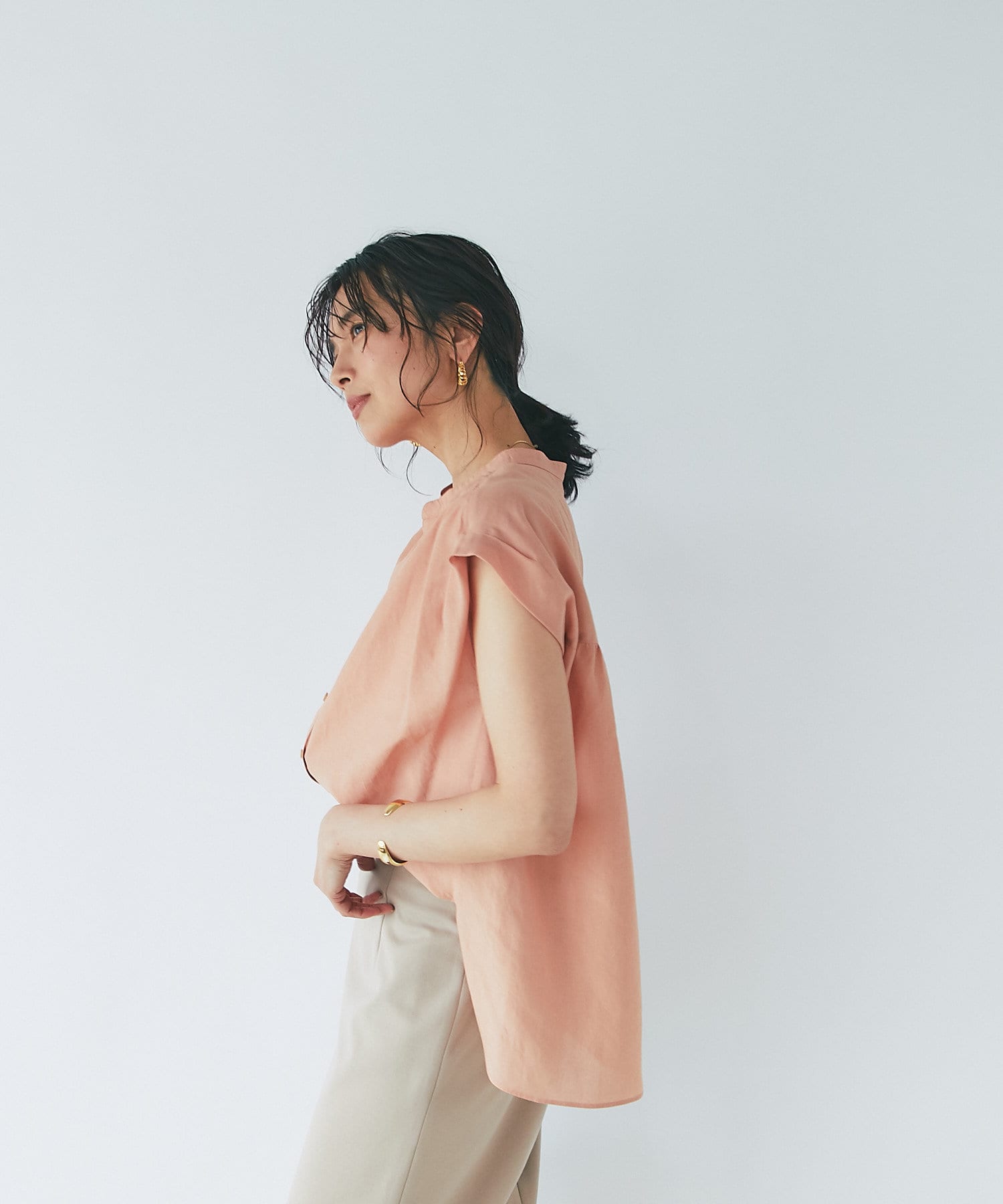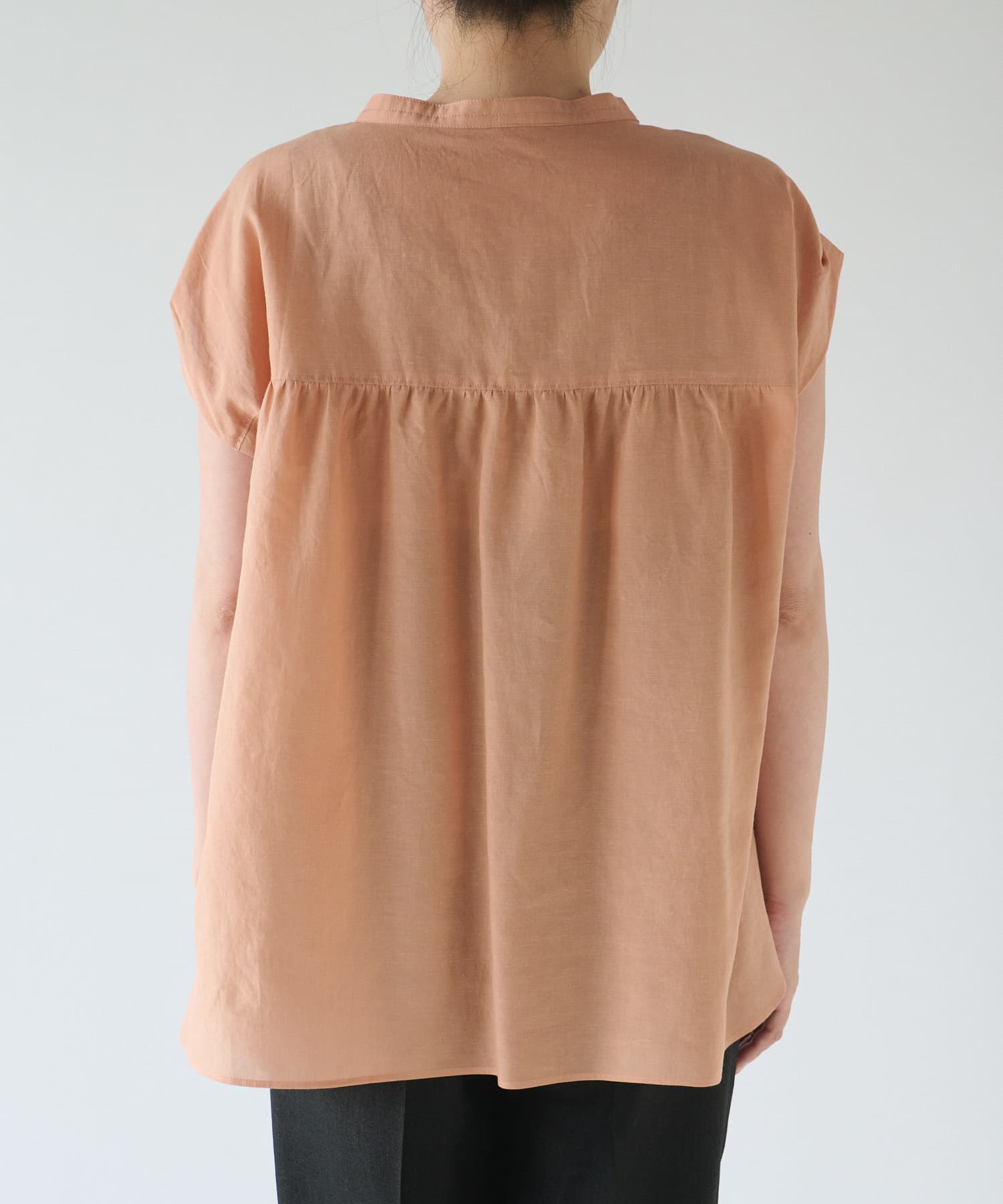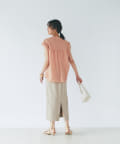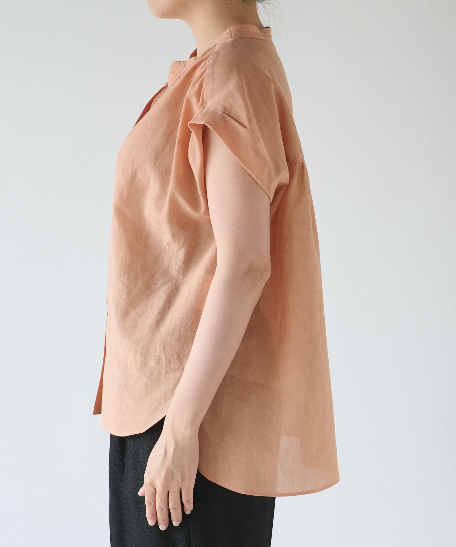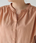 自然と開く衿元なので、着こなしを悩まず取り入れやすく、前開きタイプなので、お好みに合わせて着回せます。袖口はタックありで動きがあるデザイン。