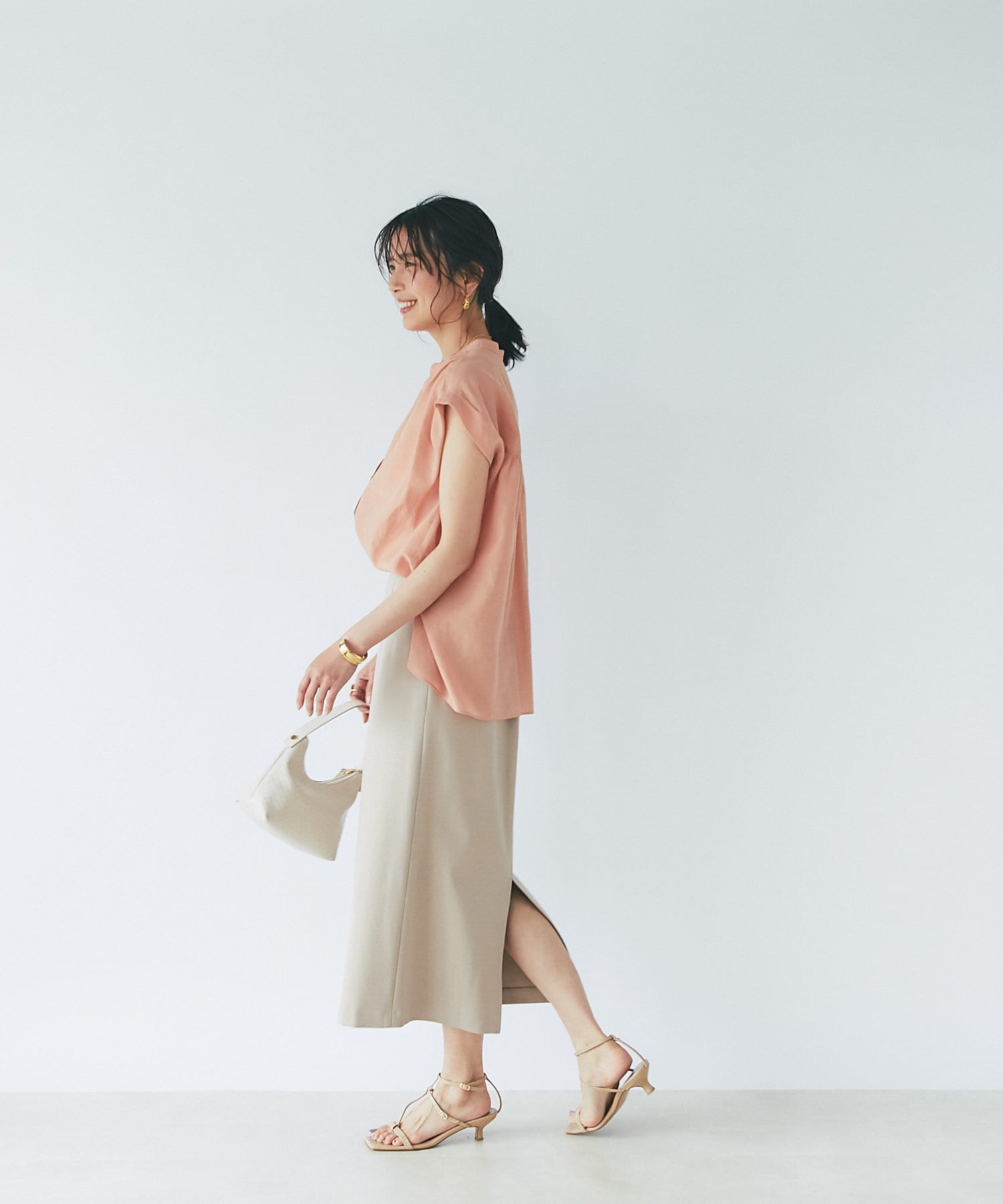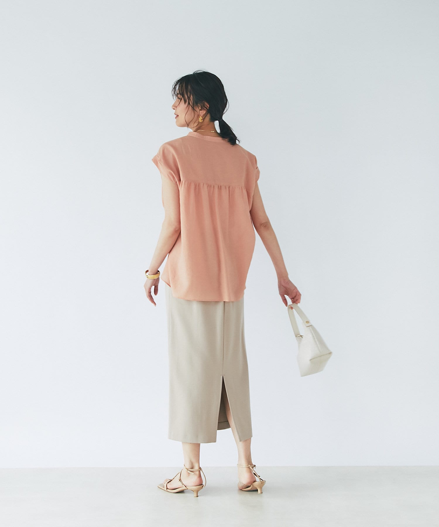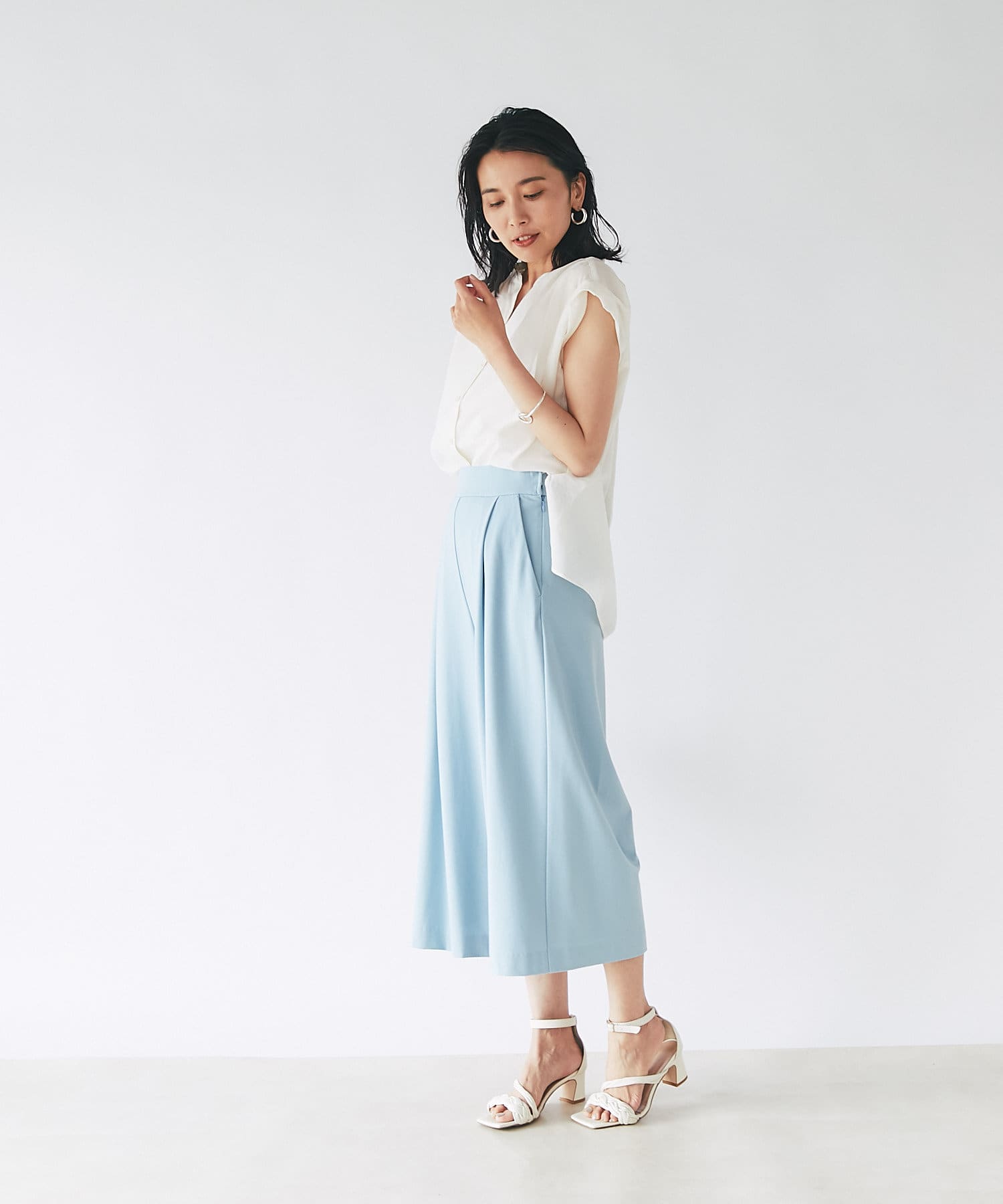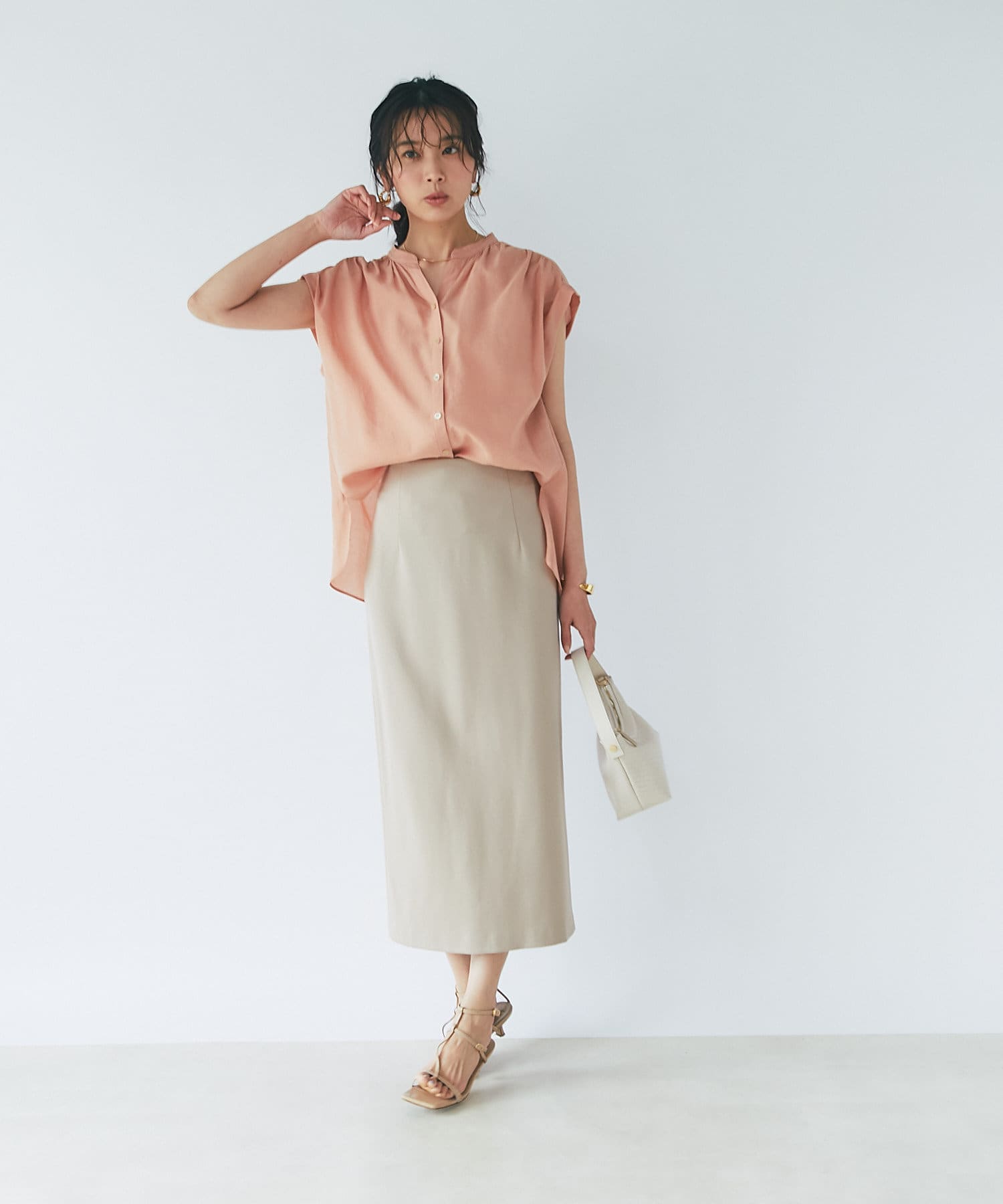 キレイめタイトスカートで、前身をINしてクリアーな印象で着こなせます。