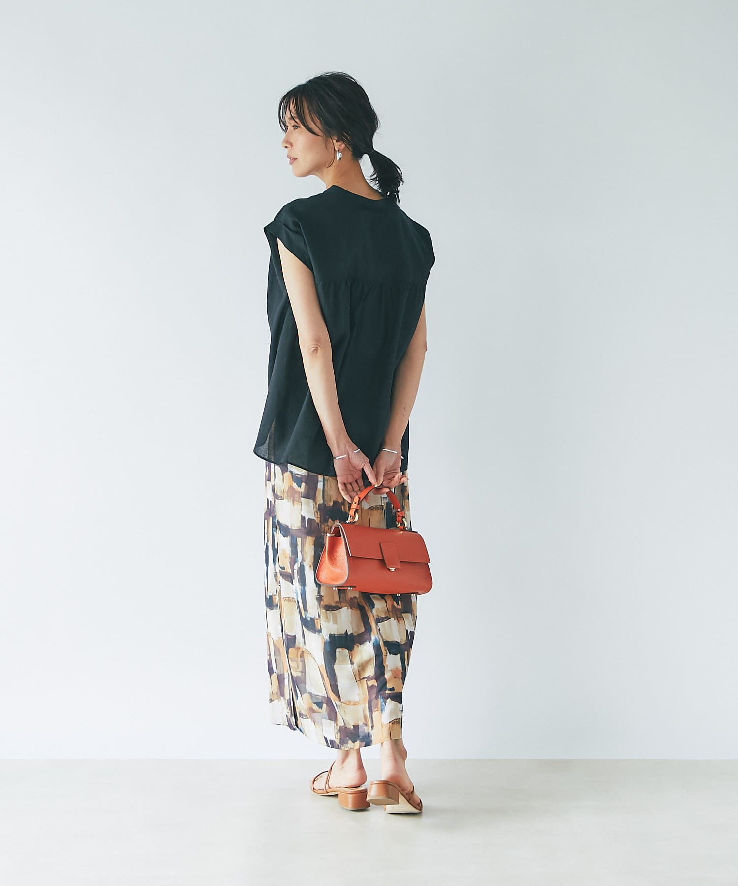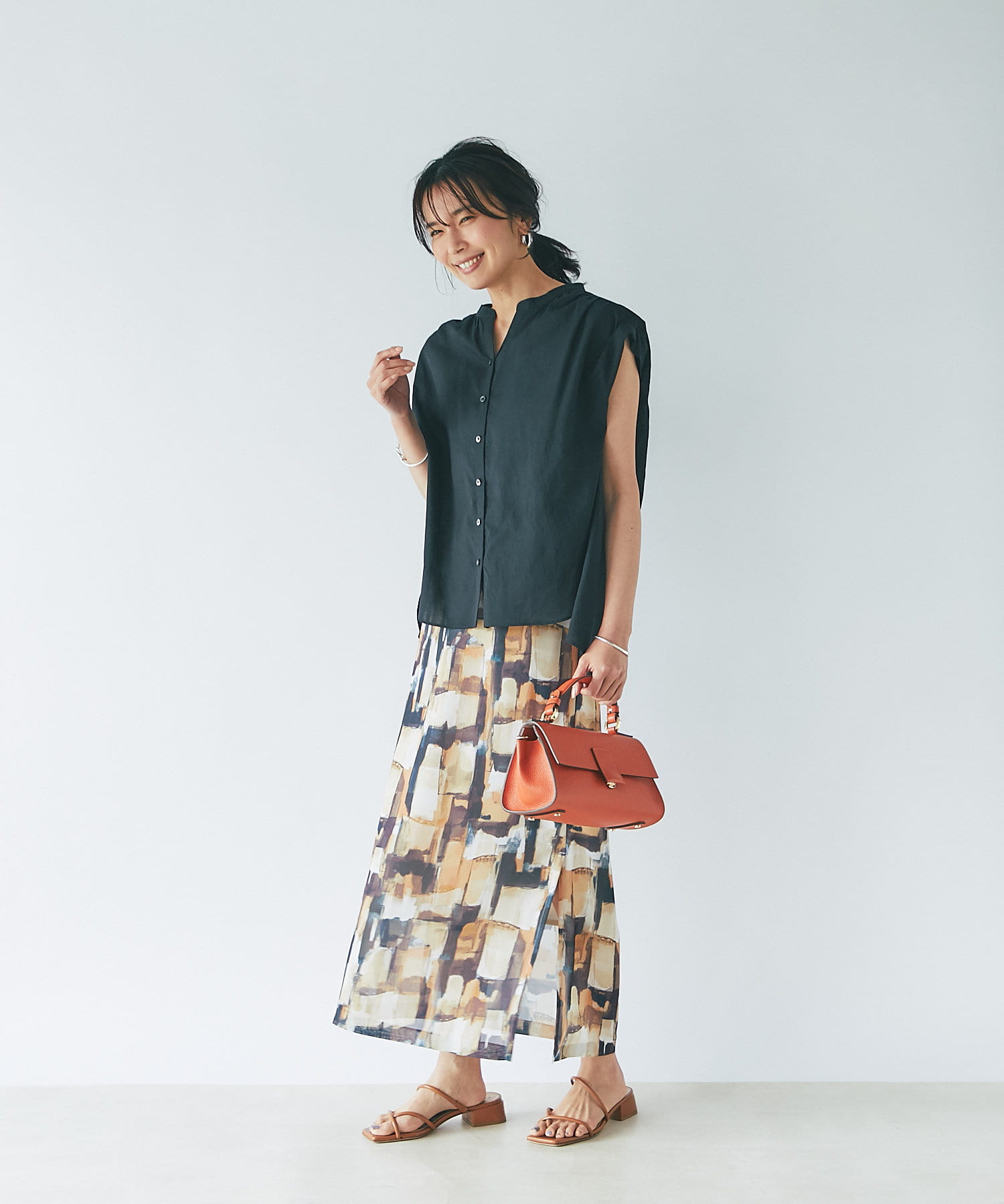 夏に着たい柄スカートとの相性も抜群。モードなスタイリングにも抜け感が出ます。