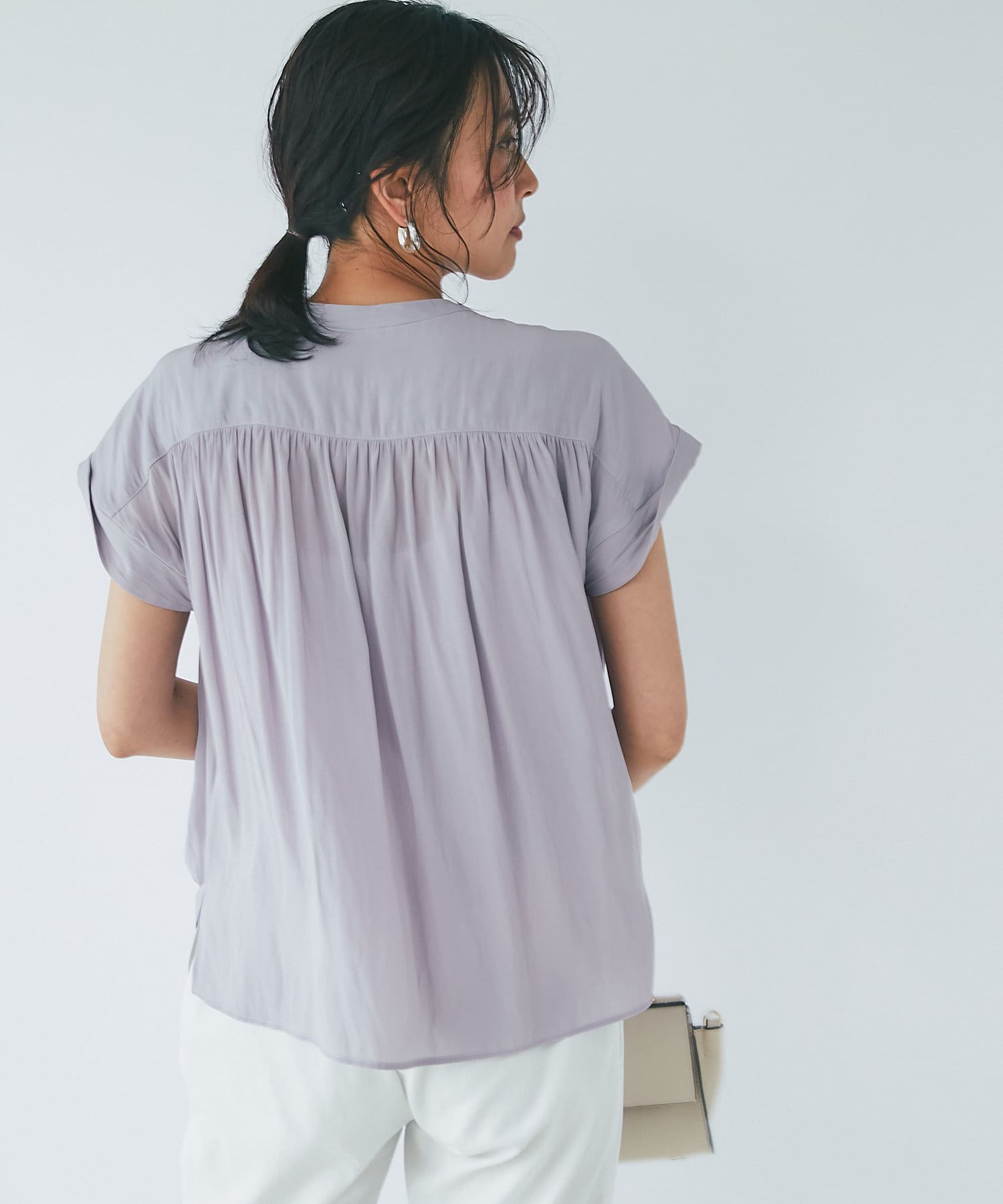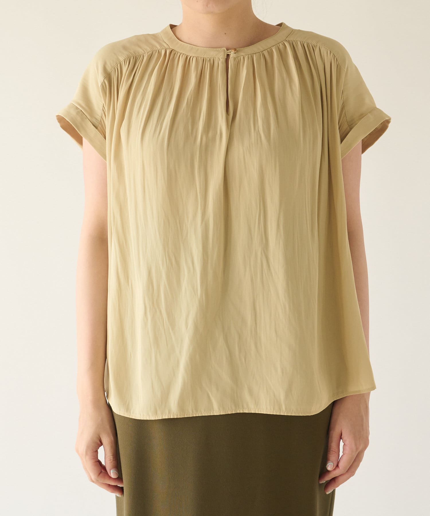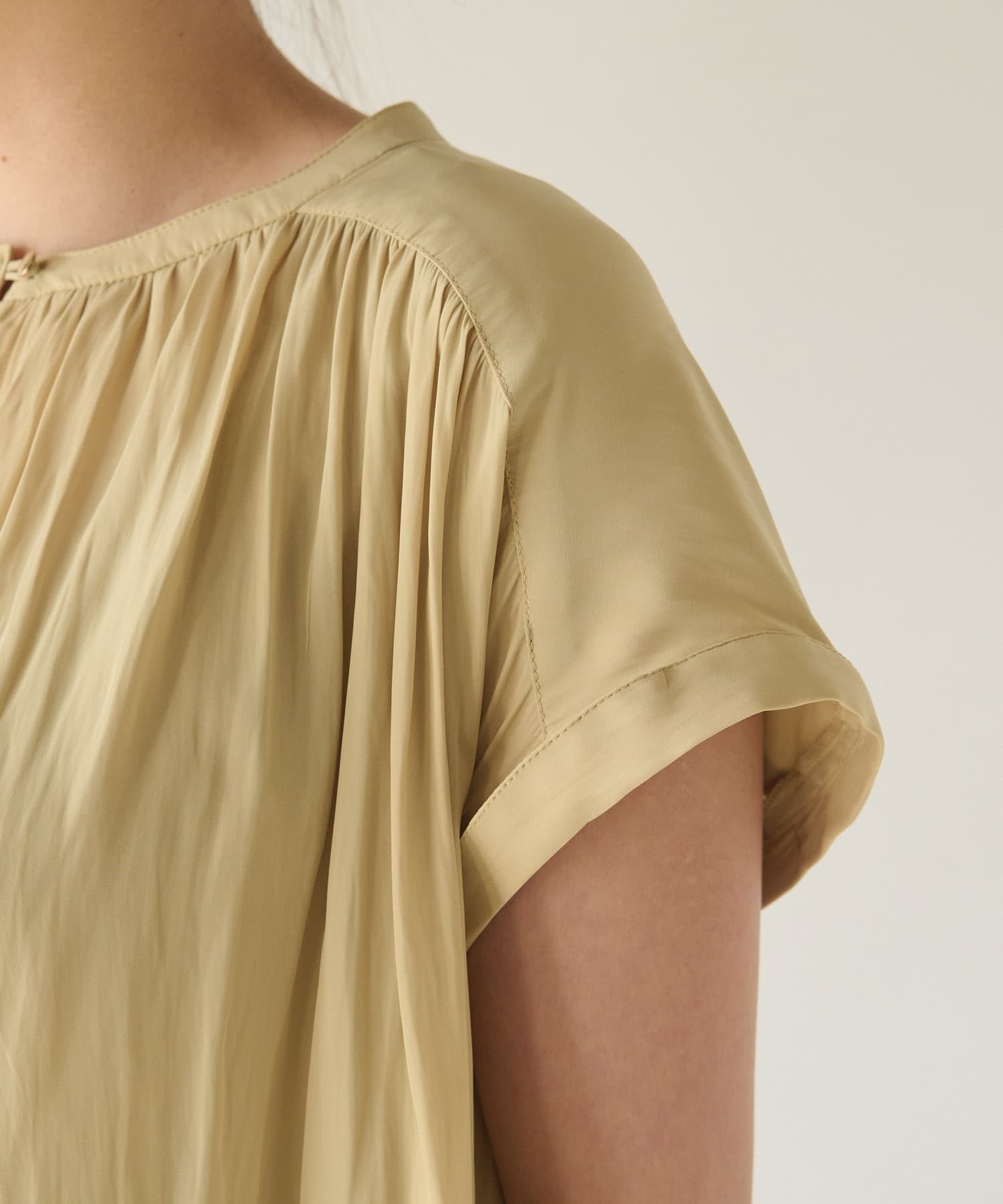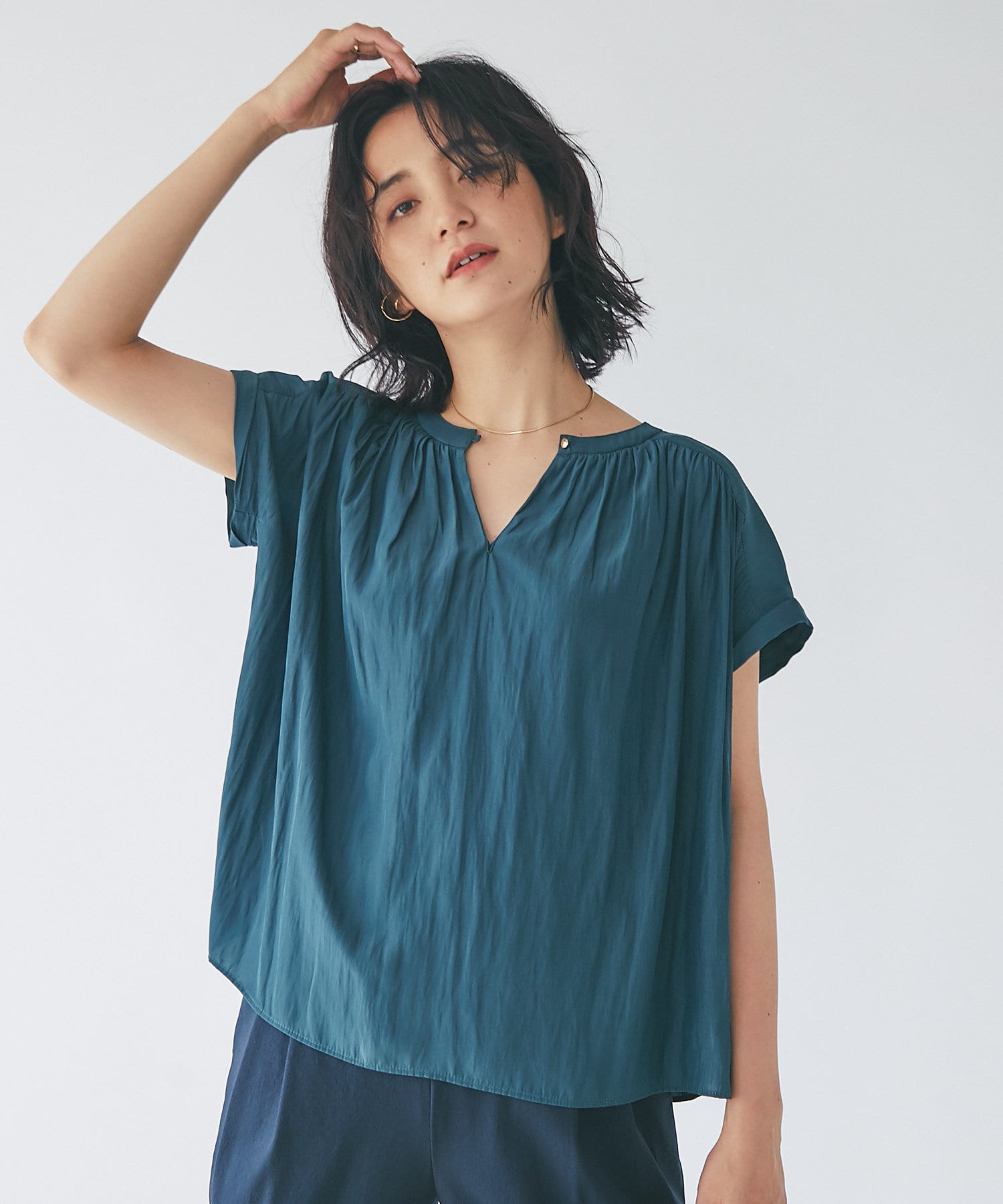 スッキリとした襟元とフレンチスリーブで、ジャケットのインナーなどオフィススタイルに◎