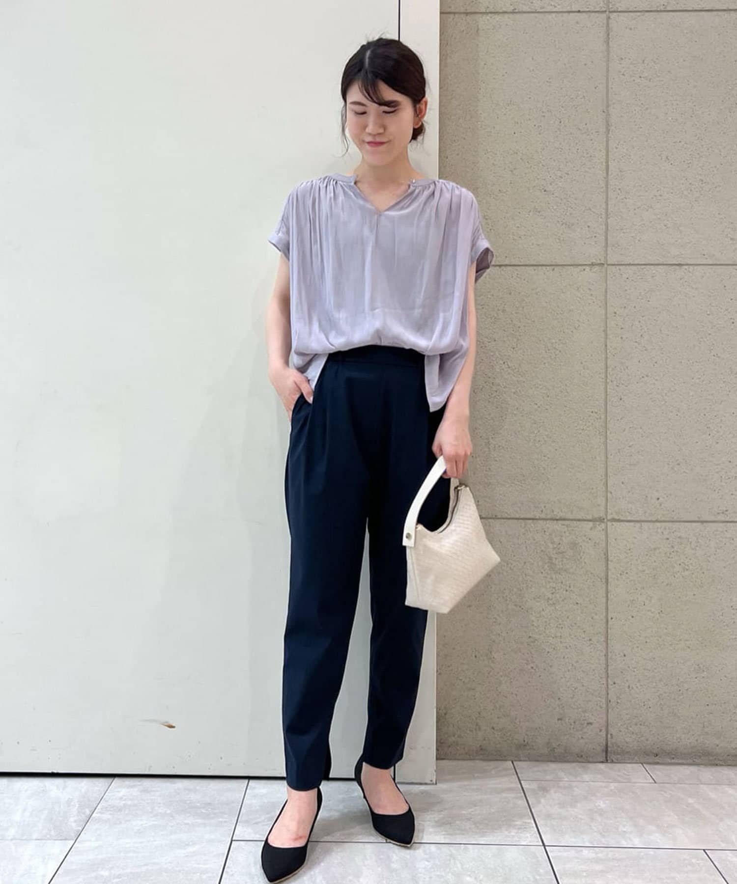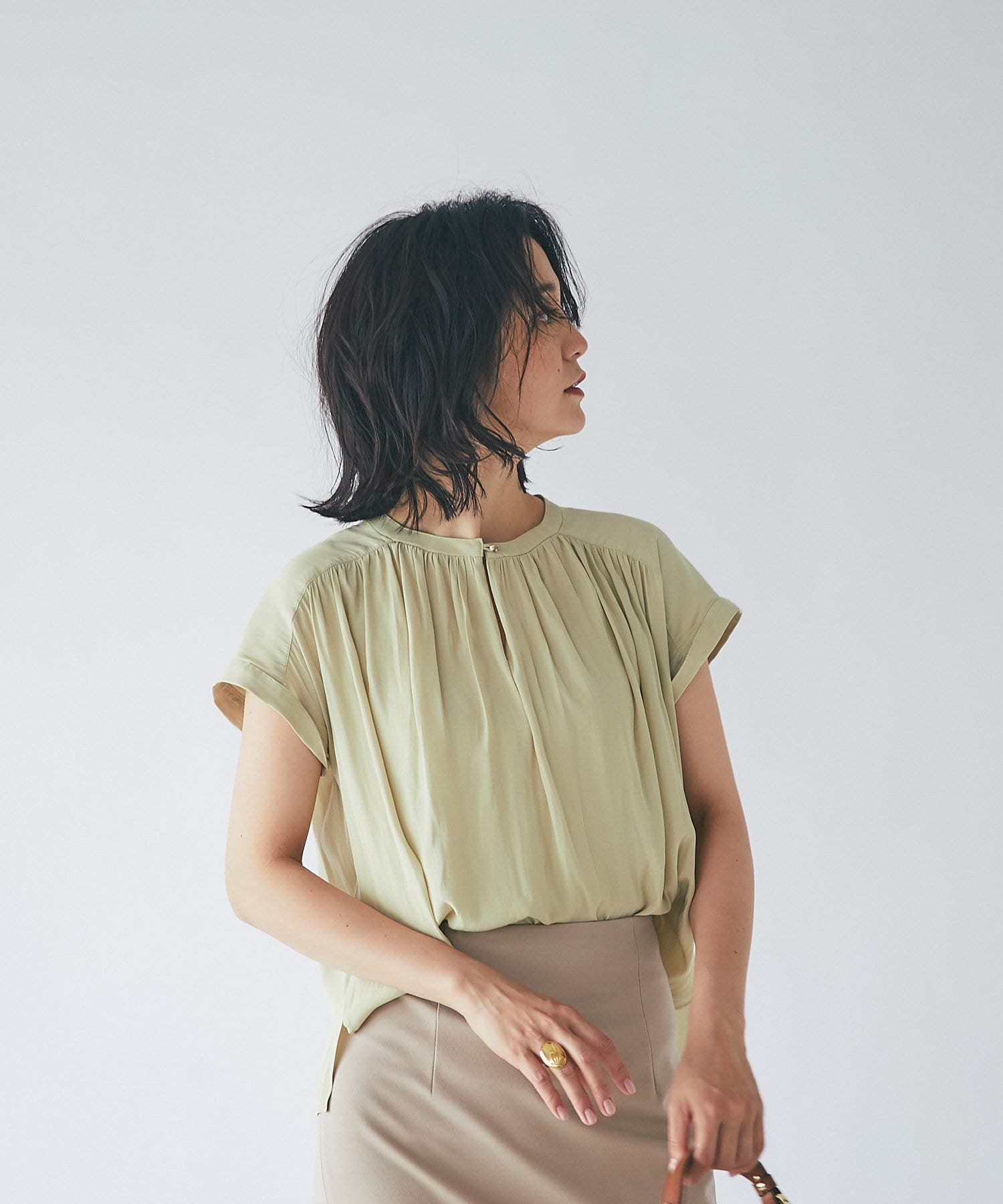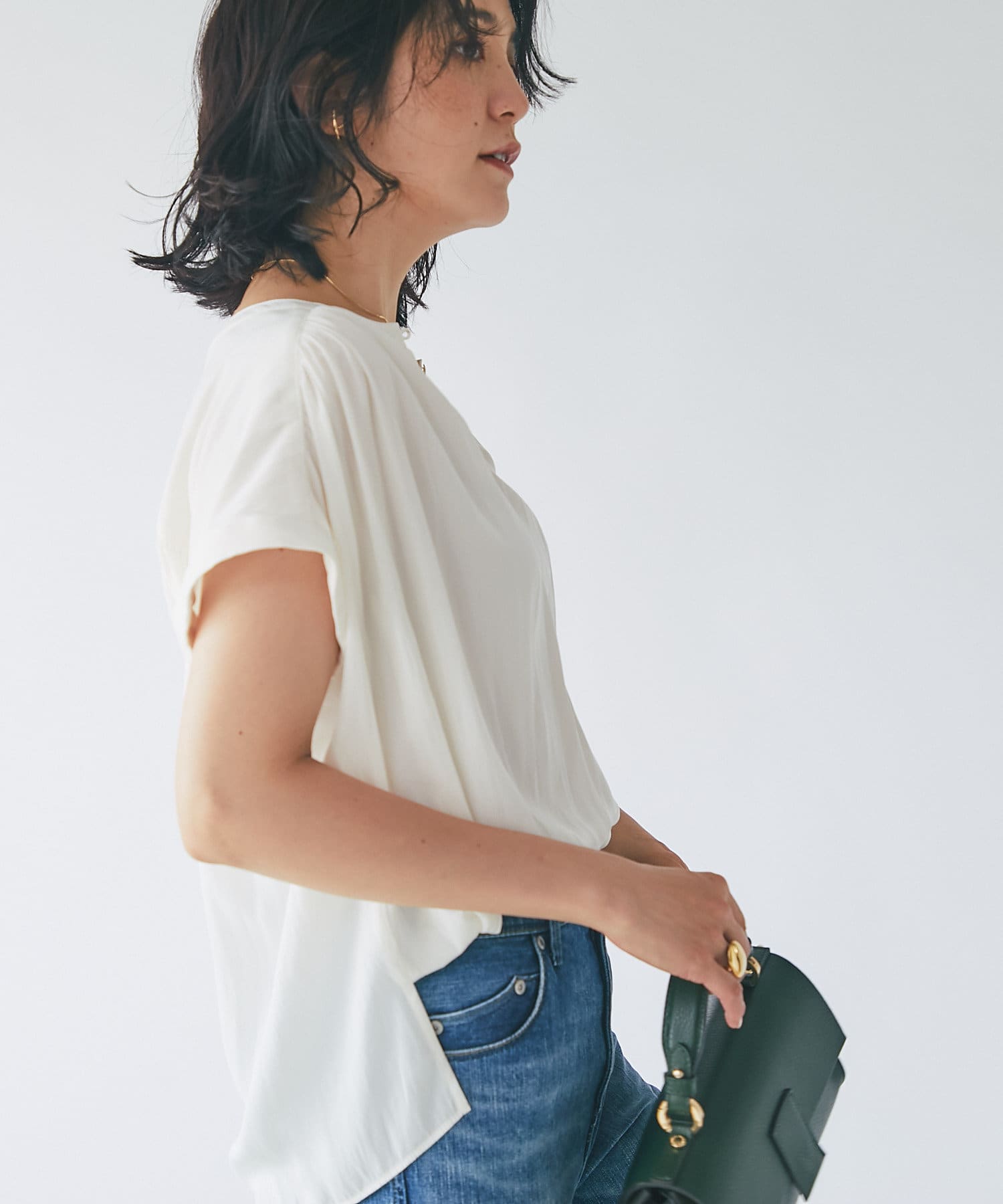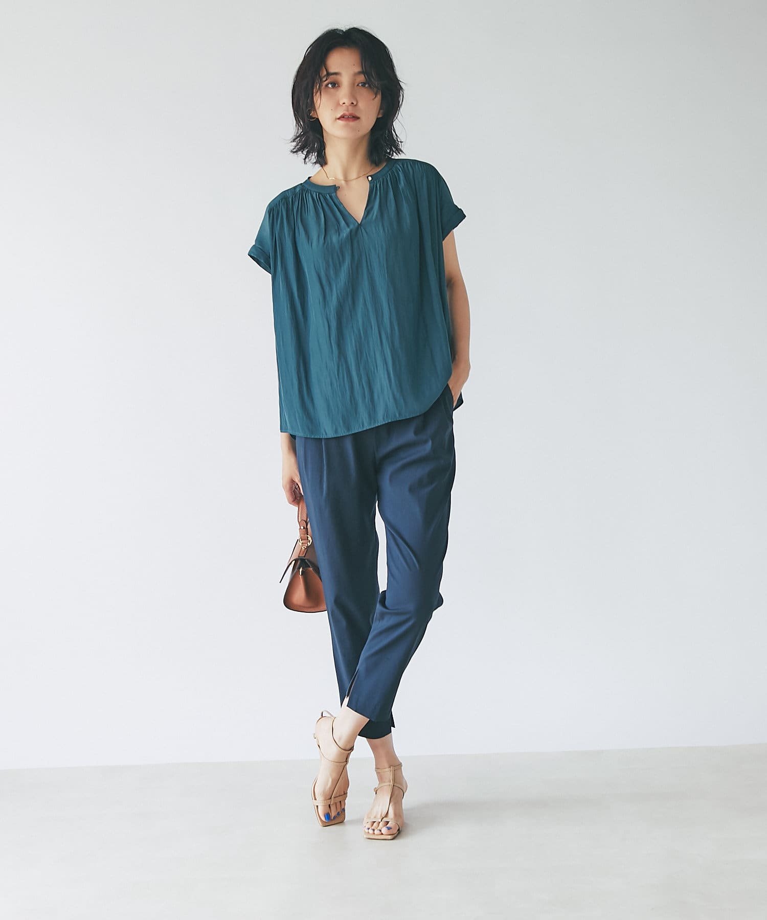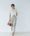 スッキリとした襟元とフレンチスリーブで、ジャケットのインナーなどオフィススタイルに◎
