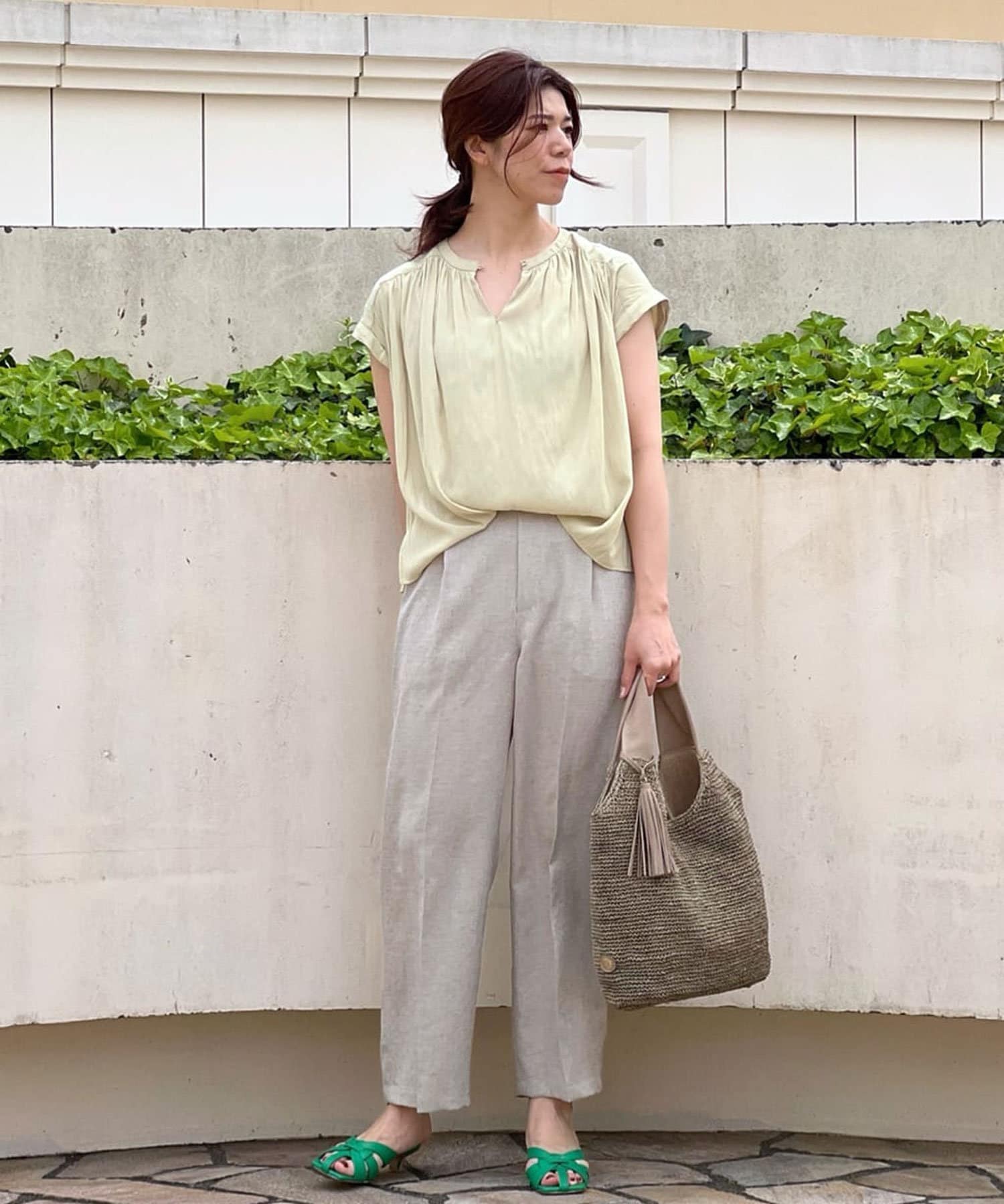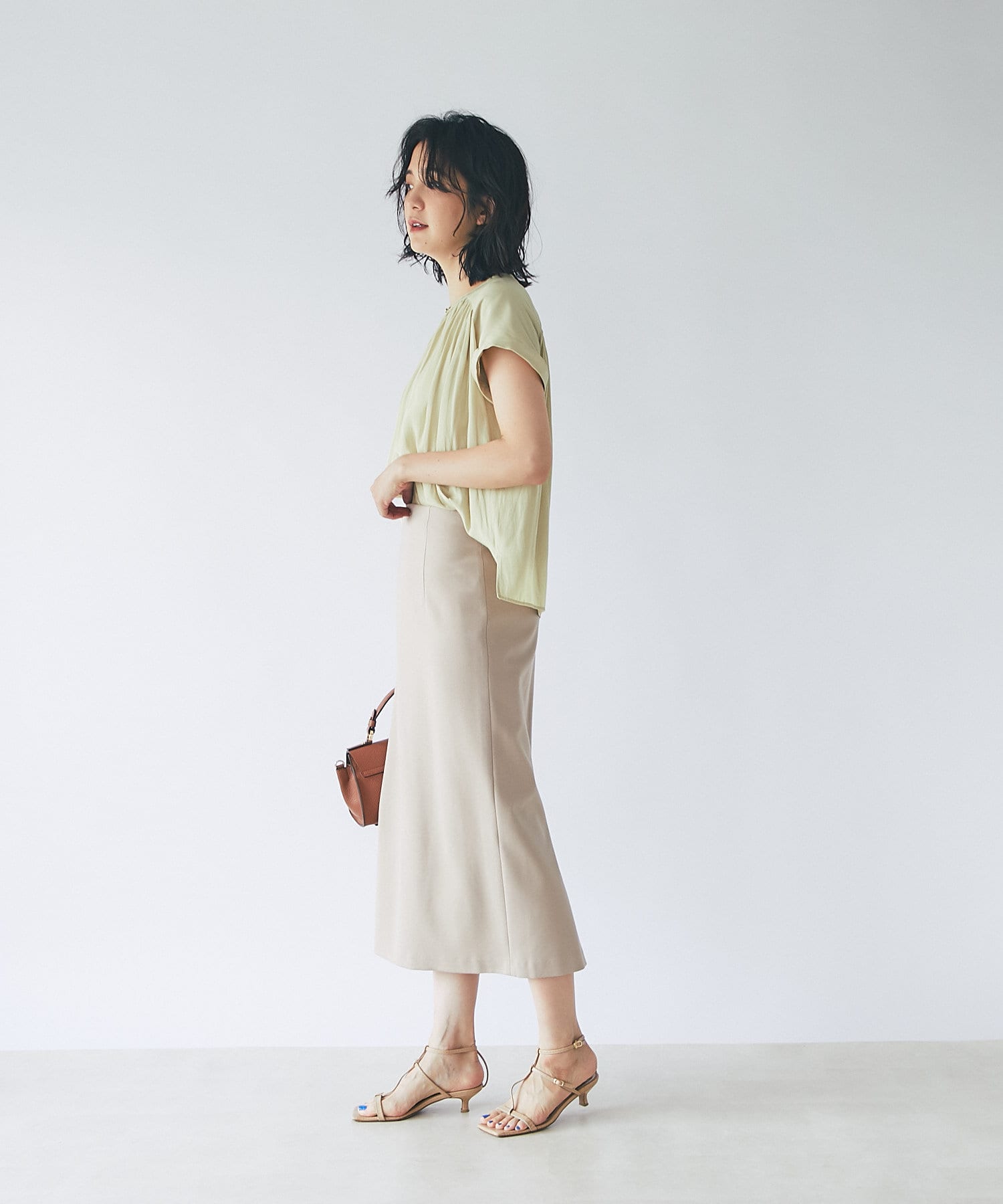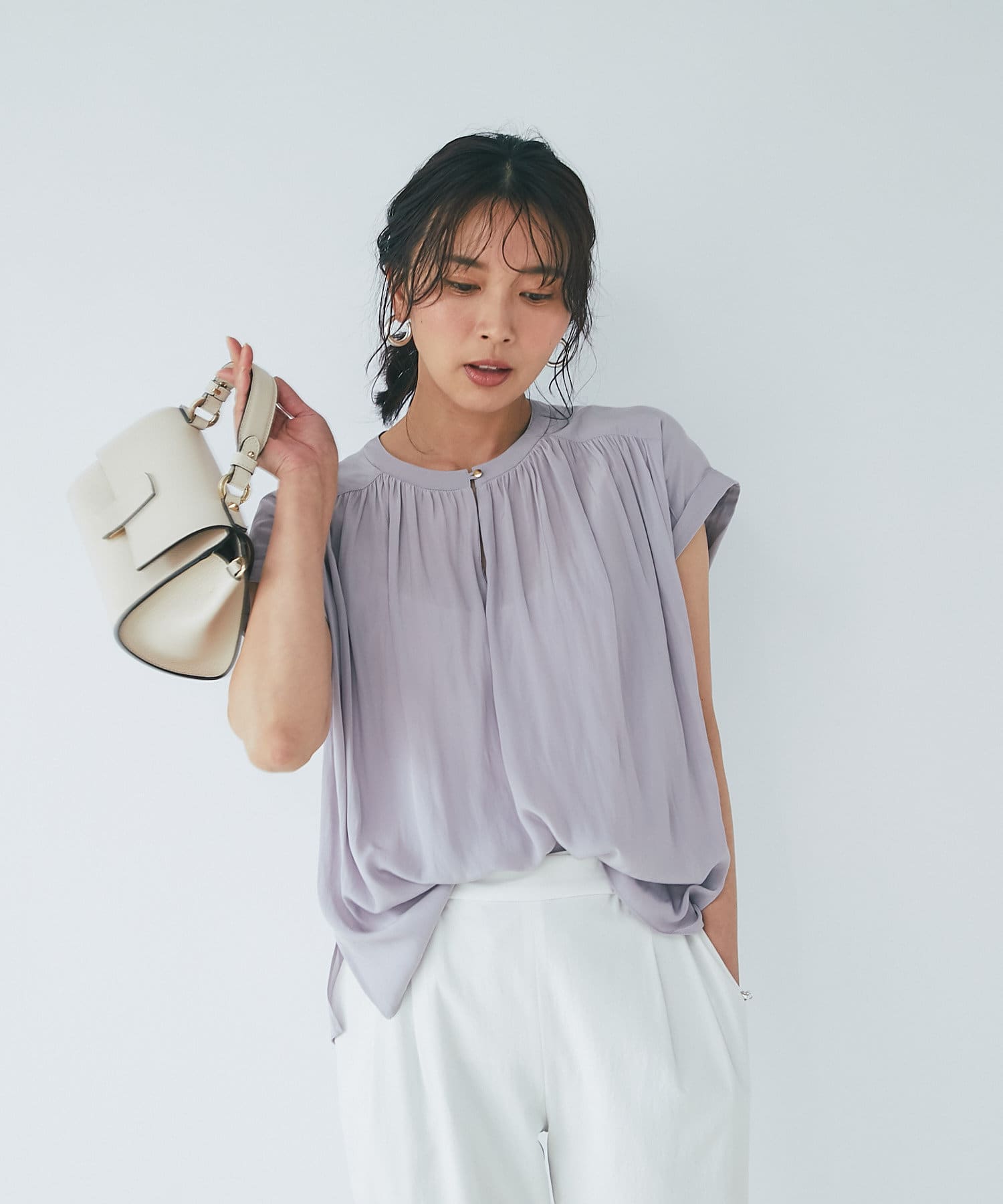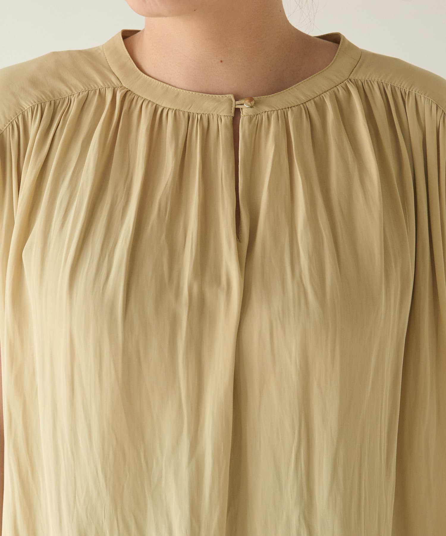 スッキリとした襟元とフレンチスリーブで、ジャケットのインナーなどオフィススタイルに◎