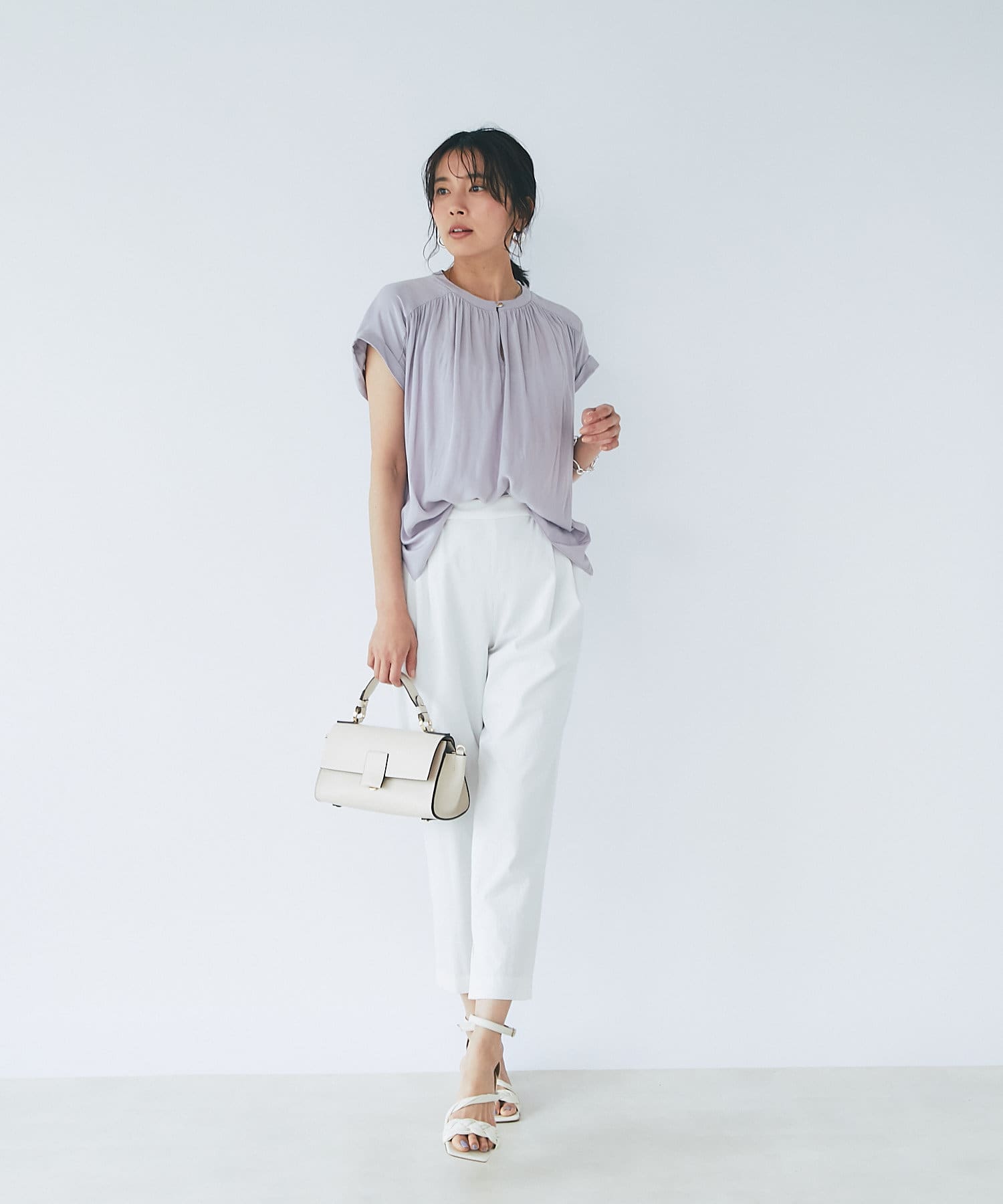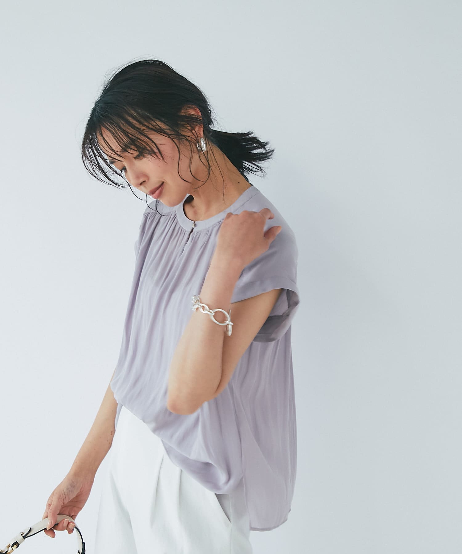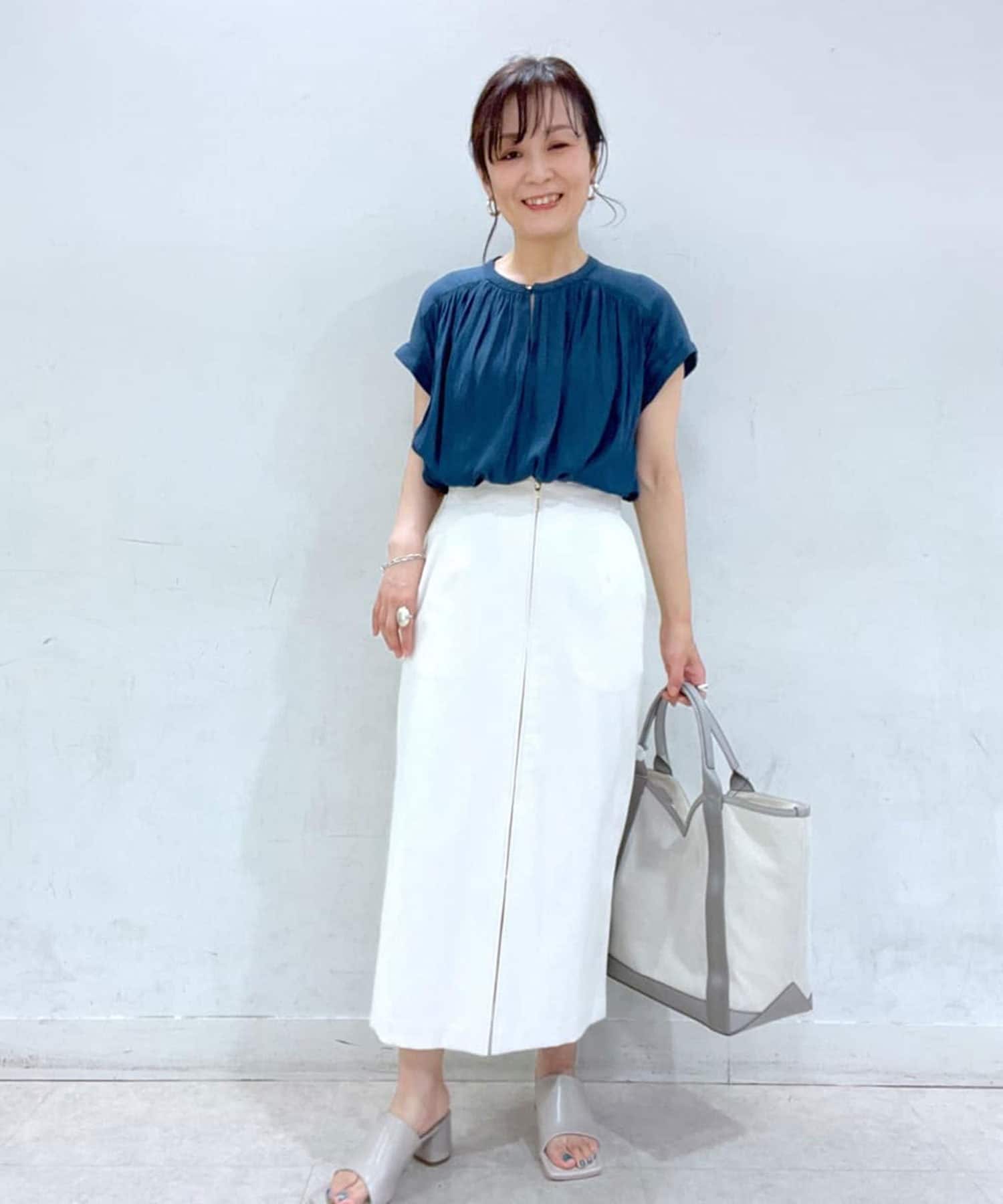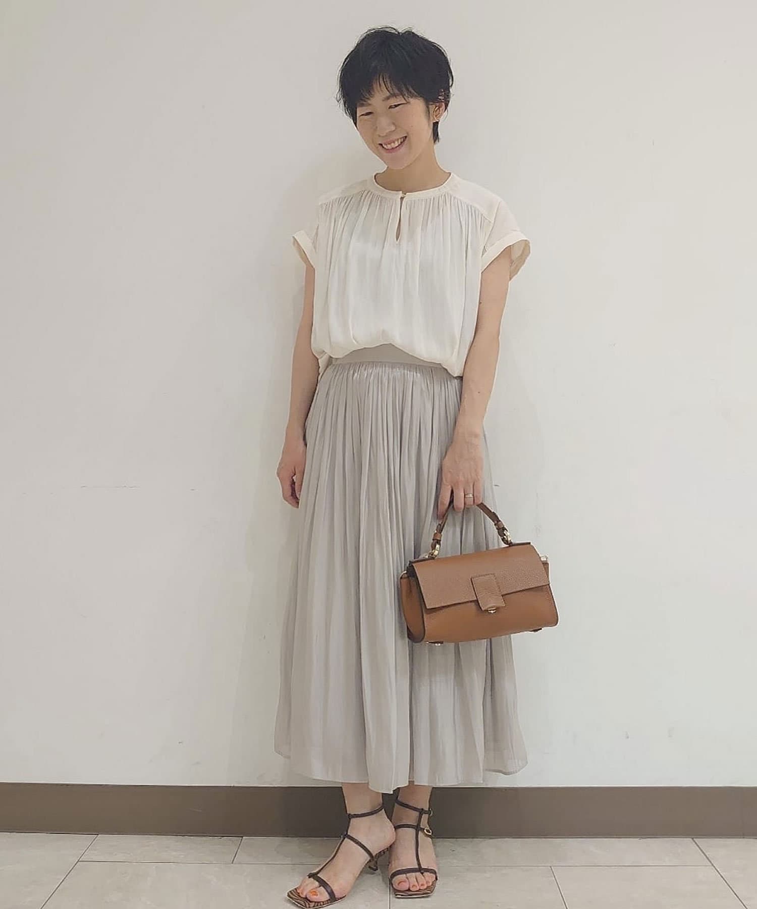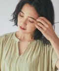 女性らしいアイテムながら二の腕の隠れる袖丈も魅力。