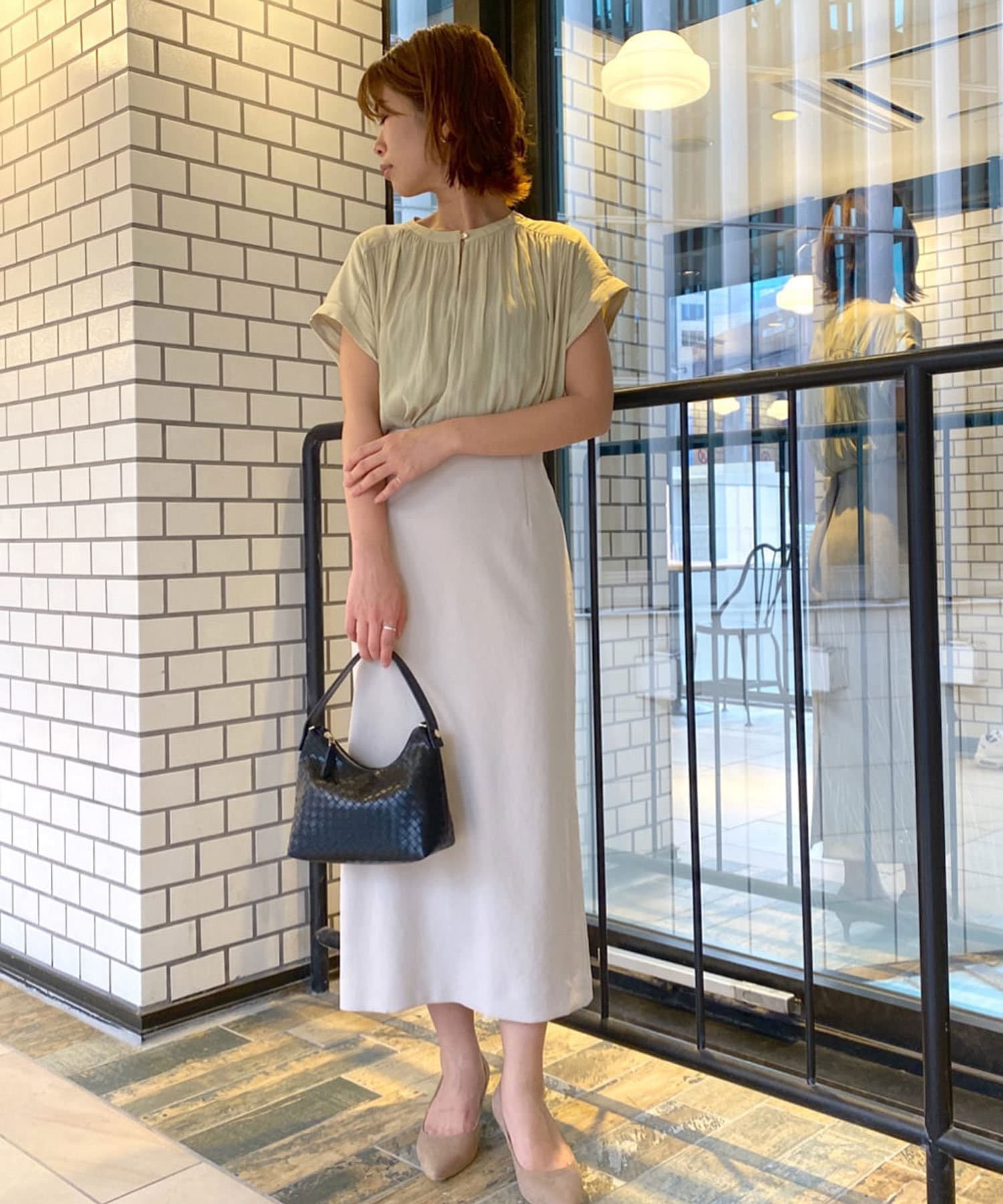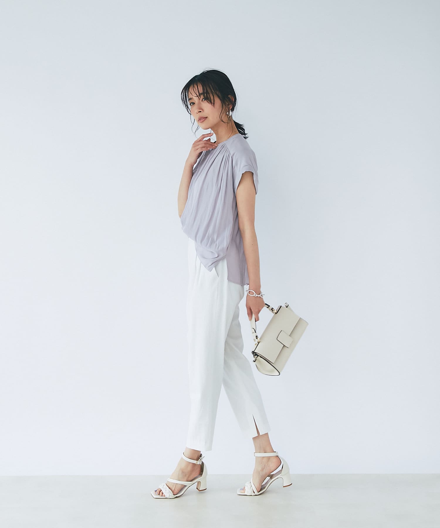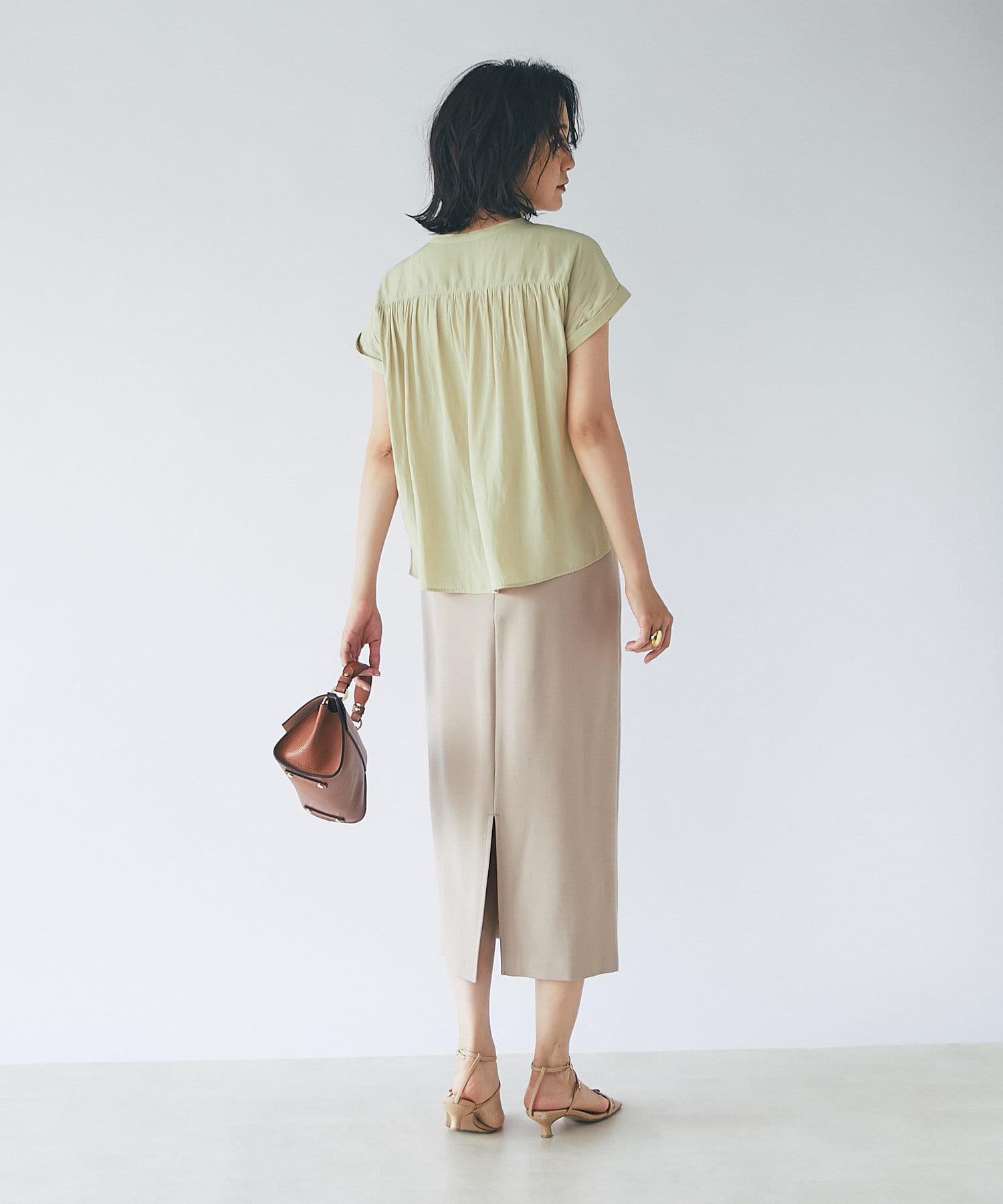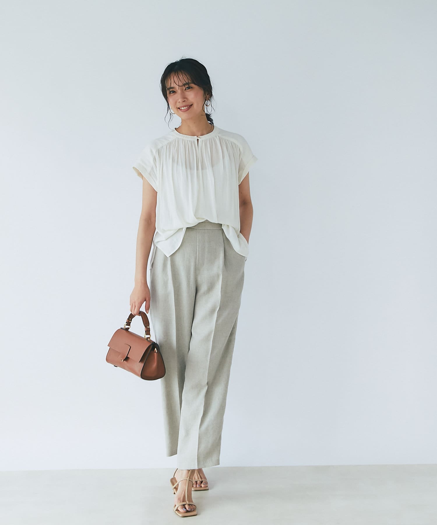 女性らしいアイテムながら二の腕の隠れる袖丈も魅力。