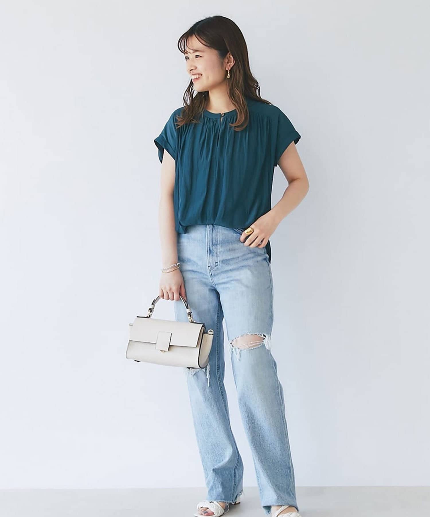 デニム+華奢サンダルと合わせて、簡単で女性らしさアップのカジュアルスタイルが出来上がります。