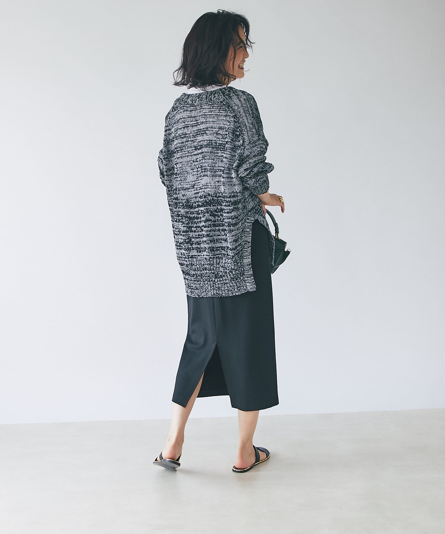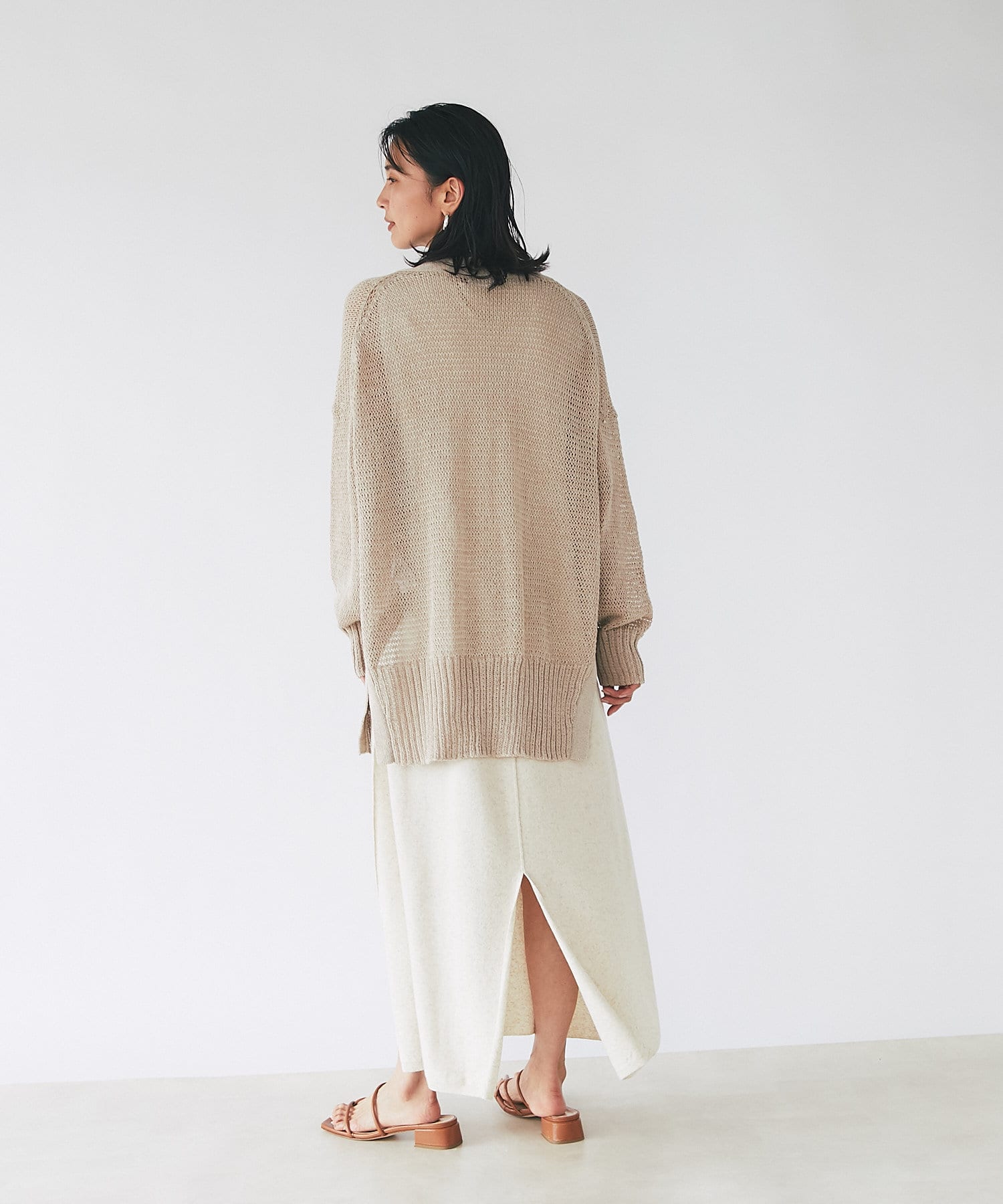 サイドのスリットは大きくカーブをとり、抜け感を出しており、後身は、ヒップの隠れる安心の丈感です。
