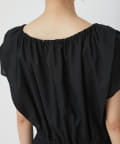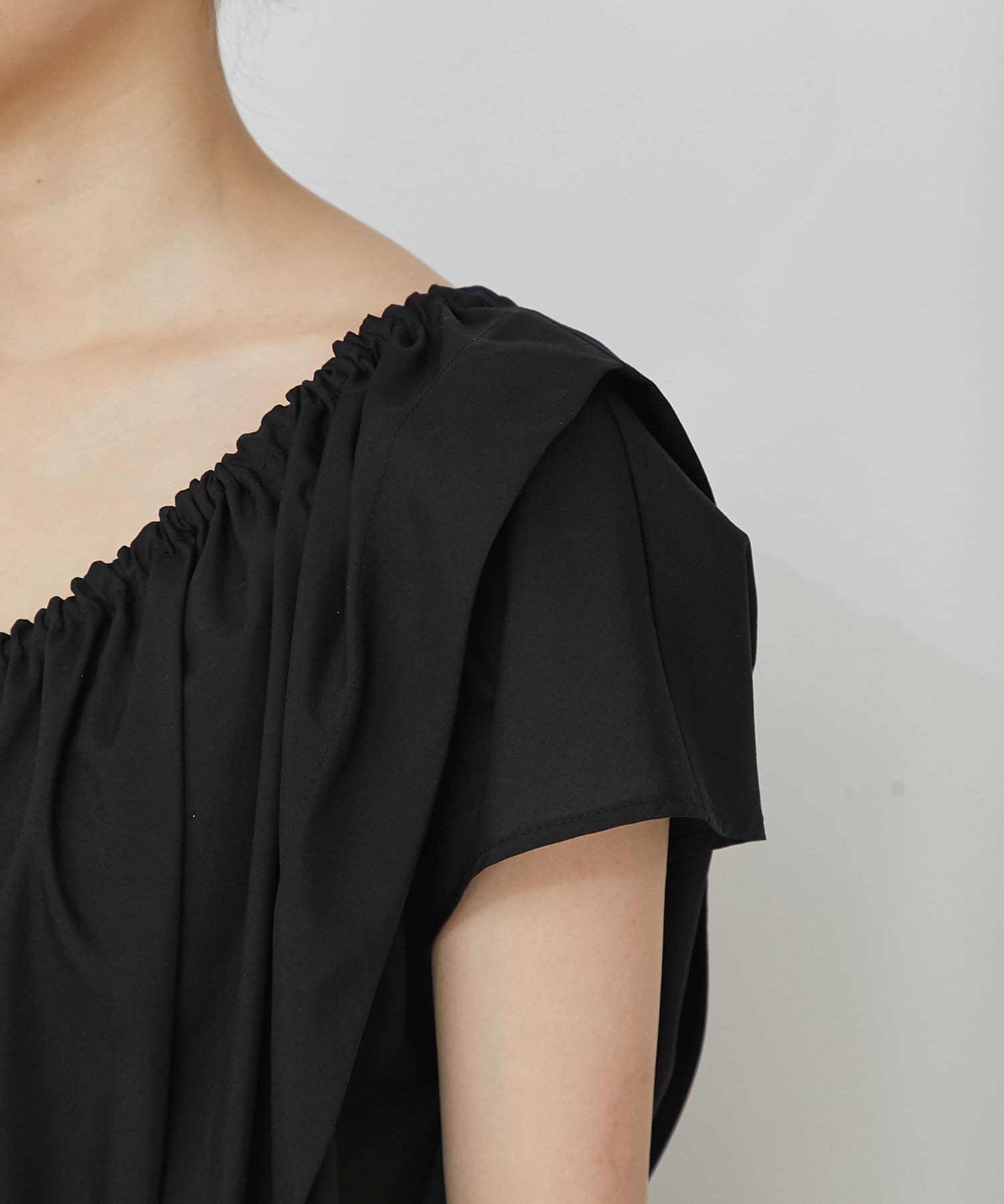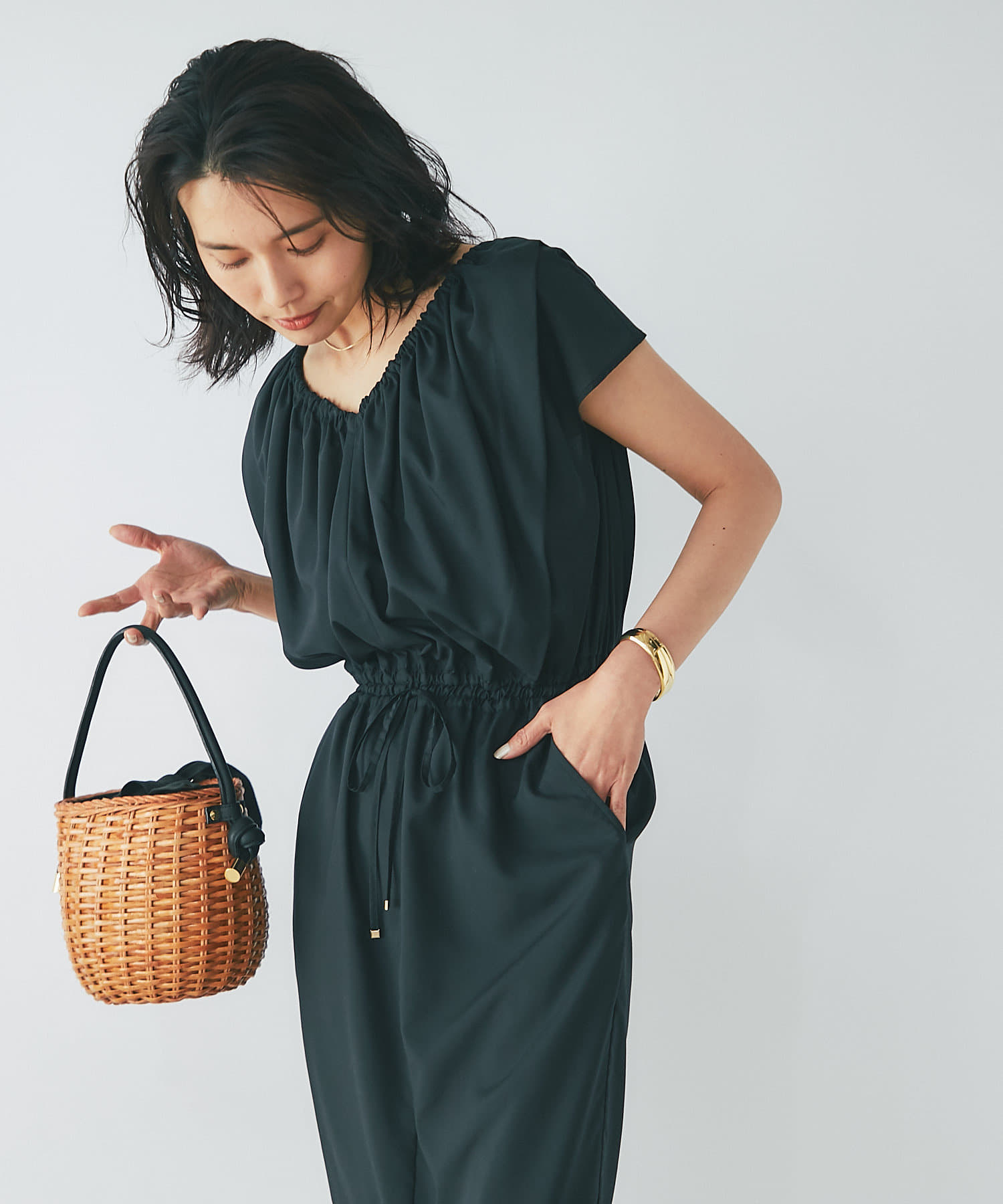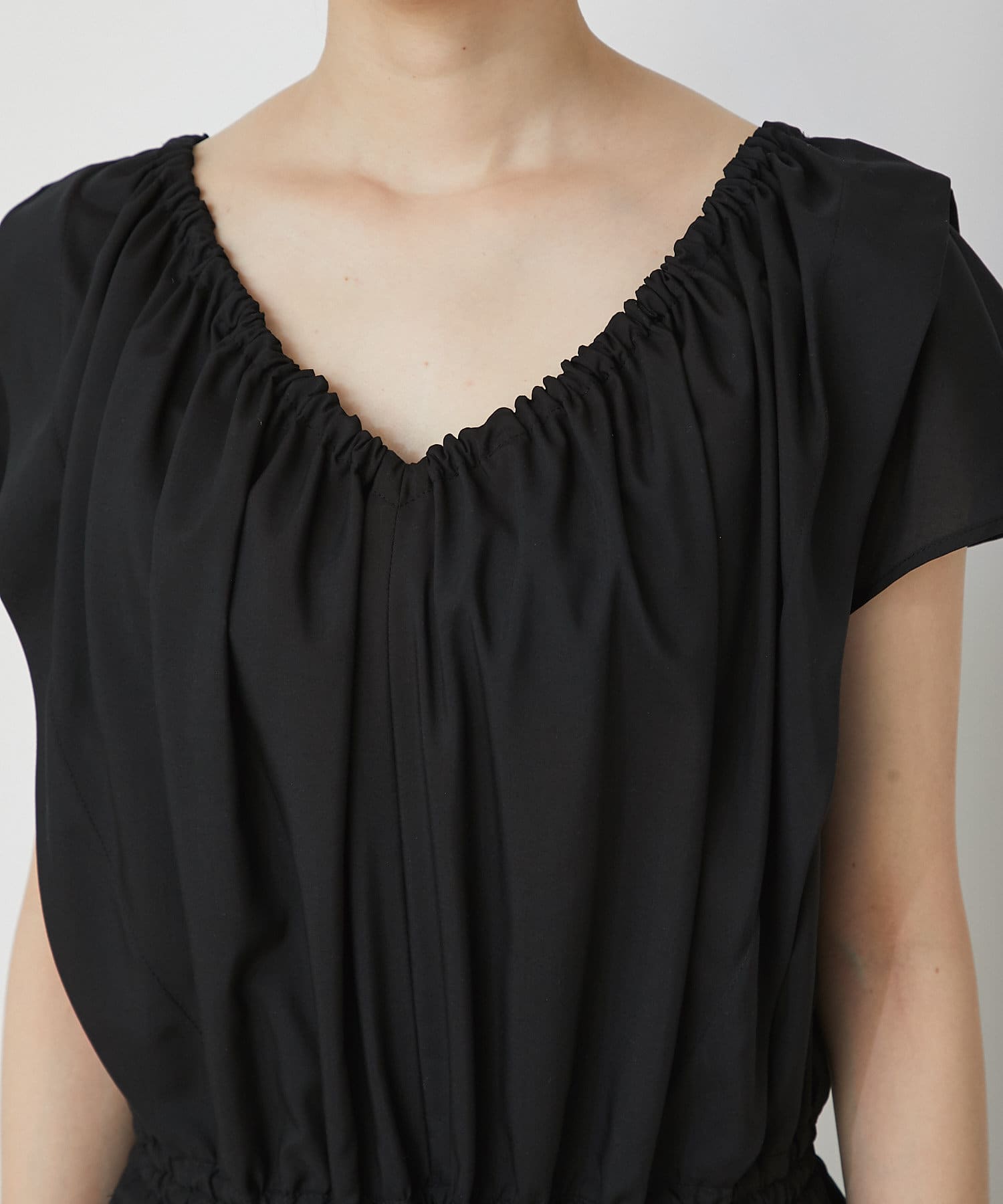 トップスとスカートにメリハリを効かせた「ボリューム&リーン」なシルエットがスタイルアップ効果を狙える、着るだけでサマになる1着です。                                                                                                               ギャザーをたっぷりあしらった衿ぐりは総ゴム仕様でワンショルにもアレンジ可能です。                                                                                            ギャザーのボリュームを断ち切るように配置した立体タックがシルエットにメリハリを生み、上半身の華奢見え効果も期待できます。                                                                                                              ウエストギャザーはゴム&ドロスト仕様で小柄な方のサイズ調整が可能。ウエストのふくらみを抑えたIラインのスカートにはフロントスリットを施し足元にも女性らしい抜け感をプラスしました。                                                                                   ひも先のゴールドメタルもアクセント。