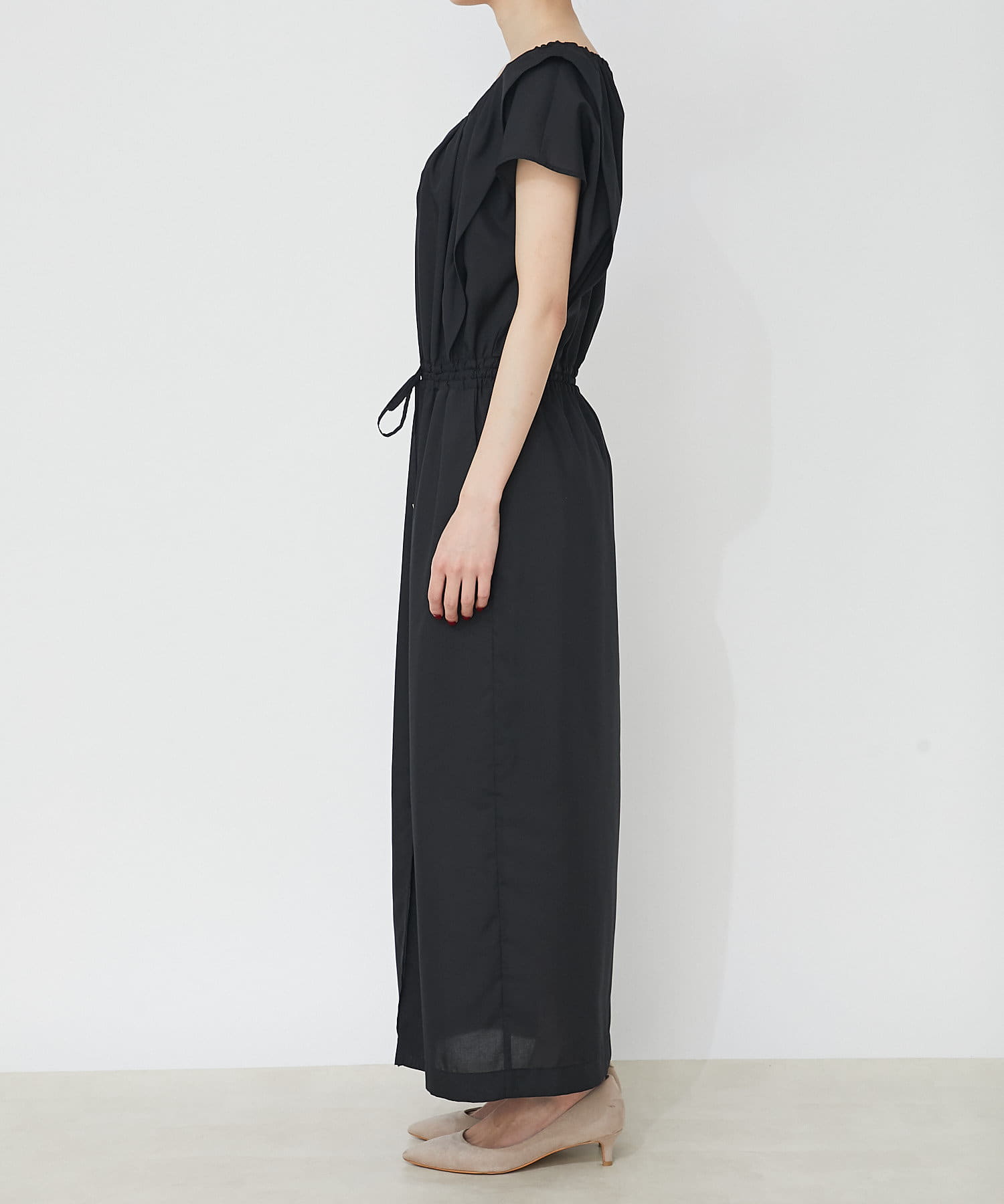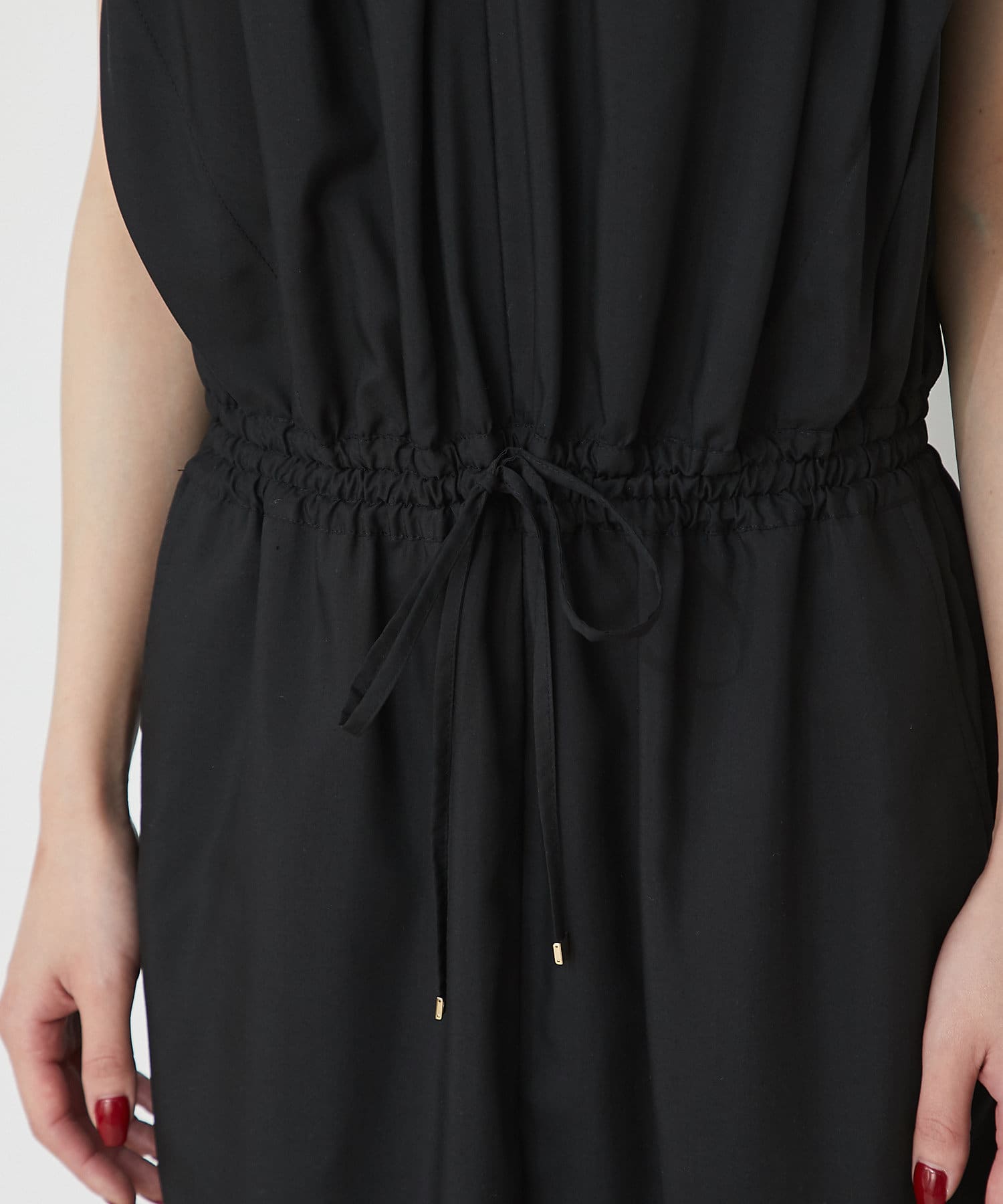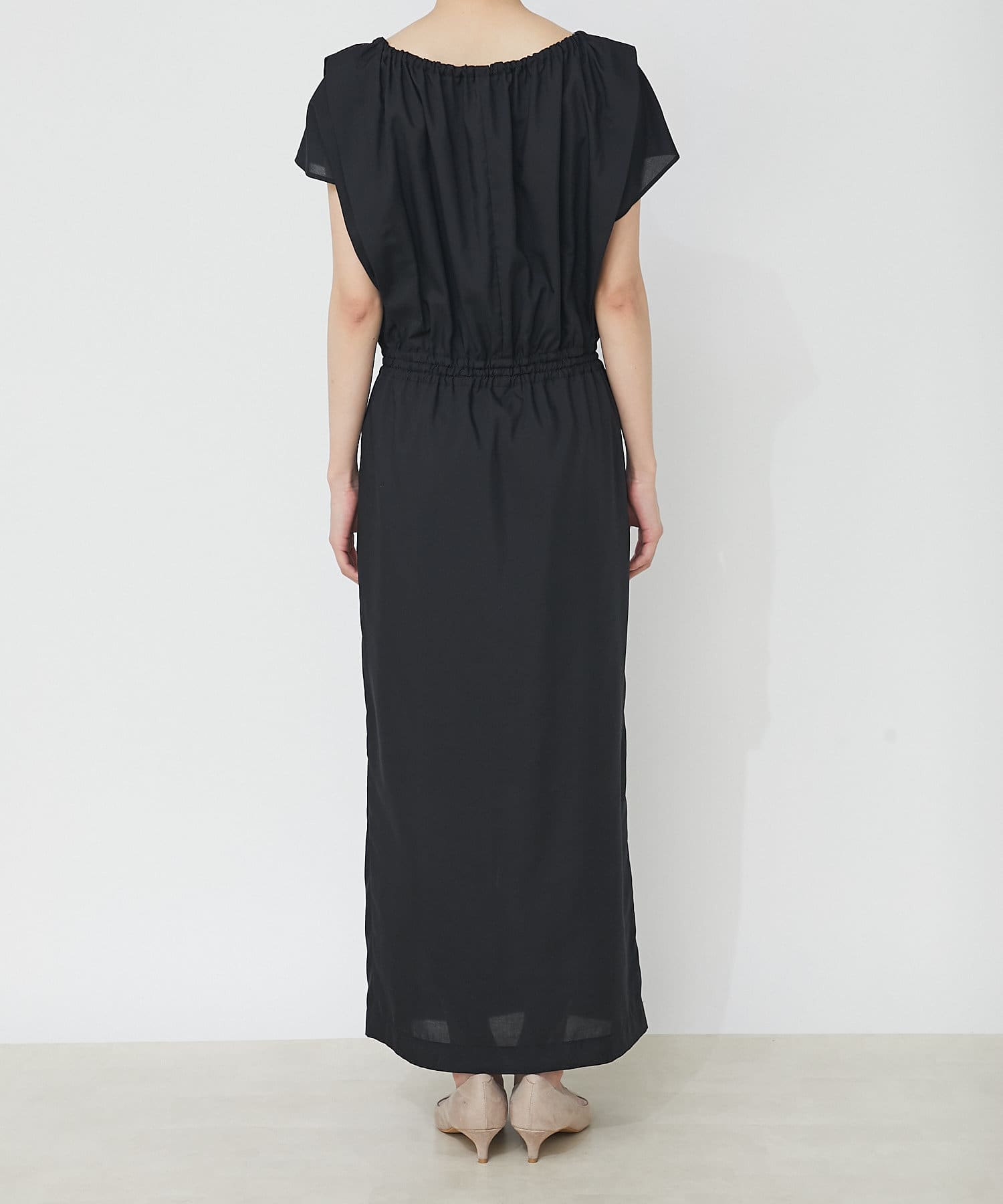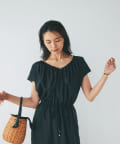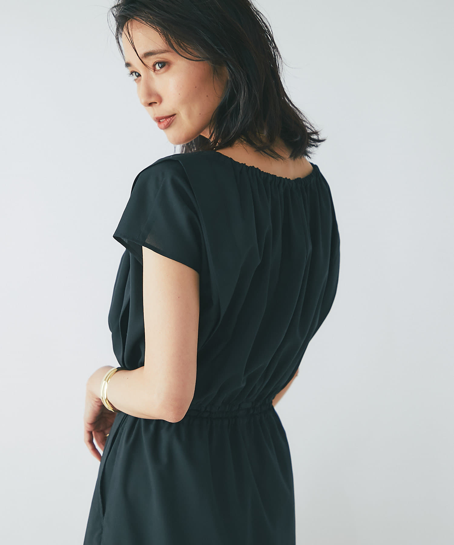 トップスとスカートにメリハリを効かせた「ボリューム&リーン」なシルエットがスタイルアップ効果を狙える、着るだけでサマになる1着です。                                                                                                               ギャザーをたっぷりあしらった衿ぐりは総ゴム仕様でワンショルにもアレンジ可能です。                                                                                            ギャザーのボリュームを断ち切るように配置した立体タックがシルエットにメリハリを生み、上半身の華奢見え効果も期待できます。                                                                                                              ウエストギャザーはゴム&ドロスト仕様で小柄な方のサイズ調整が可能。ウエストのふくらみを抑えたIラインのスカートにはフロントスリットを施し足元にも女性らしい抜け感をプラスしました。                                                                                   ひも先のゴールドメタルもアクセント。
